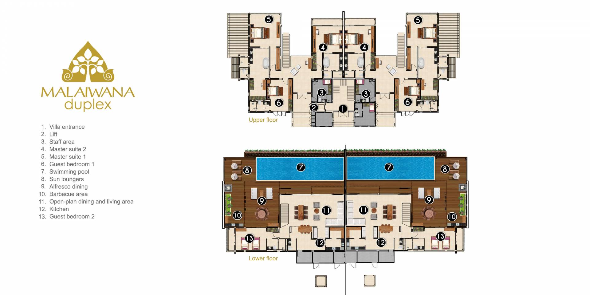 Το Malaiwana Duplex Villas Phuket είναι ζωντανές κατοικίες τεσσάρων υπνοδωματίων μόλις λίγα μέτρα από την παραλία Nai Thon στην ειδυλλιακή βορειοδυτική ακτή του Πουκέτ. Με πανοραμική θέα στη θάλασσα από την πλαγιά τους, το Malaiwana Duplex Villas Phuket θα προσελκύσει οικογένειες ή ομάδες φίλων που αναζητούν απόλυτη ηρεμία και φιλοξενία πέντε αστέρων. Χαλαρώστε στην πισίνα 15 μέτρων, διασκεδάστε στους κομψούς χώρους τραπεζαρίας και καθιστικού ή χαλαρώστε σε ένα από τα πολυτελή ιδιωτικά υπνοδωμάτια. Μια ομάδα προσεκτικού προσωπικού-συμπεριλαμβανομένου ενός σεφ-παρέχει την υπηρεσία πρώτης κατηγορίας, αφήνοντάς σας ελεύθερους να περπατήσετε στην παραλία, να απολαύσετε ένα βραδινό κοκτέιλ και να θαυμάσετε το ηλιοβασίλεμα πάνω από τη θάλασσα Ανταμάν.