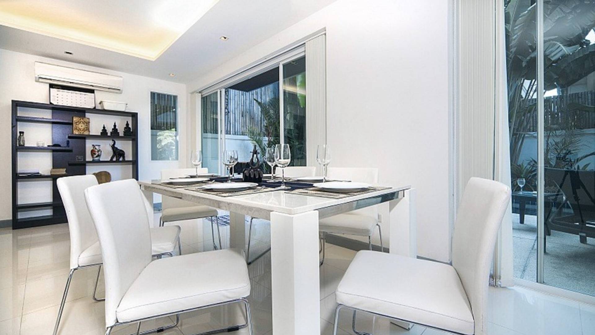 Η τραπεζαρία έχει ένα μακρύ μαρμάρινο τραπέζι φαγητού με έξι λευκές δερμάτινες καρέκλες και είναι δίπλα στην κουζίνα. Είναι πλήρως εξοπλισμένο με άφθονες μονάδες και εξοπλισμένο με ενσωματωμένο φούρνο και εστίες, με μεγάλη φαρδιά κουκούλα από ανοξείδωτο ατσάλι πάνω και ντουλάπι ψυγείου/καταψύκτη. Το πλυντήριο βρίσκεται στο πλάι και διαθέτει αυτόματο πλυντήριο ρούχων. Ακριβώς αριστερά από την κύρια είσοδο υπάρχει ένα ντους για μεγαλύτερη άνεση κατά τη χρήση της πισίνας.