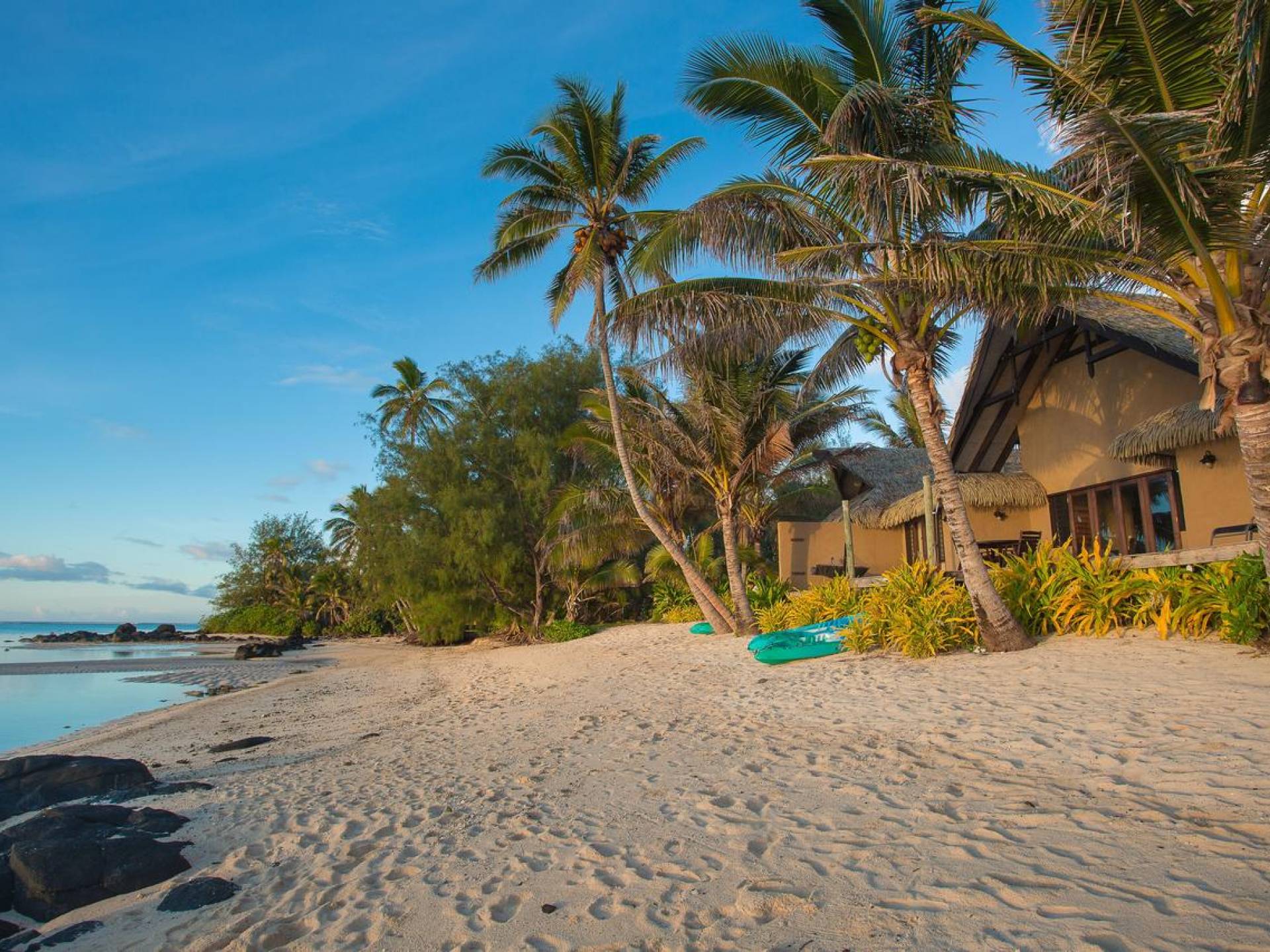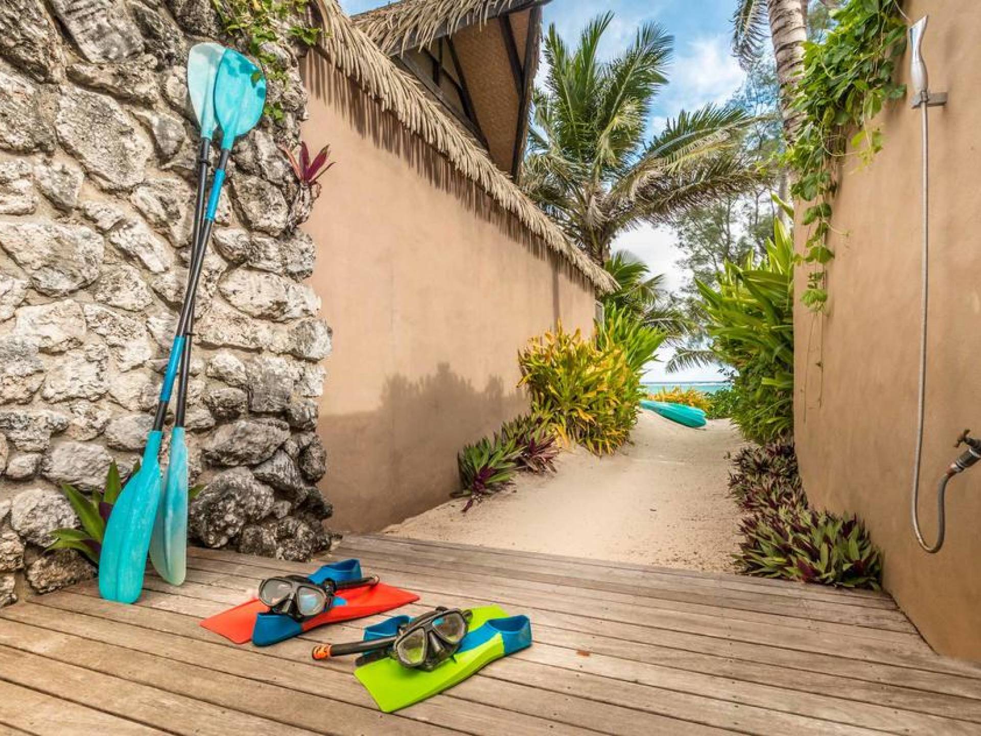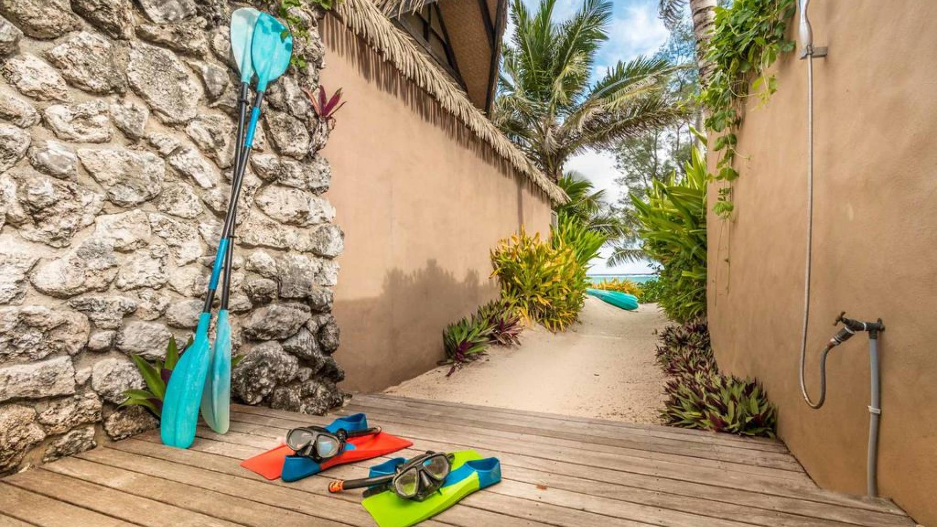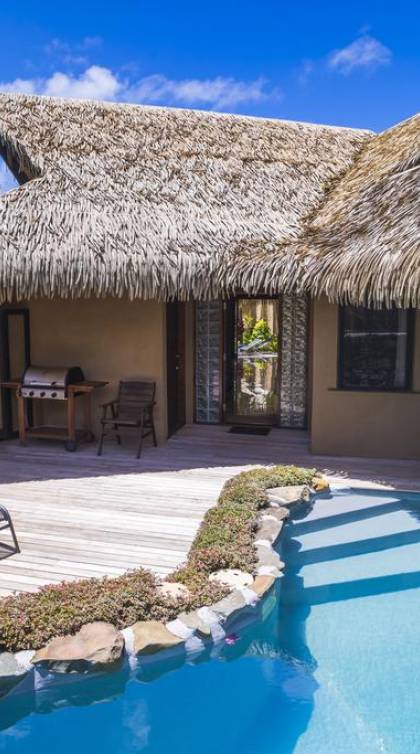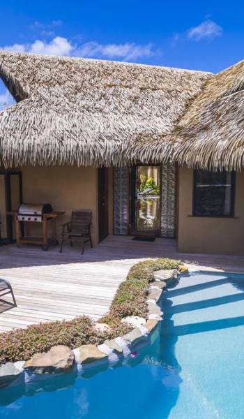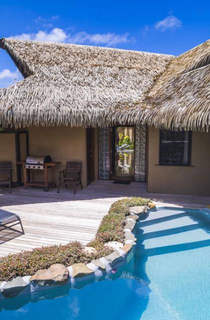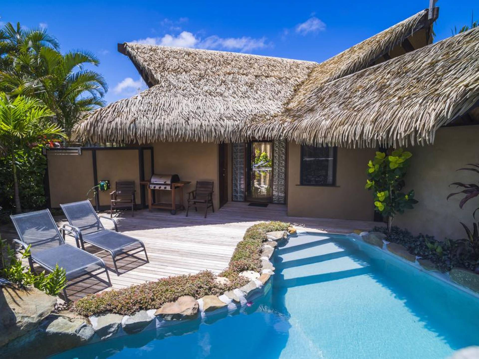 The exterior of the Villa has a gated private courtyard with a private swimming pool set in tropical gardens. Waterfalls off natural rock flowing into the pool, hot bubbling Spa pool set in your private courtyard, and decks both lagoon side and poolside of the villa. The is also a large Barbeque, sunloungers, on both front and rear decks, and outdoor dining tables and chairs. You can enjoy the sea with your personal kayaks, as the villas in Rarotonga are only a few steps to Muri Lagoon edge.