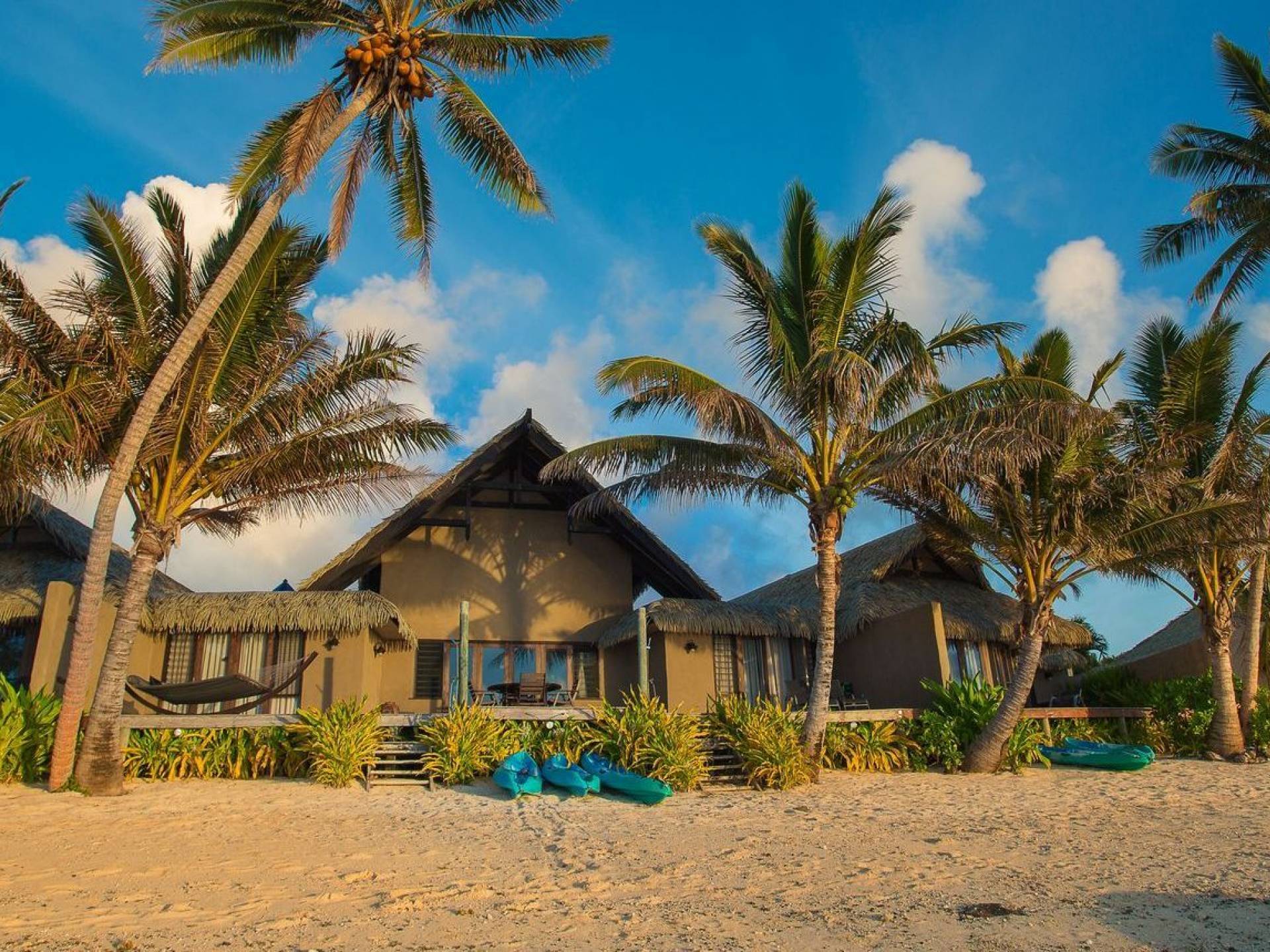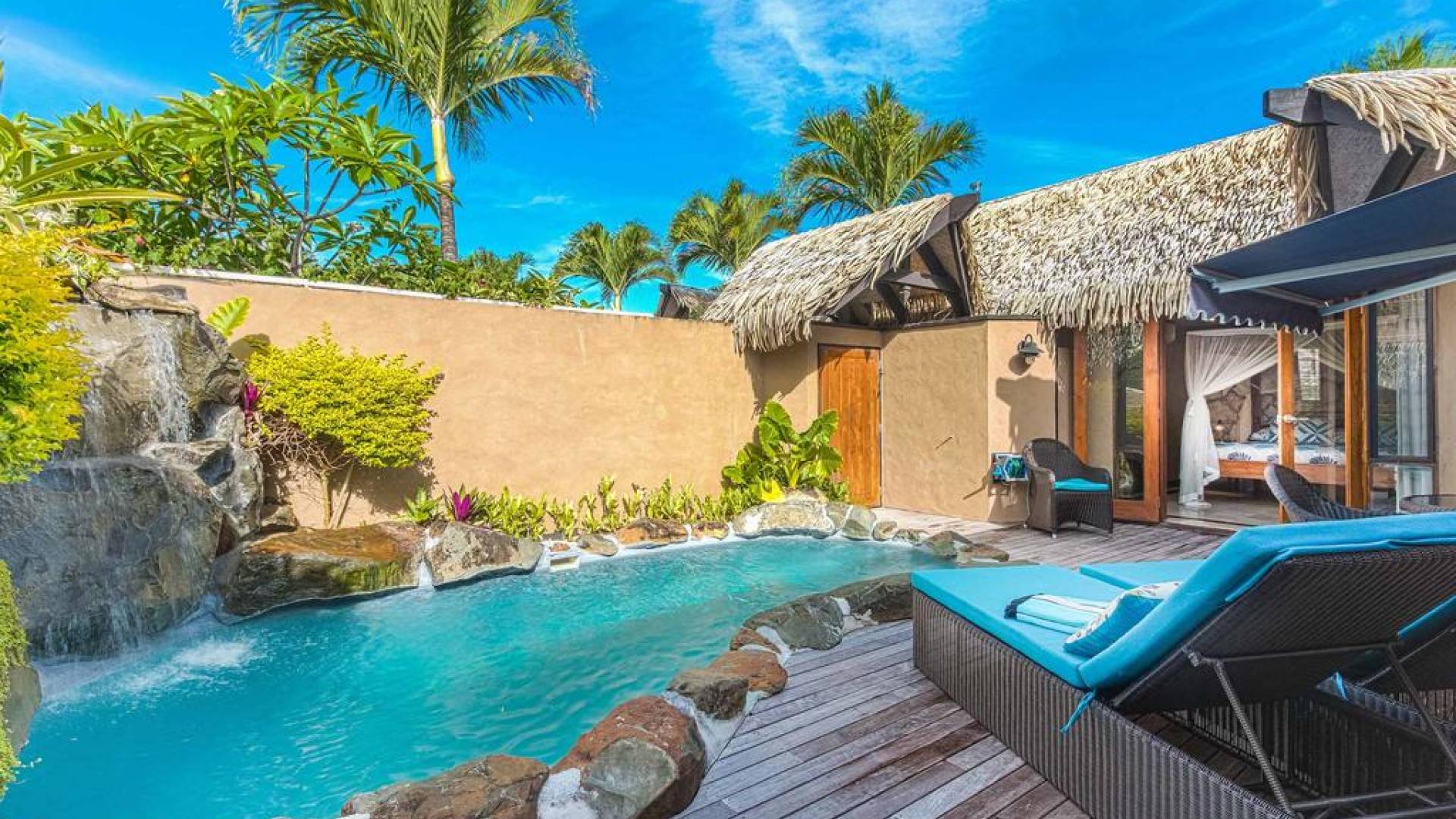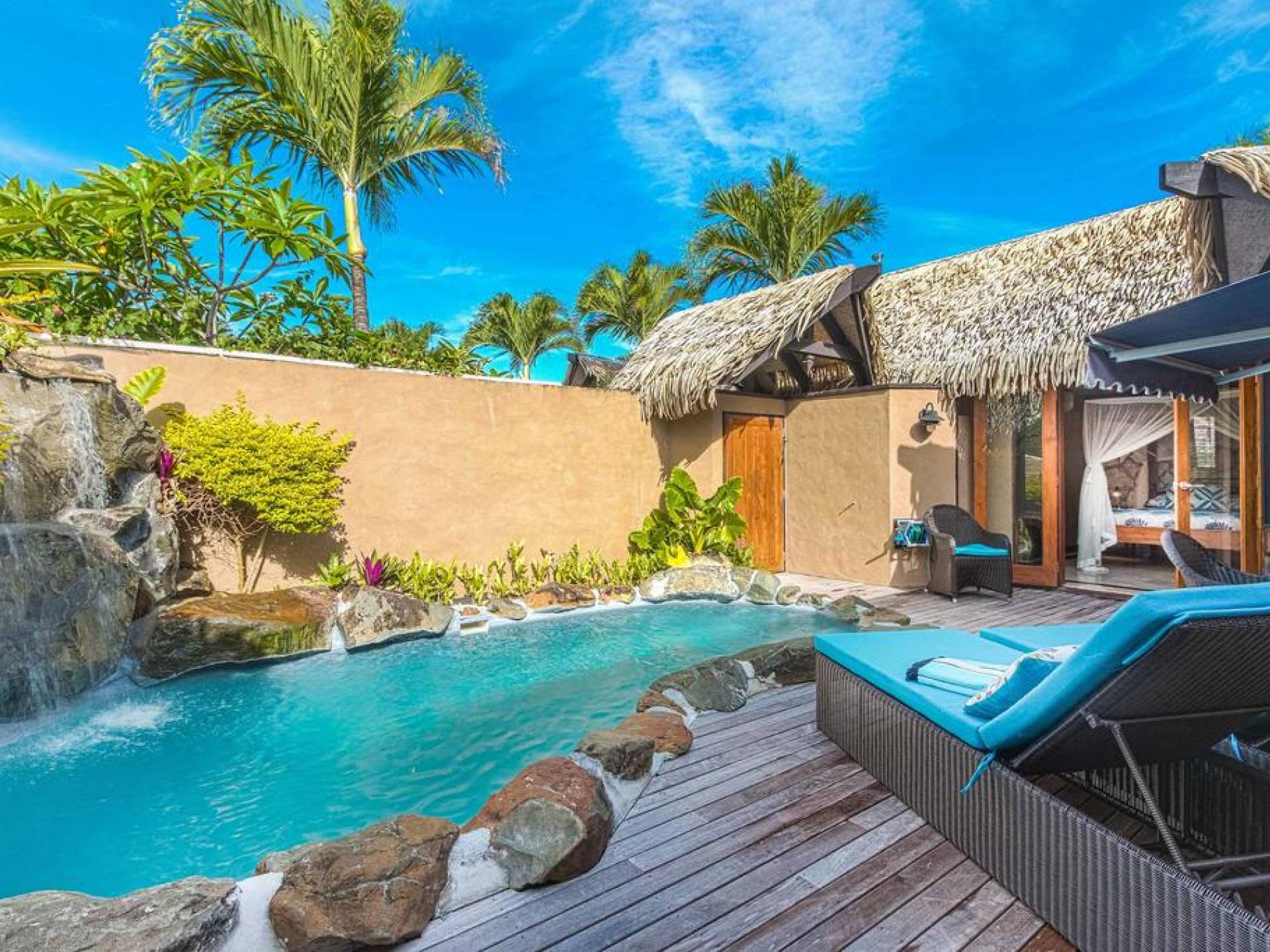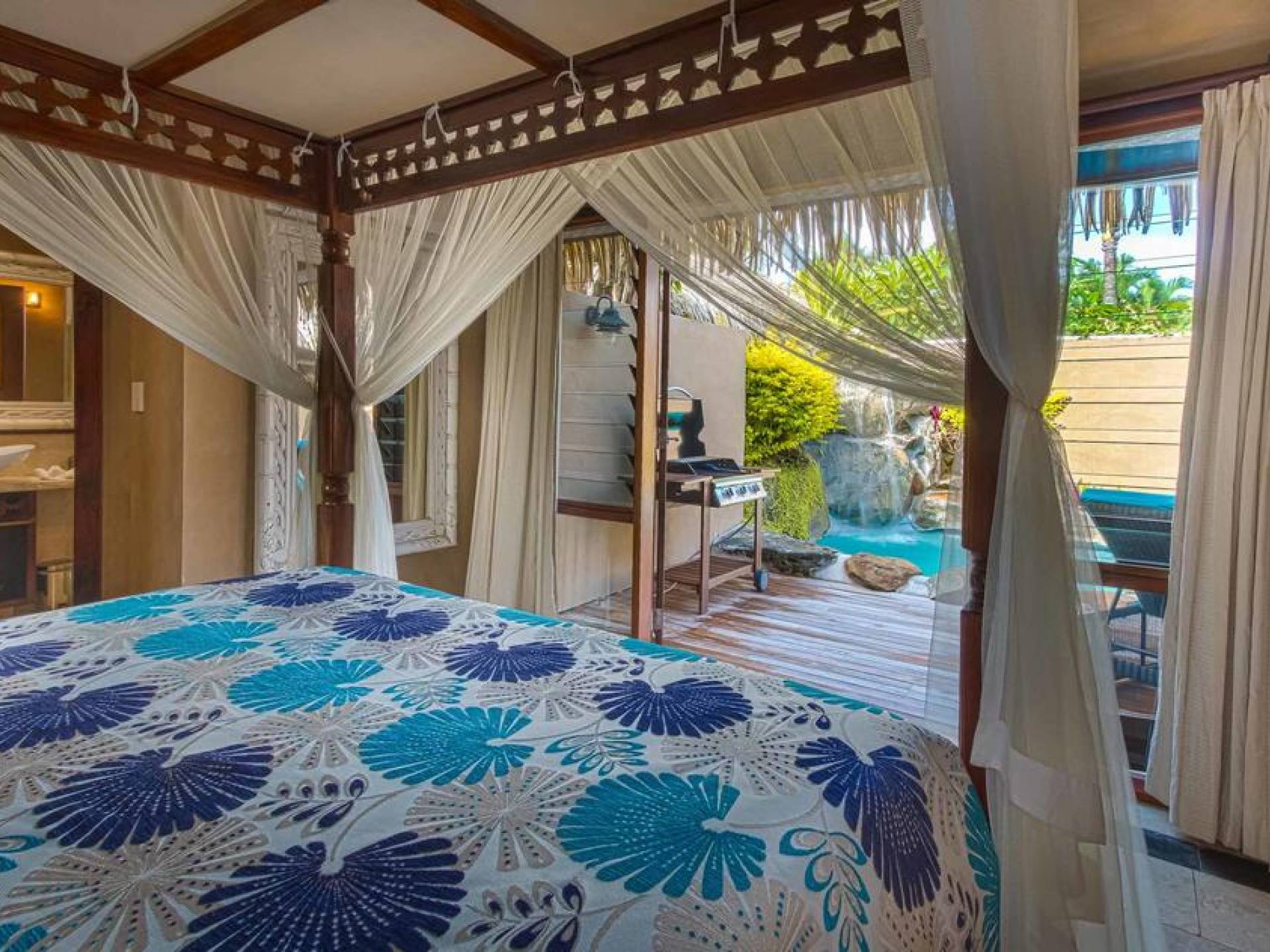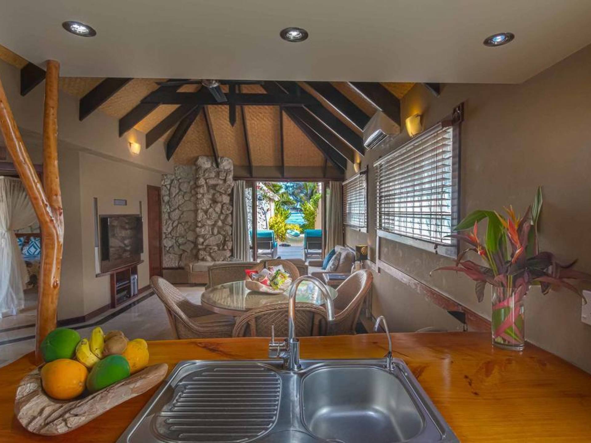 The exterior of the Villa has a gated private courtyard with a private swimming pool set in tropical gardens. Waterfalls off natural rock flowing into the pool, hot bubbling Spa pool set in your private courtyard, and decks both lagoon side and poolside of the villa. The is also a large Barbeque, sunloungers, on both front and rear decks, and outdoor dining tables and chairs. You can enjoy the sea with your personal kayaks, as the villas in Rarotonga are only a few steps to Muri Lagoon edge.