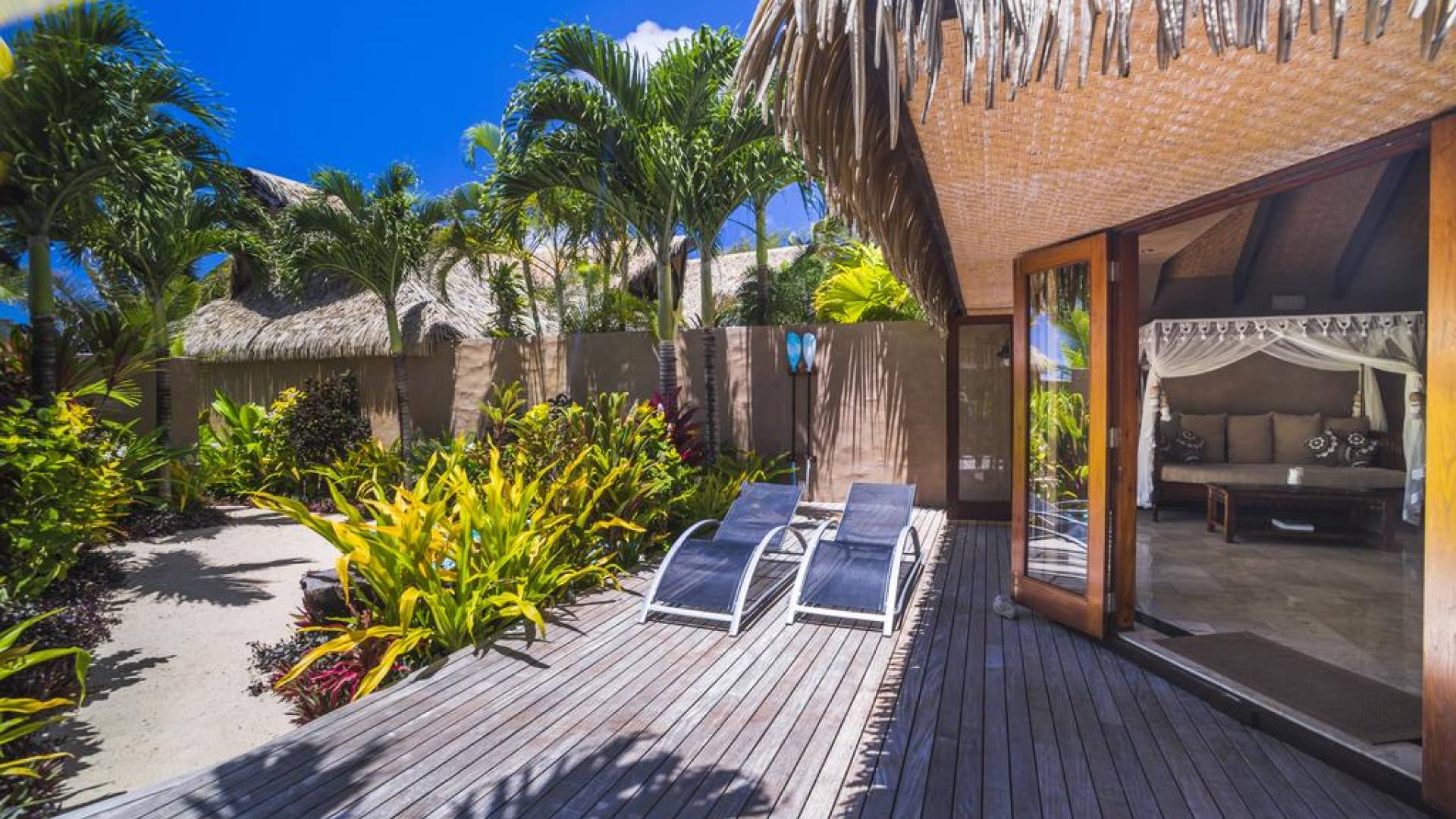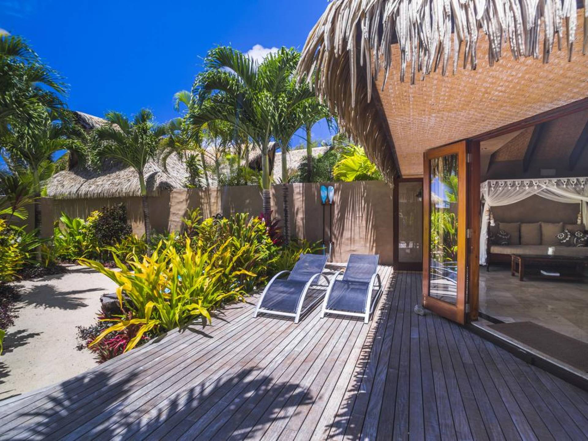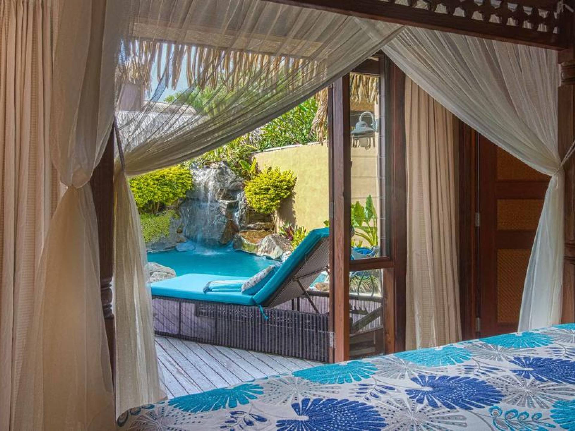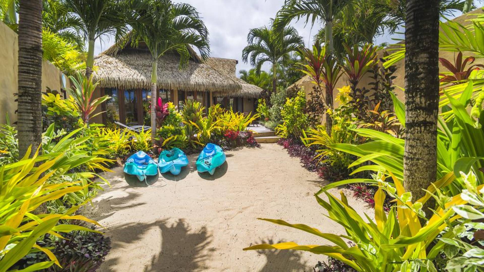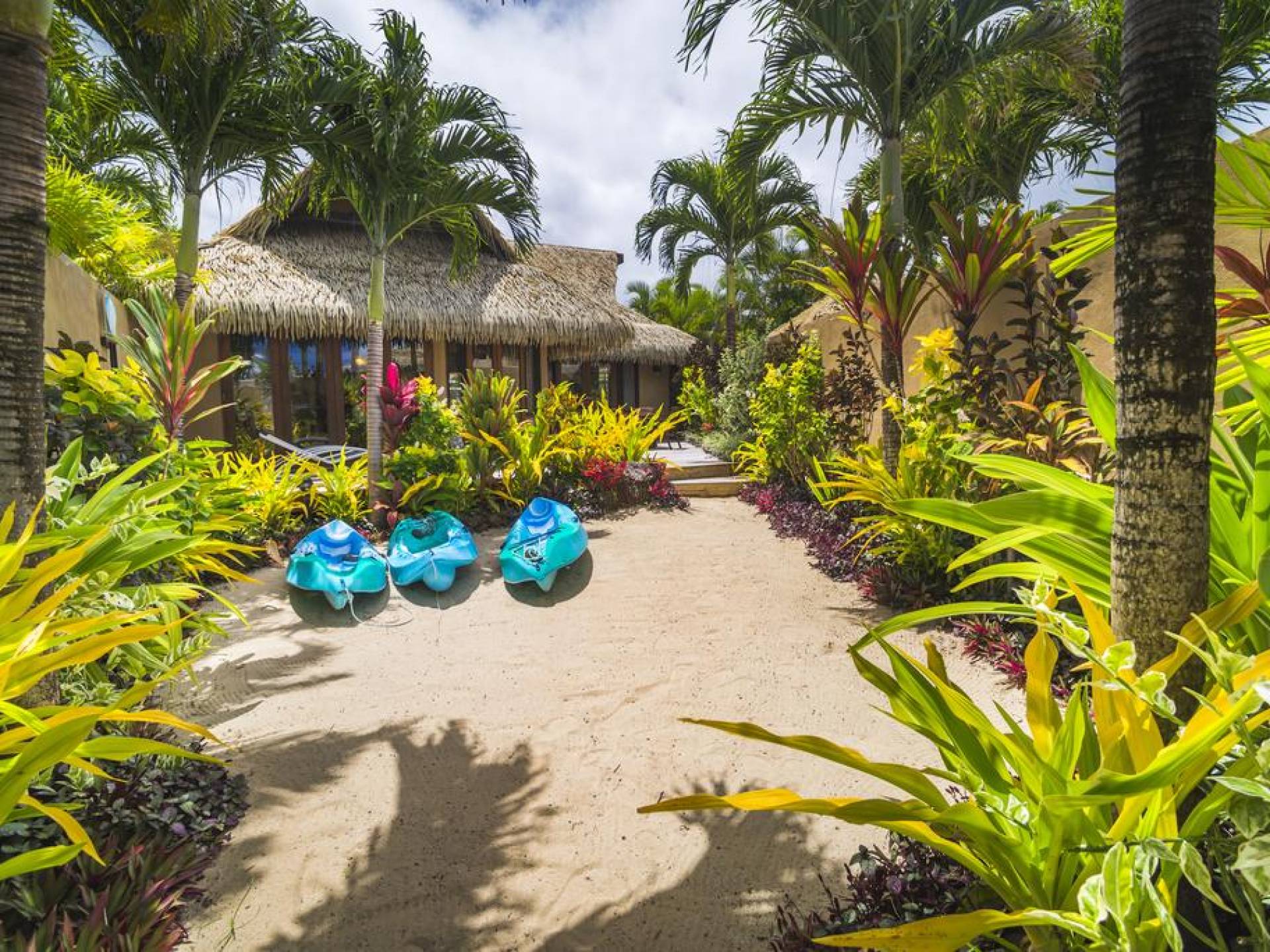 The exterior of the Villa has a gated private courtyard with a private swimming pool set in tropical gardens. Waterfalls off natural rock flowing into the pool, hot bubbling Spa pool set in your private courtyard, and decks both lagoon side and poolside of the villa. The is also a large Barbeque, sunloungers, on both front and rear decks, and outdoor dining tables and chairs. You can enjoy the sea with your personal kayaks, as the villas in Rarotonga are only a few steps to Muri Lagoon edge.