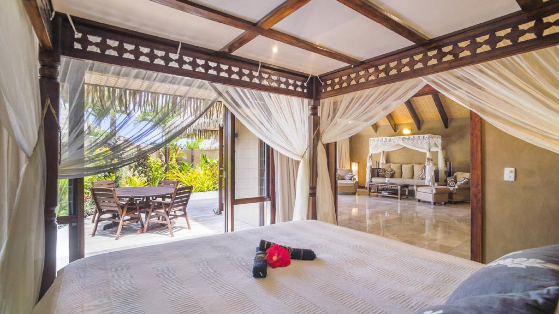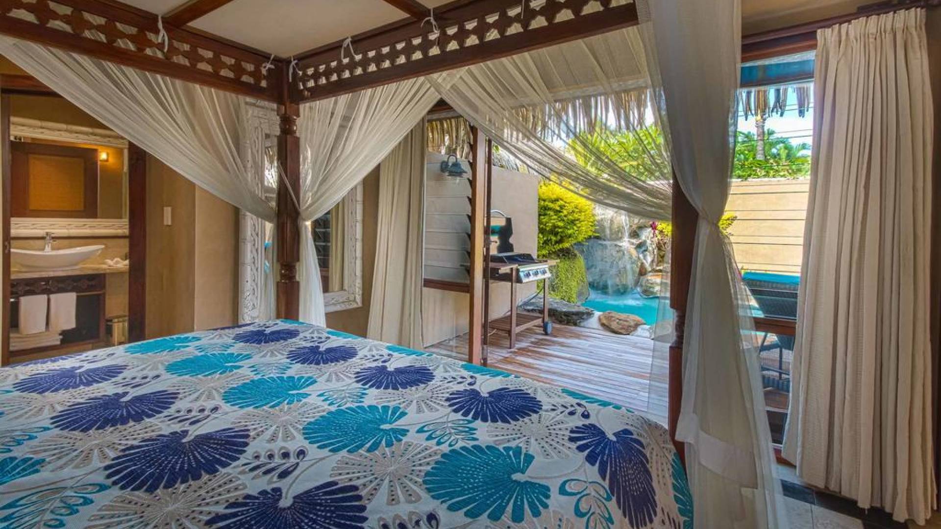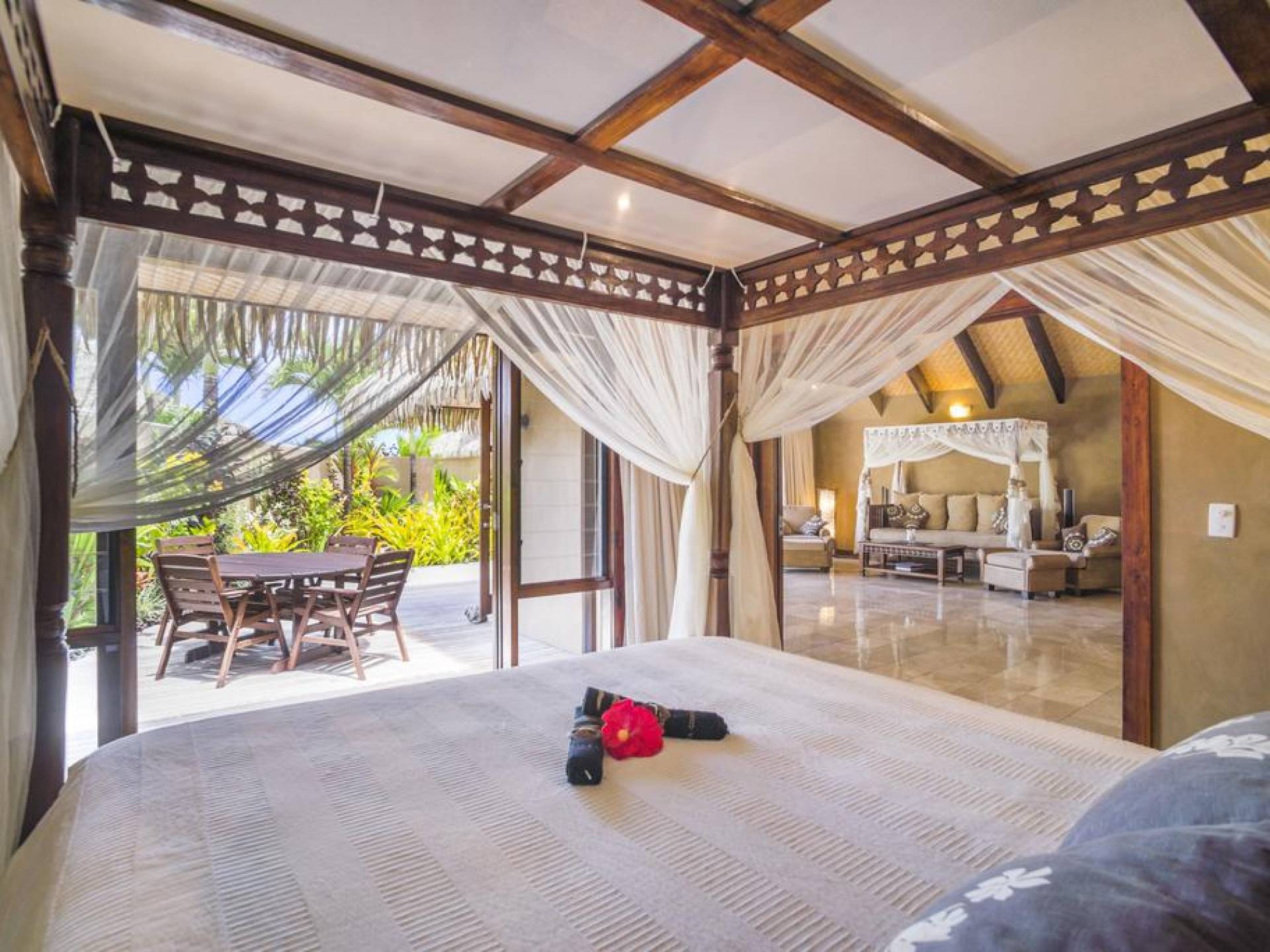 The interior of the Villa features two bedrooms with each having four-poster super king canopied beds, and two bathrooms with each having two basins, bidet, toilet, marble, hand-carved mirrors, Italian fittings, and a shower for two. There is also a canopied full-length Day Bed and in the living room a 46 inch TV with full surround sound audio/visual system, with over 400 DVDs and CDs for your enjoyment. Through the interior, you will find a stream with a bridge across into bedrooms, complete with small local fish. The kitchen is fully equipped, has an Italian espresso machine, and a dining area with Rumours handpainted dinnerware.