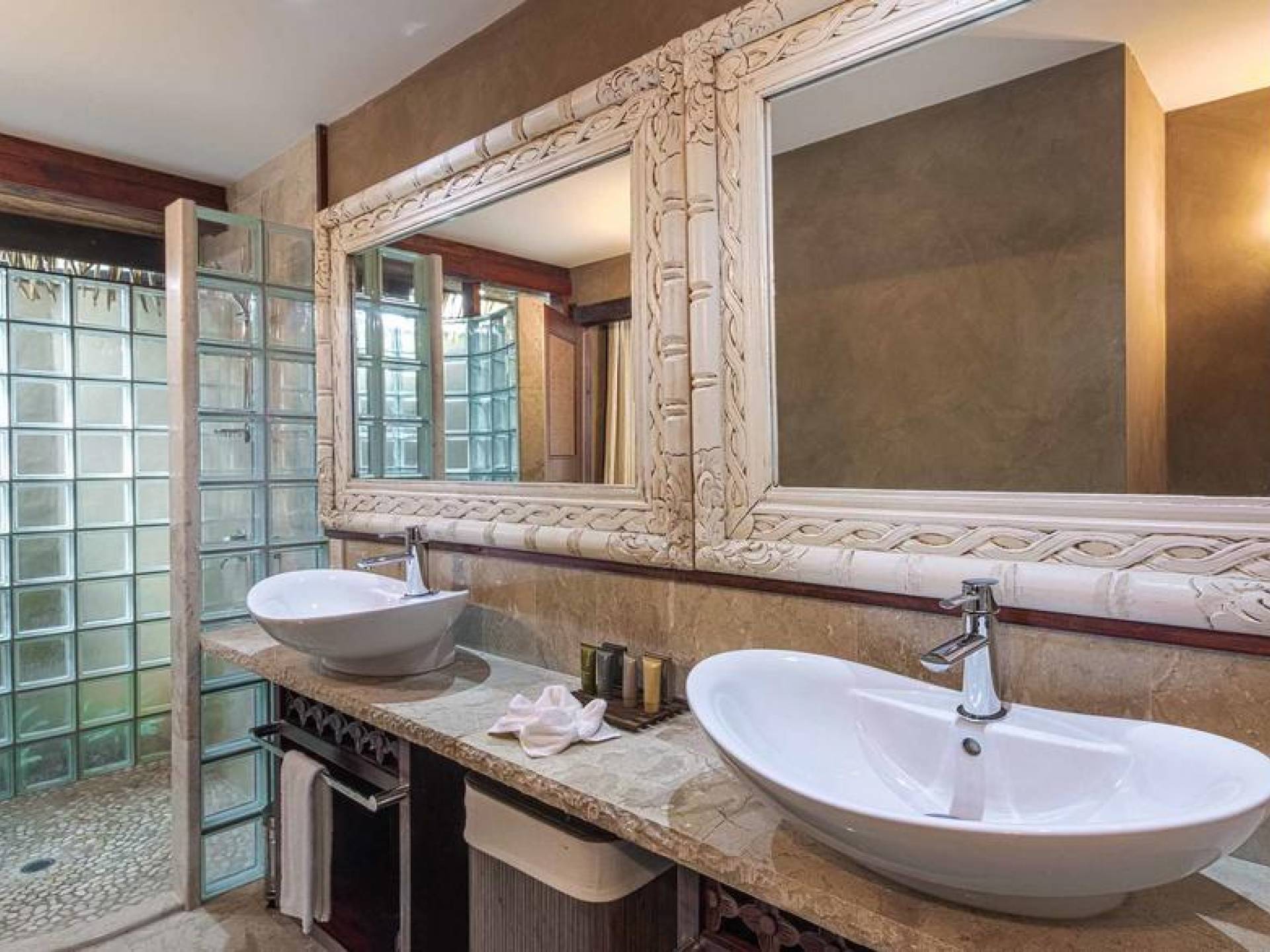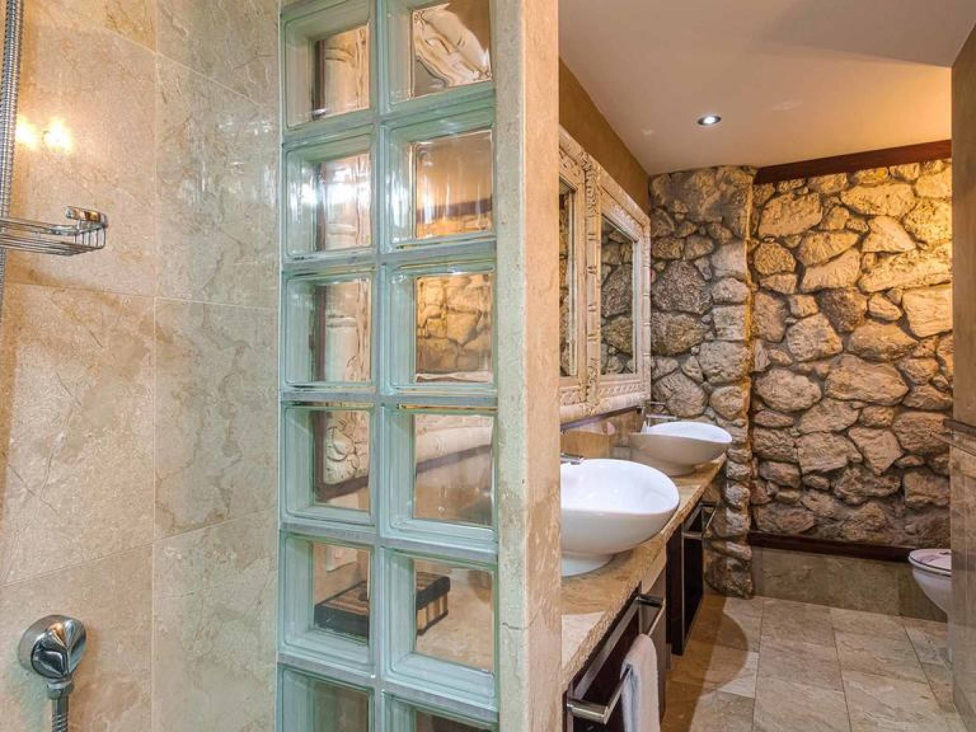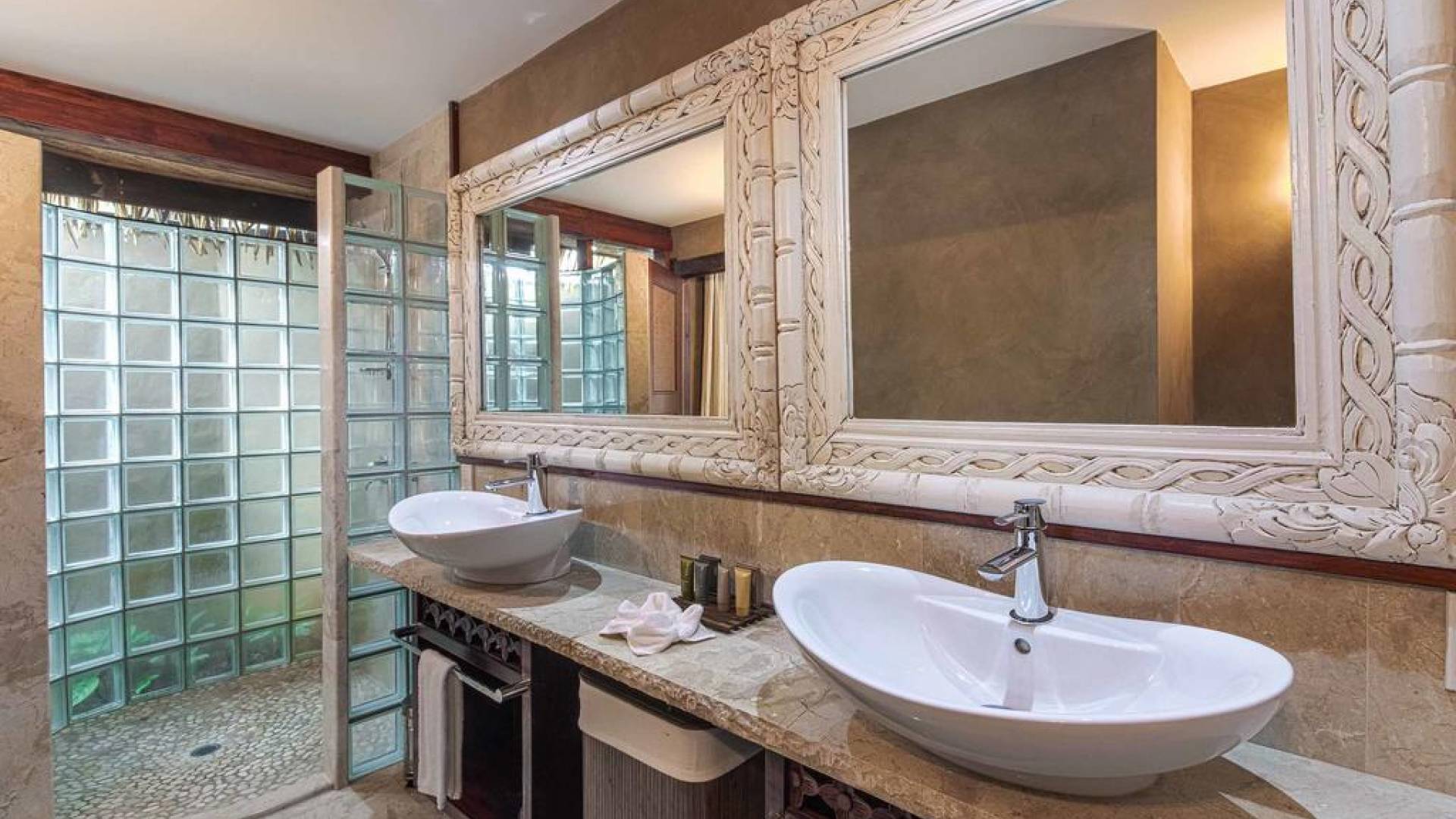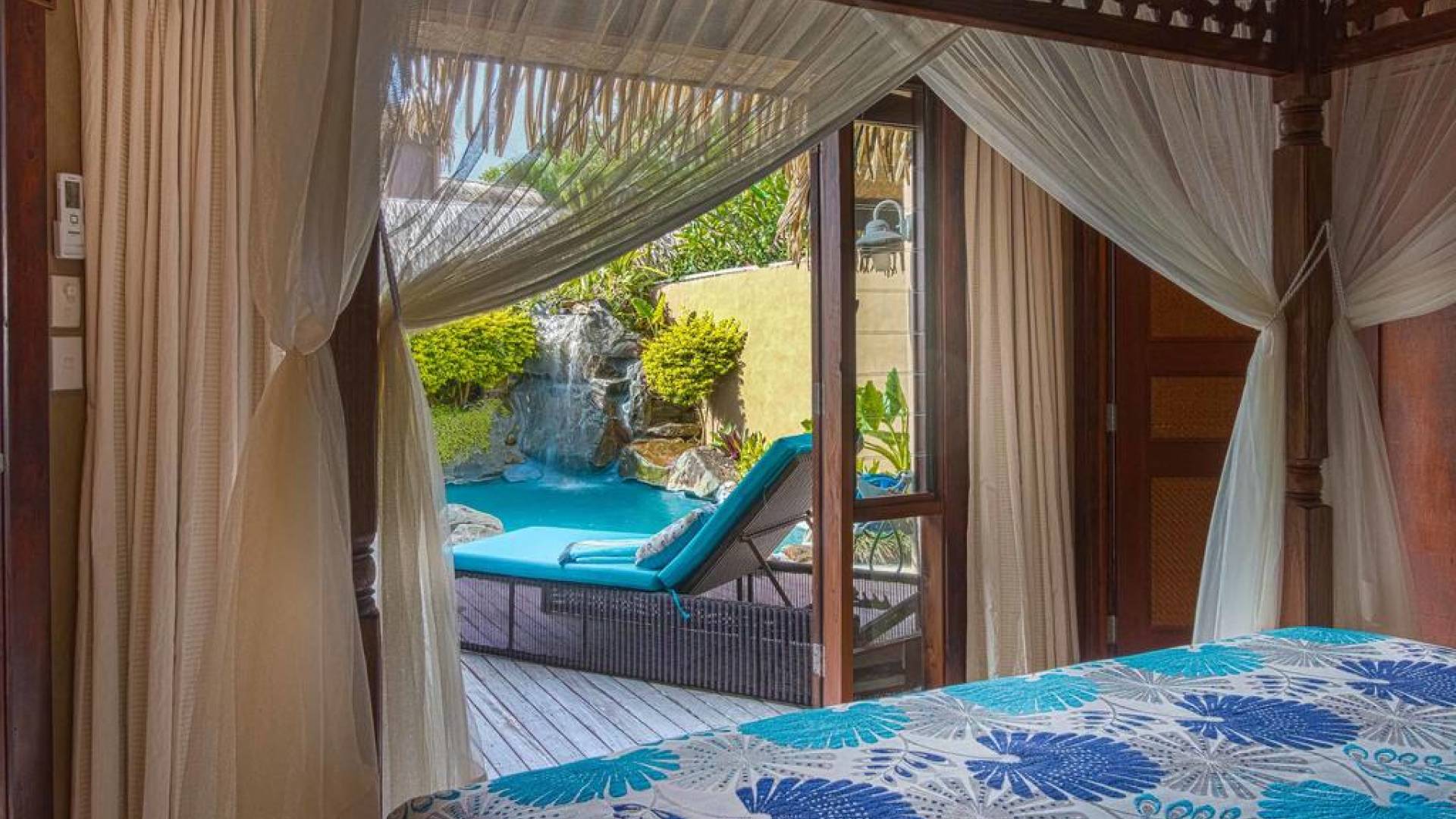 The interior of the Villa features two bedrooms with each having four-poster super king canopied beds, and two bathrooms with each having two basins, bidet, toilet, marble, hand-carved mirrors, Italian fittings, and a shower for two. There is also a canopied full-length Day Bed and in the living room a 46 inch TV with full surround sound audio/visual system, with over 400 DVDs and CDs for your enjoyment. Through the interior, you will find a stream with a bridge across into bedrooms, complete with small local fish. The kitchen is fully equipped, has an Italian espresso machine, and a dining area with Rumours handpainted dinnerware.