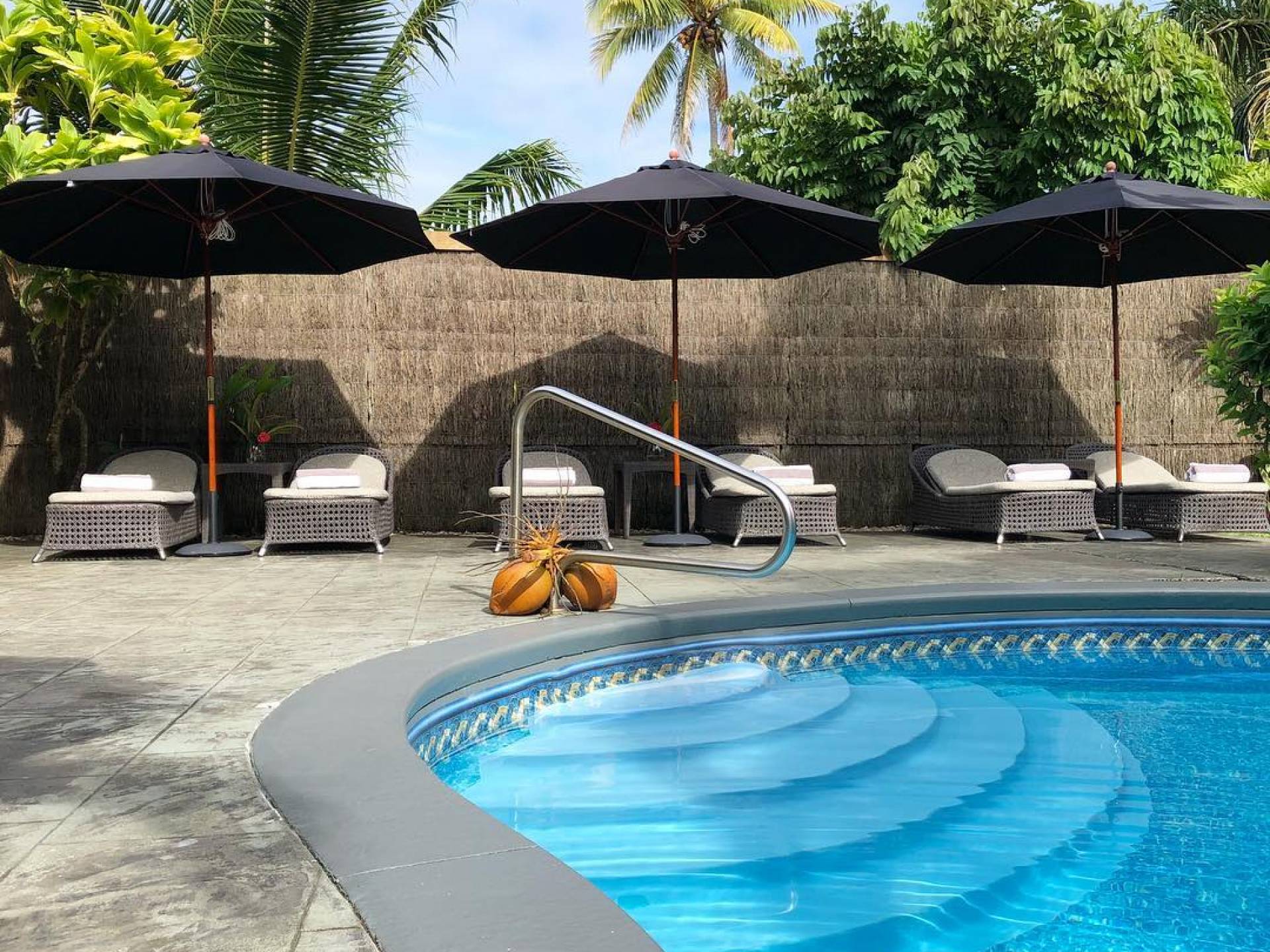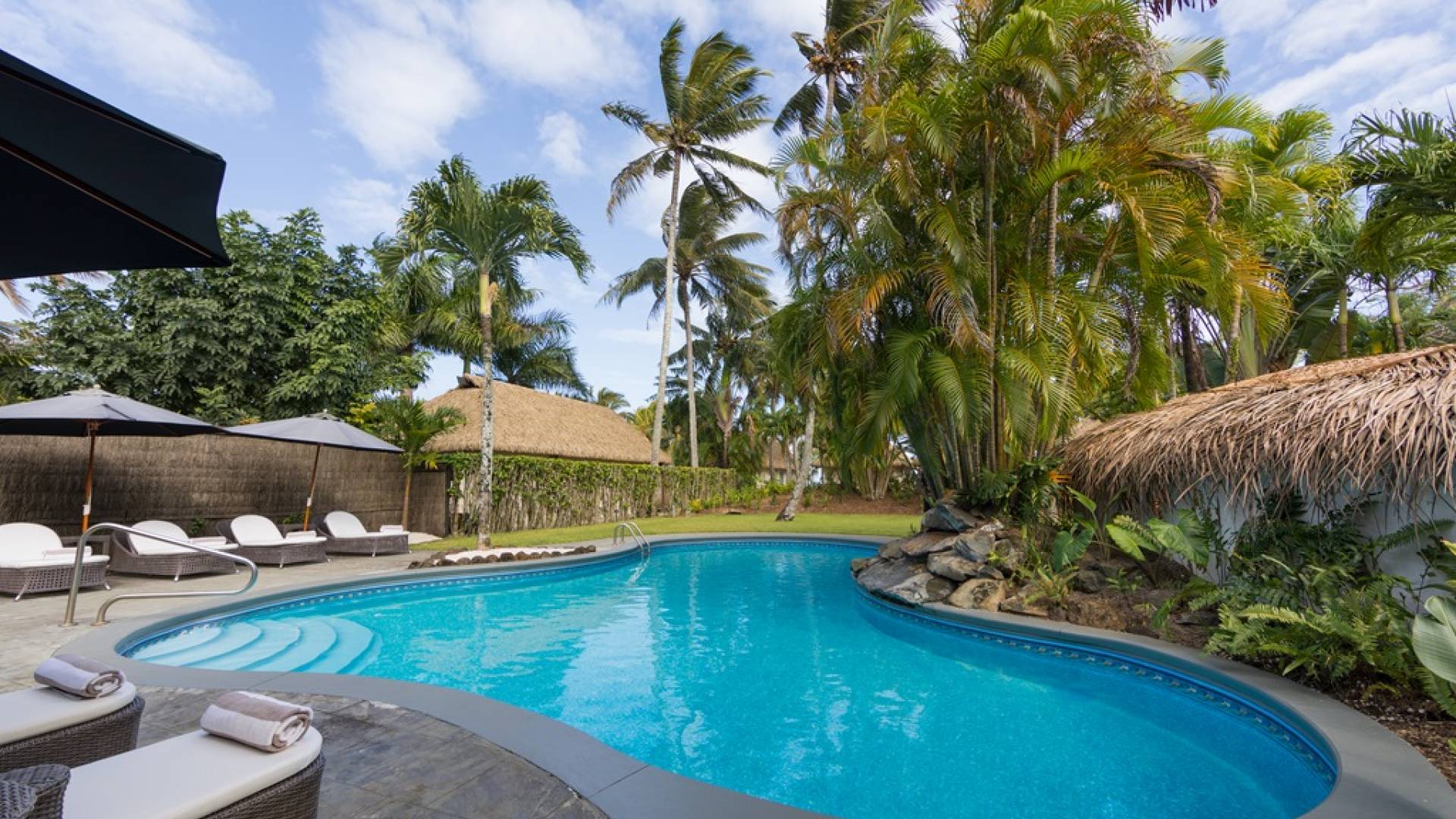 Paradise, by true definition. Situated on the majestic Titikaveka Beach, Royale Takitumu is the epitome of serenity, luxury, and intimacy. Surrounded by beautifully manicured gardens, palm tree-lined pathways lead to the stunning azure lagoon. The ten private, free-standing, thatched-roof villas offer unique, secluded, exclusive accommodation in the heart of South Seas Polynesia. Enjoy the warm waters of the lagoon, or lounge by the large freshwater pool under palm trees. Should you feel social, join in the exclusive weekly events, enjoying fun in the sun and mingling with other guests.