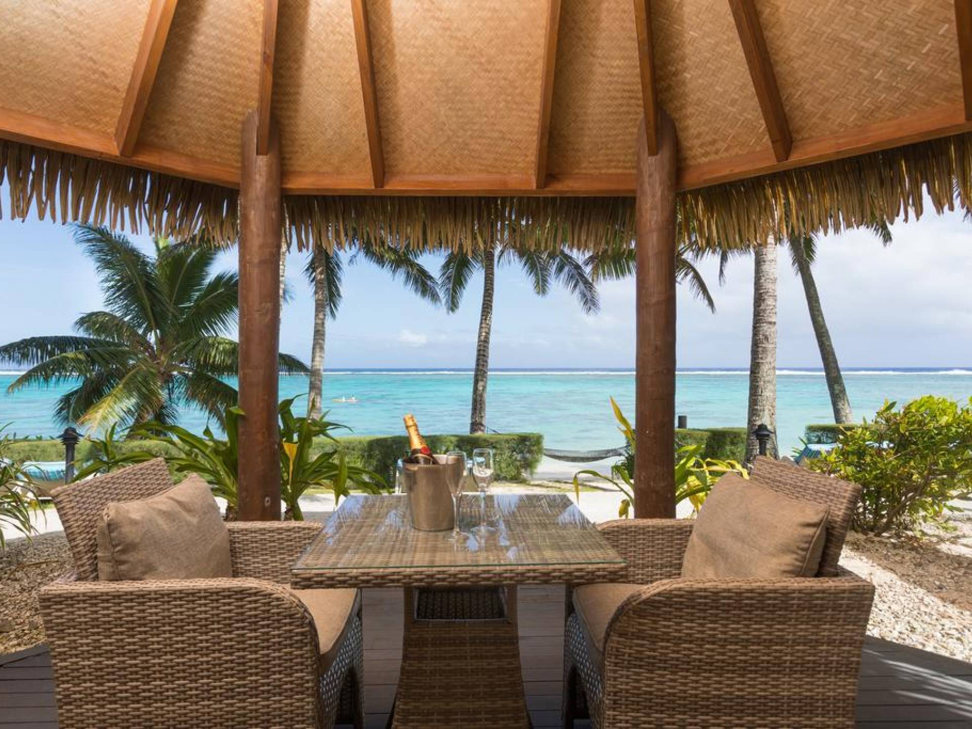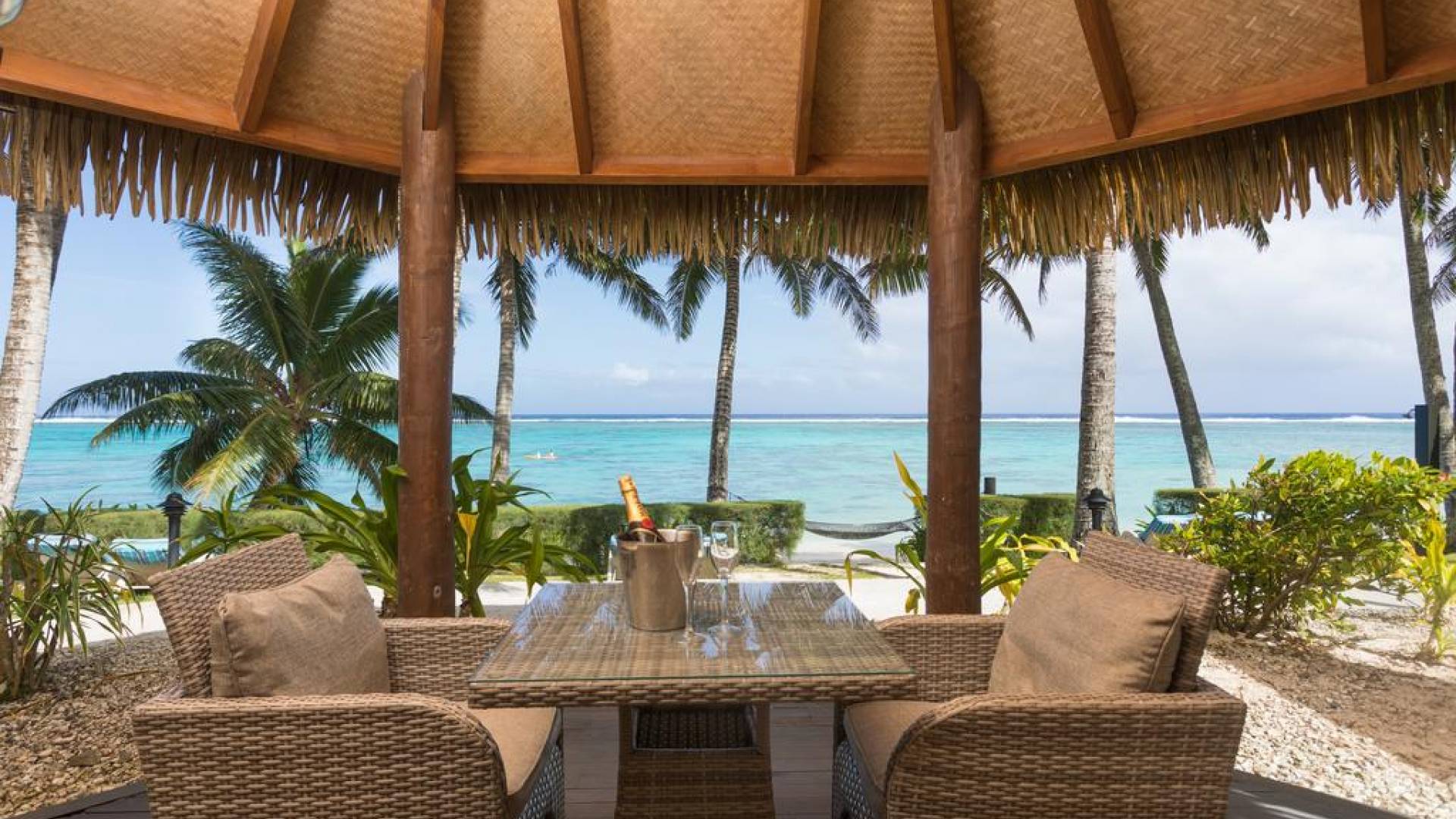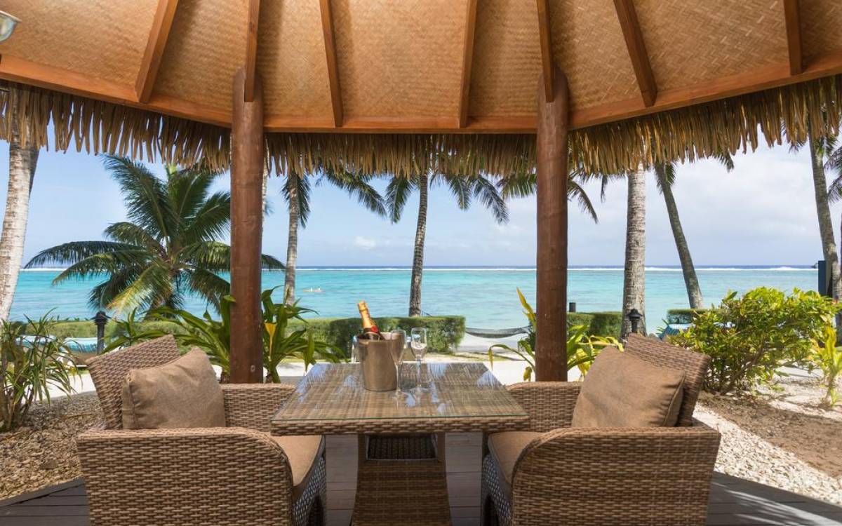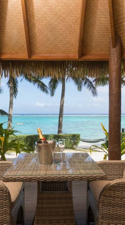 Right on the edge of our magnificent white sand beach is where you will find the four Beachfront Villas. Enjoy spectacular views of Titikaveka Lagoon and the reef beyond. With complete privacy, enjoy a retreat here in a little paradise. Designed in true Polynesian style and decor, these thatched-roofed, private, free-standing Villas feature a full kitchen including a microwave, toaster, tea/coffee making facilities, a full-size refrigerator, and stovetop. The air-conditioned bedroom has a king-size bed, and the spacious bathroom boasts a spa bath. Each Beachfront Villa is equipped with a telephone, TV, DVD player, hairdryer, ceiling fans, in–room safe, and an iron.