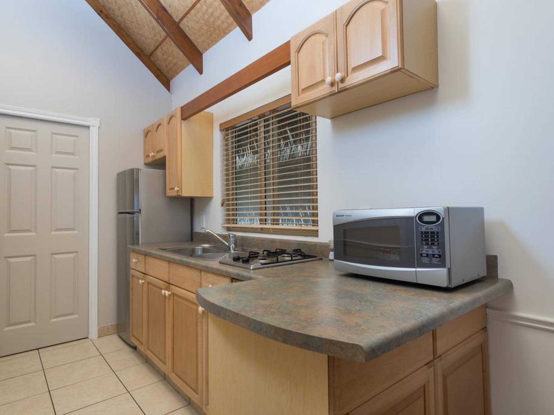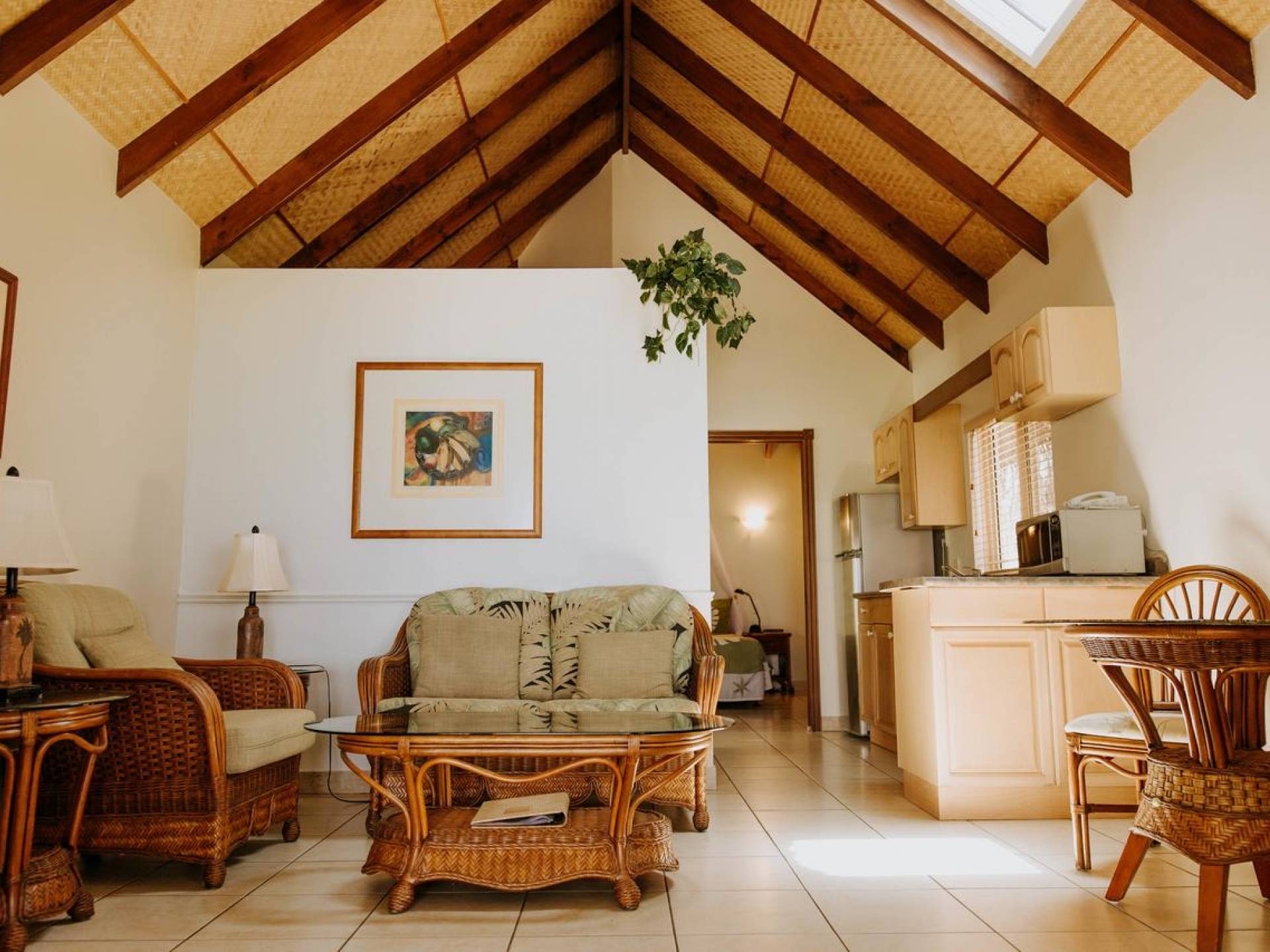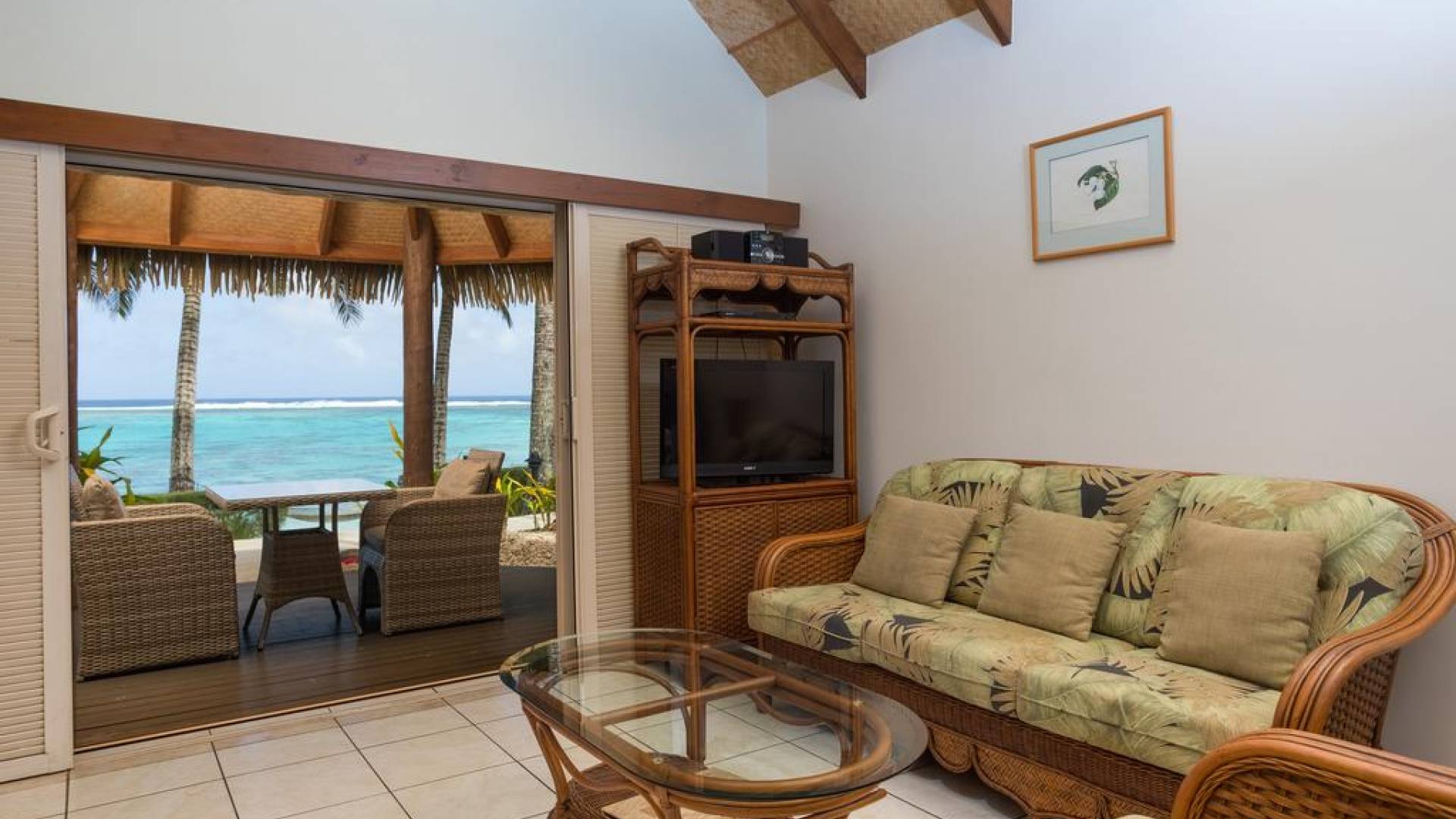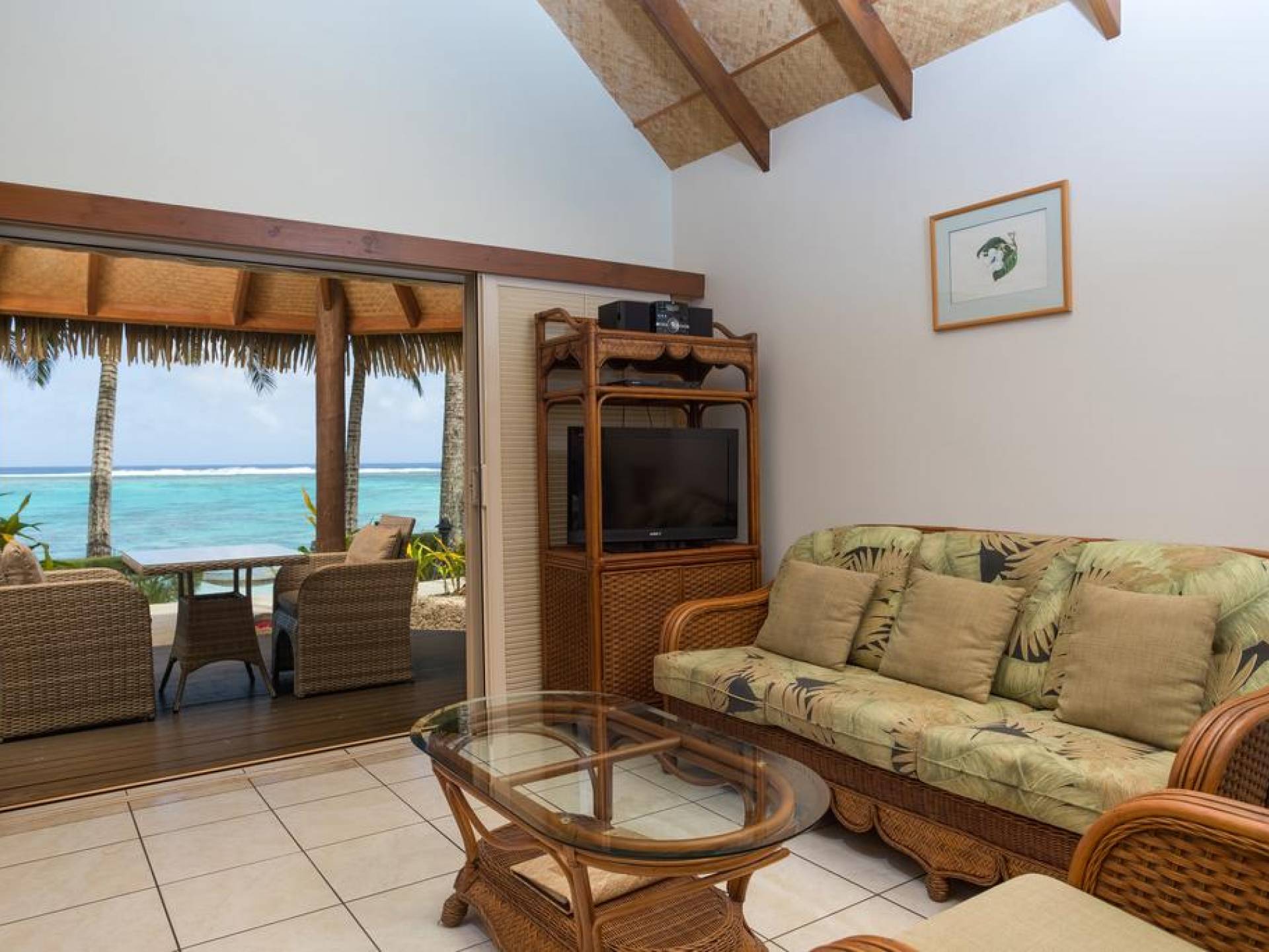 Right on the edge of our magnificent white sand beach is where you will find the four Beachfront Villas. Enjoy spectacular views of Titikaveka Lagoon and the reef beyond. With complete privacy, enjoy a retreat here in a little paradise. Designed in true Polynesian style and decor, these thatched-roofed, private, free-standing Villas feature a full kitchen including a microwave, toaster, tea/coffee making facilities, a full-size refrigerator, and stovetop. The air-conditioned bedroom has a king-size bed, and the spacious bathroom boasts a spa bath. Each Beachfront Villa is equipped with a telephone, TV, DVD player, hairdryer, ceiling fans, in–room safe, and an iron.