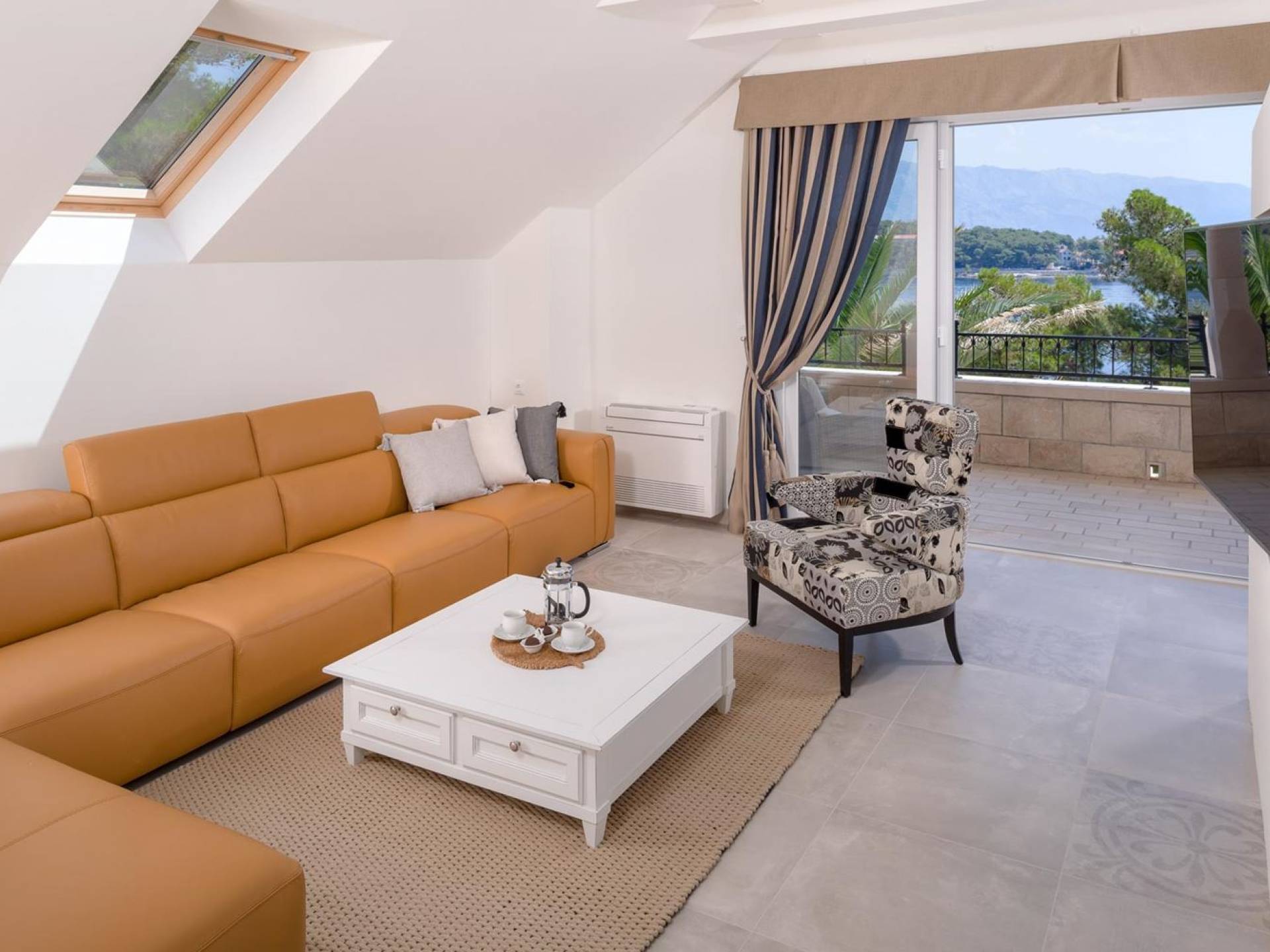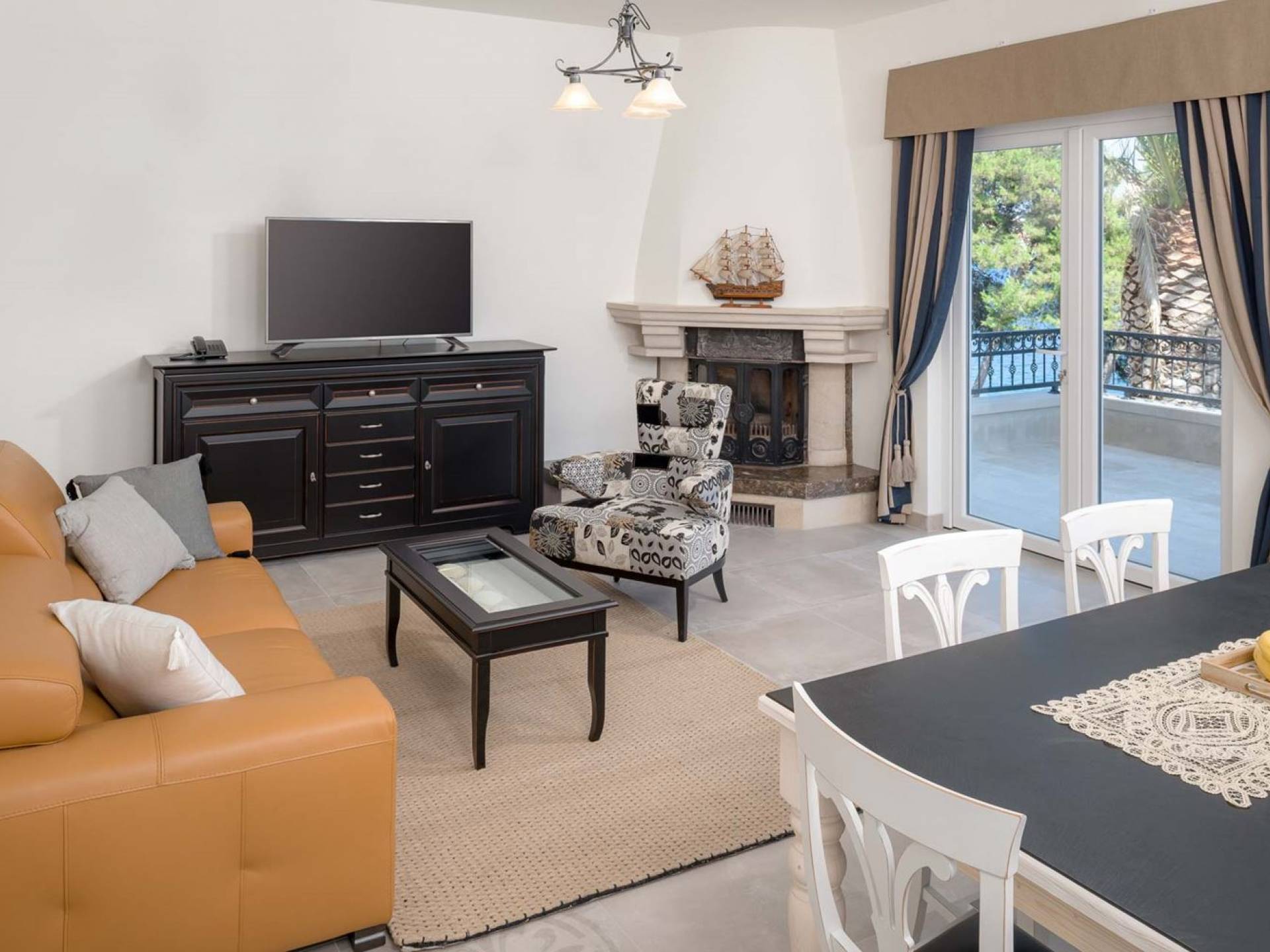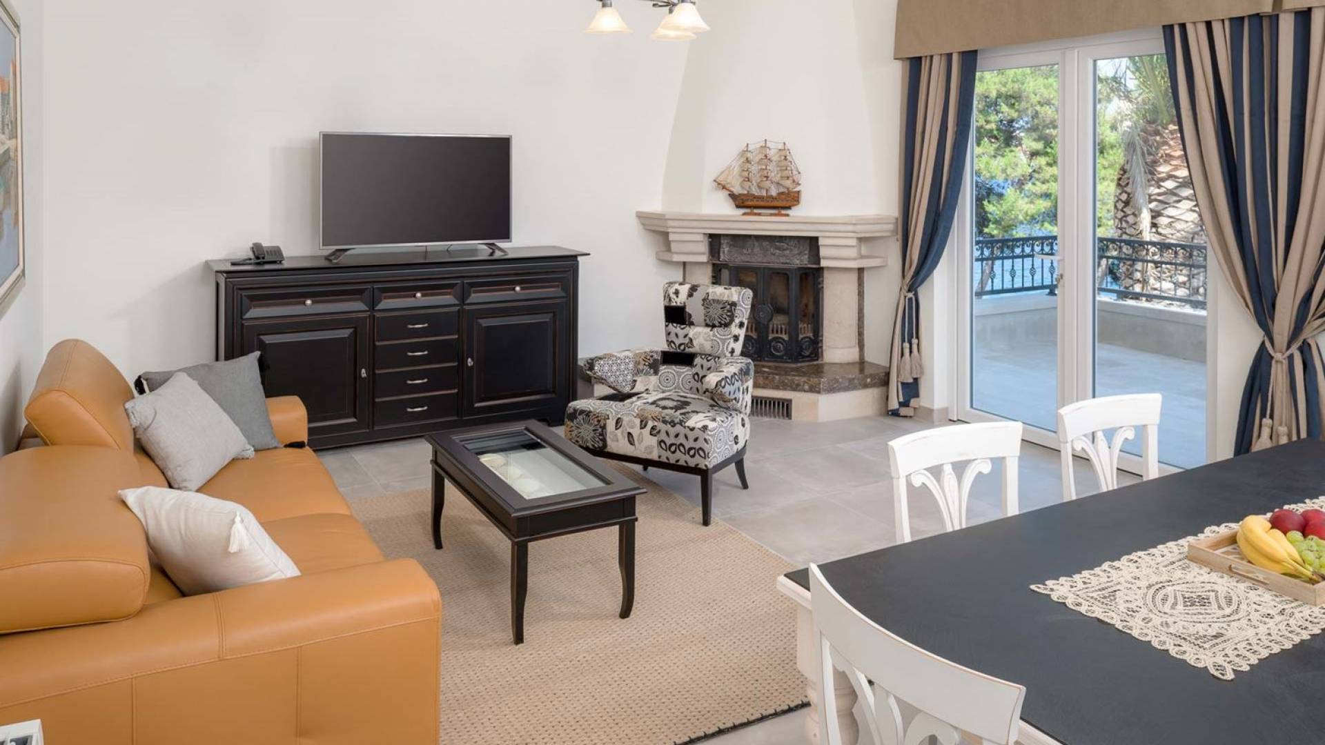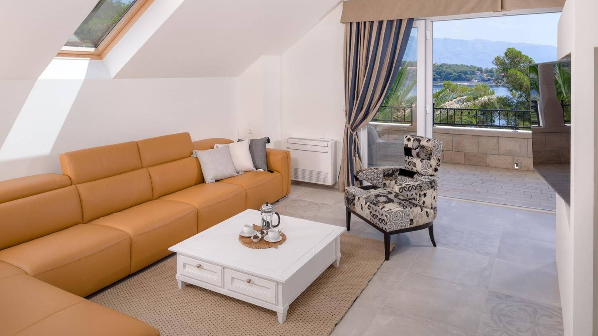 The ground floor is connected with outdoor steps to the first floor where you will find one twin and another double bedroom. If you like to escape from others and take a few minutes for yourselves, there is another living area where you can do so. Another smaller kitchen and large terrace with a beautiful view of nearby islands Hvar and Peljesac are at your disposal as well.