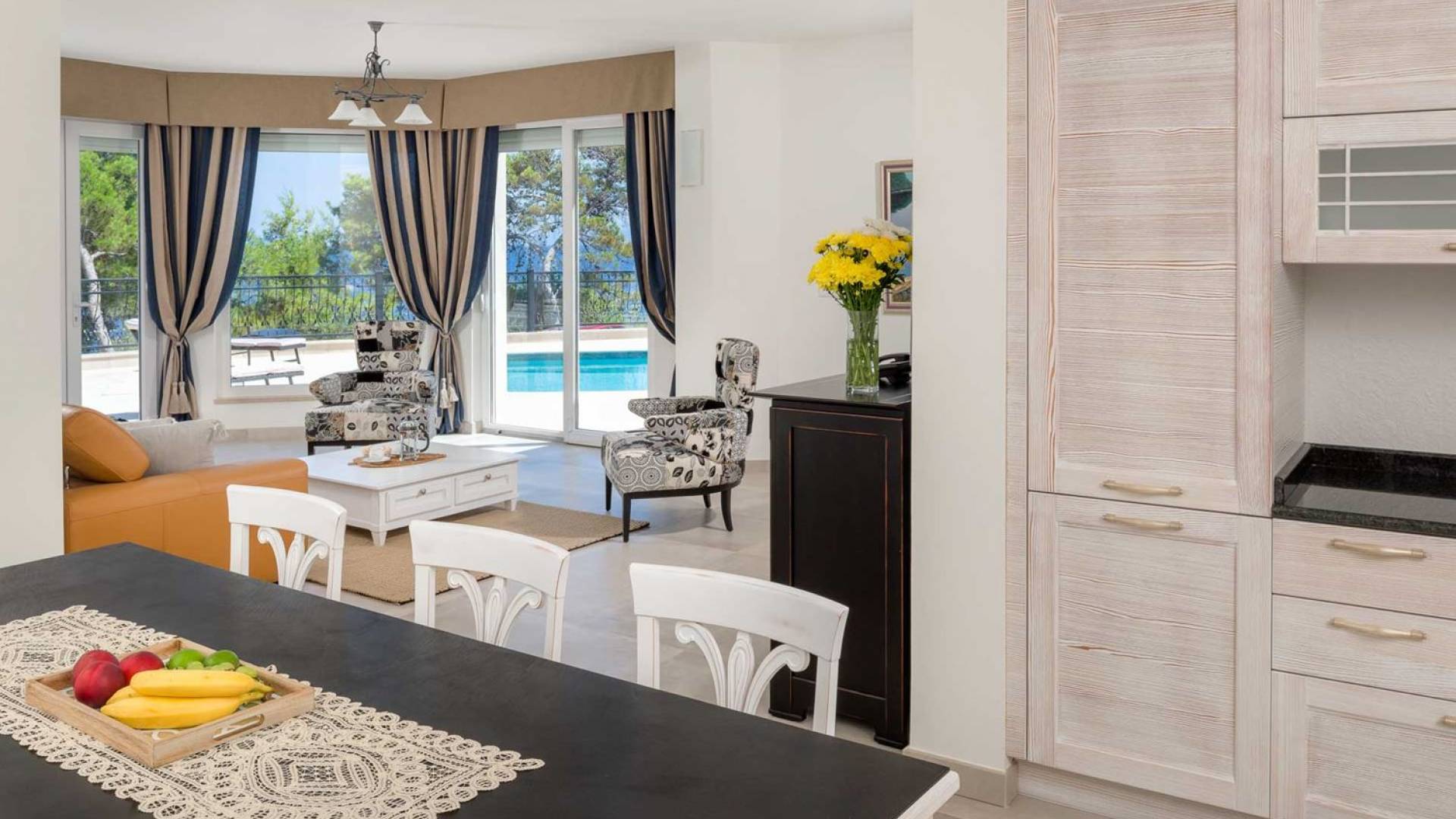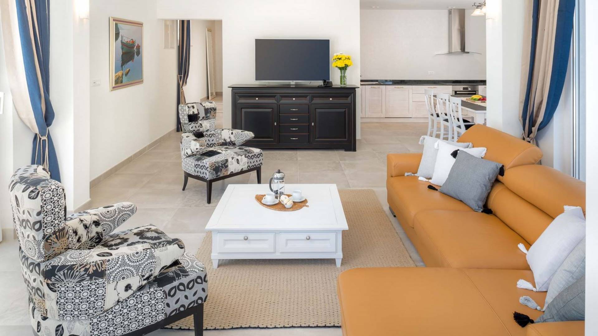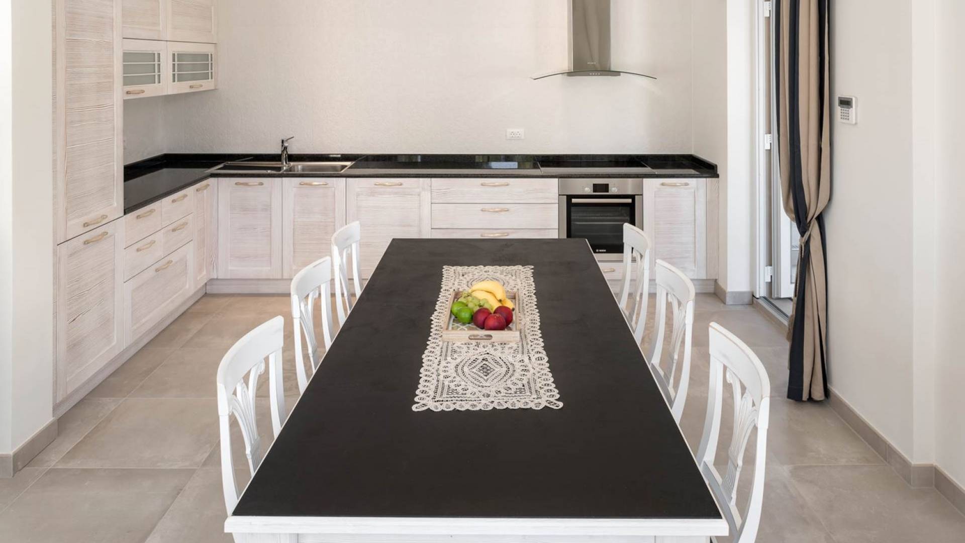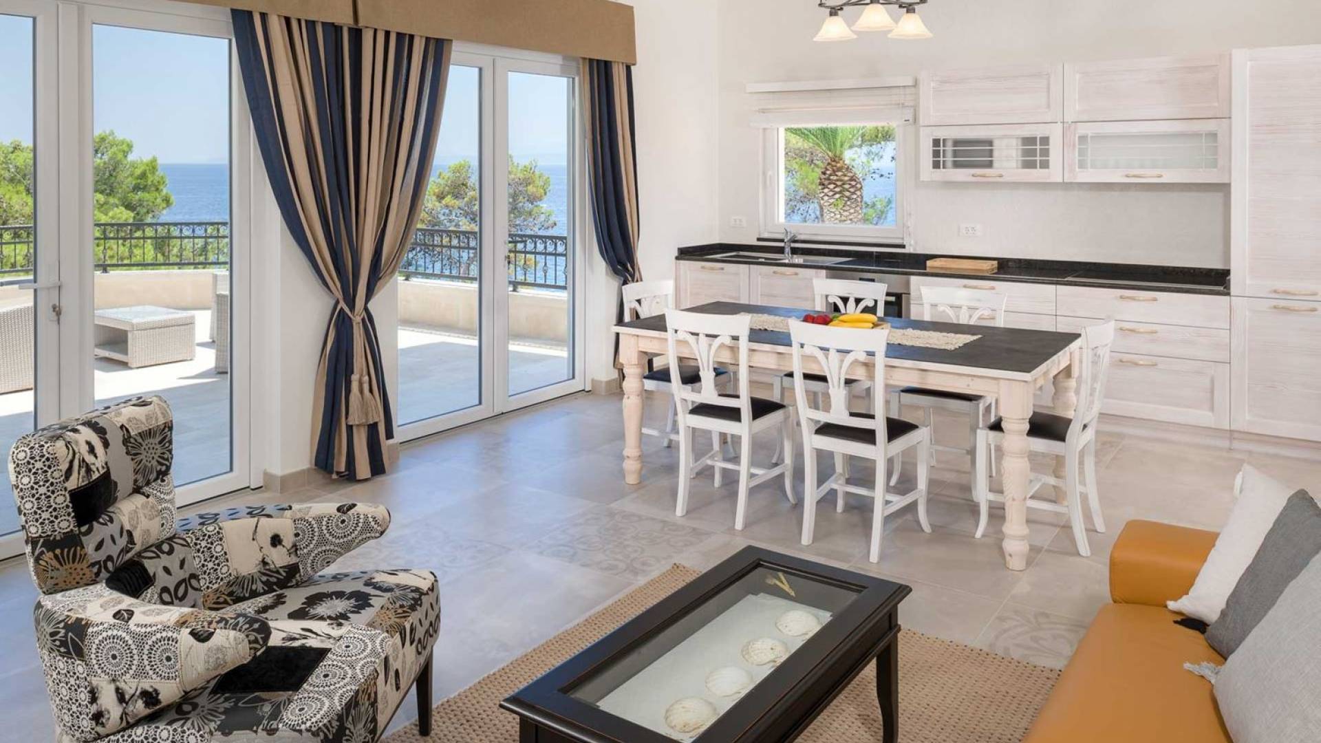 On the ground floor of Villa Freya, there are 3 double bedrooms each with private bathrooms. On this level, there is also a spacious living area with access to the terrace, swimming pool and overlooking the sea, dining area, and fully equipped kitchen.