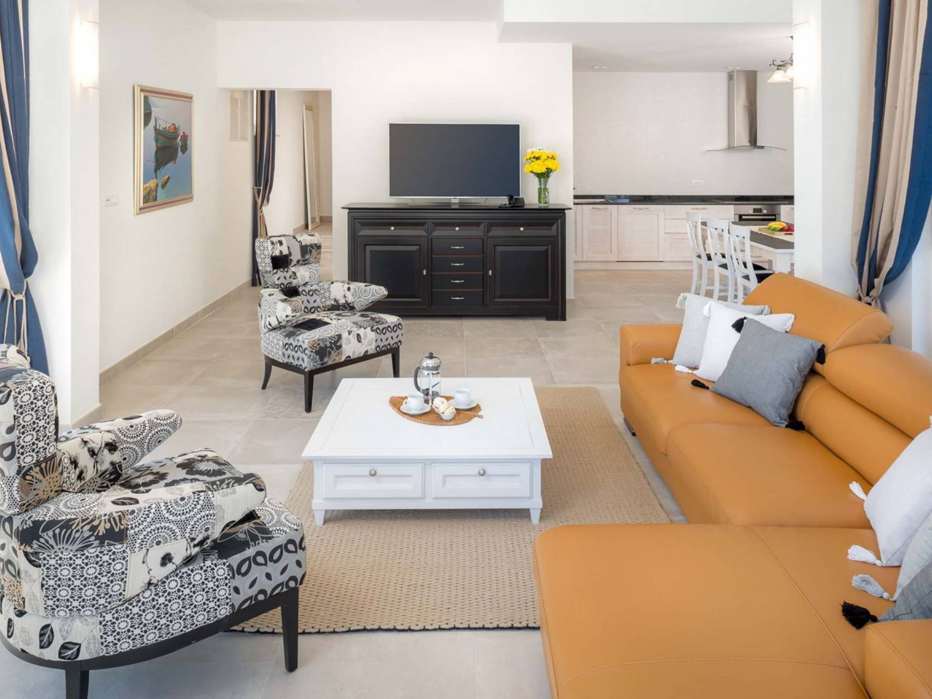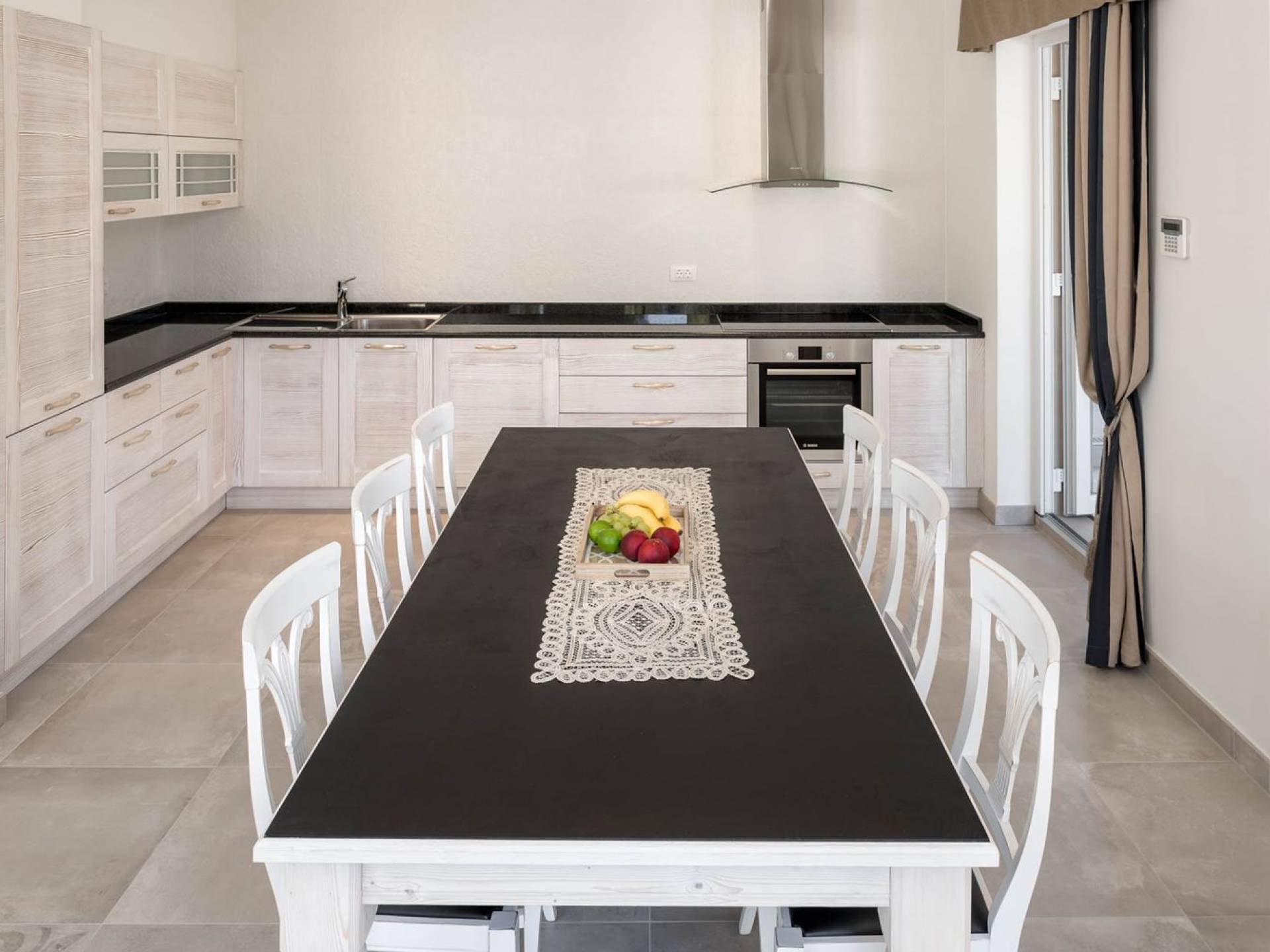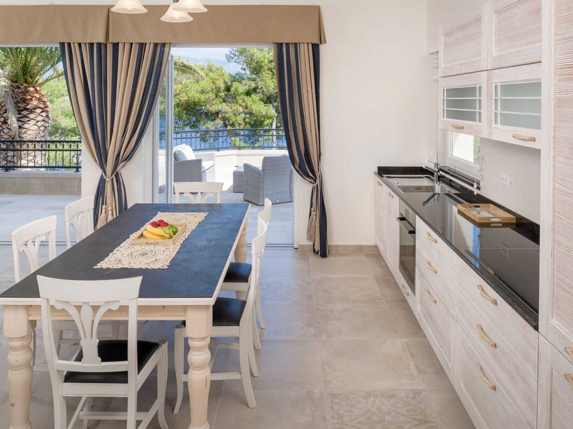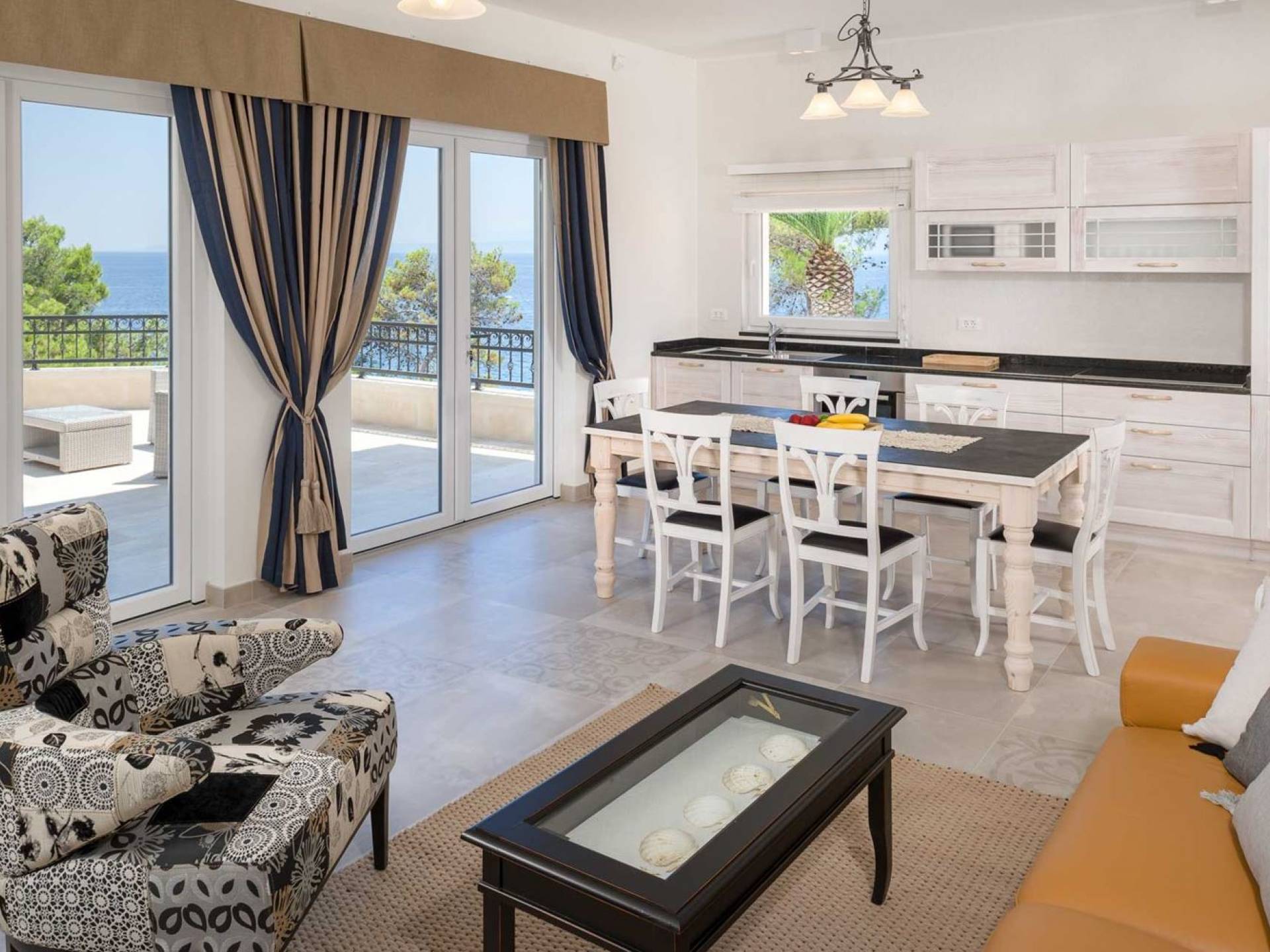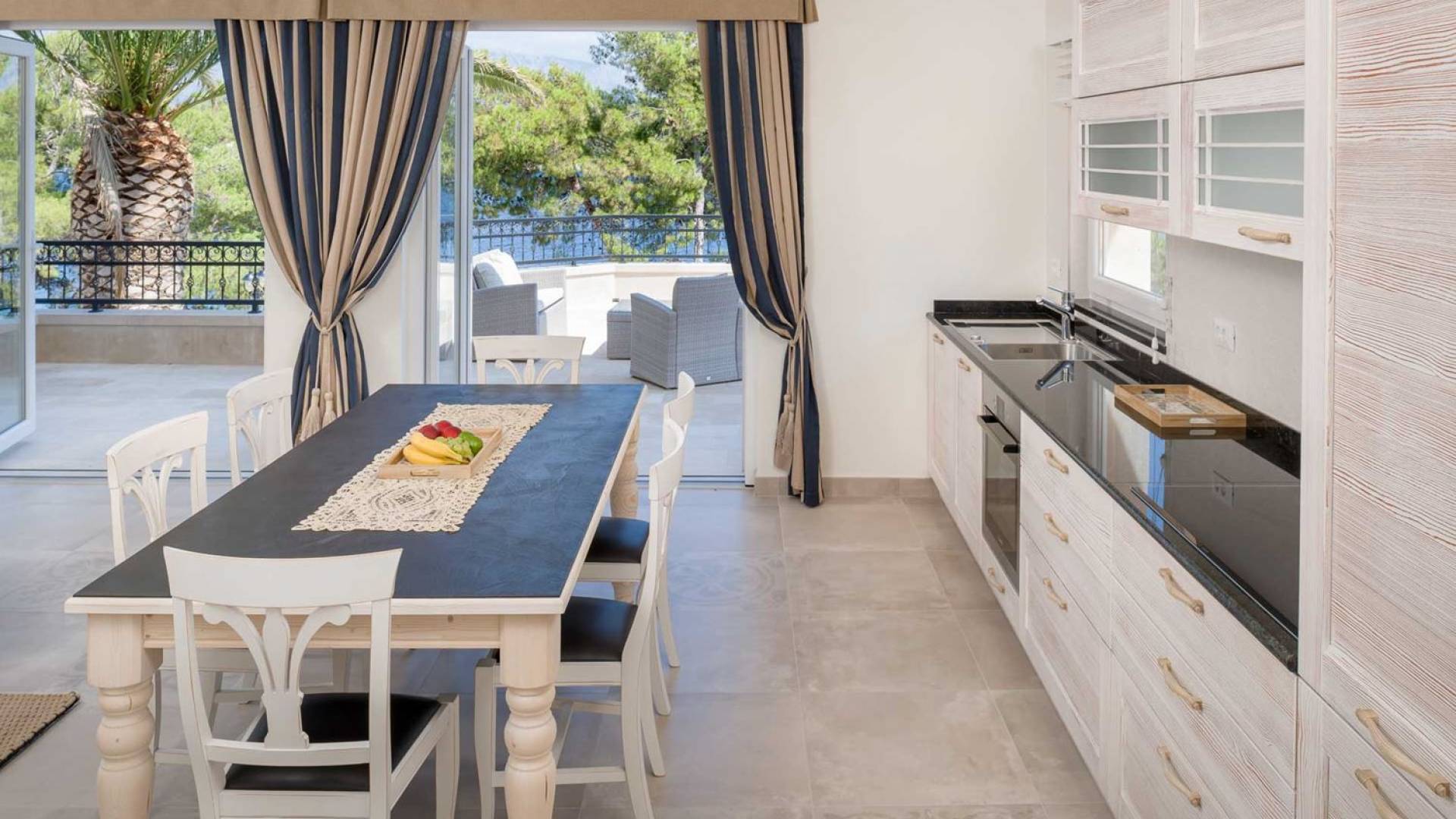 On the ground floor of Villa Freya, there are 3 double bedrooms each with private bathrooms. On this level, there is also a spacious living area with access to the terrace, swimming pool and overlooking the sea, dining area, and fully equipped kitchen.