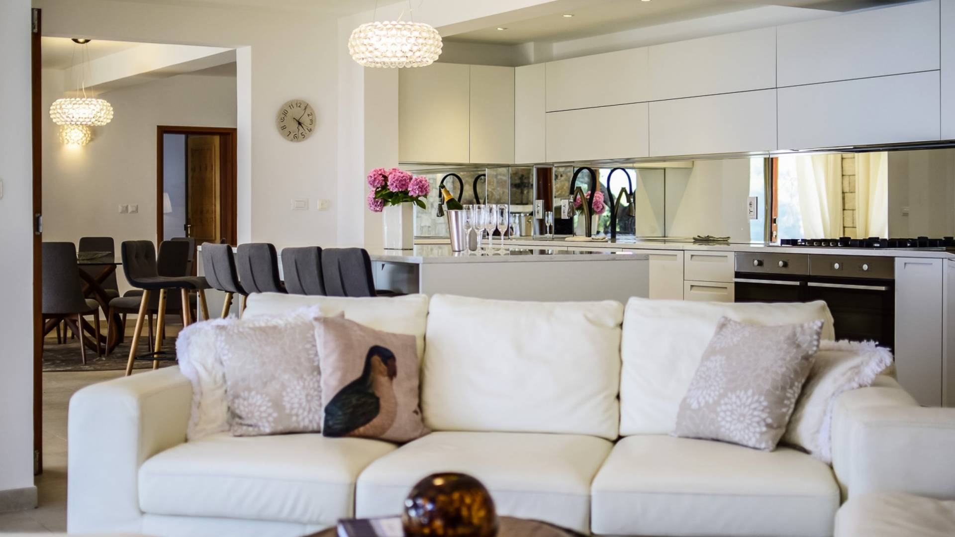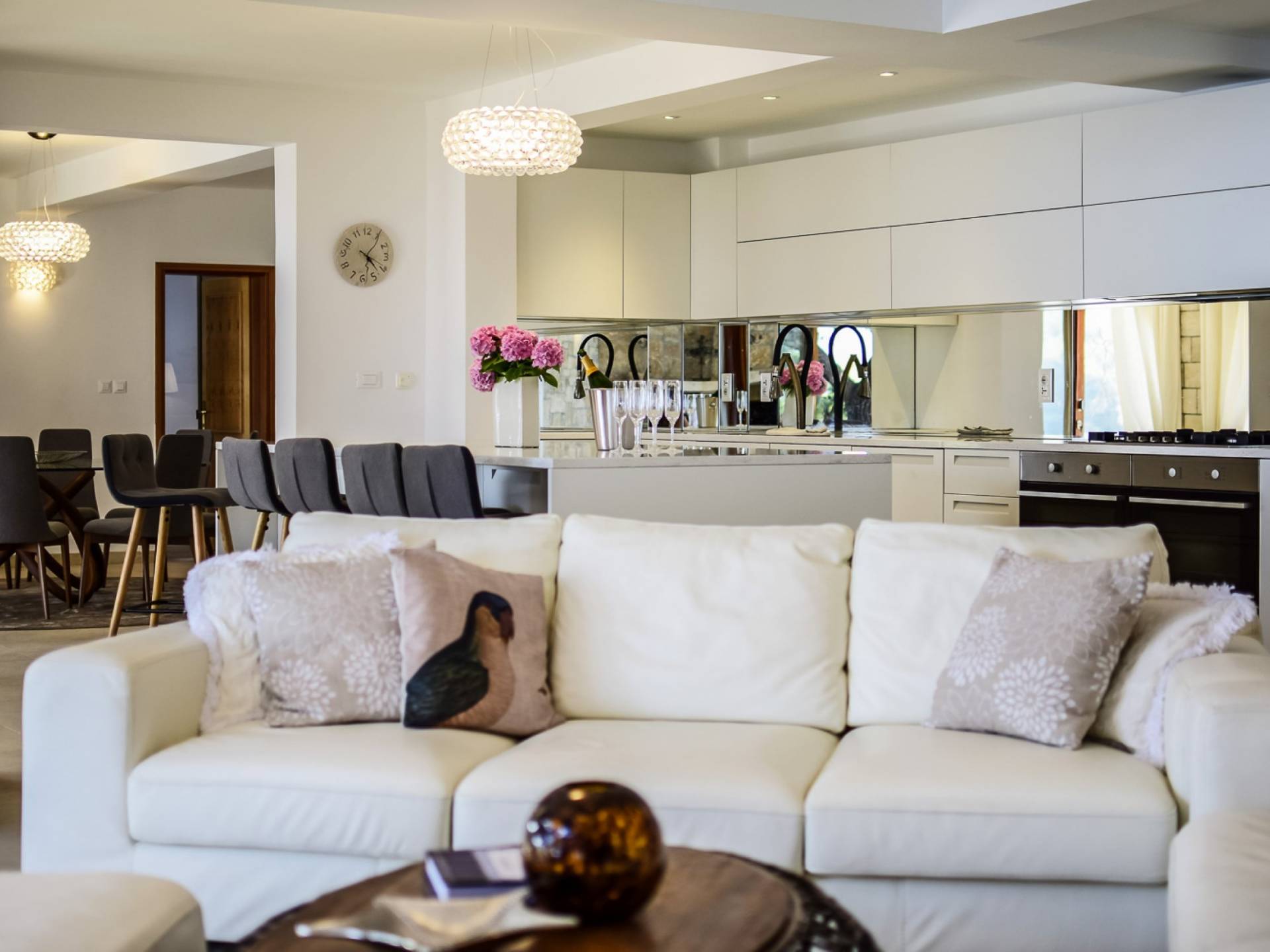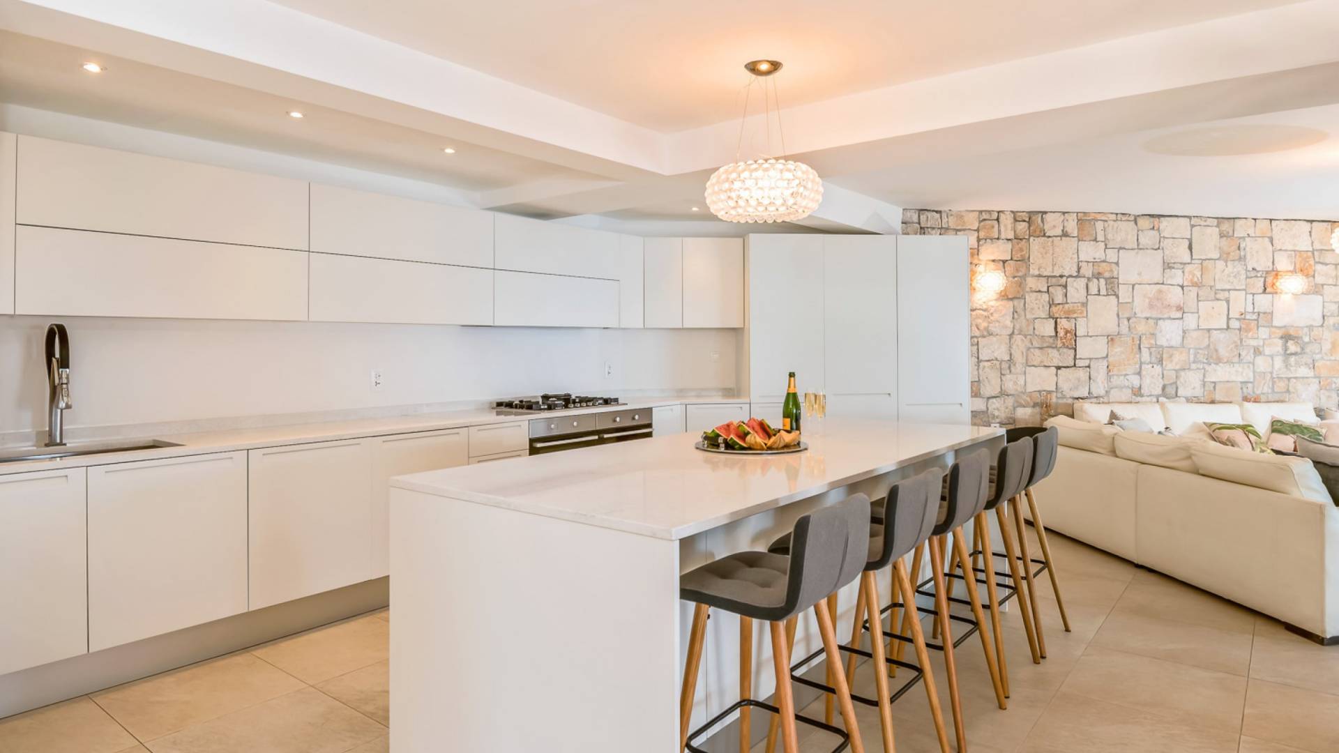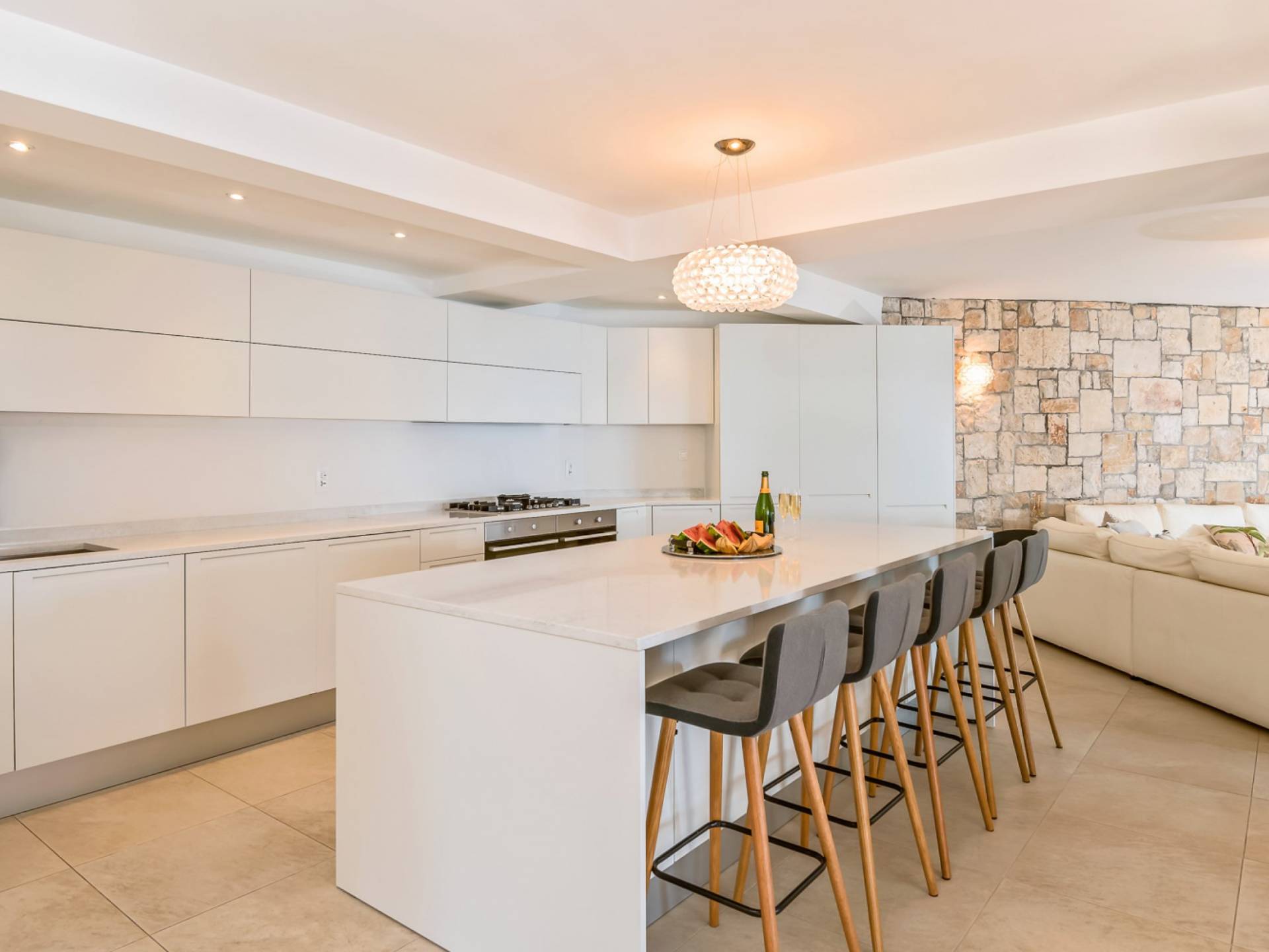 The ground floor of Villa Lavander features a spacious area assigned for relaxing. There you will find yourself inside a spacious area divided into several parts; fully equipped kitchen, dining and living room with cosy and comfortable modern sofas and stylish artwork, while large bi-fold doors connect it to the outdoor area with several sitting sofas, which maximizes the enjoyment of the stunning view of the entire bay. Here you can find also a spacious bedroom with a king-size bed, one single bed and an en-suite bathroom.