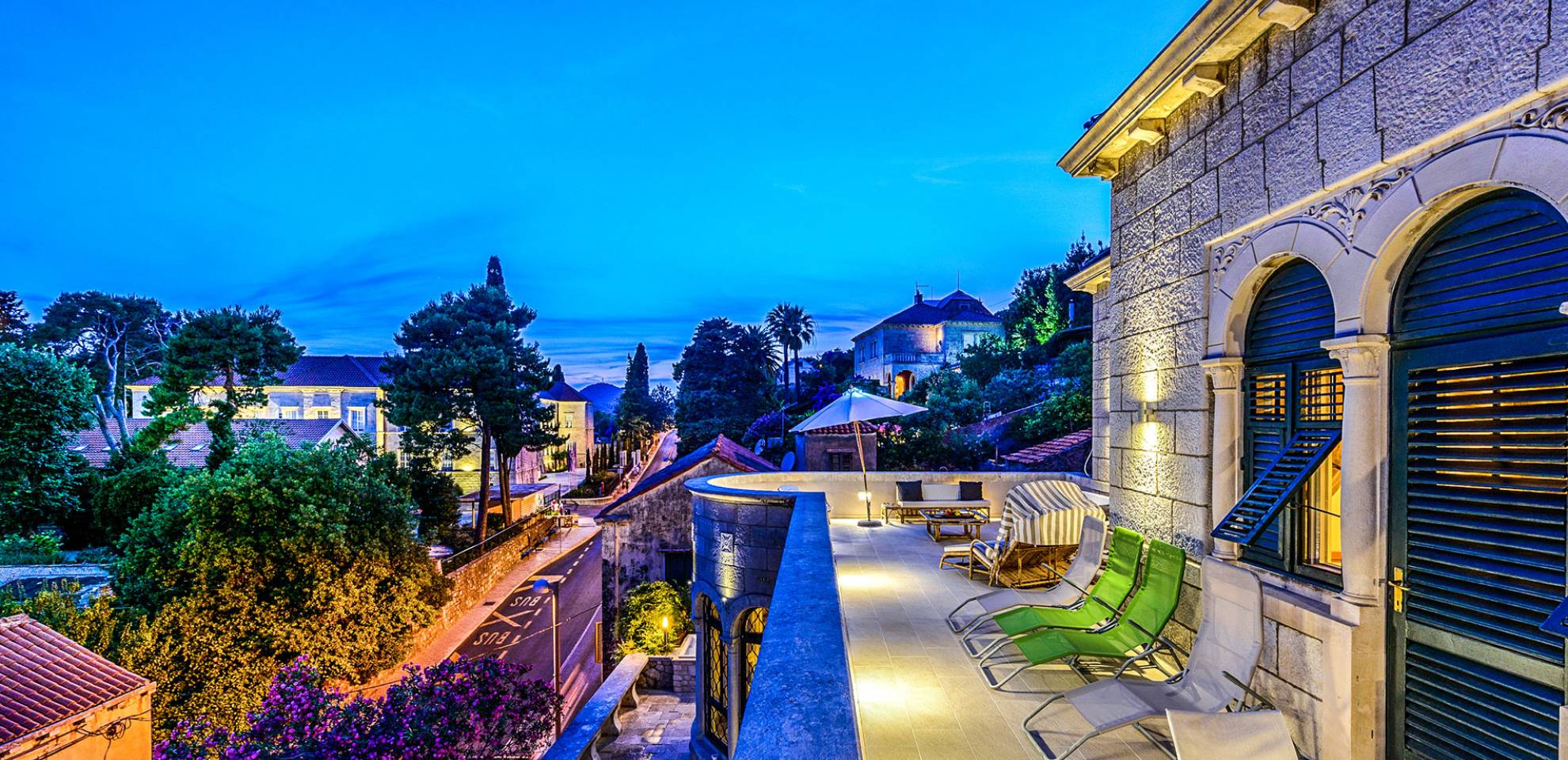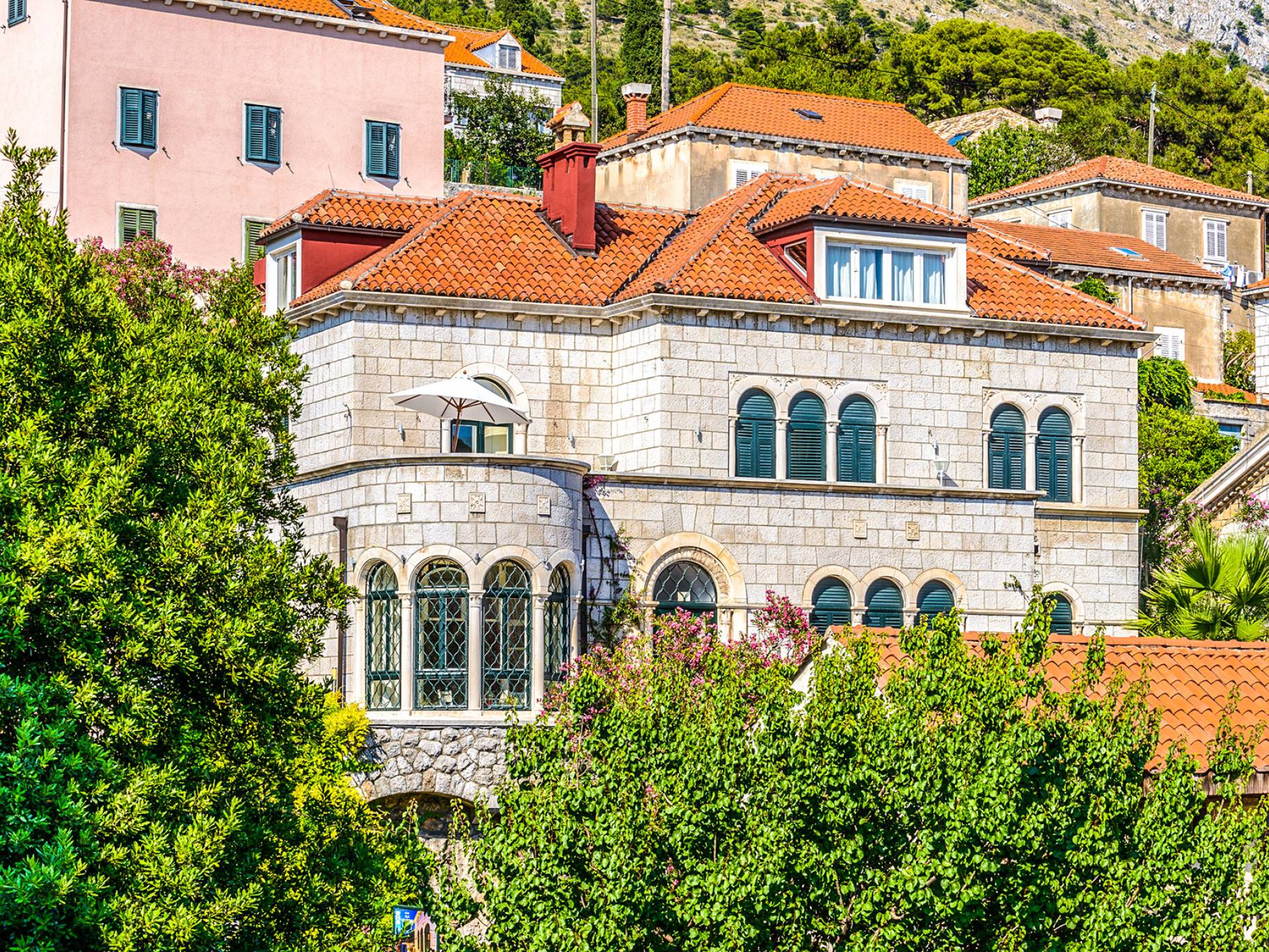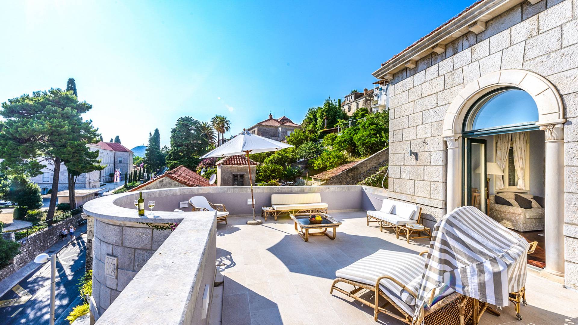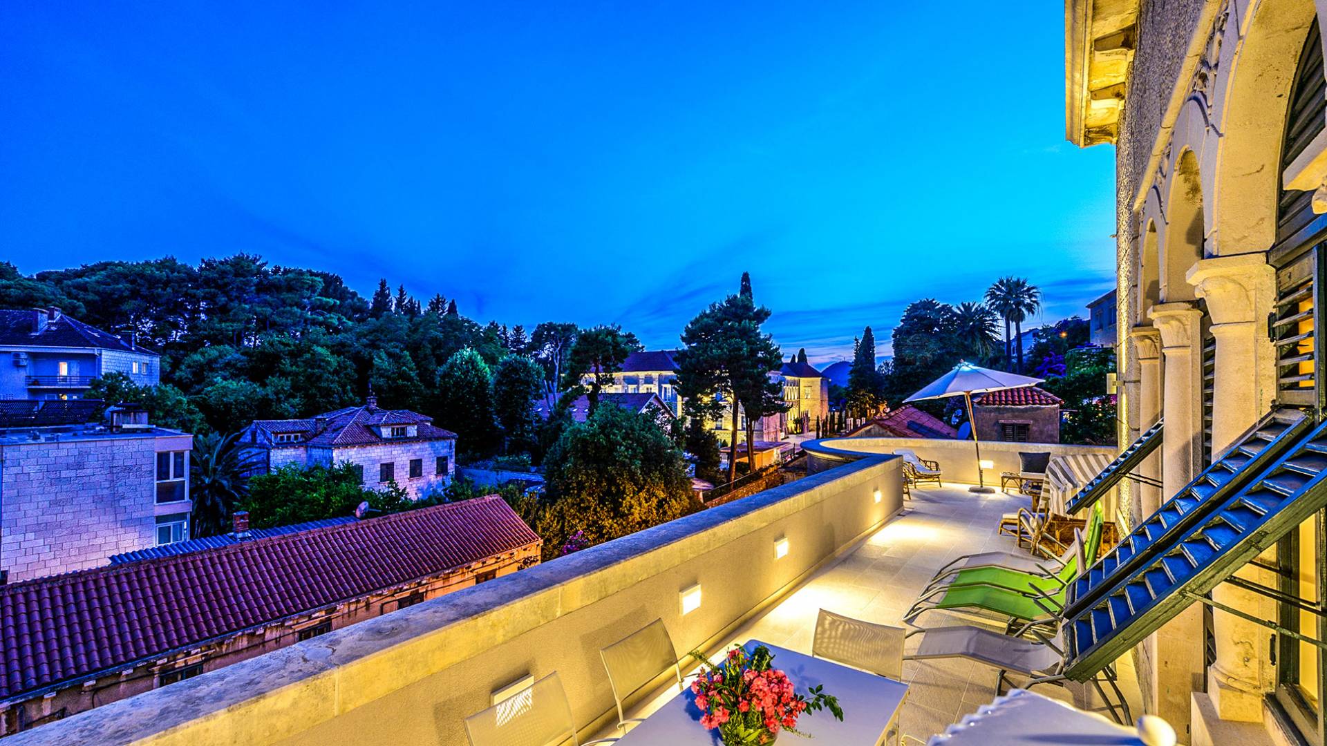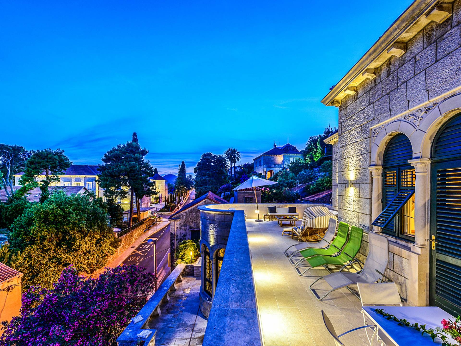 The views from the terrace brim with impressive samples of the 19th and 20th centuries architecture. The area surrounding the Villa was historically known as Dubrovnik's gardens, as the land around here had been cultivated as early as the 13th century. Following the expansion of residences outside the City Walls, imposing town villas were constructed here around the same time as the Villa Mediteran, hence the neighborhood glows with representative architecture. Across the street, the recently renovated Dubrovnik University building was originally a hospital, built in 1887 during the Austro-Hungarian period.