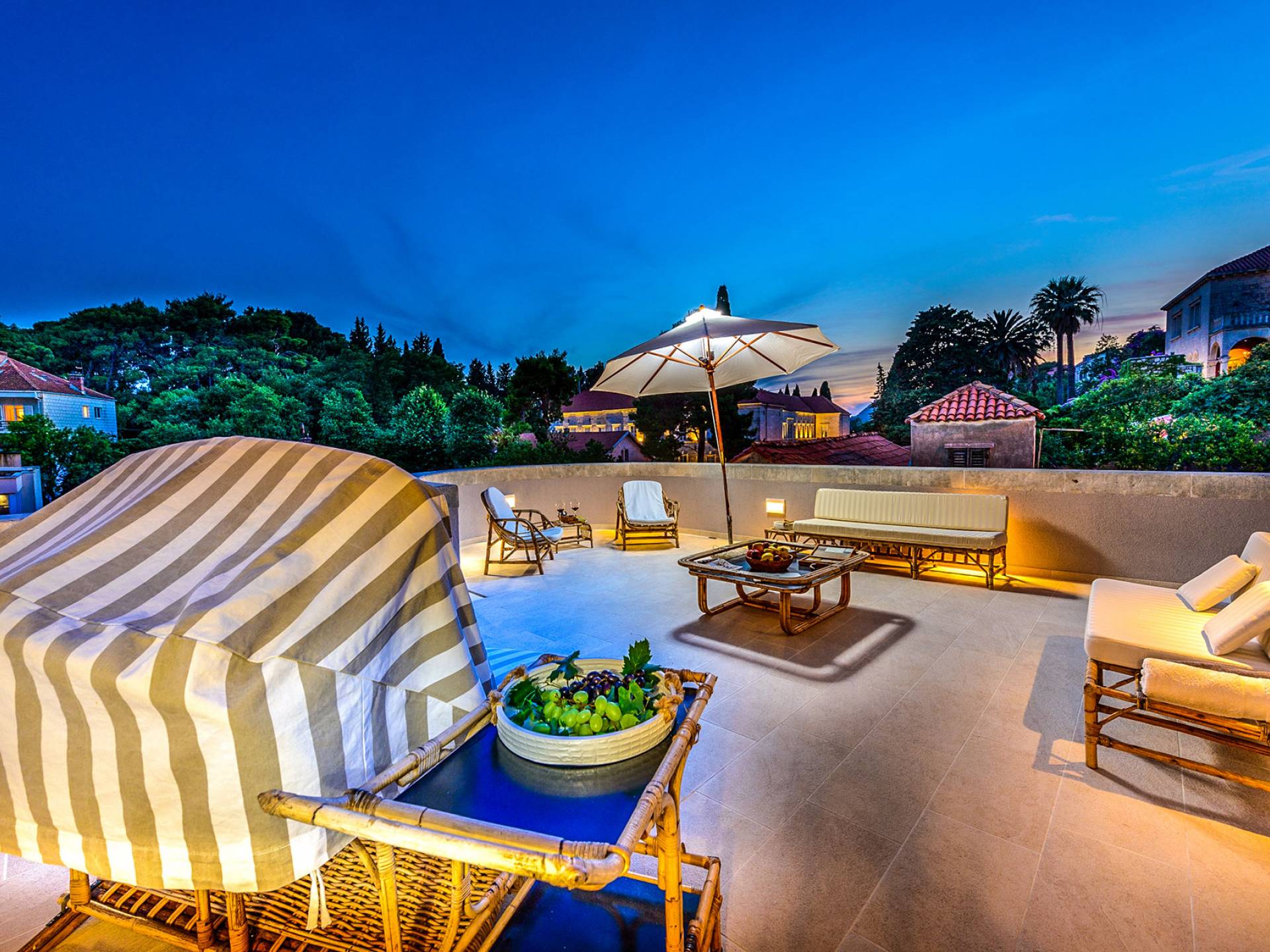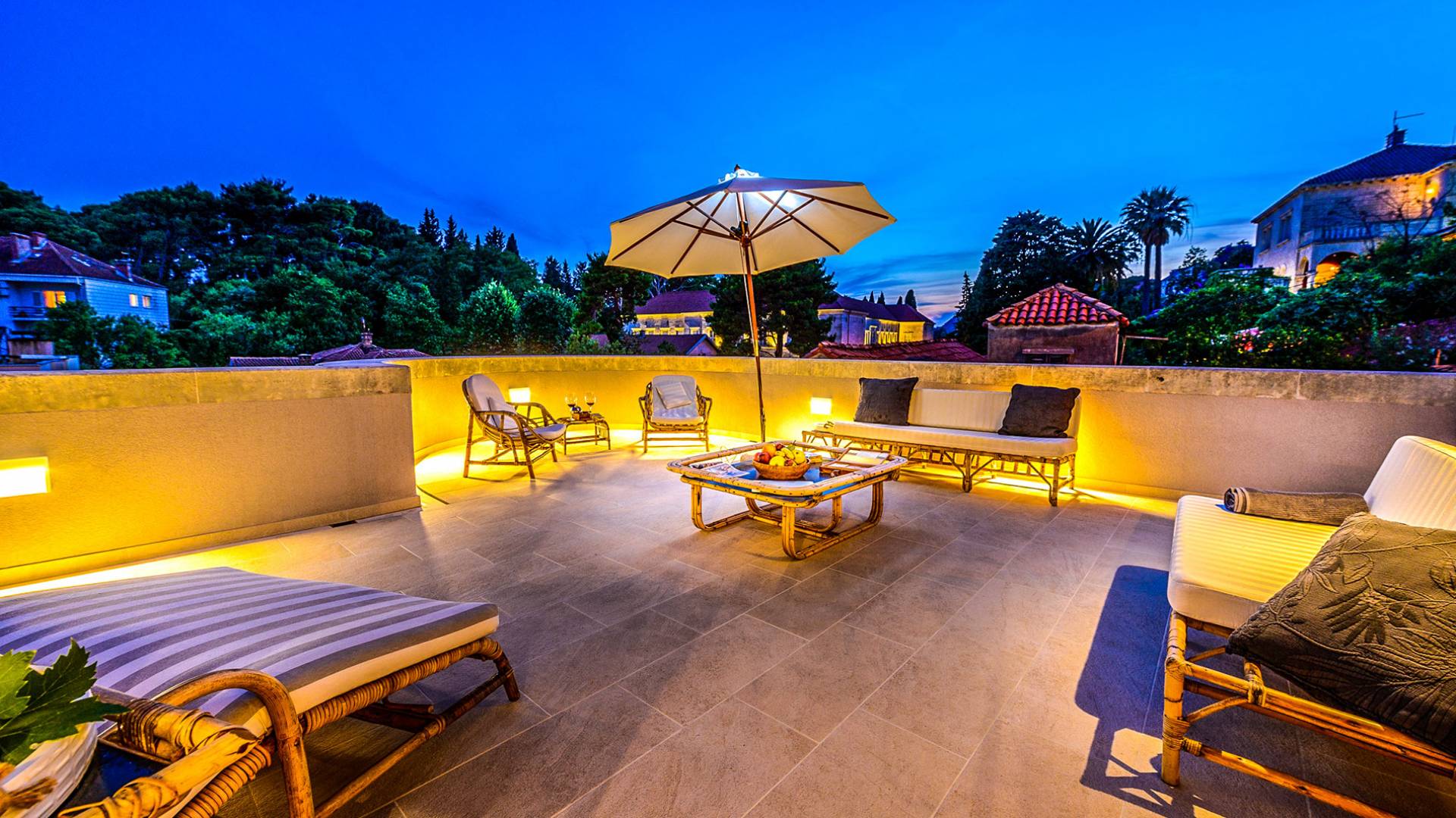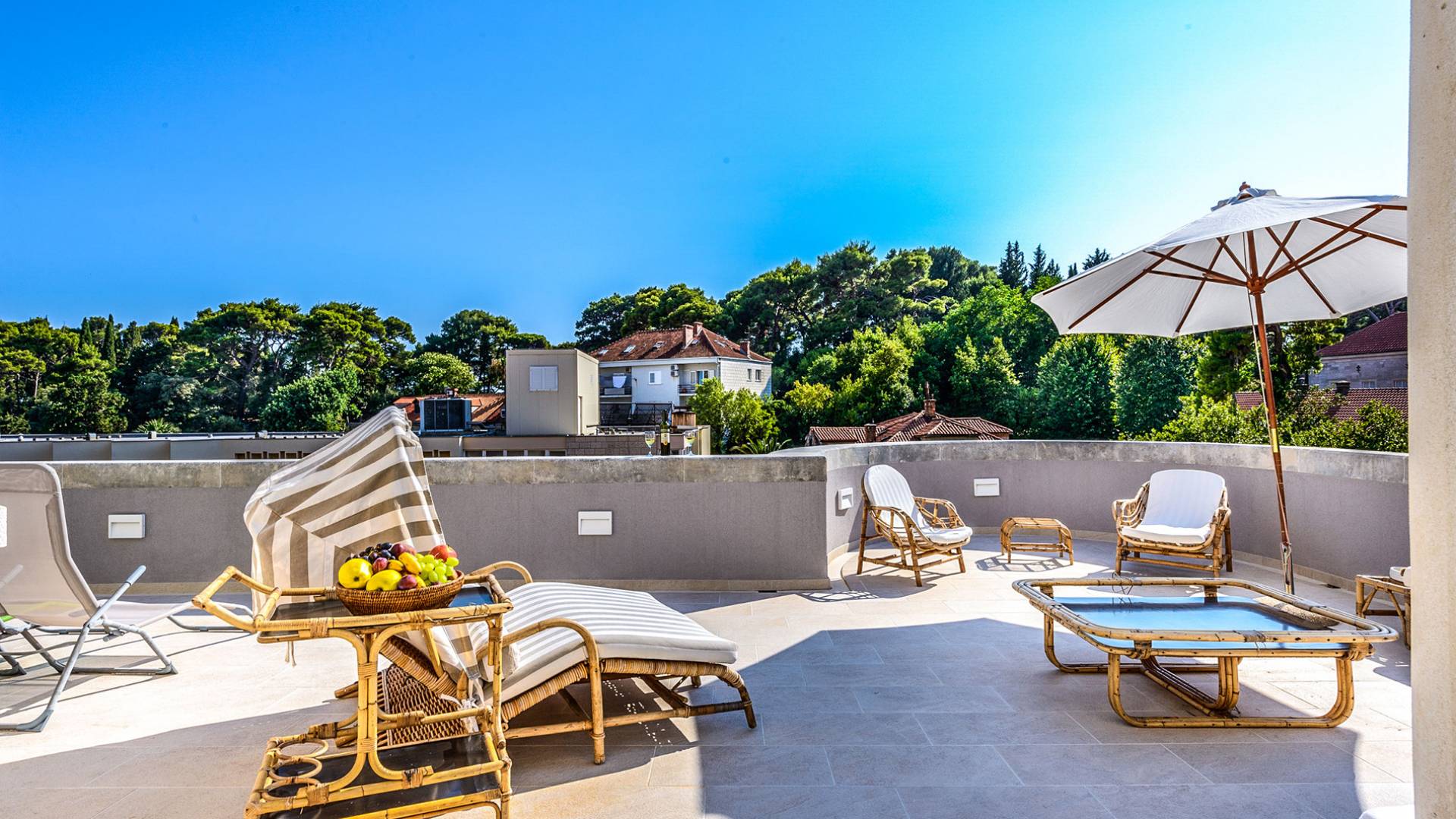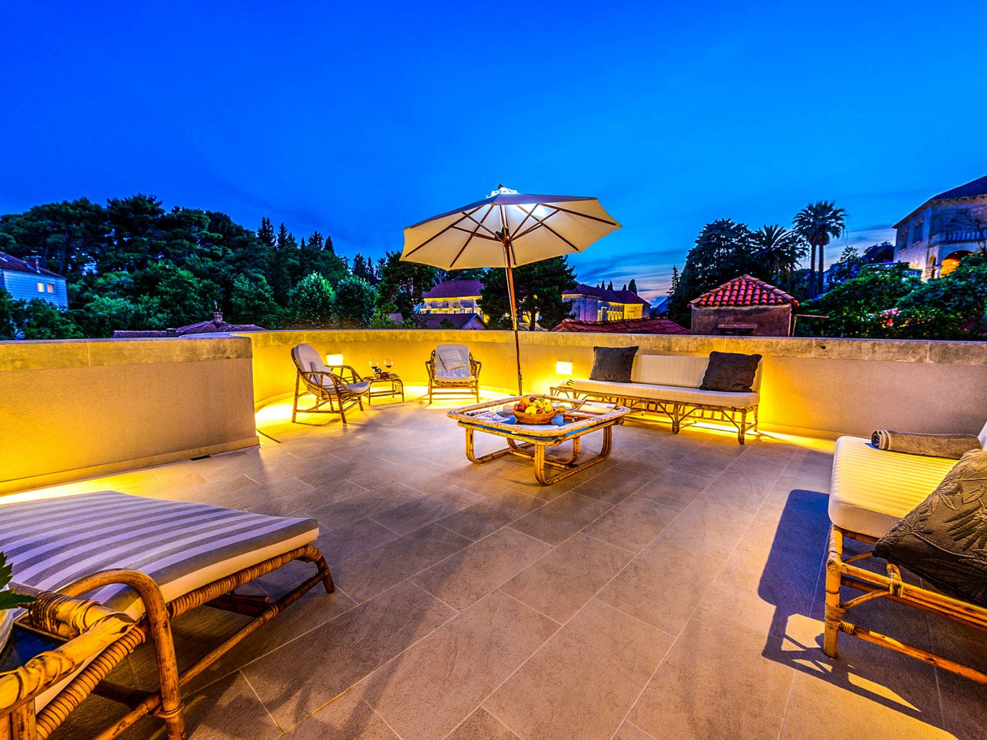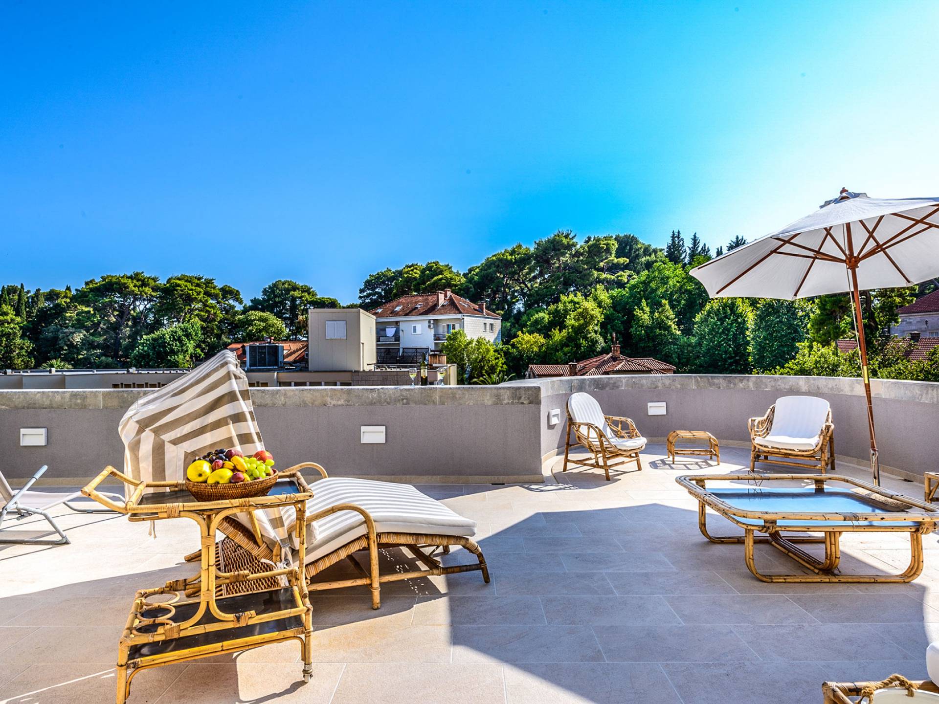 The views from the terrace brim with impressive samples of the 19th and 20th centuries architecture. The area surrounding the Villa was historically known as Dubrovnik's gardens, as the land around here had been cultivated as early as the 13th century. Following the expansion of residences outside the City Walls, imposing town villas were constructed here around the same time as the Villa Mediteran, hence the neighborhood glows with representative architecture. Across the street, the recently renovated Dubrovnik University building was originally a hospital, built in 1887 during the Austro-Hungarian period.