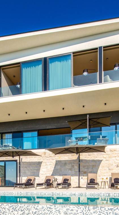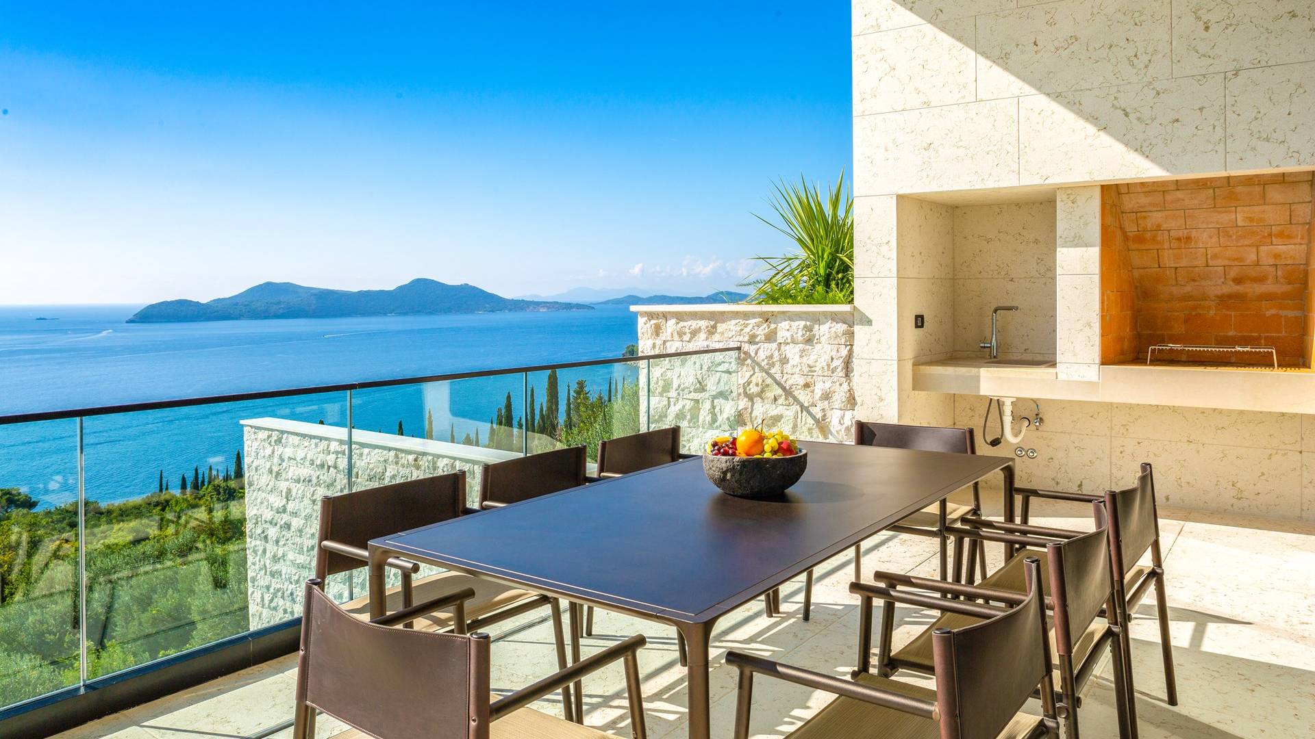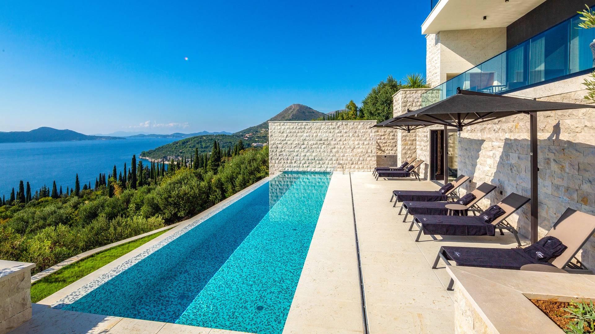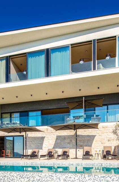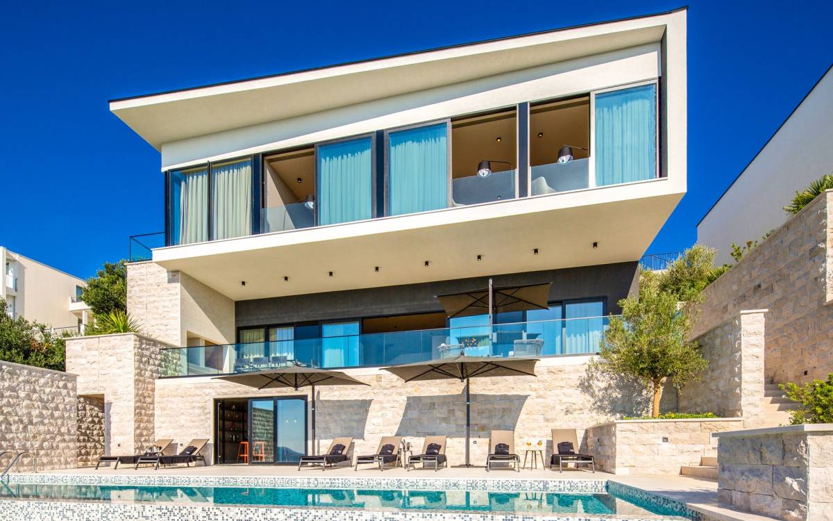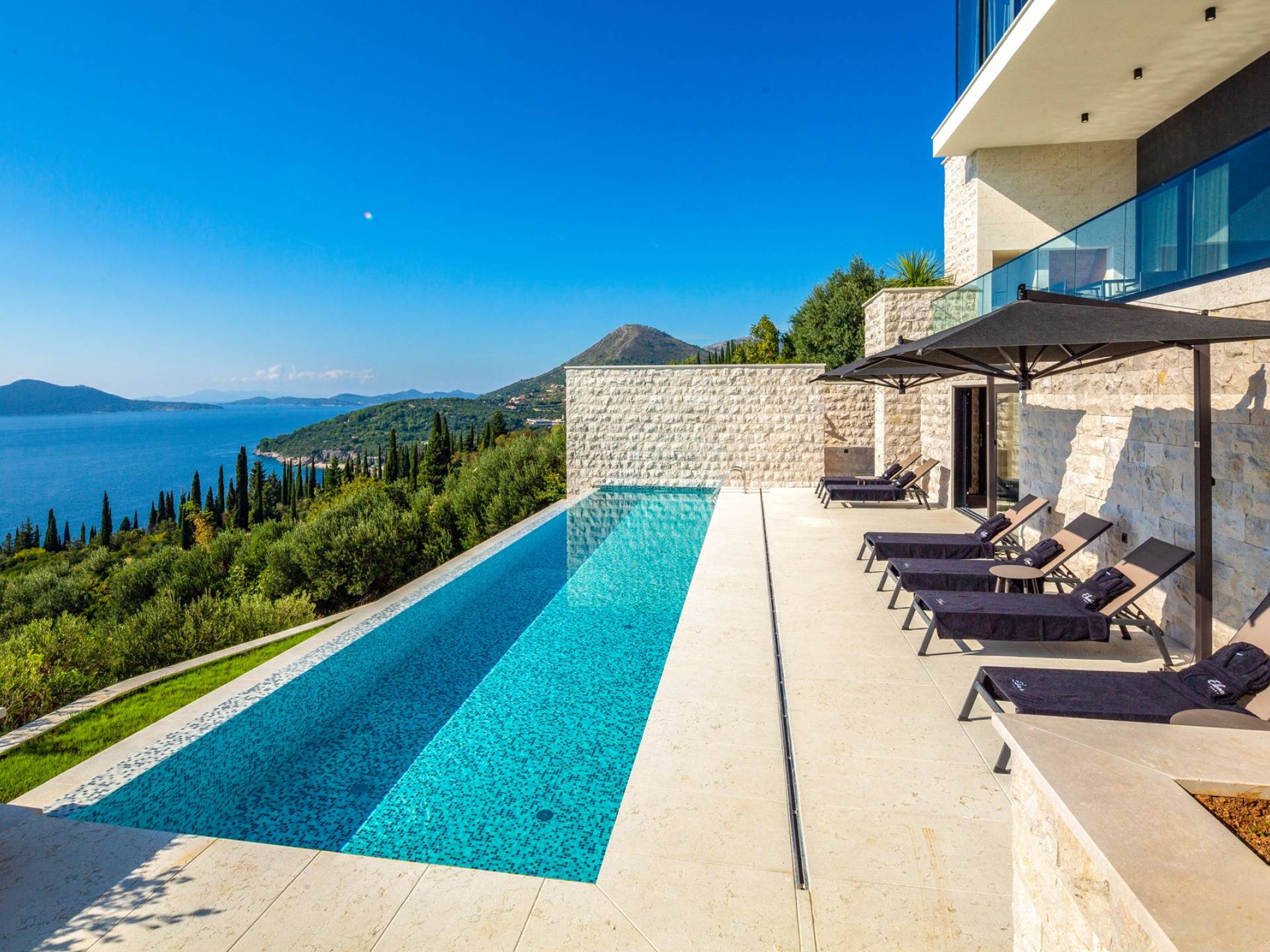 This newly built villa is a wonderful example of modern and innovative architecture; is spacious and airy, and high ceilings and glass walls give the feeling of freedom and open the view of the Dubrovnik islands. Opposites, ie the islands and the Adriatic Sea on one side and the surrounding hills on the other make Orasac unique. Amidst a beautiful natural landscape, built on an elevated hillside, the villa provides a high degree of privacy and a fantastic view over the sea and the surrounding coastline. The villa with its high-quality furnishings has been integrated perfectly into the Mediterranean hillside landscape and built on multi-level terraces.