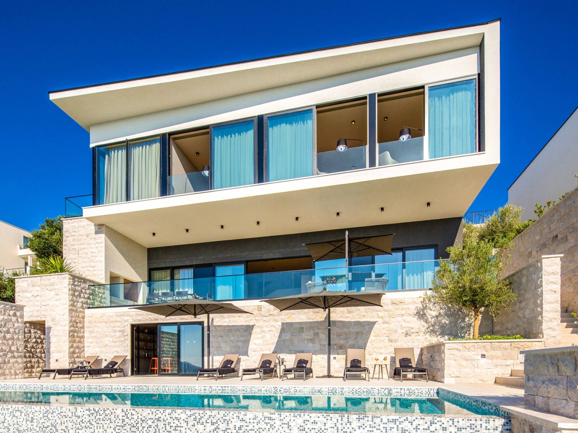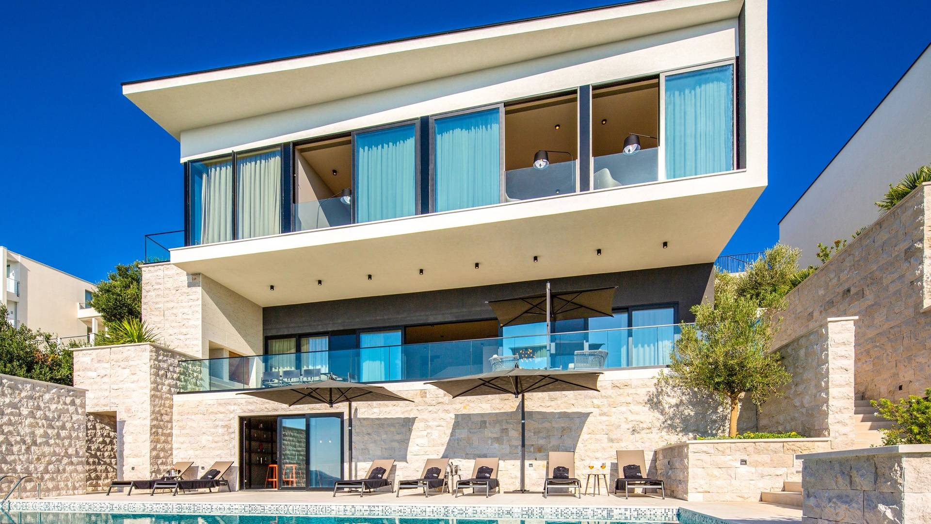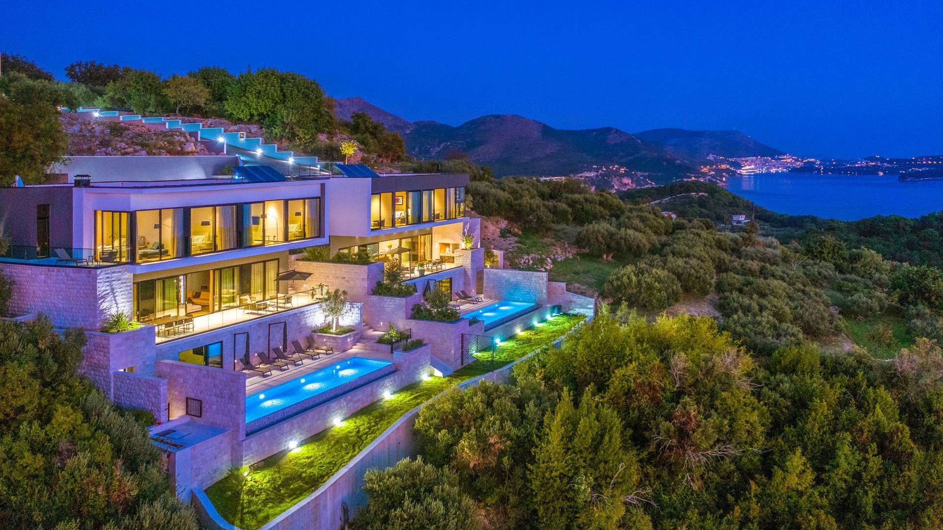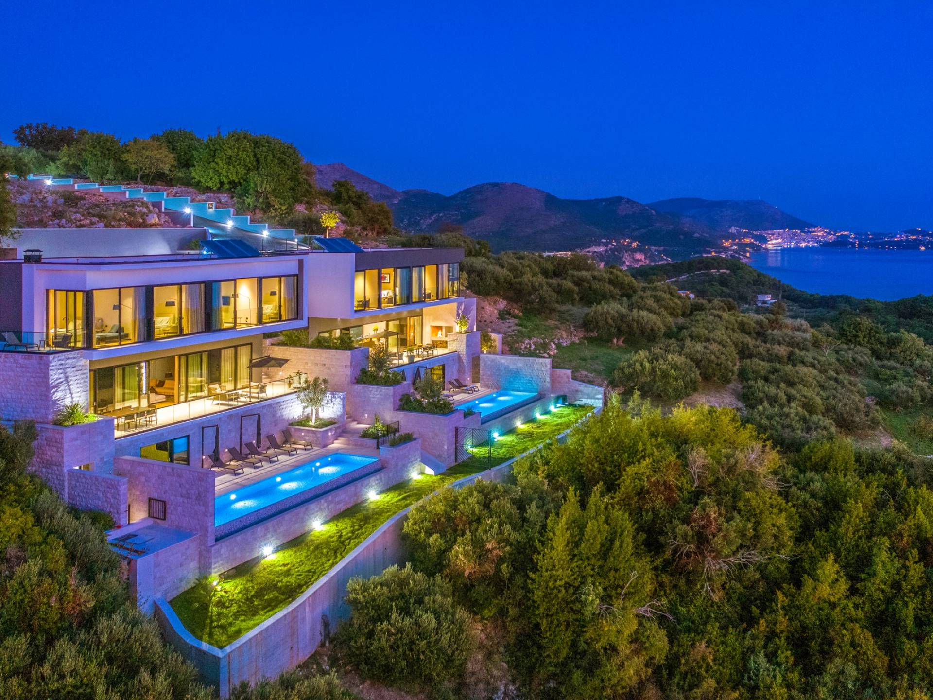 This newly built villa is a wonderful example of modern and innovative architecture; is spacious and airy, and high ceilings and glass walls give the feeling of freedom and open the view of the Dubrovnik islands. Opposites, ie the islands and the Adriatic Sea on one side and the surrounding hills on the other make Orasac unique. Amidst a beautiful natural landscape, built on an elevated hillside, the villa provides a high degree of privacy and a fantastic view over the sea and the surrounding coastline. The villa with its high-quality furnishings has been integrated perfectly into the Mediterranean hillside landscape and built on multi-level terraces.