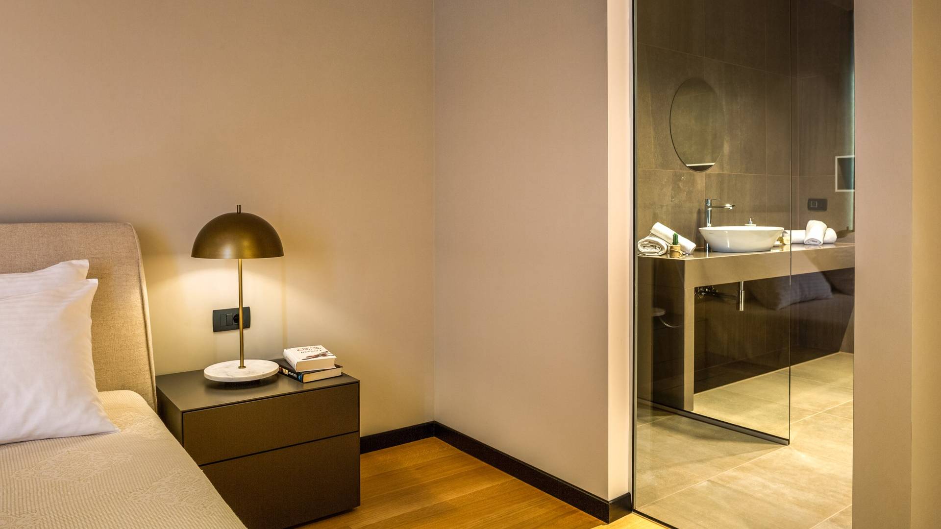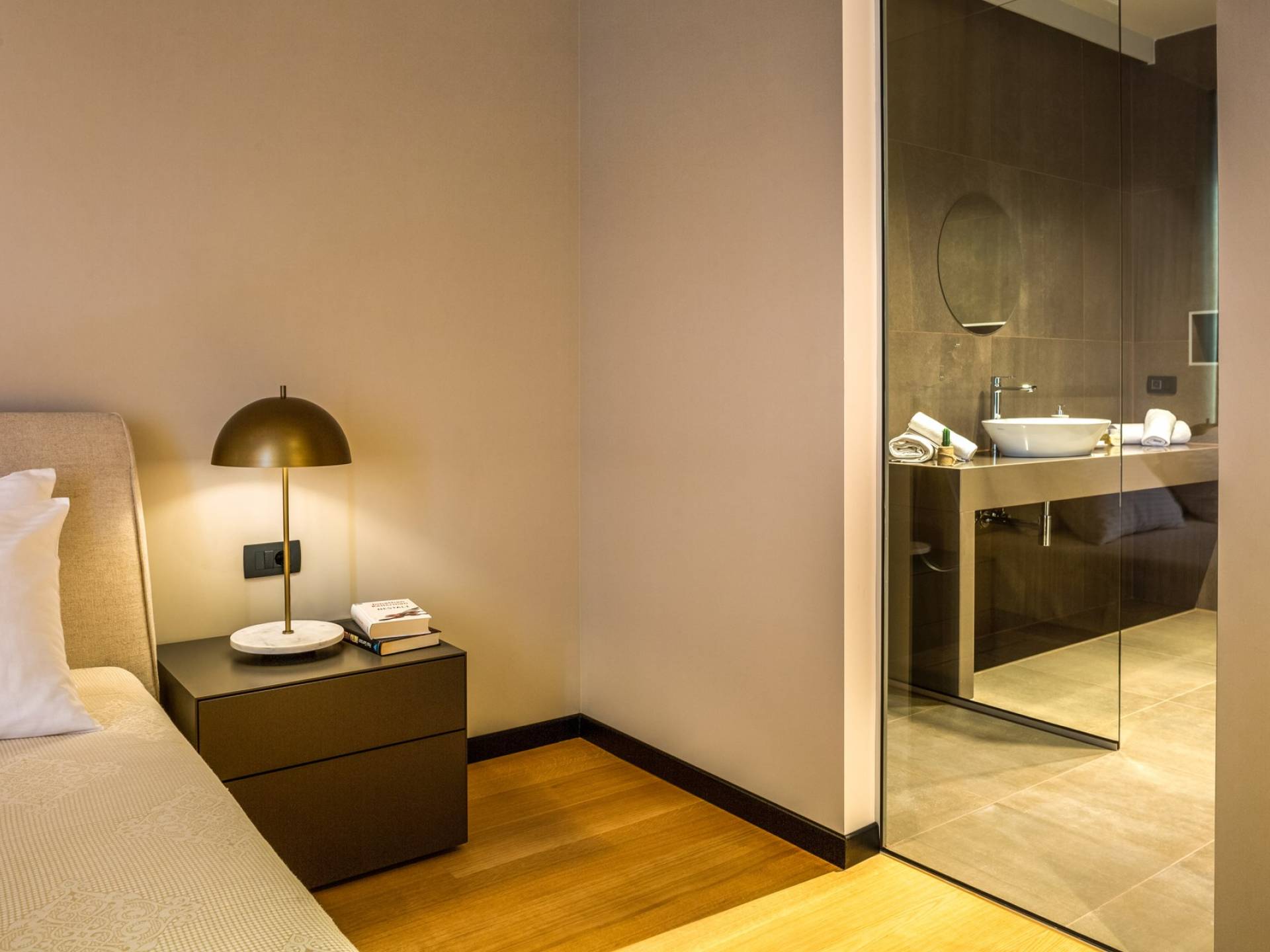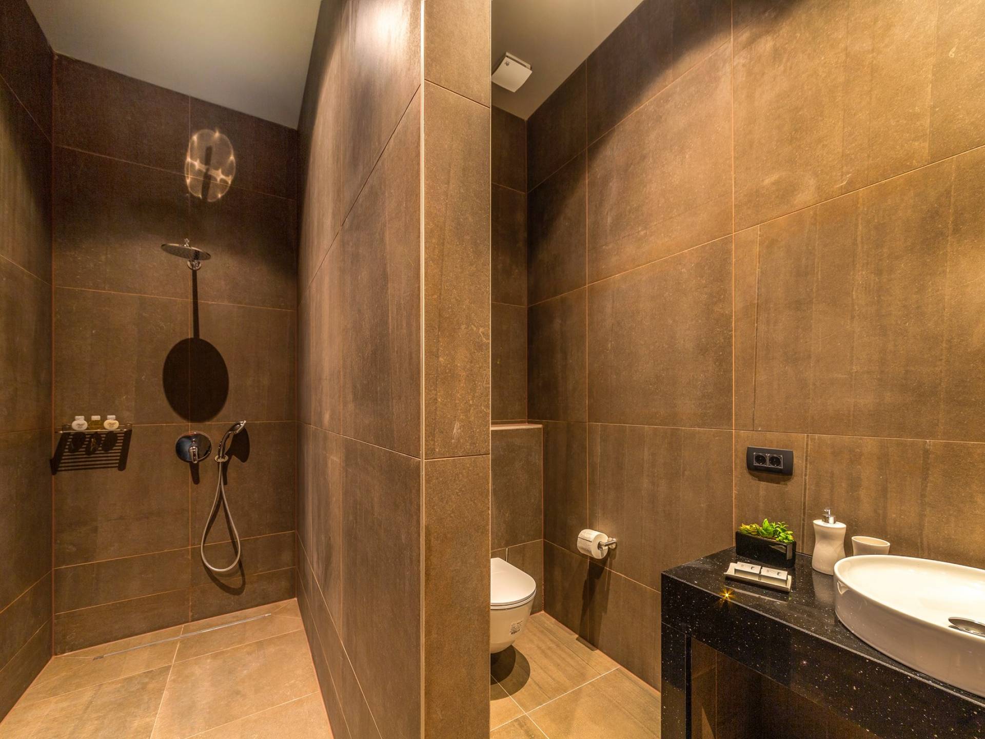 The indoor stairs lead to the ground level, where you will find a central living area with a large comfortable sofa, a dining area, a modern and fully equipped kitchen, with all appliances. On this level, there is also a bathroom for guests and one twin bedroom with an en suite bathroom and exit to the shared terrace.