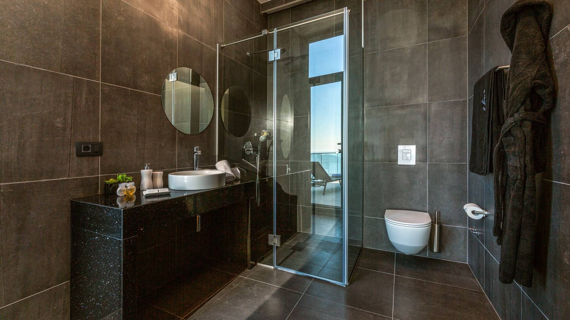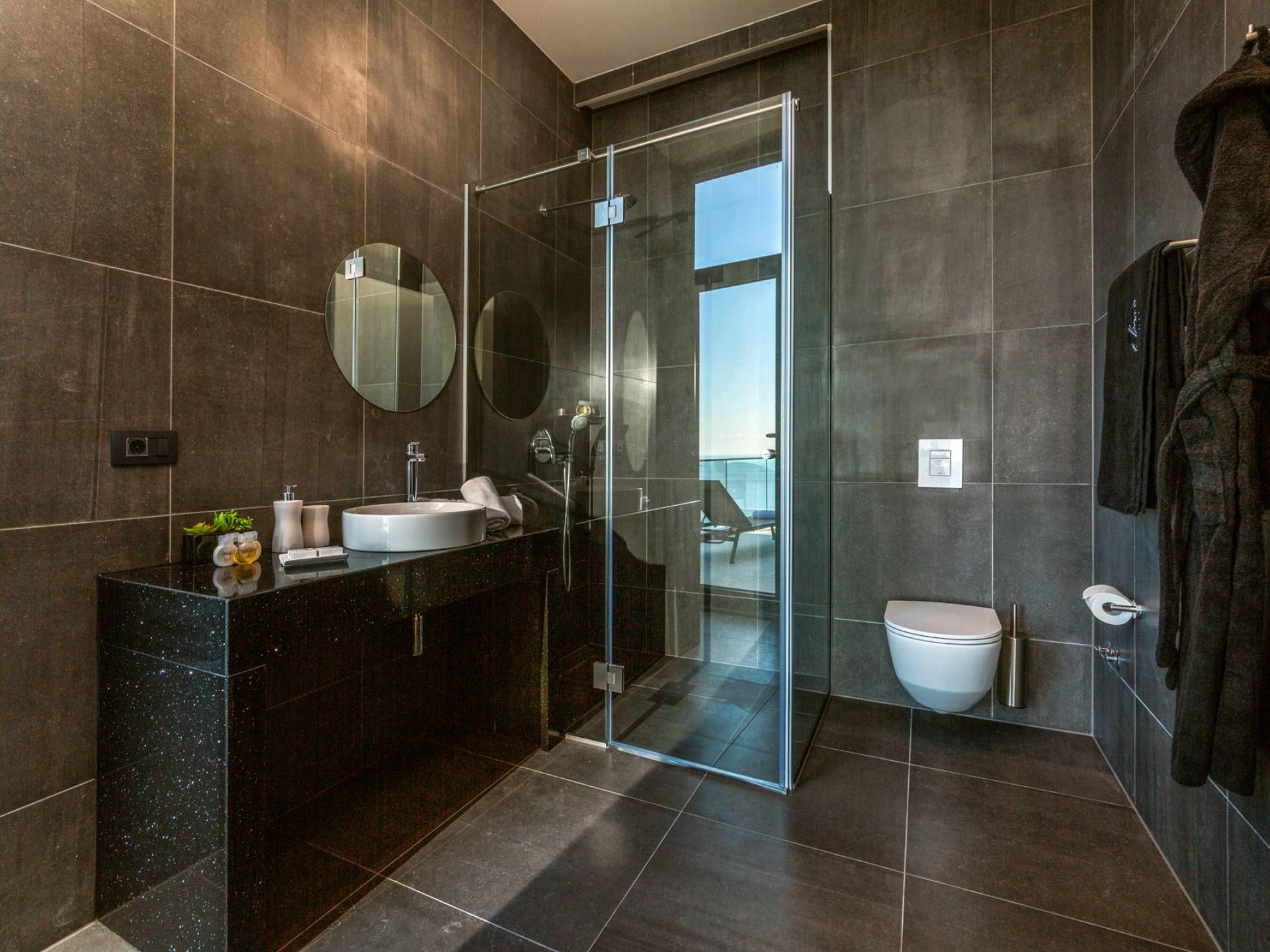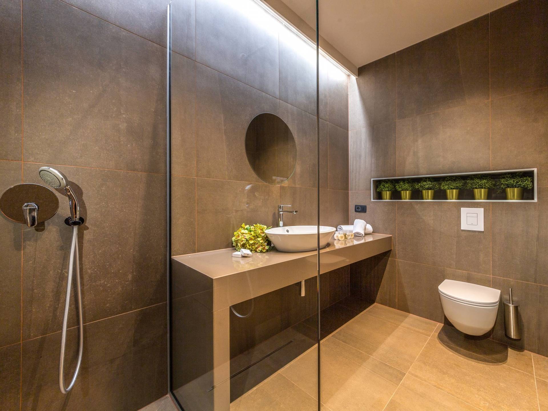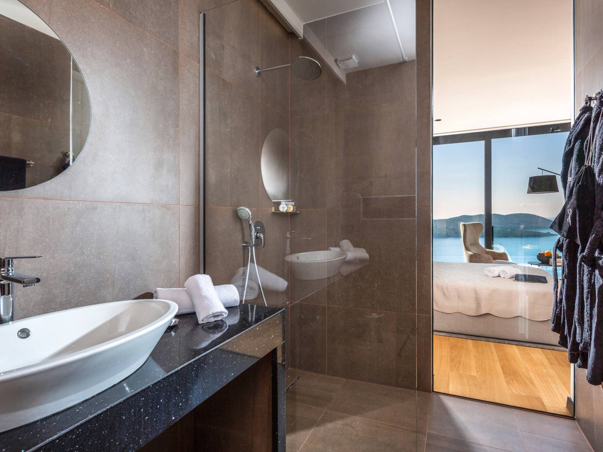 As you enter through the main doors on the first floor you will reach four double bedrooms. All the air-conditioned bedrooms have nice linens with opulent bathrooms and plenty of fluffy towels to pamper oneself with after a day in the sea or around the pool. The rooms offer a stunning view directly of the sea or the surrounding green landscape, while one also has a private balcony.