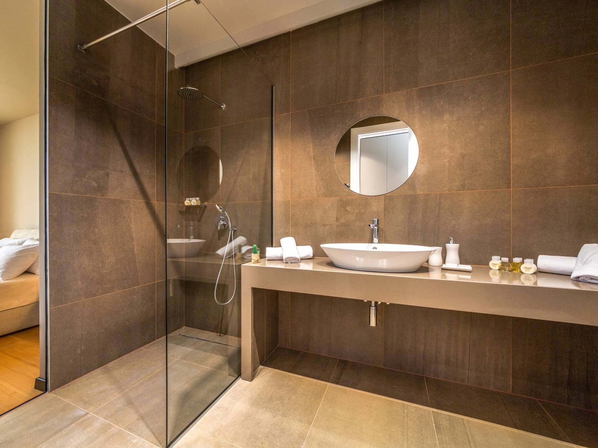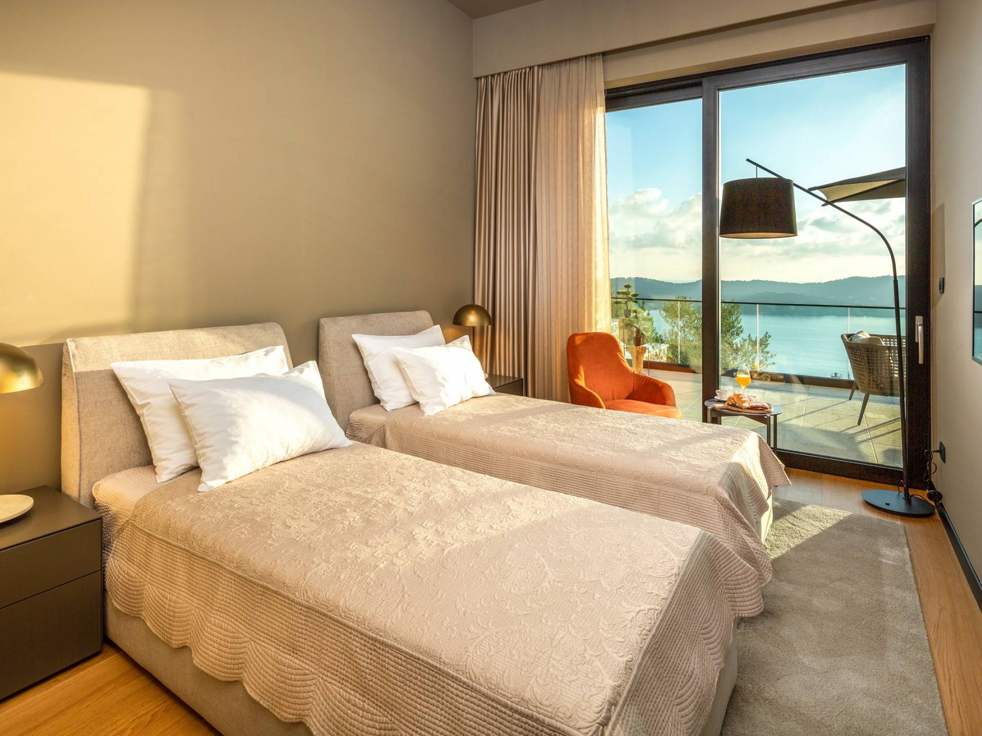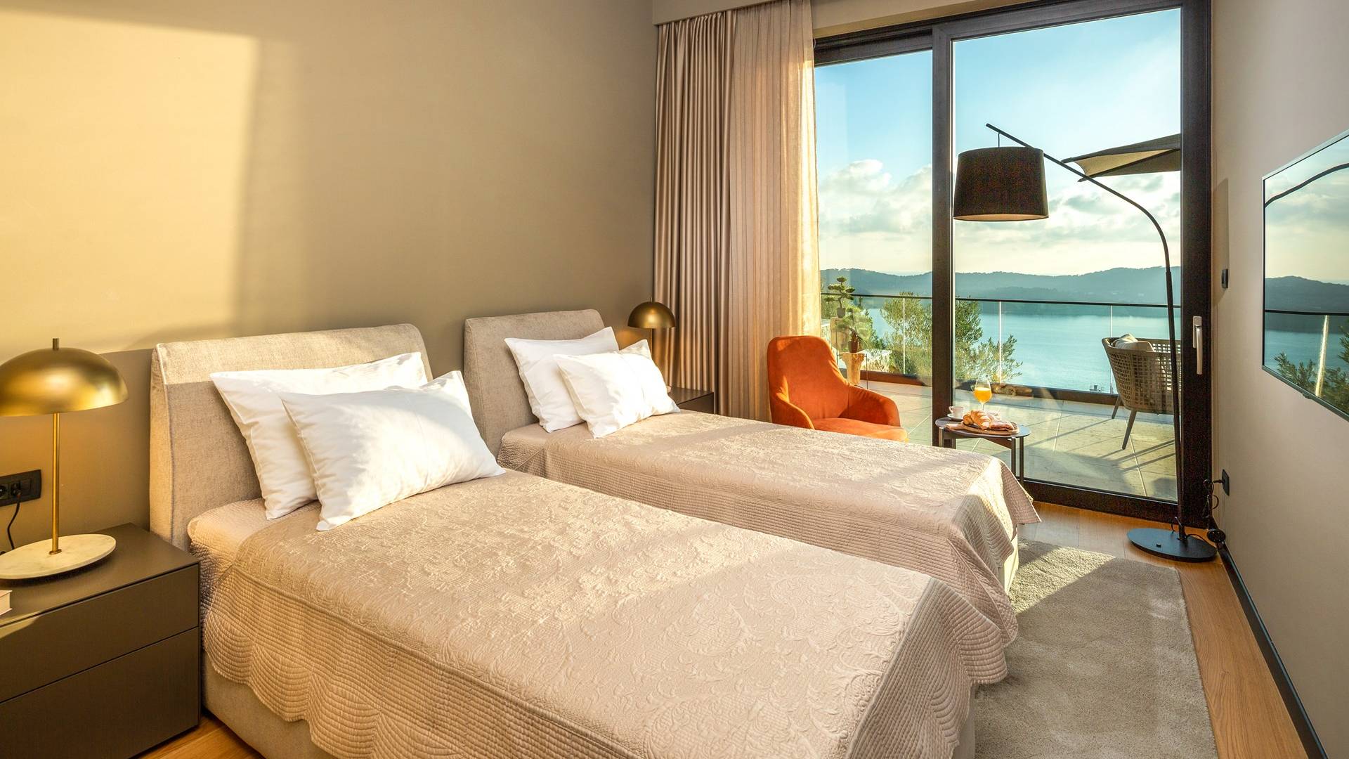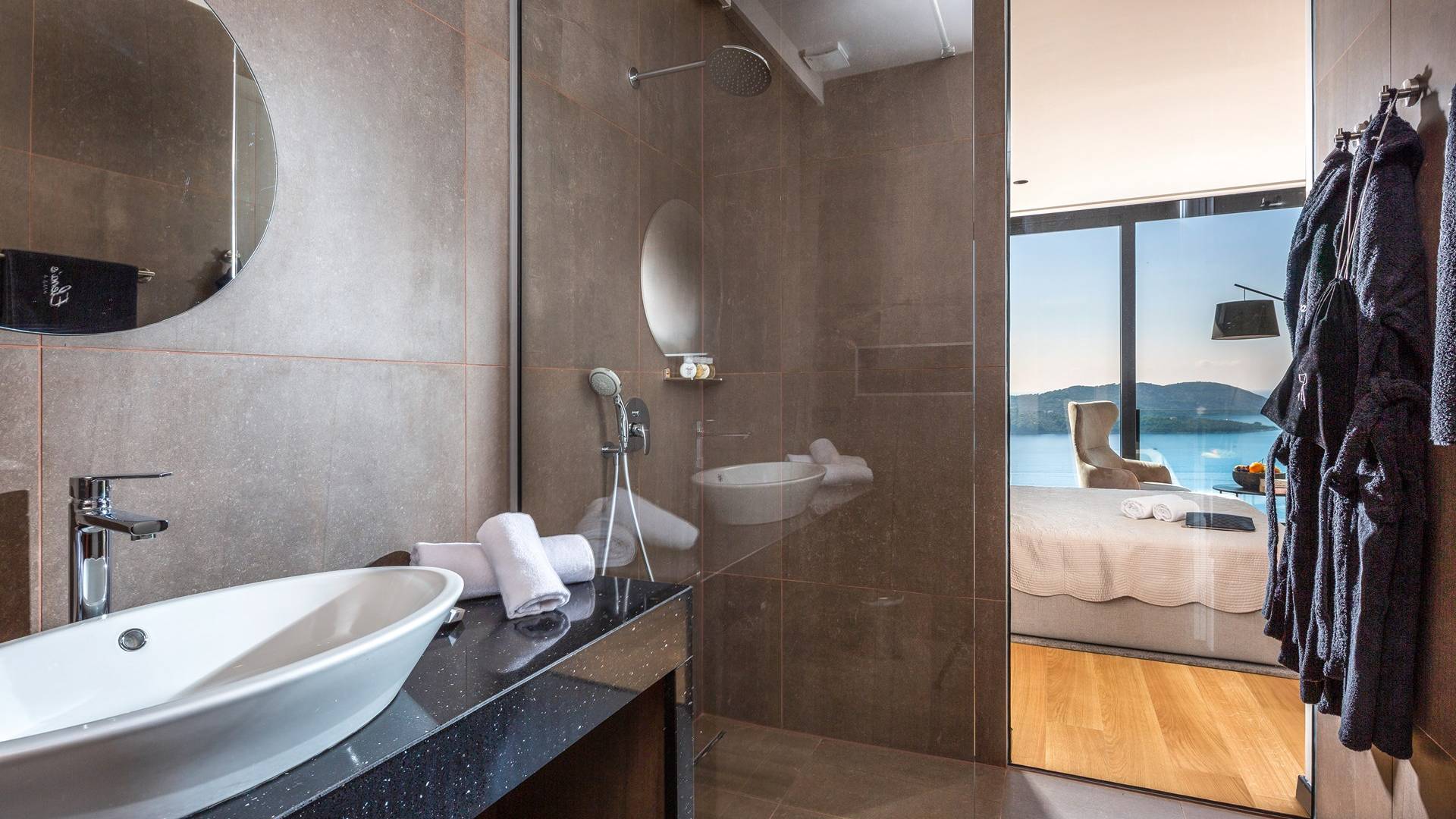 As you enter through the main doors on the first floor you will reach four double bedrooms. All the air-conditioned bedrooms have nice linens with opulent bathrooms and plenty of fluffy towels to pamper oneself with after a day in the sea or around the pool. The rooms offer a stunning view directly of the sea or the surrounding green landscape, while one also has a private balcony.