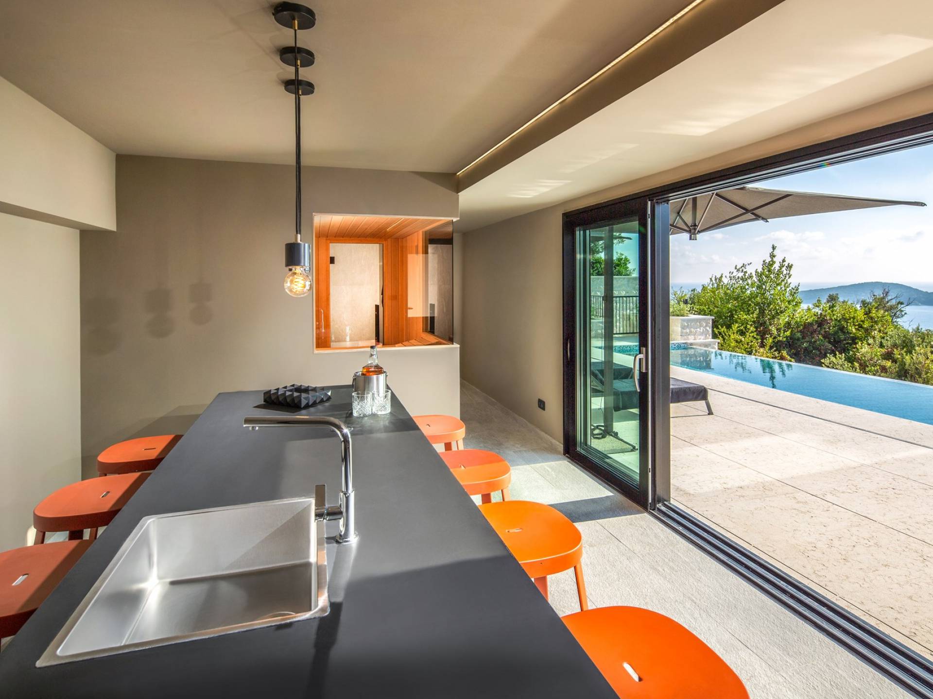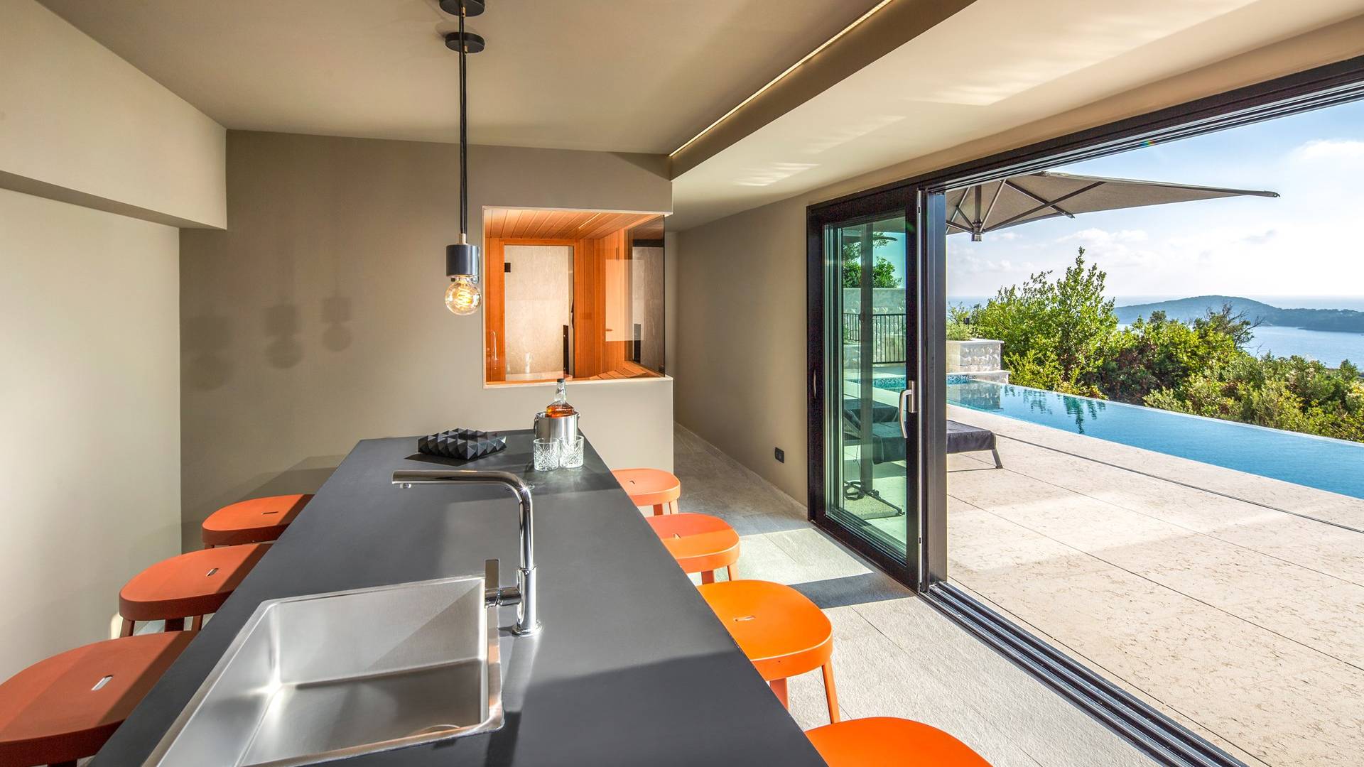 The living area leads to the spacious terrace with lounge and dining area, which makes dining alfresco unavoidable Two outside staircases lead to the most interesting part of this beautiful villa is a stunning heated infinity swimming pool. You’ll feel all your worries disappear as you float in the warm water, looking out at a panoramic view of the surroundings. Around the pool, there is a sundeck terrace with sunbeds and sunshades, a chill-out area with outdoor sofas which make the perfect spot for an early morning coffee or a few drinks in the last of the evening sun. Here you will also find a place to relax with the sauna.