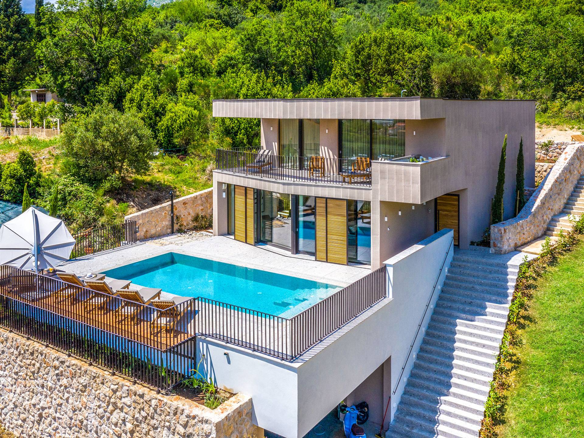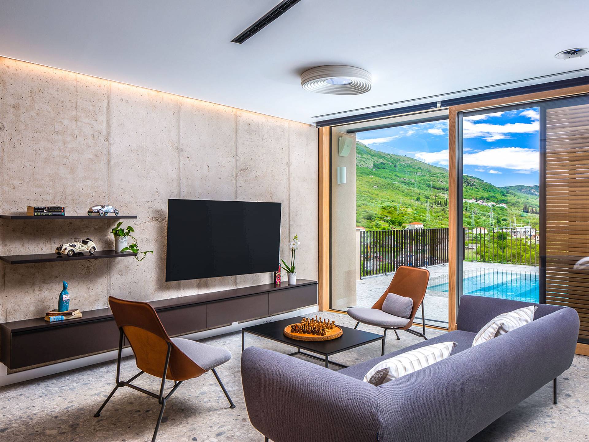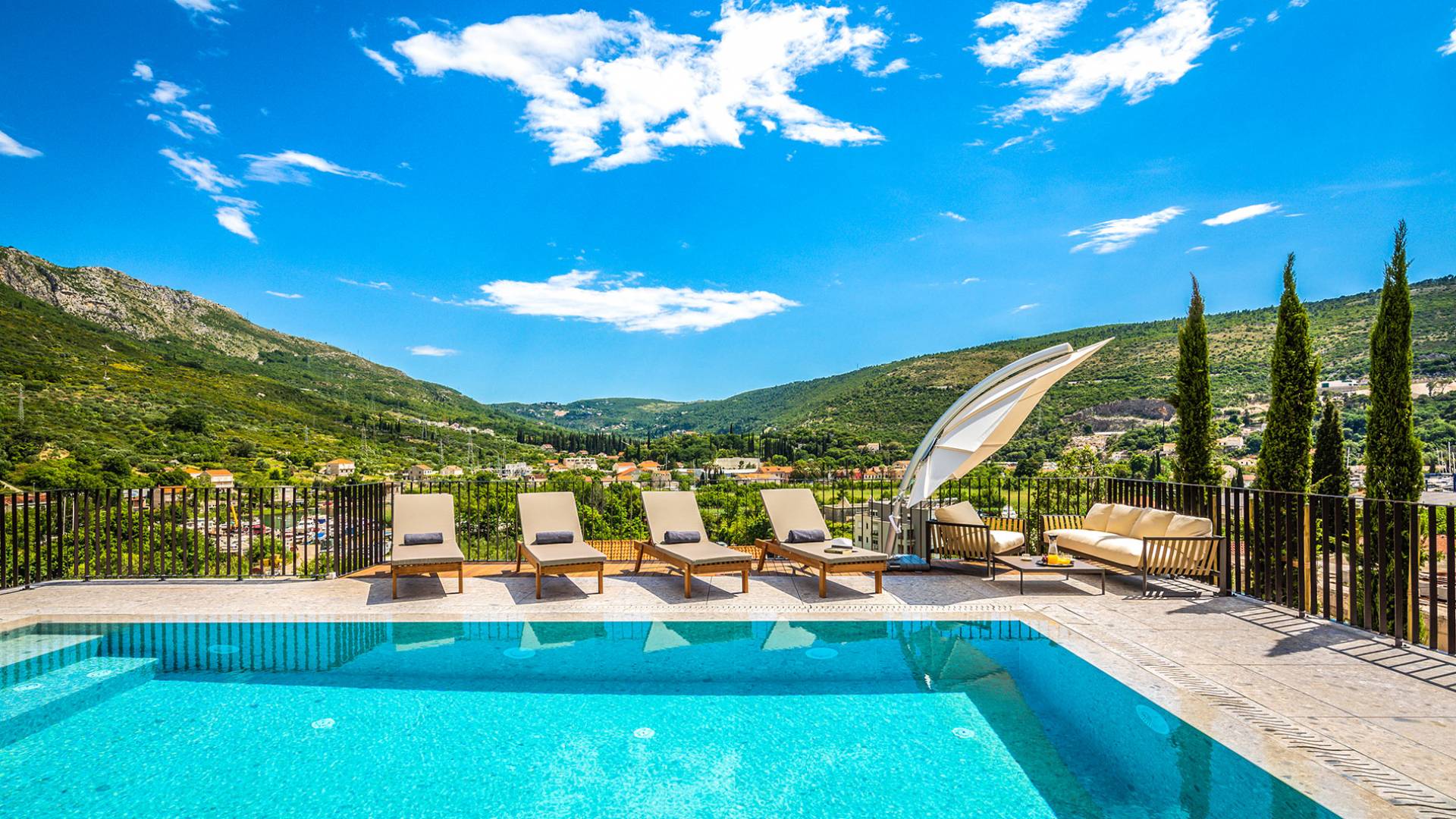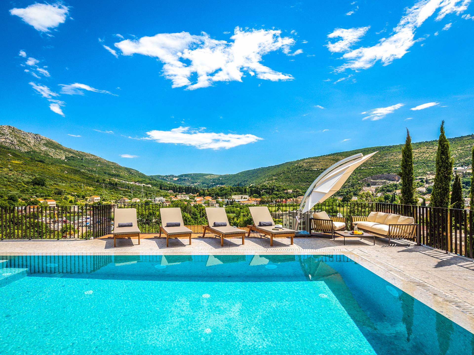 Villa Palazzo Vimbula Dubrovnik is one of the most delightful high-end luxury residences in the Dubrovnik area. Settled in a placid location in Rijeka Dubrovačka, only 22 kilometers from the airport and 6 kilometers from the Old Town, this brand new five-star luxurious villa in Dubrovnik with a pool provides the perfect holiday rental experience. Modernly equipped and elegantly furnished, the entire property offers nice views, supreme comfort, and complete privacy.