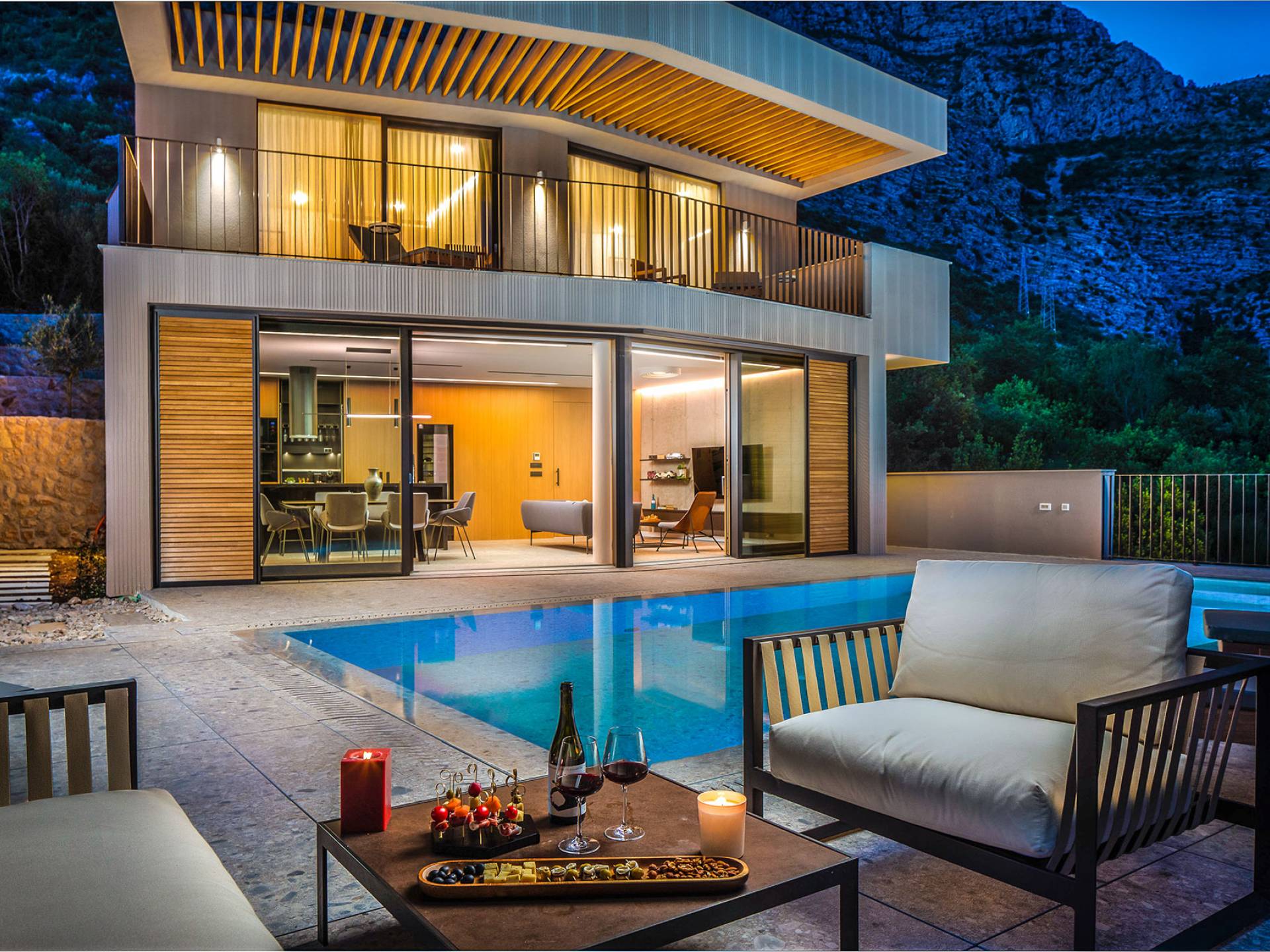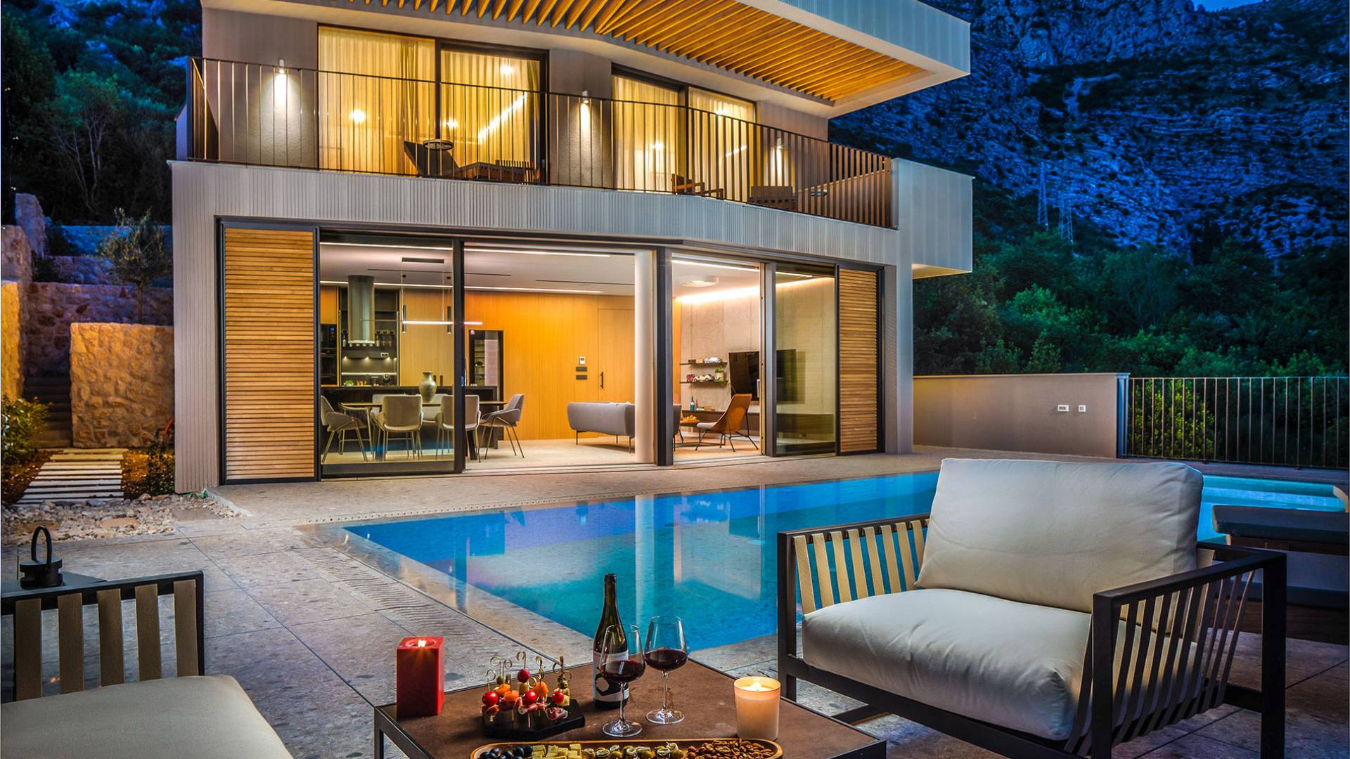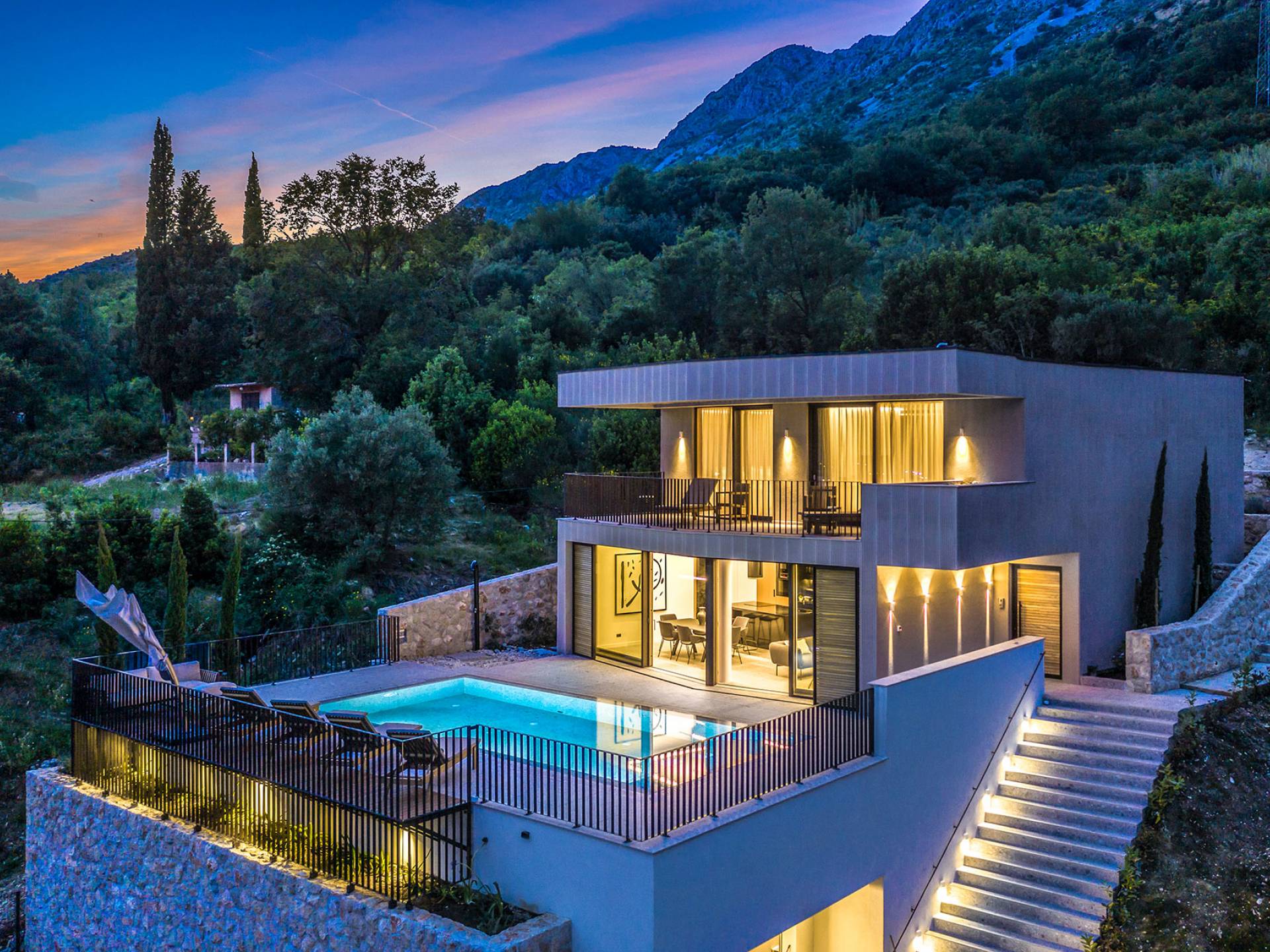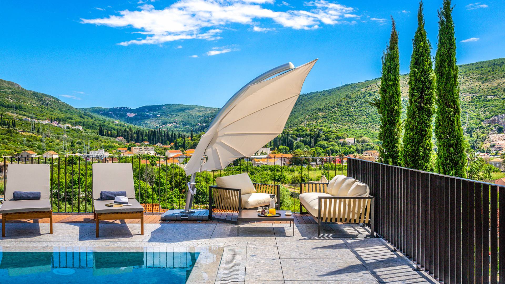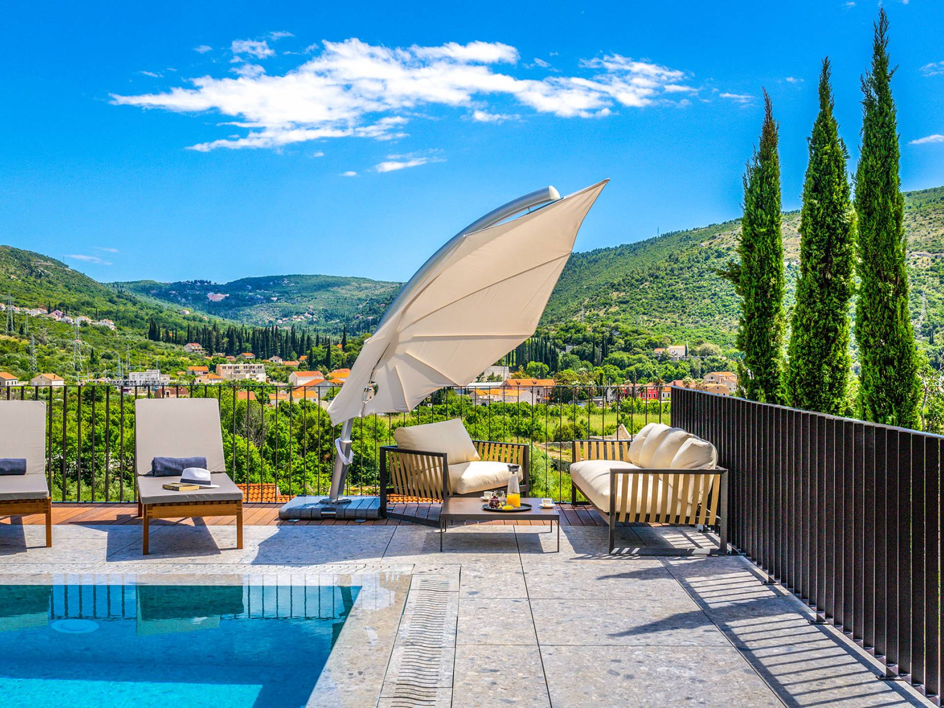 Villa Palazzo Vimbula Dubrovnik is one of the most delightful high-end luxury residences in the Dubrovnik area. Settled in a placid location in Rijeka Dubrovačka, only 22 kilometers from the airport and 6 kilometers from the Old Town, this brand new five-star luxurious villa in Dubrovnik with a pool provides the perfect holiday rental experience. Modernly equipped and elegantly furnished, the entire property offers nice views, supreme comfort, and complete privacy.