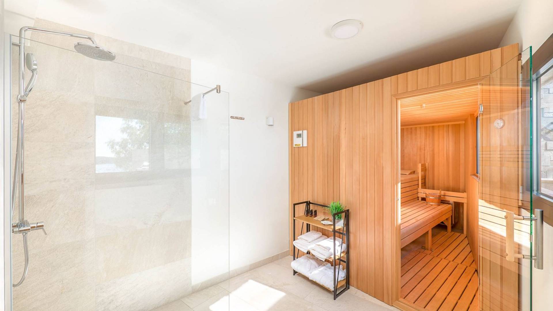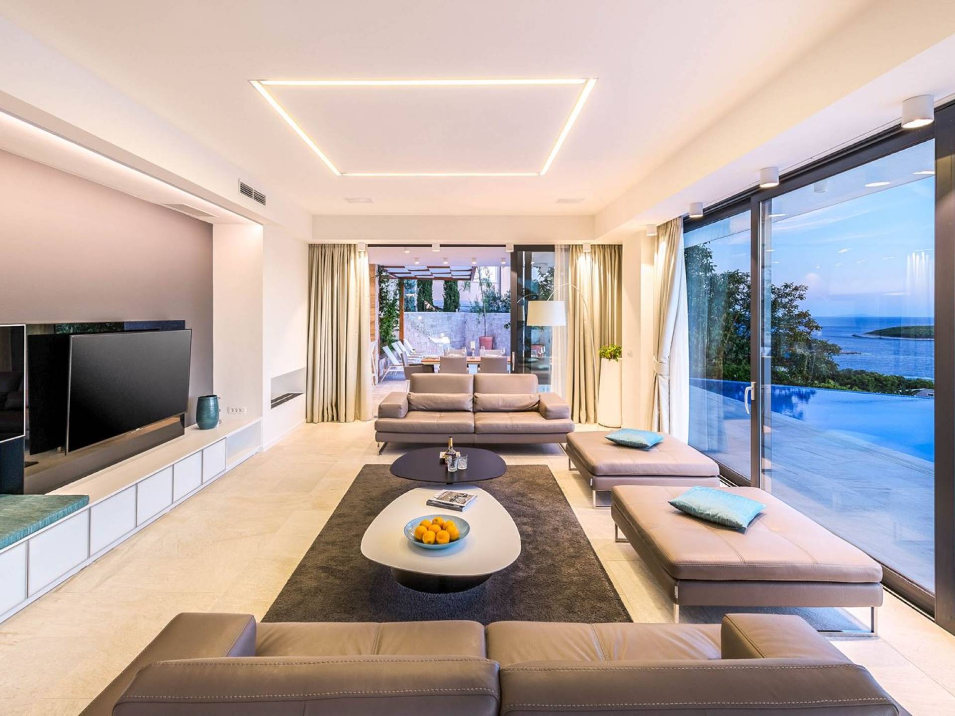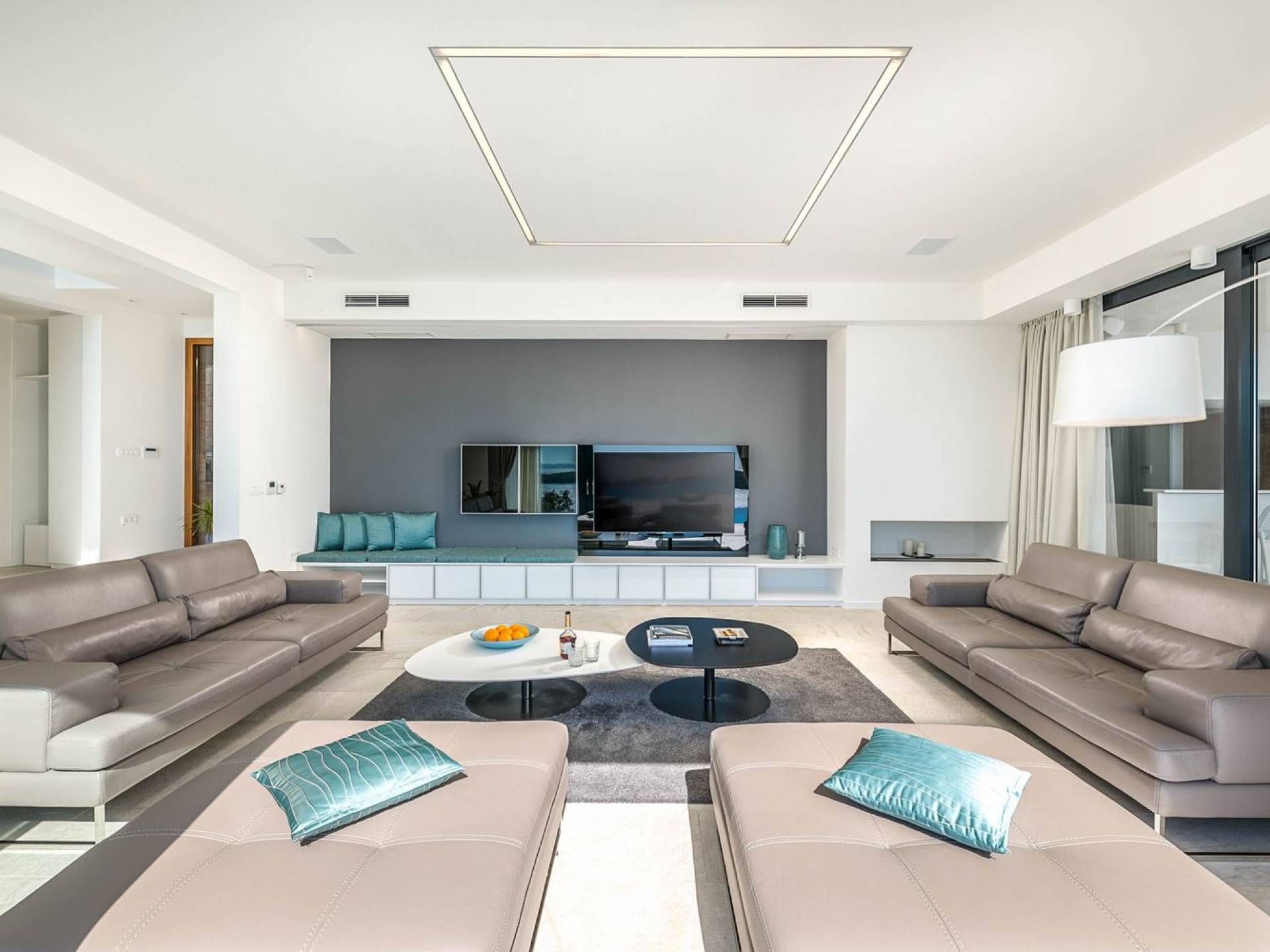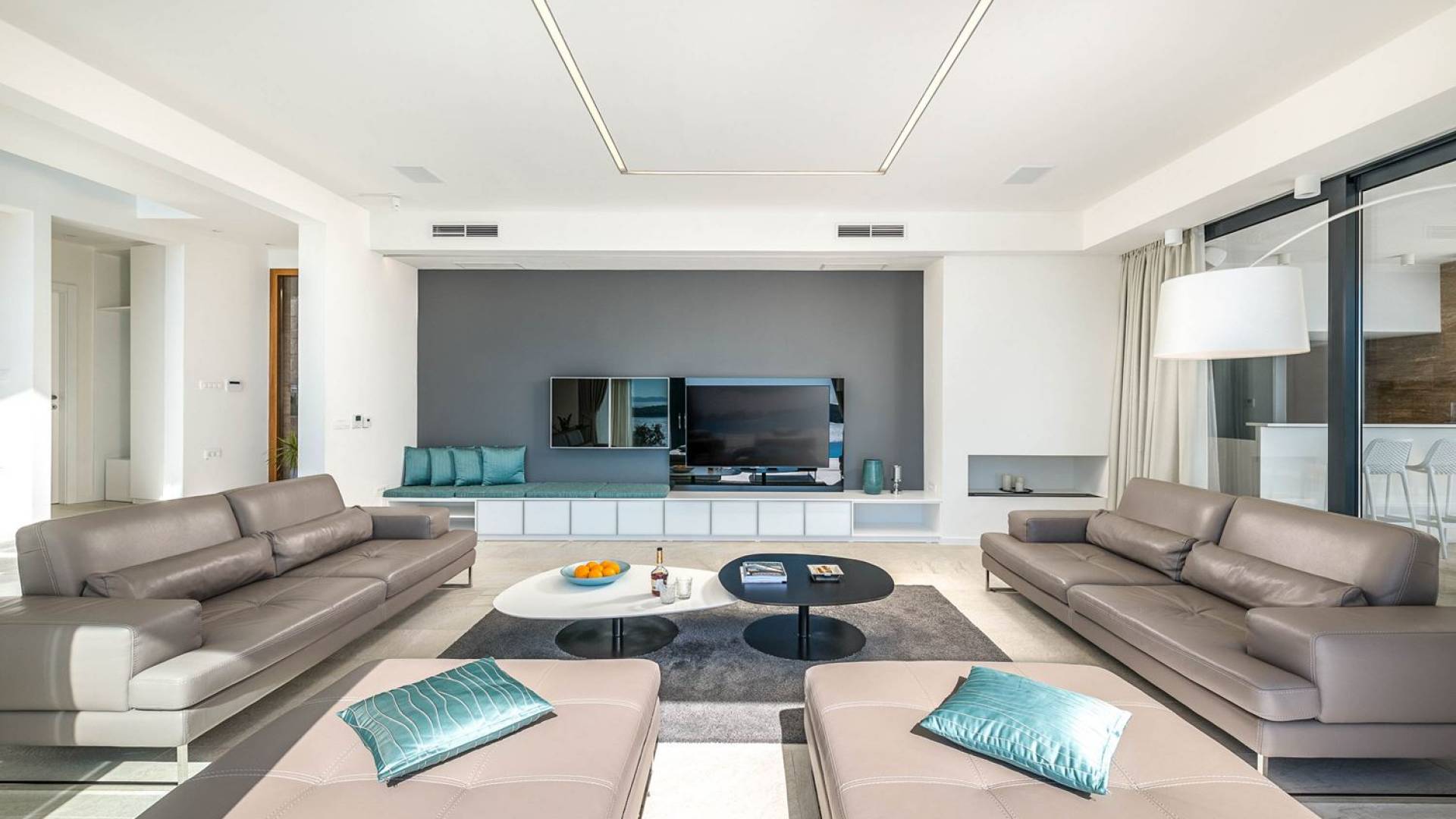 The interior of the villa is designed in white and gray tones with elements of natural and subtle dose of luxury, elegance, and comfort. The glass walls create a sense of natural beauty, opening onto a unique sea panorama, while the minimalist interior design creates a serene sense of calm for a dream vacation. Within this sensational villa, you will find a fully equipped kitchen, a living room and dining area, an area for recreation and relaxation with a sauna and gym, and 4 double bedrooms each with an en suite bathroom and three of them with a terrace. Each room is equipped with designer furniture and bedding, it is fully air-conditioned and with ultra-high definition smart TV’s and soft, feature lighting.