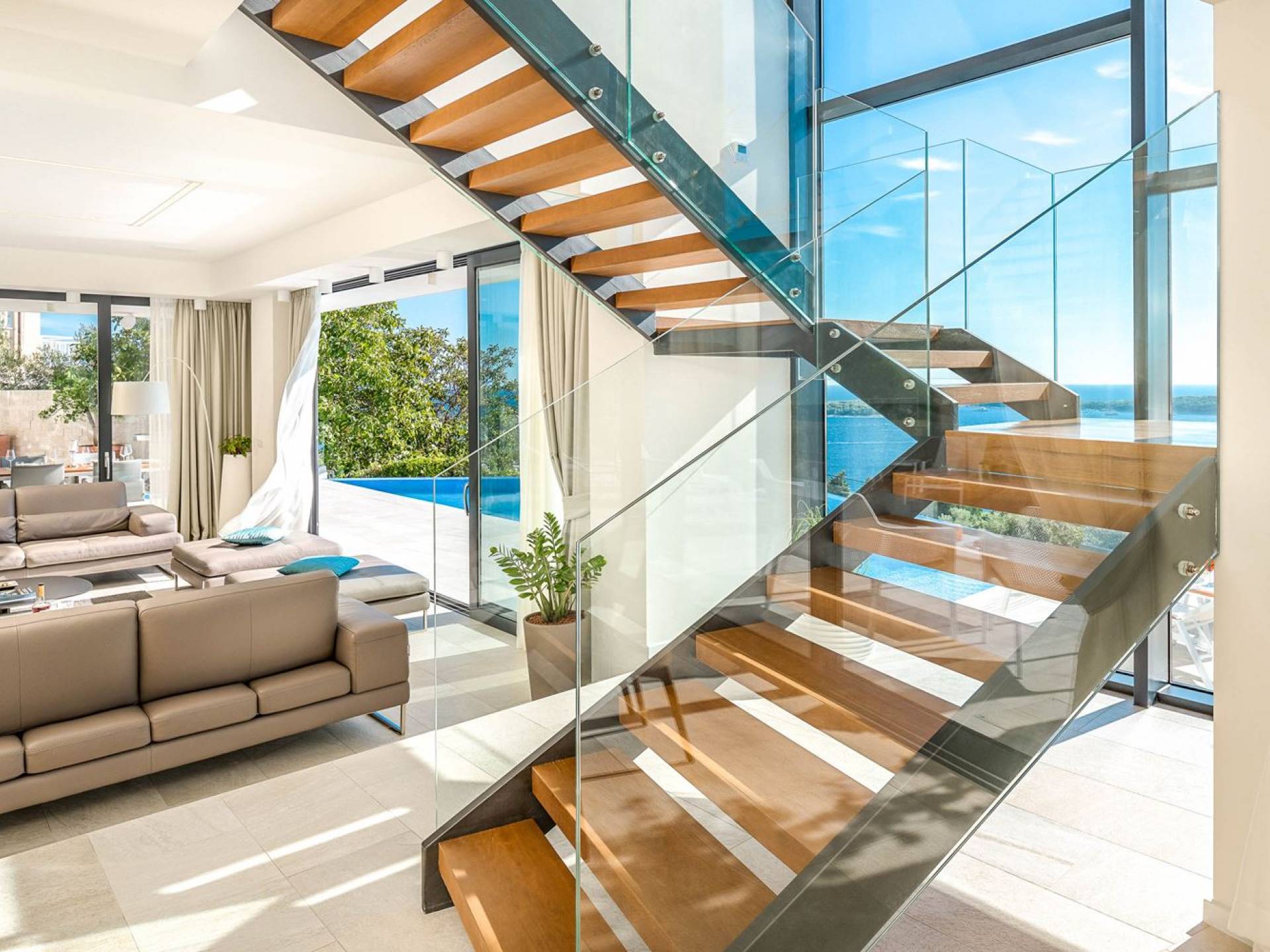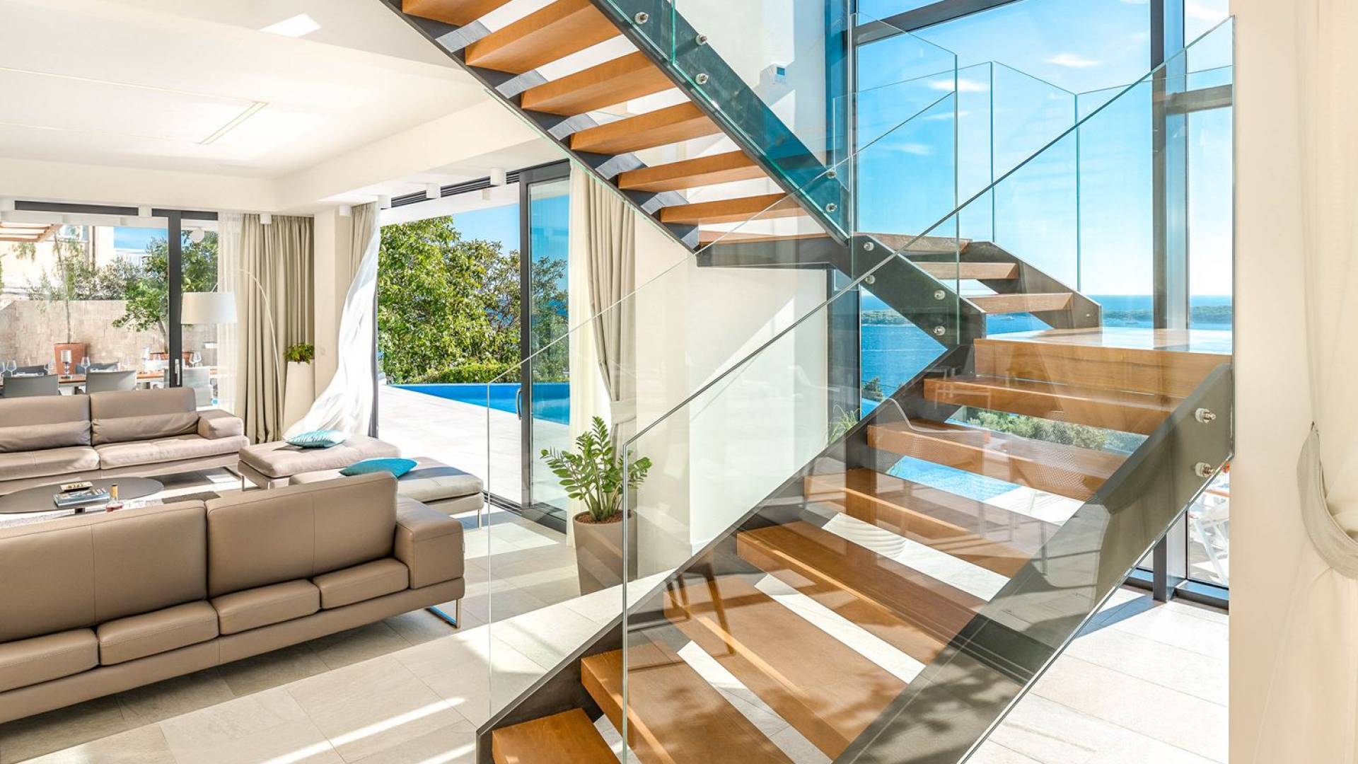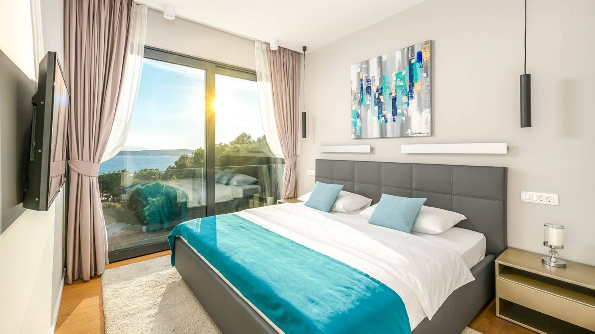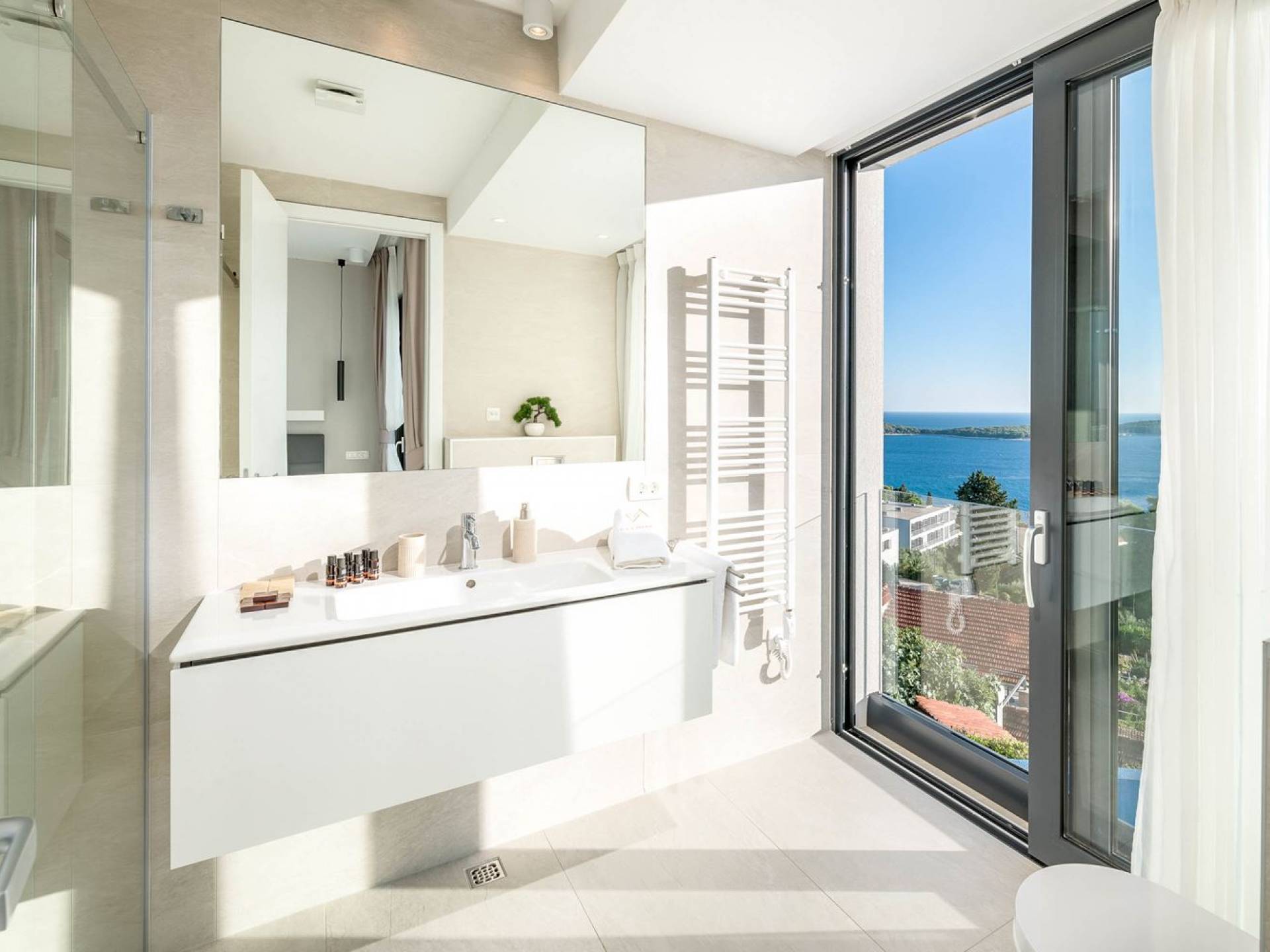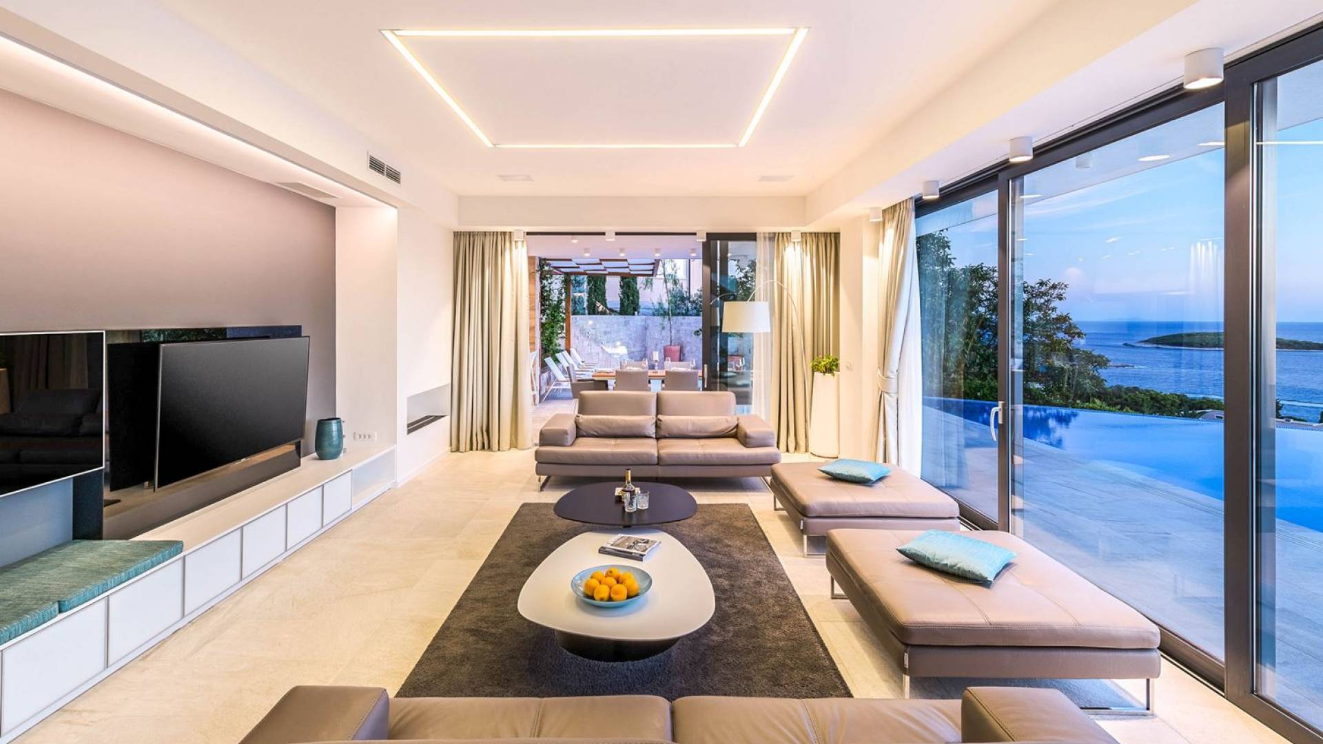 The interior of the villa is designed in white and gray tones with elements of natural and subtle dose of luxury, elegance, and comfort. The glass walls create a sense of natural beauty, opening onto a unique sea panorama, while the minimalist interior design creates a serene sense of calm for a dream vacation. Within this sensational villa, you will find a fully equipped kitchen, a living room and dining area, an area for recreation and relaxation with a sauna and gym, and 4 double bedrooms each with an en suite bathroom and three of them with a terrace. Each room is equipped with designer furniture and bedding, it is fully air-conditioned and with ultra-high definition smart TV’s and soft, feature lighting.