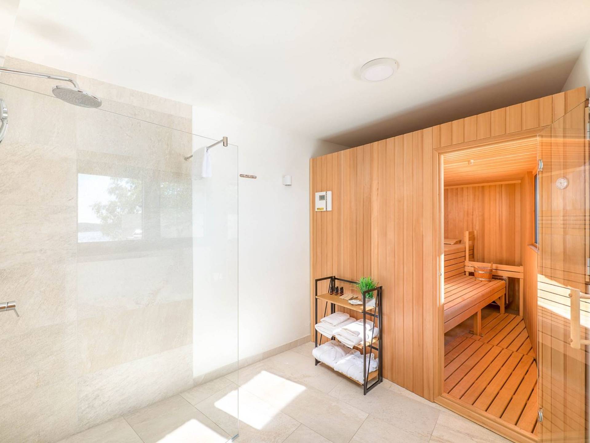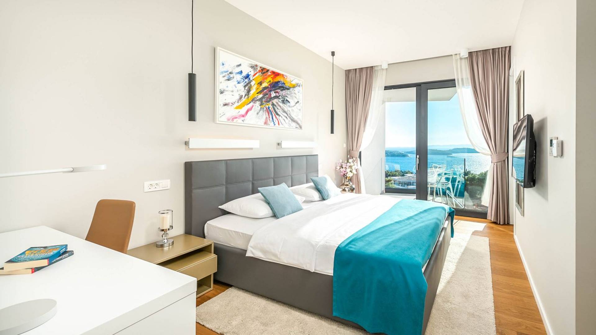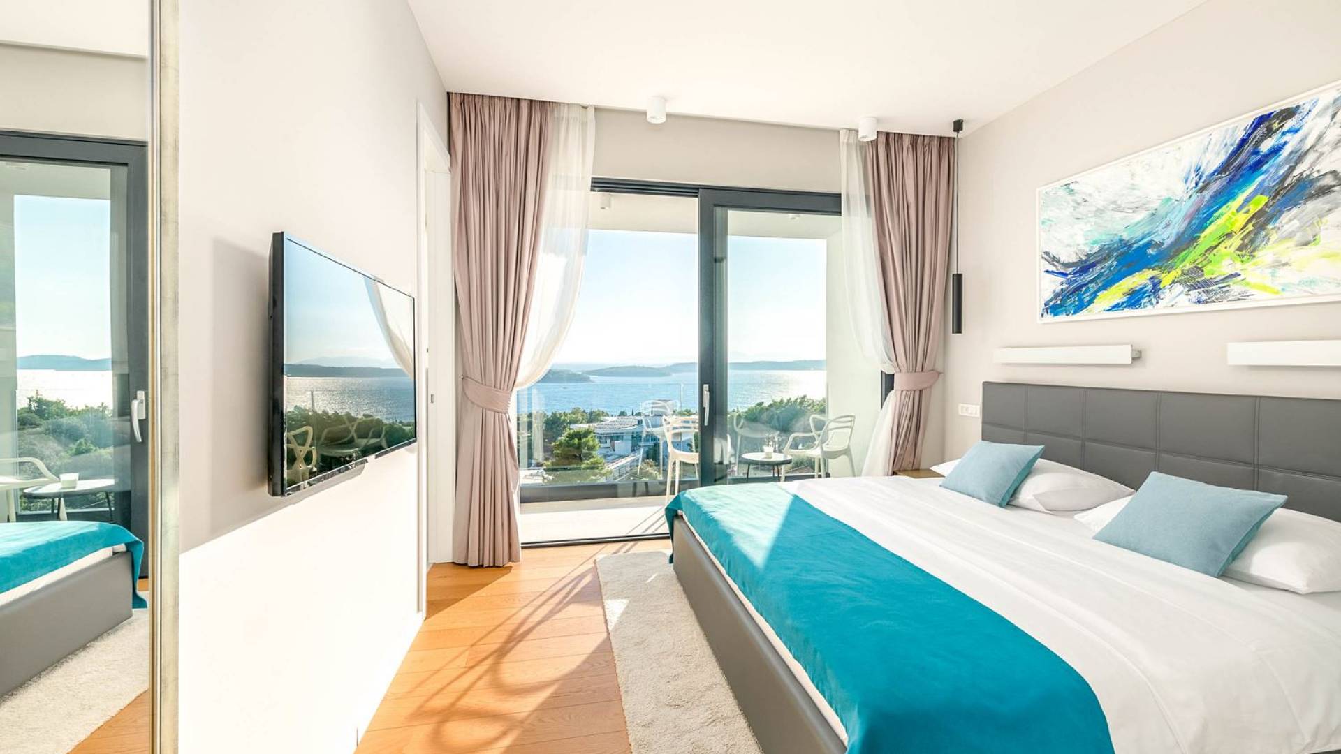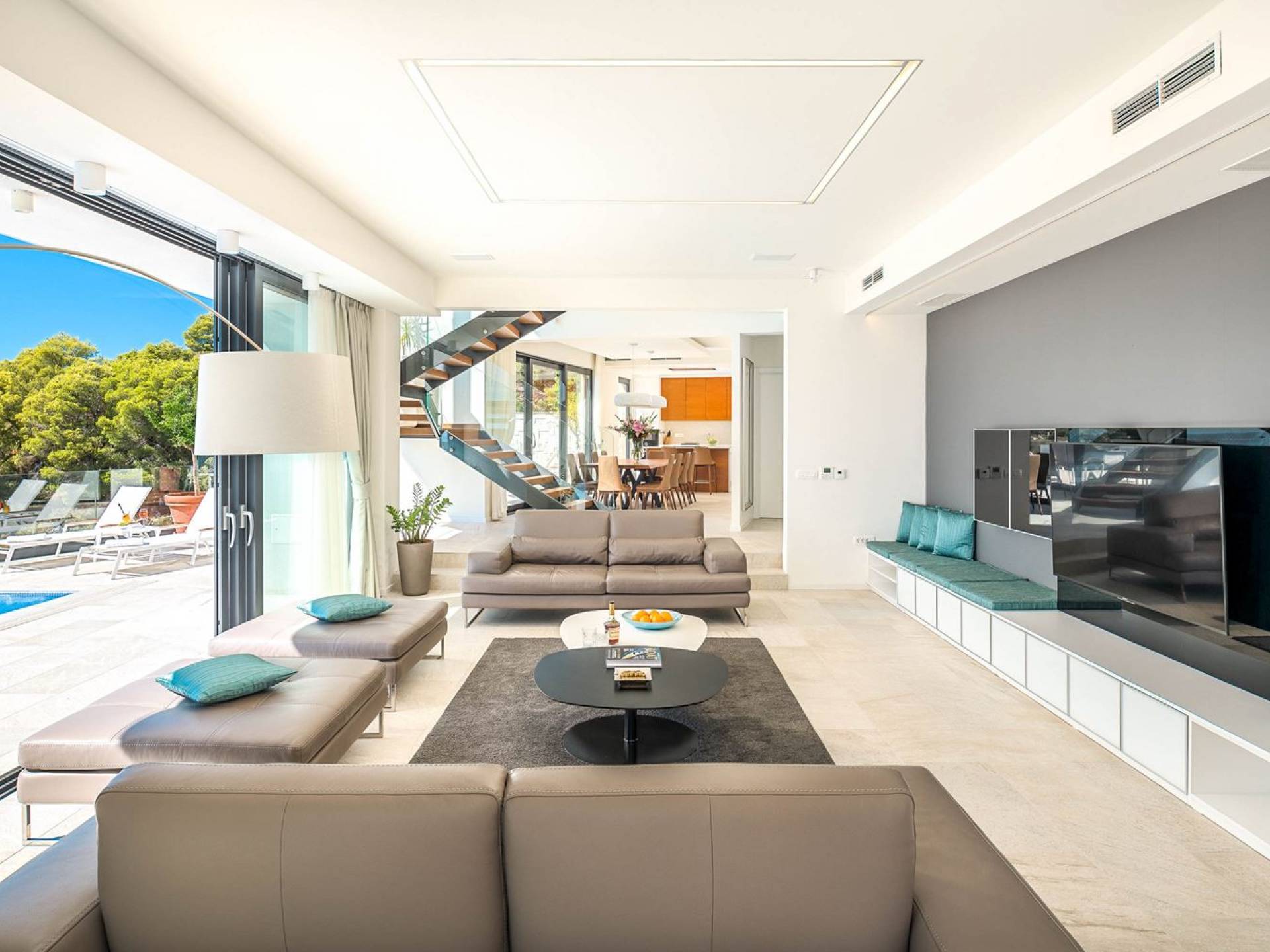 The interior of the villa is designed in white and gray tones with elements of natural and subtle dose of luxury, elegance, and comfort. The glass walls create a sense of natural beauty, opening onto a unique sea panorama, while the minimalist interior design creates a serene sense of calm for a dream vacation. Within this sensational villa, you will find a fully equipped kitchen, a living room and dining area, an area for recreation and relaxation with a sauna and gym, and 4 double bedrooms each with an en suite bathroom and three of them with a terrace. Each room is equipped with designer furniture and bedding, it is fully air-conditioned and with ultra-high definition smart TV’s and soft, feature lighting.