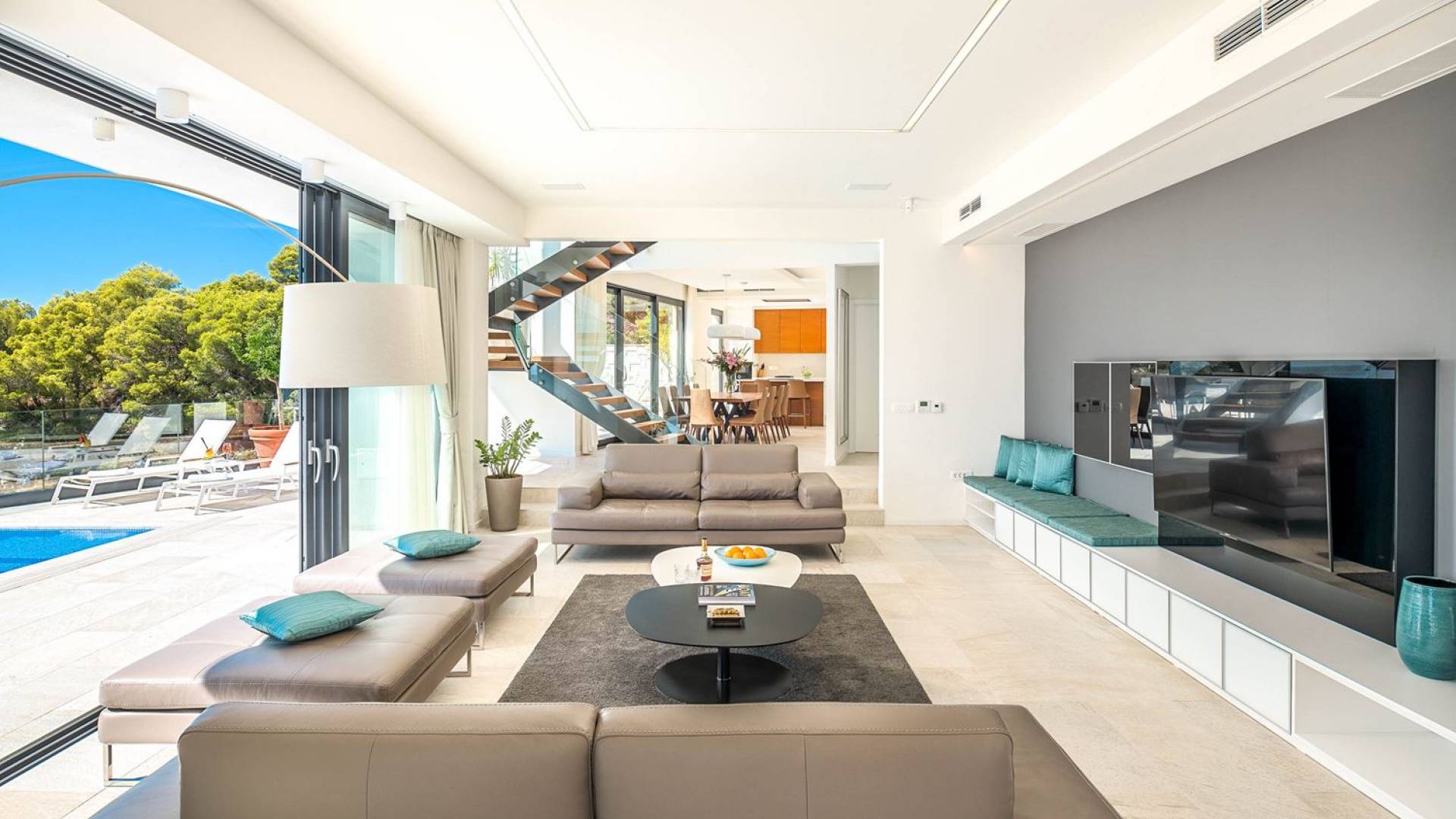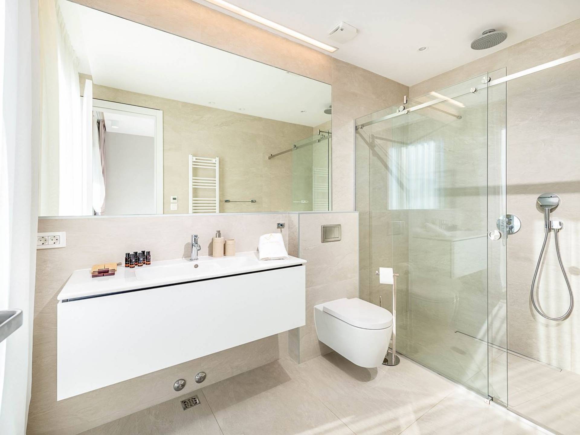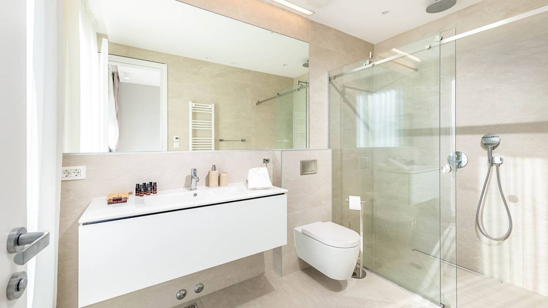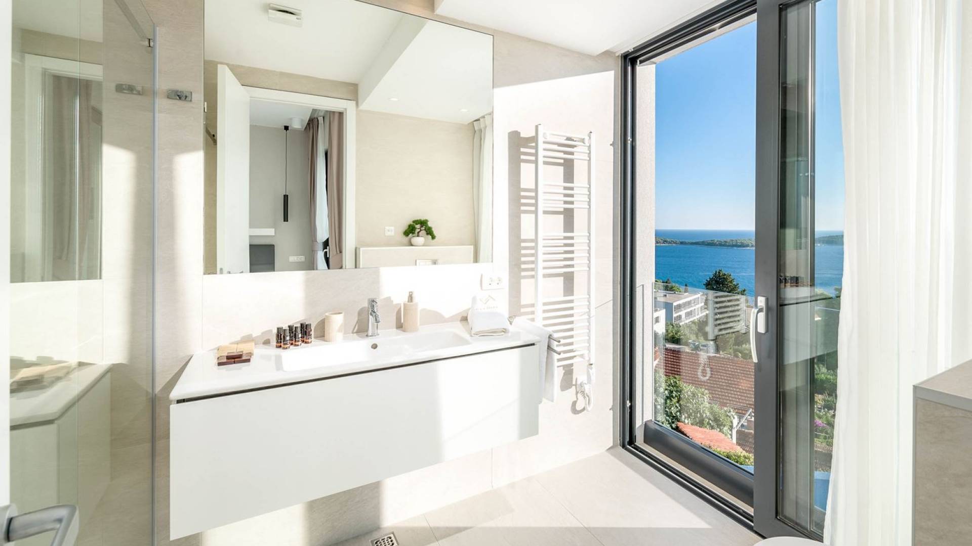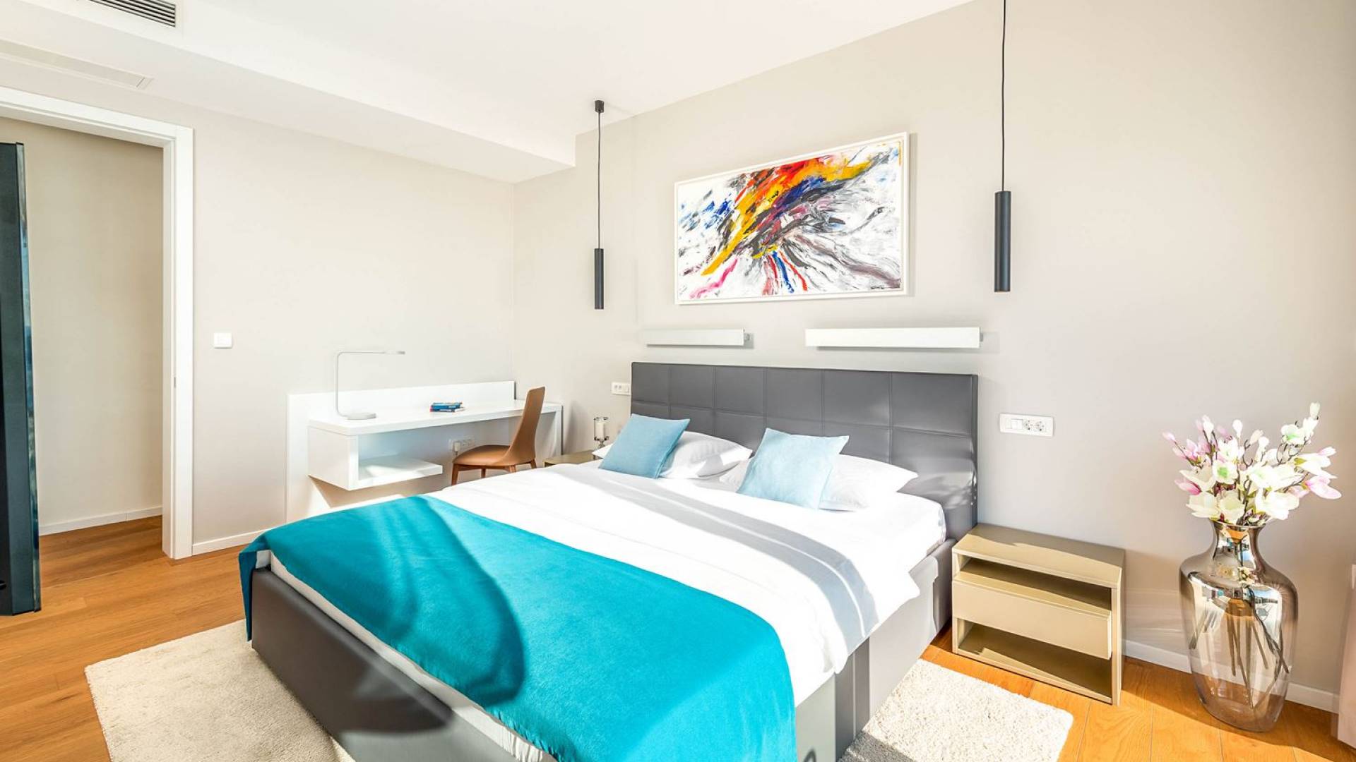 The interior of the villa is designed in white and gray tones with elements of natural and subtle dose of luxury, elegance, and comfort. The glass walls create a sense of natural beauty, opening onto a unique sea panorama, while the minimalist interior design creates a serene sense of calm for a dream vacation. Within this sensational villa, you will find a fully equipped kitchen, a living room and dining area, an area for recreation and relaxation with a sauna and gym, and 4 double bedrooms each with an en suite bathroom and three of them with a terrace. Each room is equipped with designer furniture and bedding, it is fully air-conditioned and with ultra-high definition smart TV’s and soft, feature lighting.