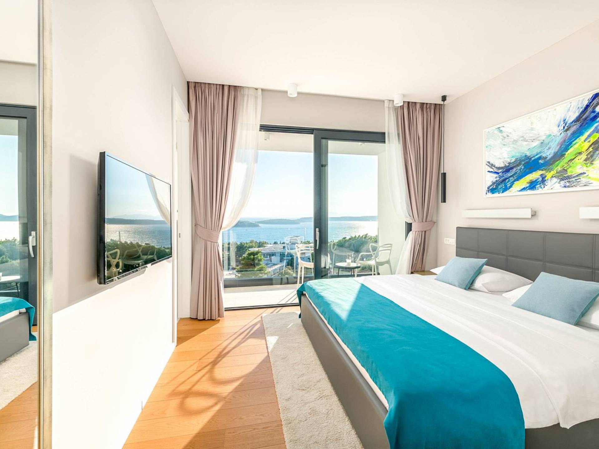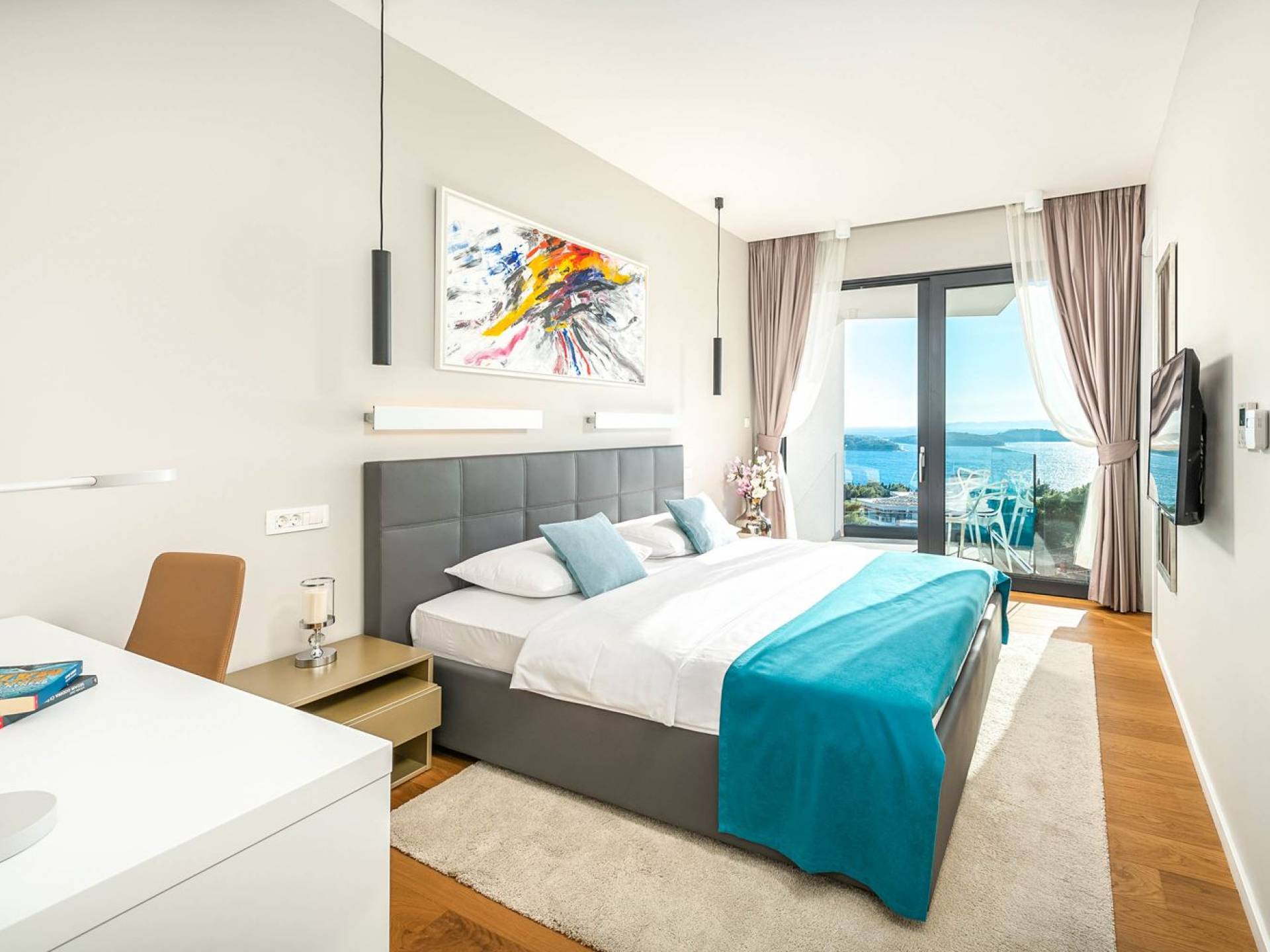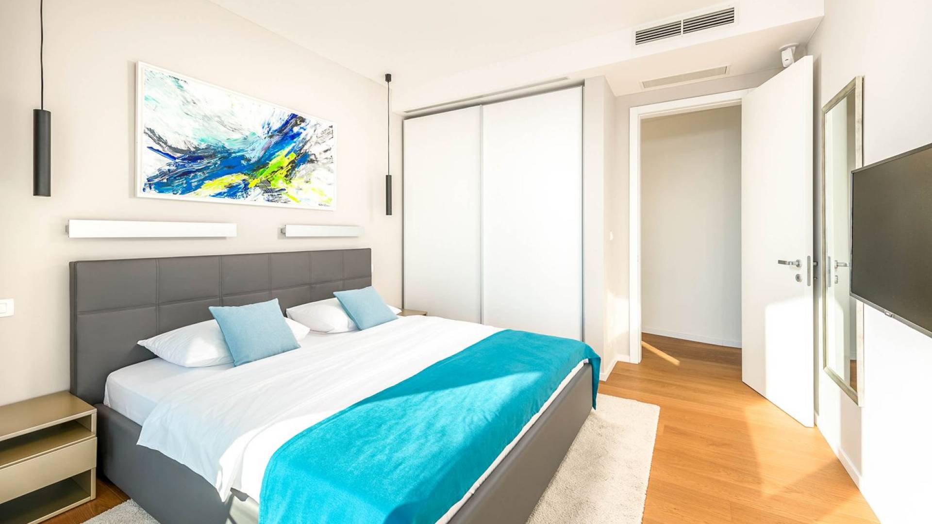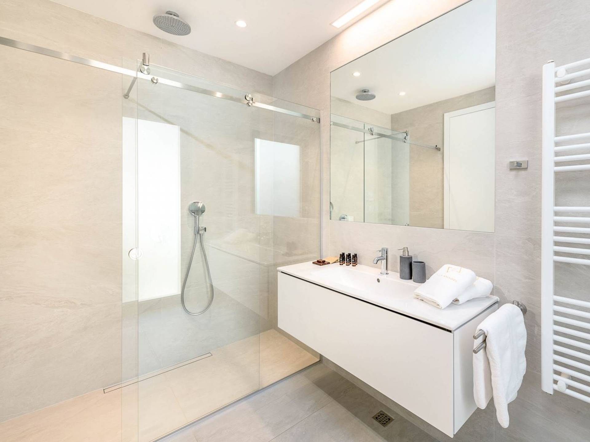 The interior of the villa is designed in white and gray tones with elements of natural and subtle dose of luxury, elegance, and comfort. The glass walls create a sense of natural beauty, opening onto a unique sea panorama, while the minimalist interior design creates a serene sense of calm for a dream vacation. Within this sensational villa, you will find a fully equipped kitchen, a living room and dining area, an area for recreation and relaxation with a sauna and gym, and 4 double bedrooms each with an en suite bathroom and three of them with a terrace. Each room is equipped with designer furniture and bedding, it is fully air-conditioned and with ultra-high definition smart TV’s and soft, feature lighting.