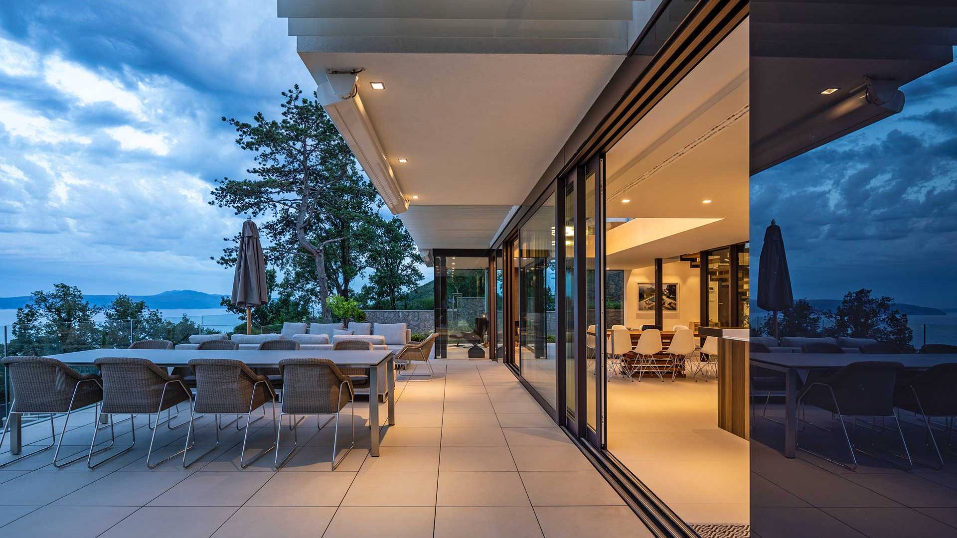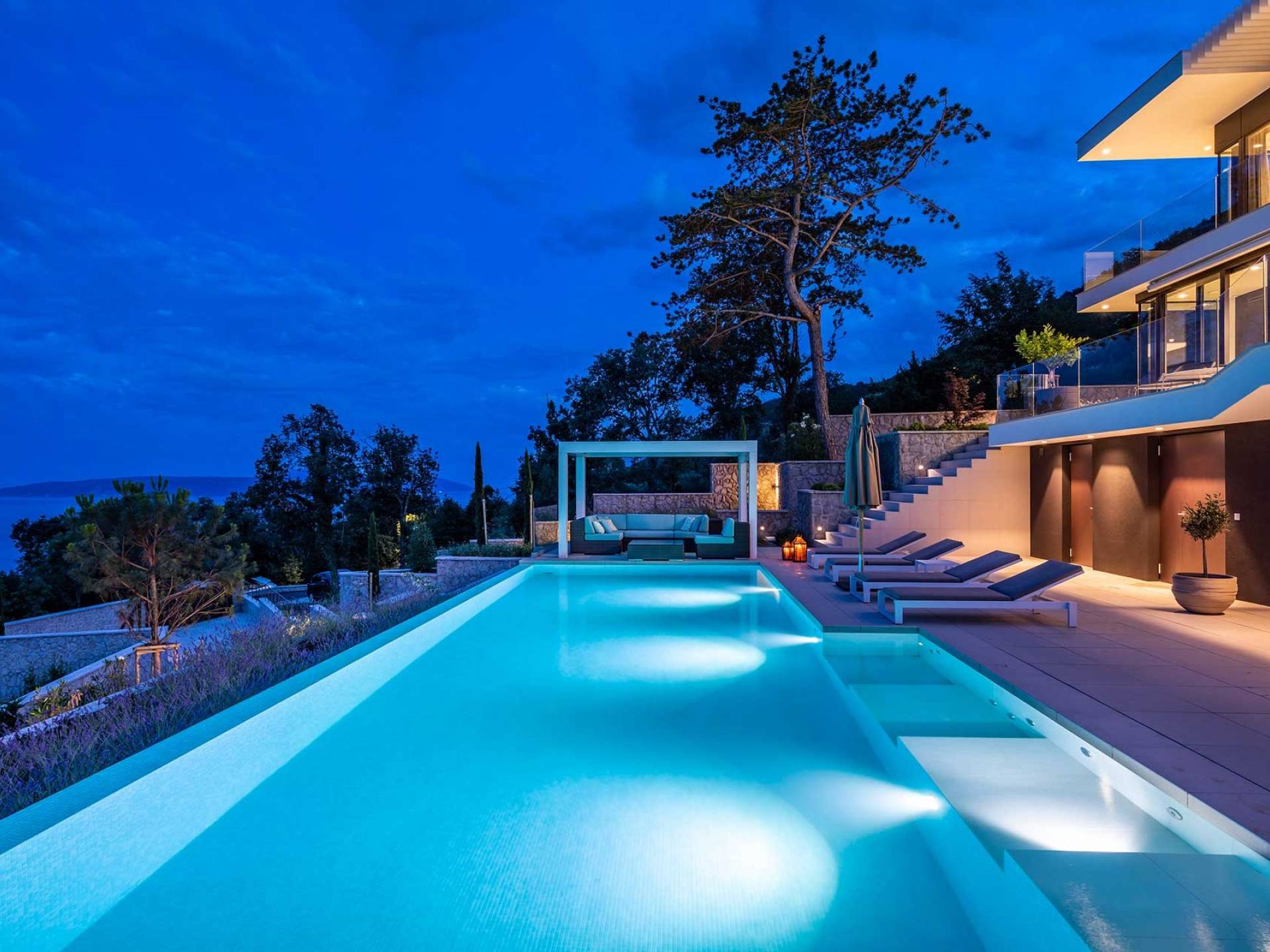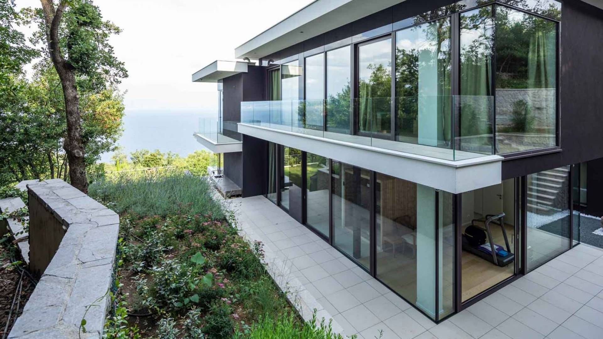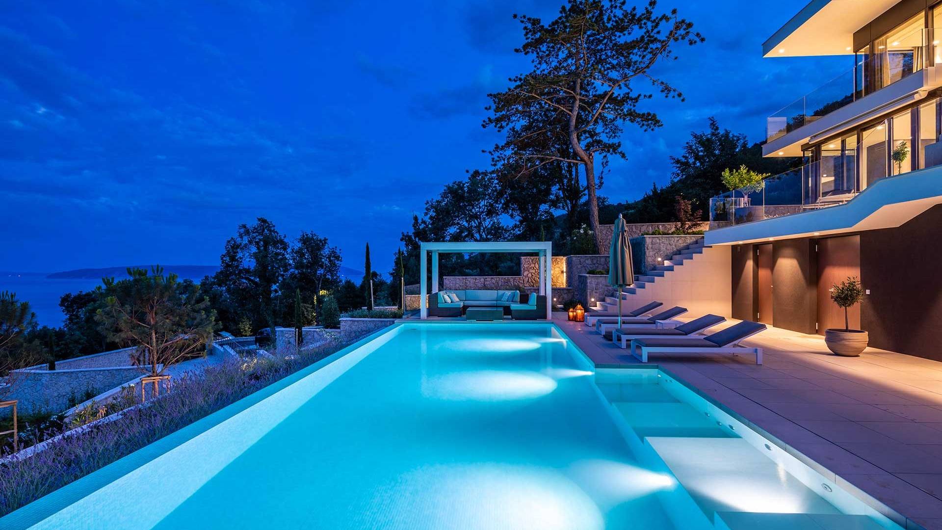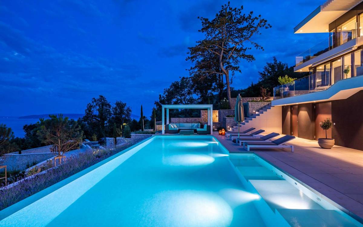 This newly built villa is a wonderful example of modern and innovative architecture; is spacious and airy, and high ceilings and glass walls give the feeling of freedom and open the view of the Kvarner islands from which you are breathtaking. Opposites, ie the islands and the Adriatic Sea on one side and the surrounding hills on the other make the Kvarner unique. And the beauty of this landscape is reflected in this villa because its unique location, architecture, and landscaping design are in complete harmony with the environment. Amidst a beautiful natural landscape, built on an elevated hillside, the villa provides a high degree of privacy and a fantastic view over the sea and the surrounding coastline. The villa with its high-quality furnishings has been integrated perfectly into the Mediterranean hillside landscape and built on multi-level terraces.