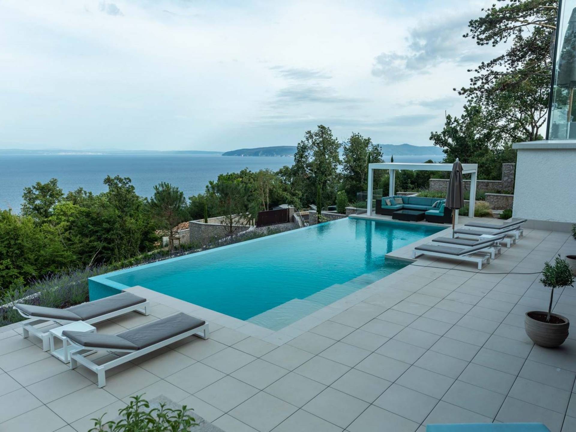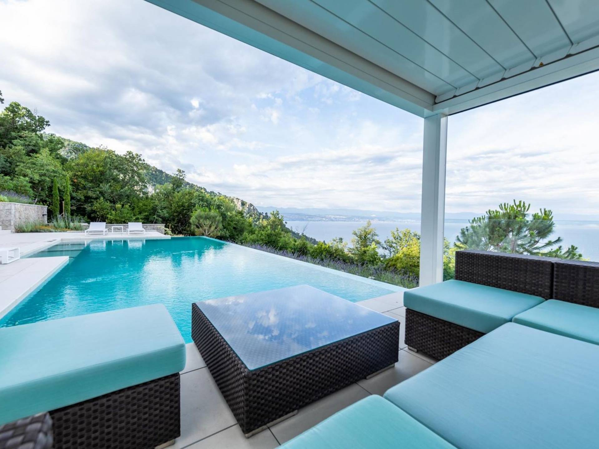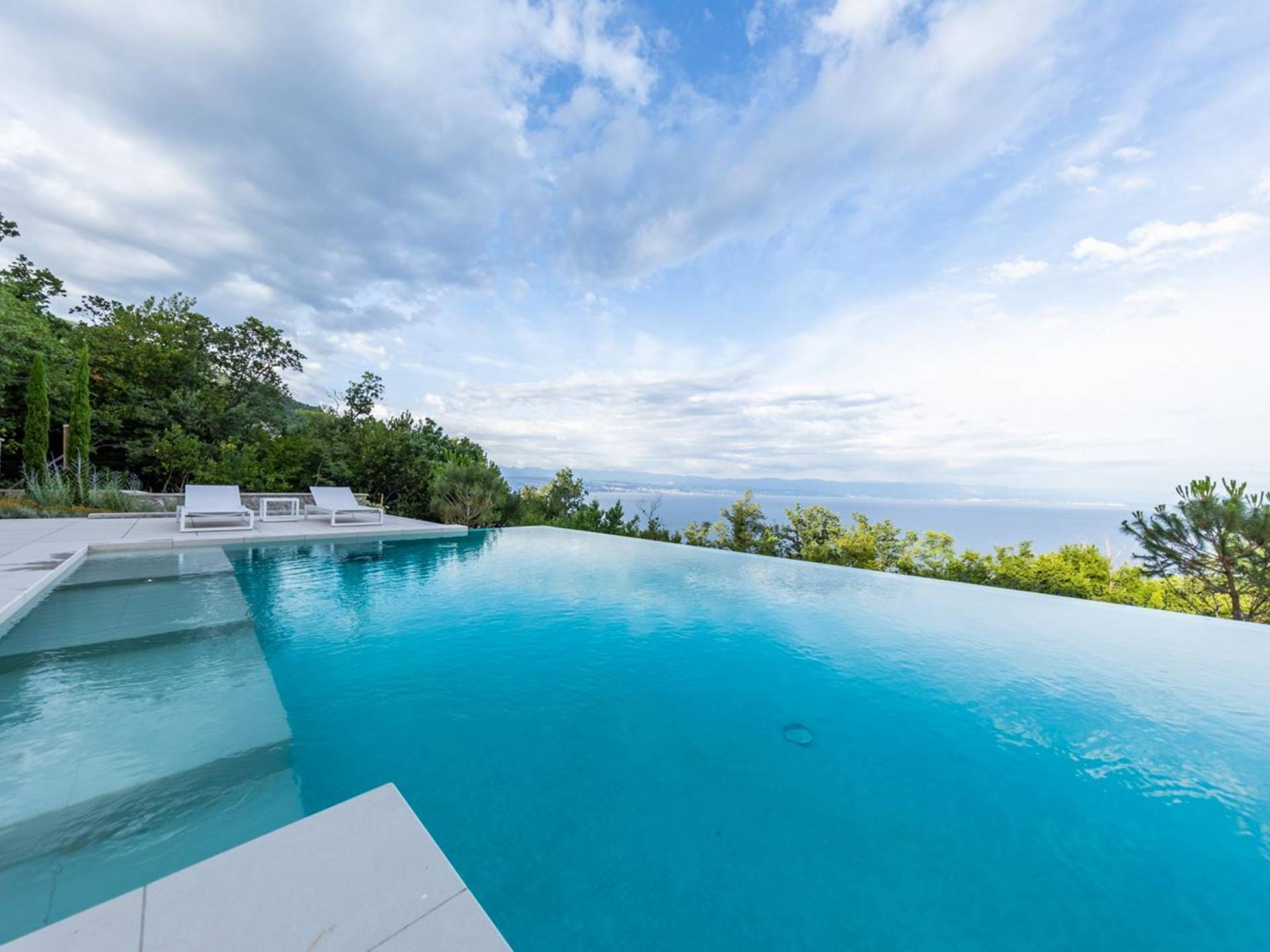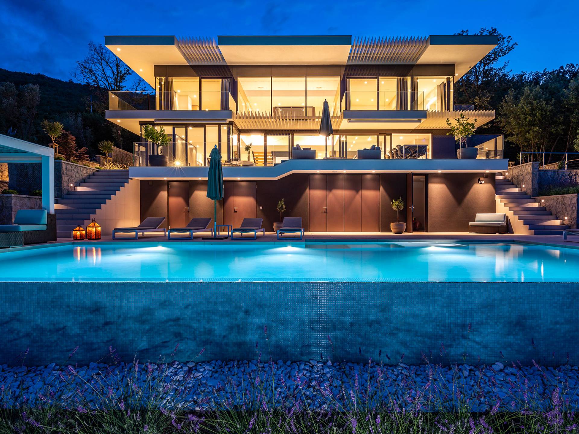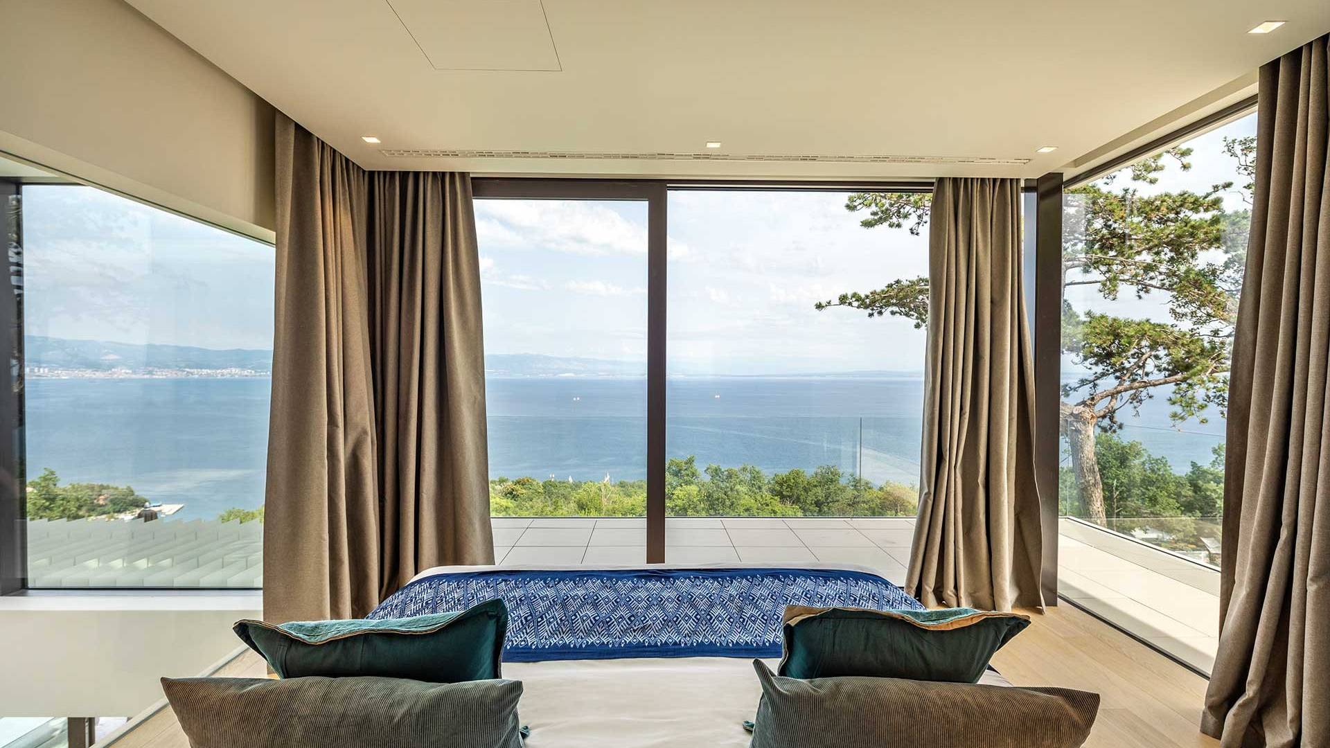 This newly built villa is a wonderful example of modern and innovative architecture; is spacious and airy, and high ceilings and glass walls give the feeling of freedom and open the view of the Kvarner islands from which you are breathtaking. Opposites, ie the islands and the Adriatic Sea on one side and the surrounding hills on the other make the Kvarner unique. And the beauty of this landscape is reflected in this villa because its unique location, architecture, and landscaping design are in complete harmony with the environment. Amidst a beautiful natural landscape, built on an elevated hillside, the villa provides a high degree of privacy and a fantastic view over the sea and the surrounding coastline. The villa with its high-quality furnishings has been integrated perfectly into the Mediterranean hillside landscape and built on multi-level terraces.