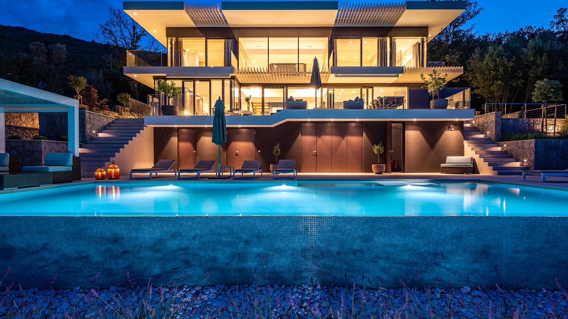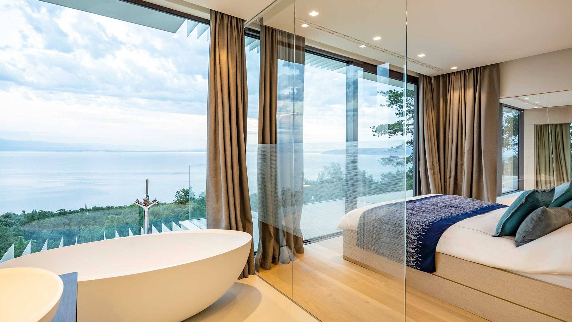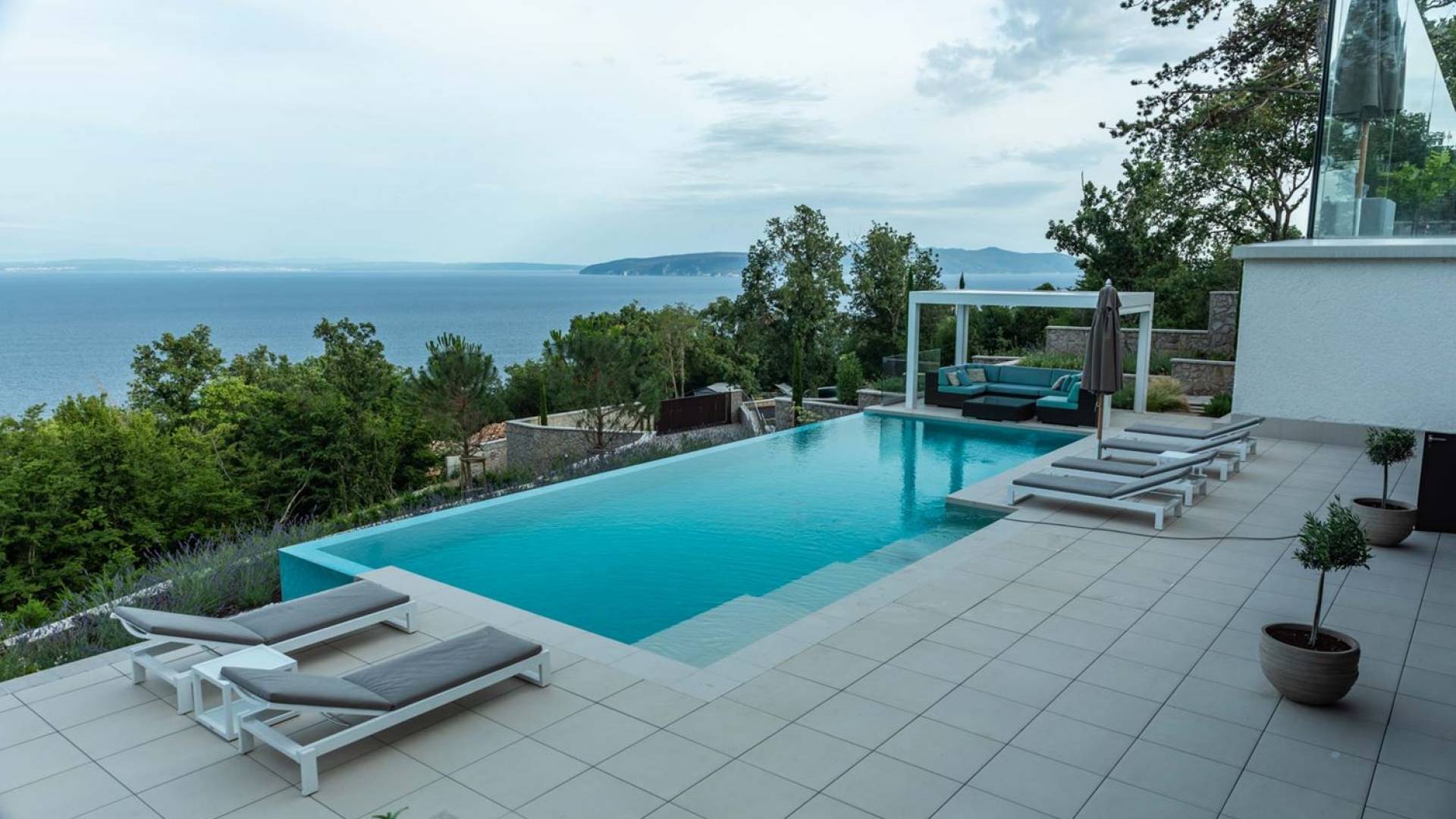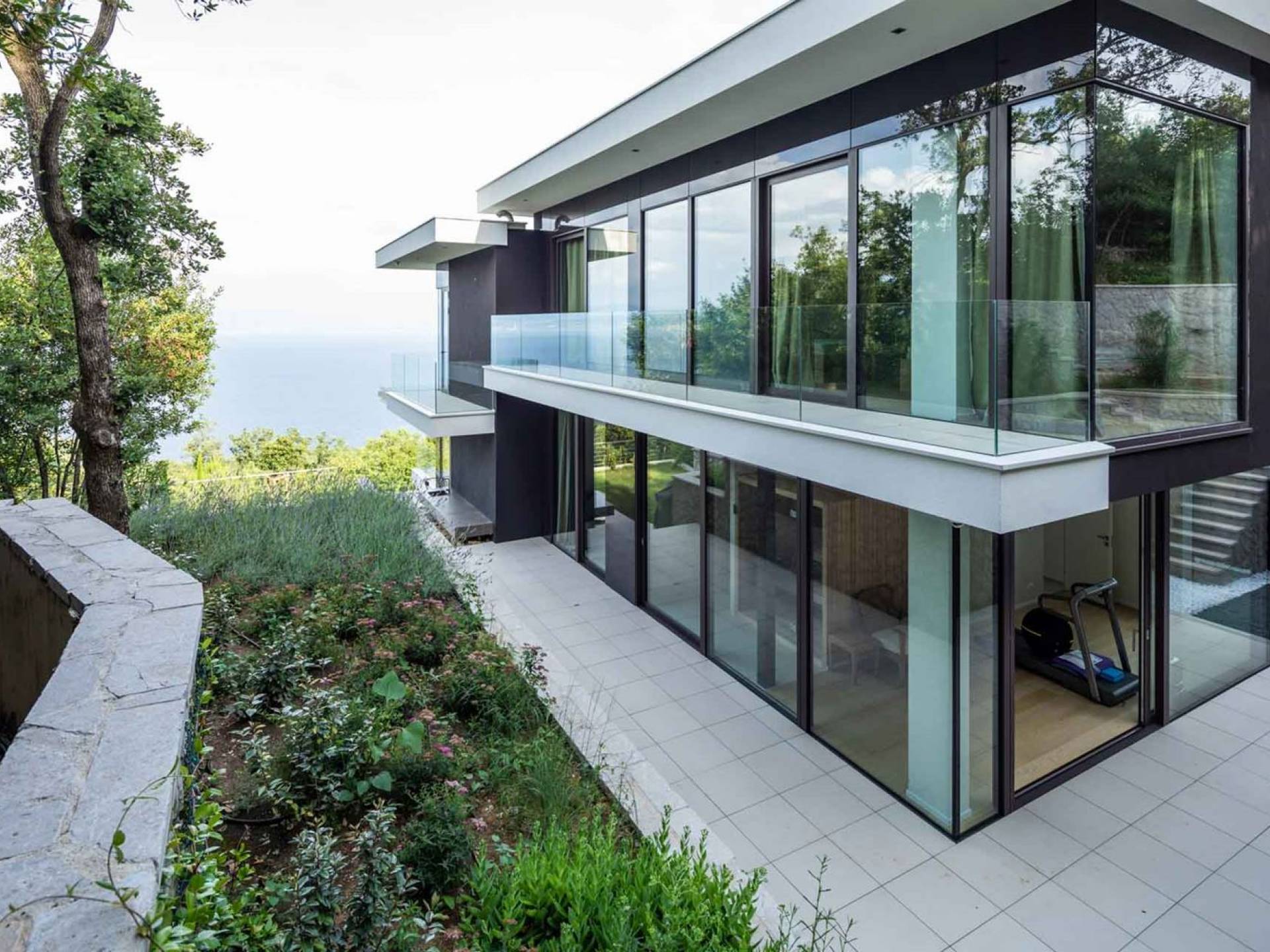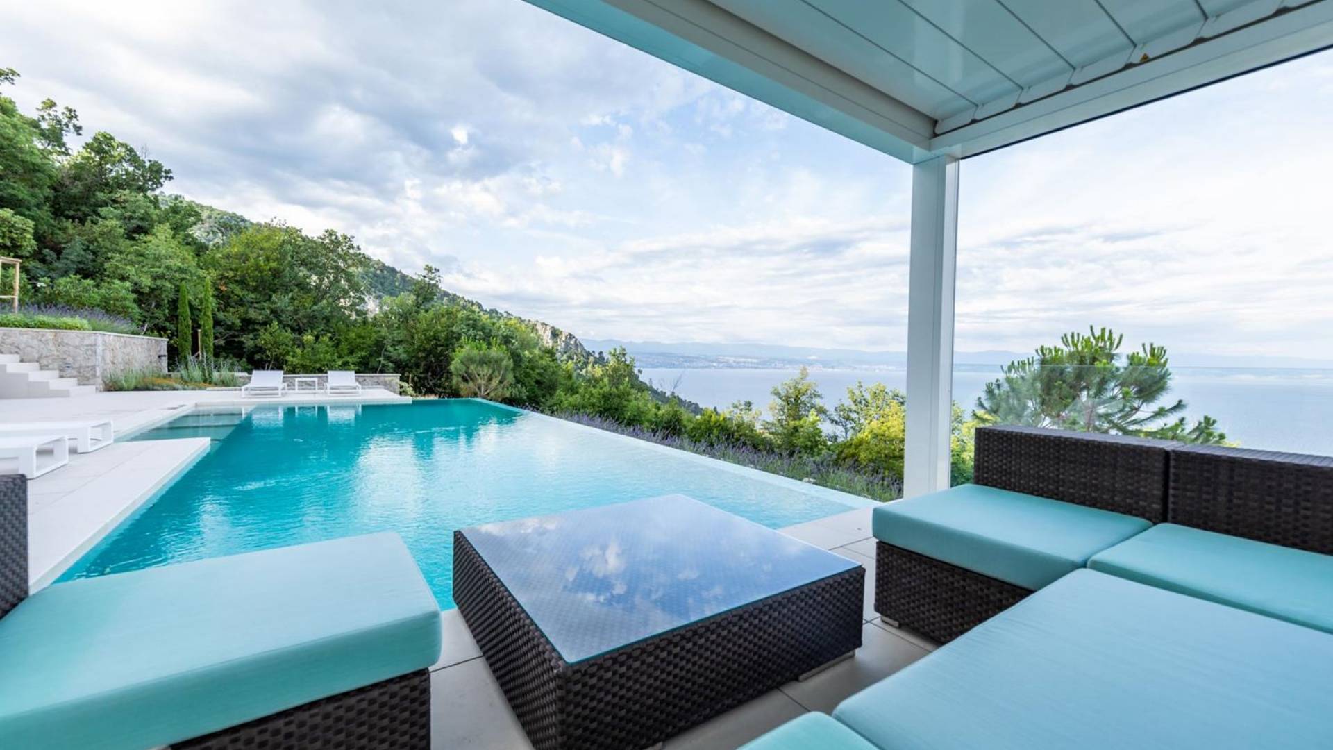 This newly built villa is a wonderful example of modern and innovative architecture; is spacious and airy, and high ceilings and glass walls give the feeling of freedom and open the view of the Kvarner islands from which you are breathtaking. Opposites, ie the islands and the Adriatic Sea on one side and the surrounding hills on the other make the Kvarner unique. And the beauty of this landscape is reflected in this villa because its unique location, architecture, and landscaping design are in complete harmony with the environment. Amidst a beautiful natural landscape, built on an elevated hillside, the villa provides a high degree of privacy and a fantastic view over the sea and the surrounding coastline. The villa with its high-quality furnishings has been integrated perfectly into the Mediterranean hillside landscape and built on multi-level terraces.