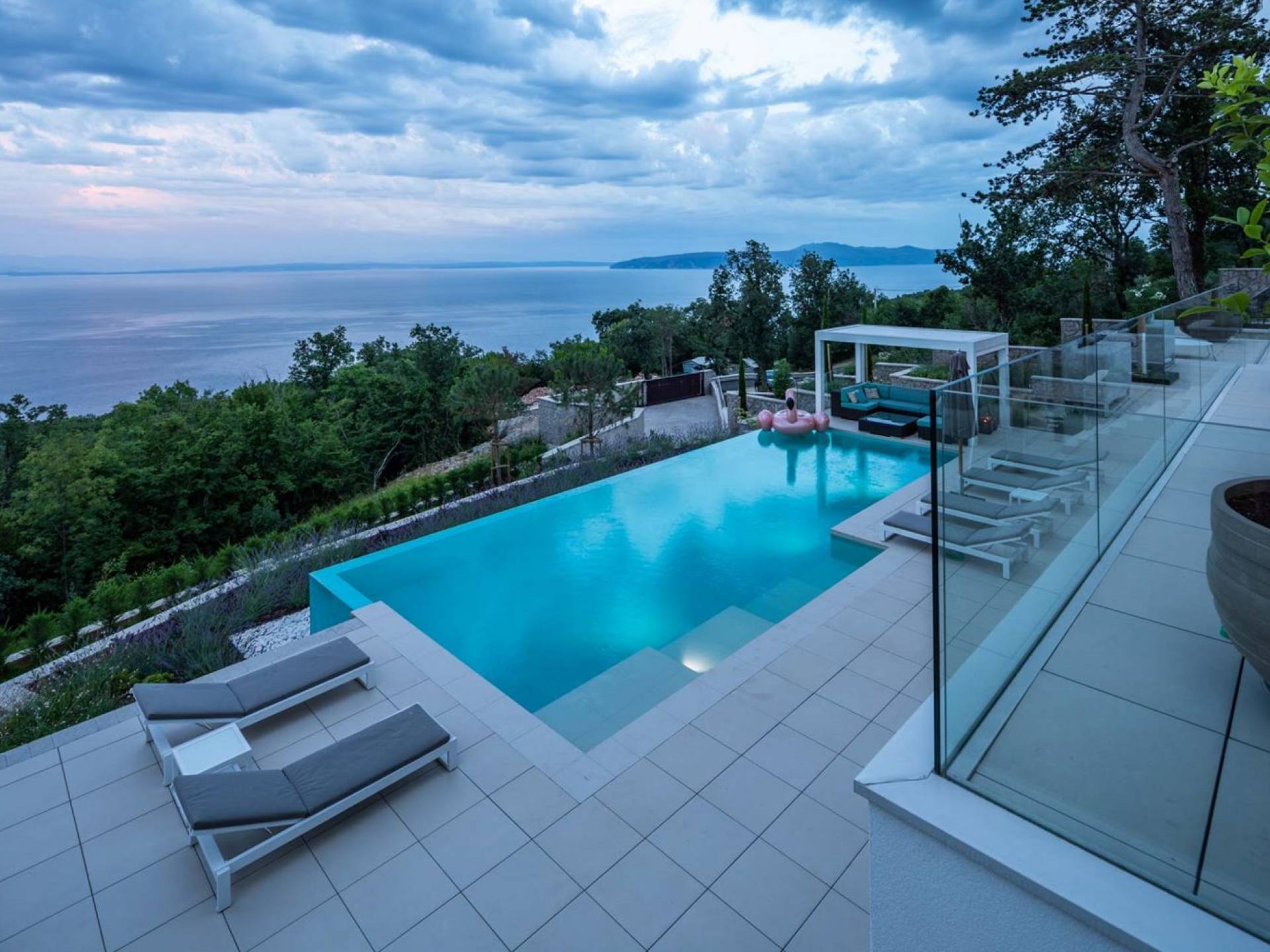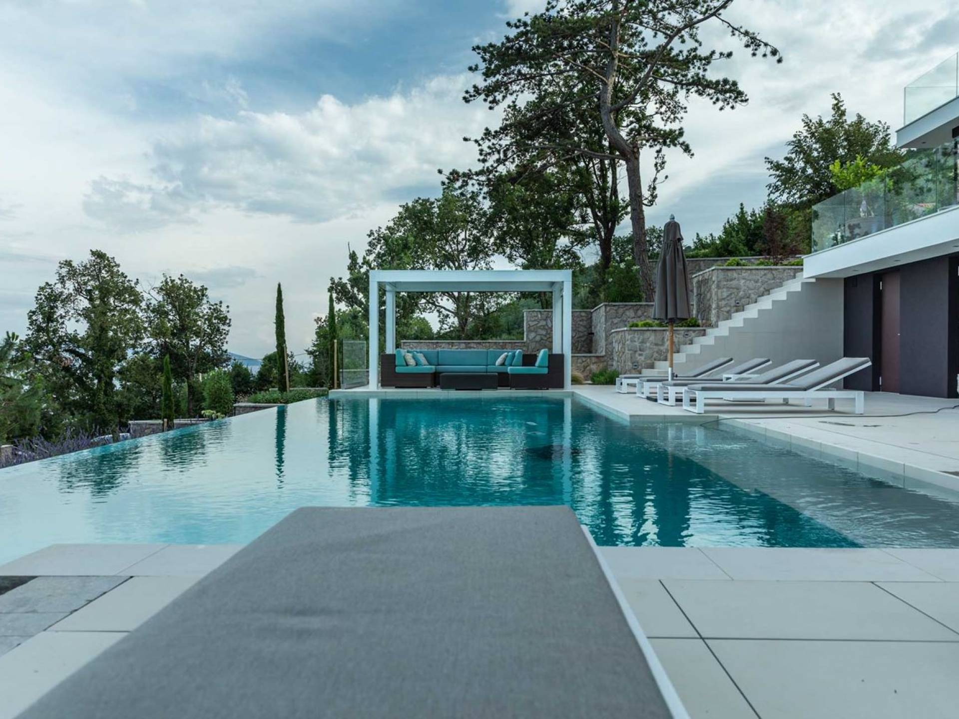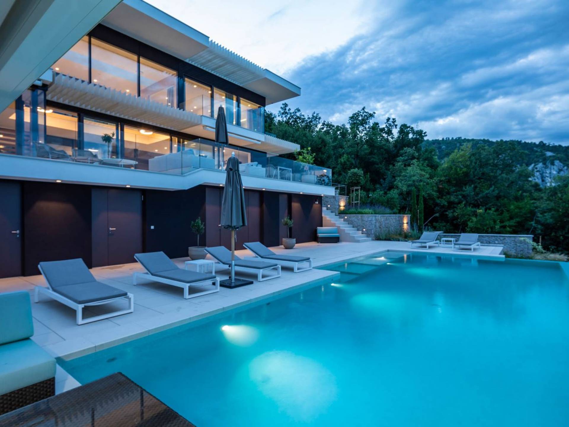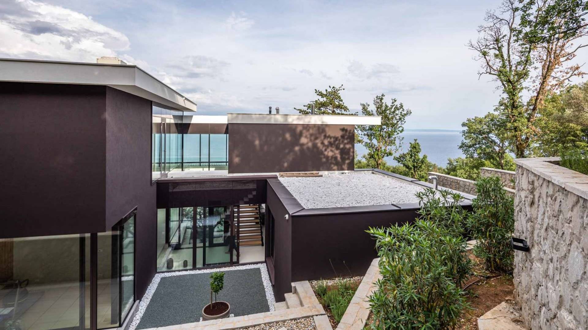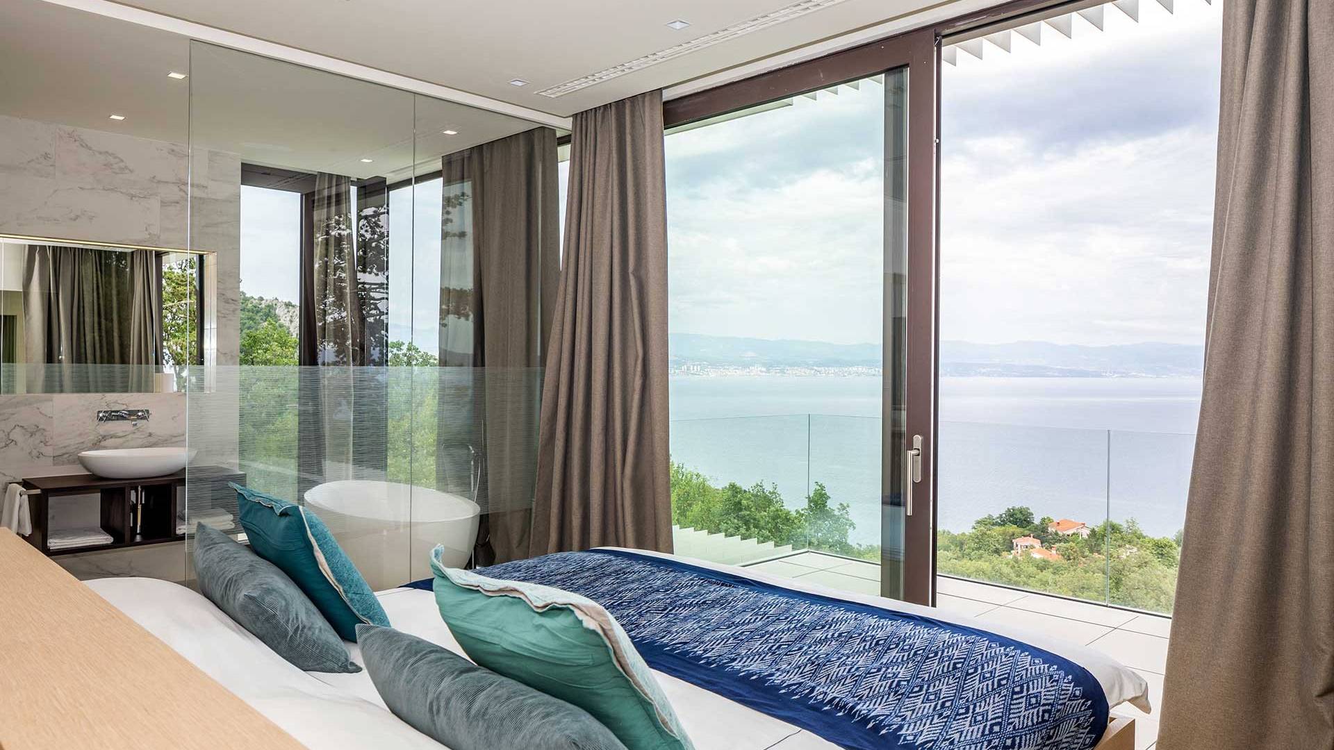 This newly built villa is a wonderful example of modern and innovative architecture; is spacious and airy, and high ceilings and glass walls give the feeling of freedom and open the view of the Kvarner islands from which you are breathtaking. Opposites, ie the islands and the Adriatic Sea on one side and the surrounding hills on the other make the Kvarner unique. And the beauty of this landscape is reflected in this villa because its unique location, architecture, and landscaping design are in complete harmony with the environment. Amidst a beautiful natural landscape, built on an elevated hillside, the villa provides a high degree of privacy and a fantastic view over the sea and the surrounding coastline. The villa with its high-quality furnishings has been integrated perfectly into the Mediterranean hillside landscape and built on multi-level terraces.