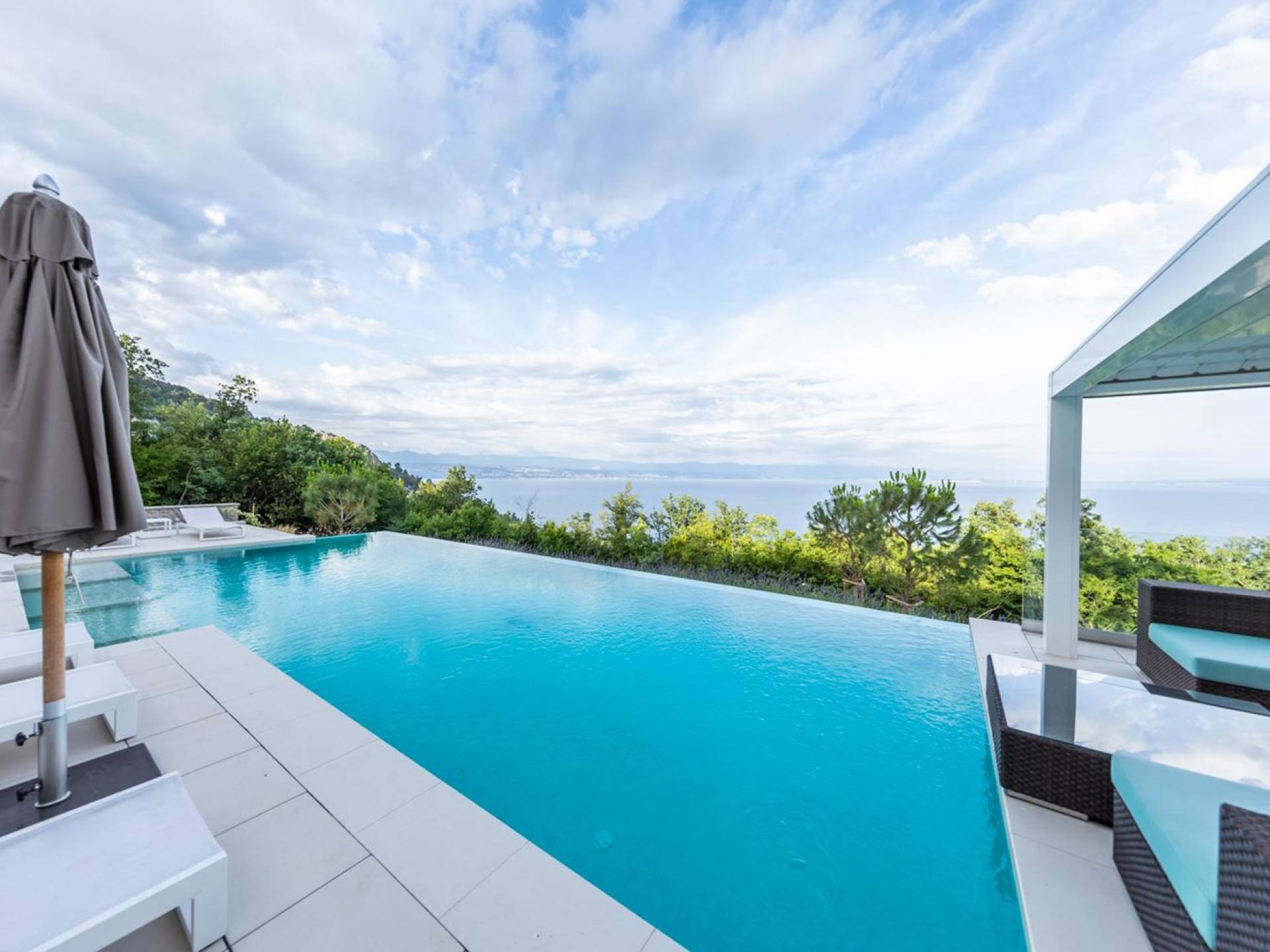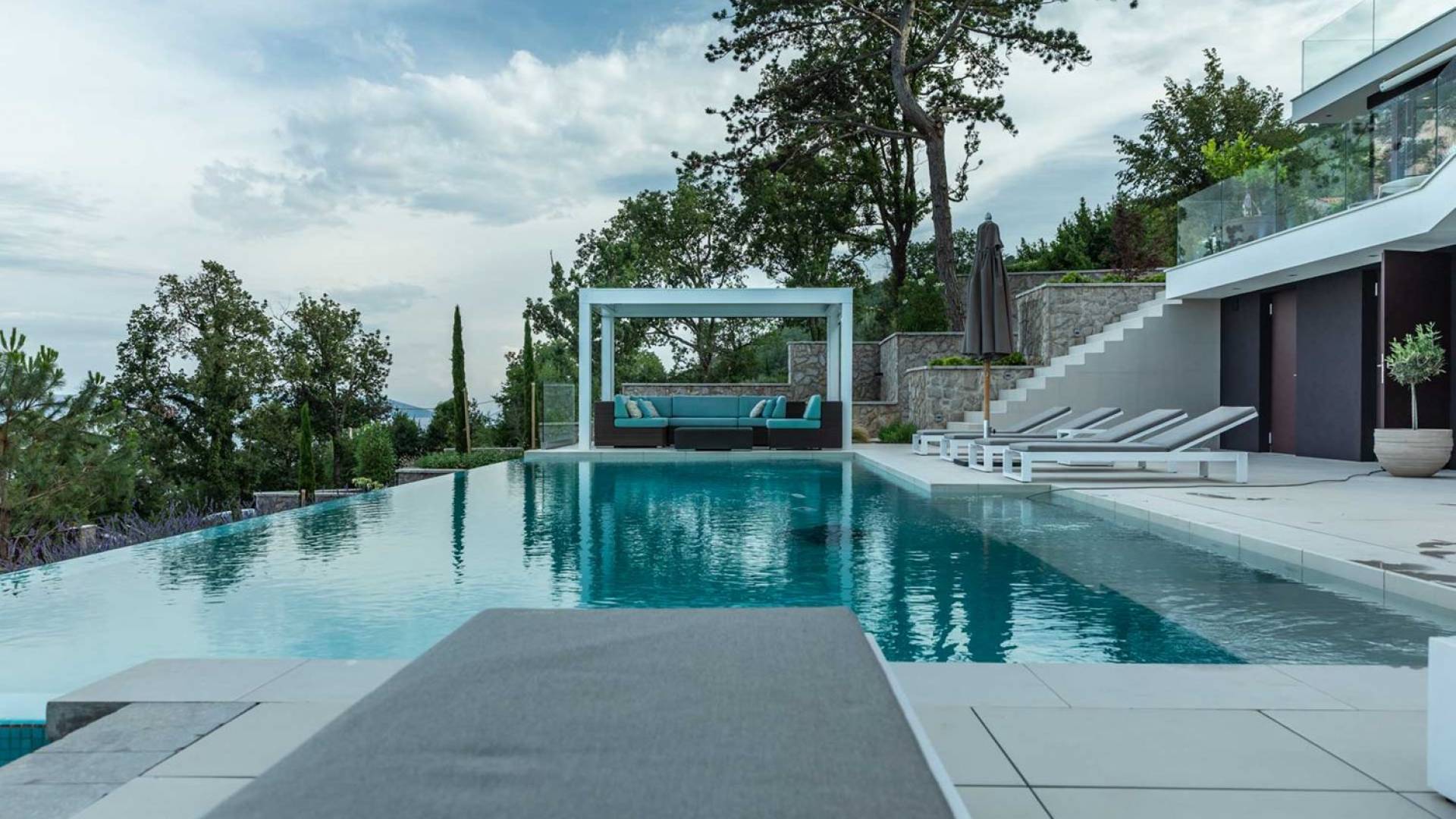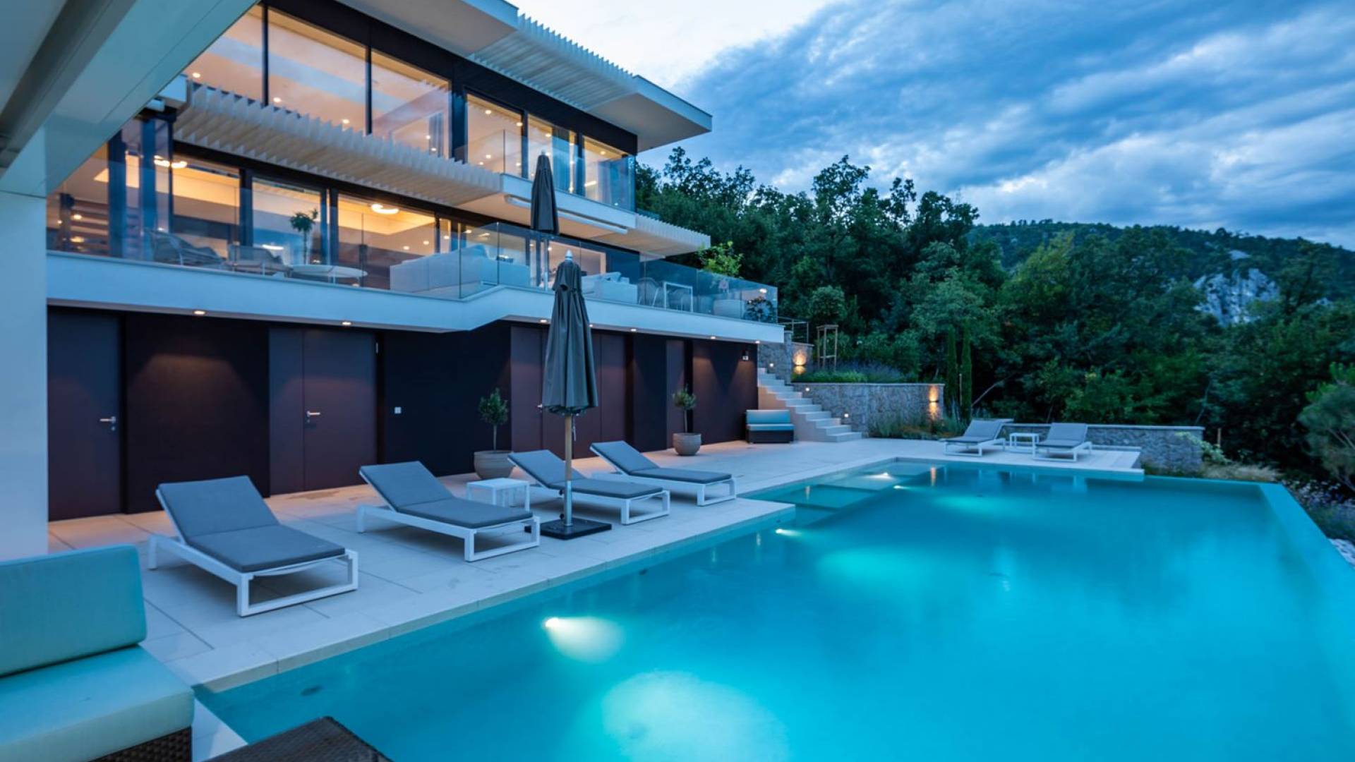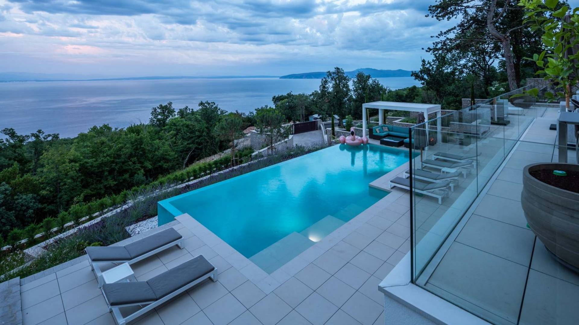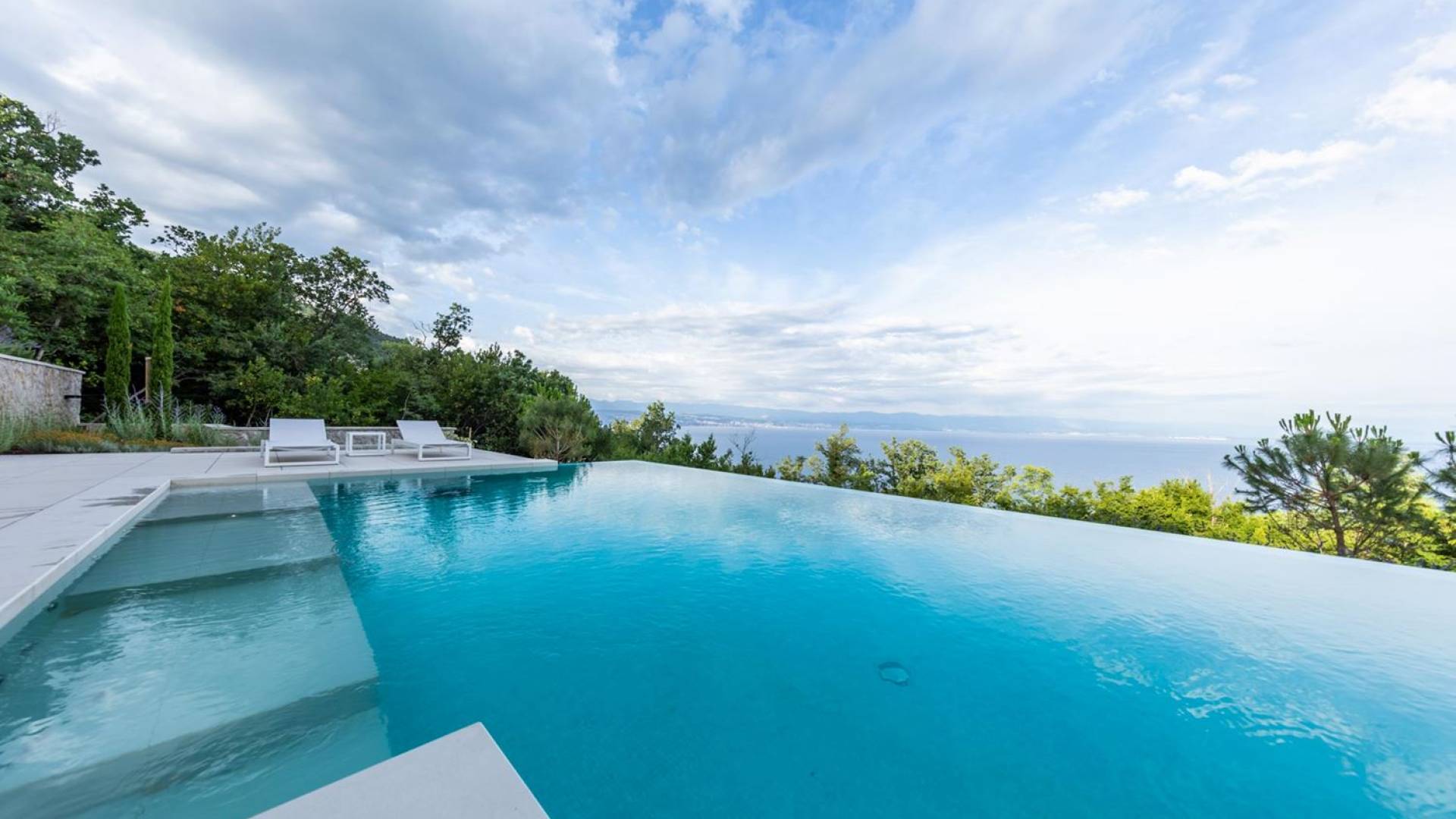 This newly built villa is a wonderful example of modern and innovative architecture; is spacious and airy, and high ceilings and glass walls give the feeling of freedom and open the view of the Kvarner islands from which you are breathtaking. Opposites, ie the islands and the Adriatic Sea on one side and the surrounding hills on the other make the Kvarner unique. And the beauty of this landscape is reflected in this villa because its unique location, architecture, and landscaping design are in complete harmony with the environment. Amidst a beautiful natural landscape, built on an elevated hillside, the villa provides a high degree of privacy and a fantastic view over the sea and the surrounding coastline. The villa with its high-quality furnishings has been integrated perfectly into the Mediterranean hillside landscape and built on multi-level terraces.