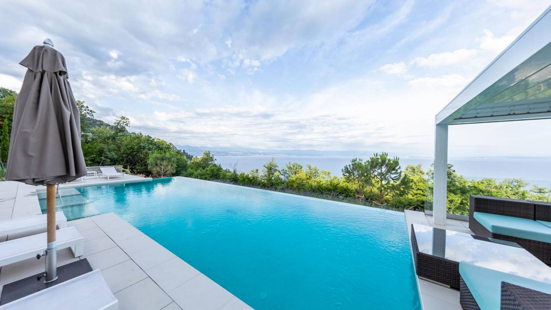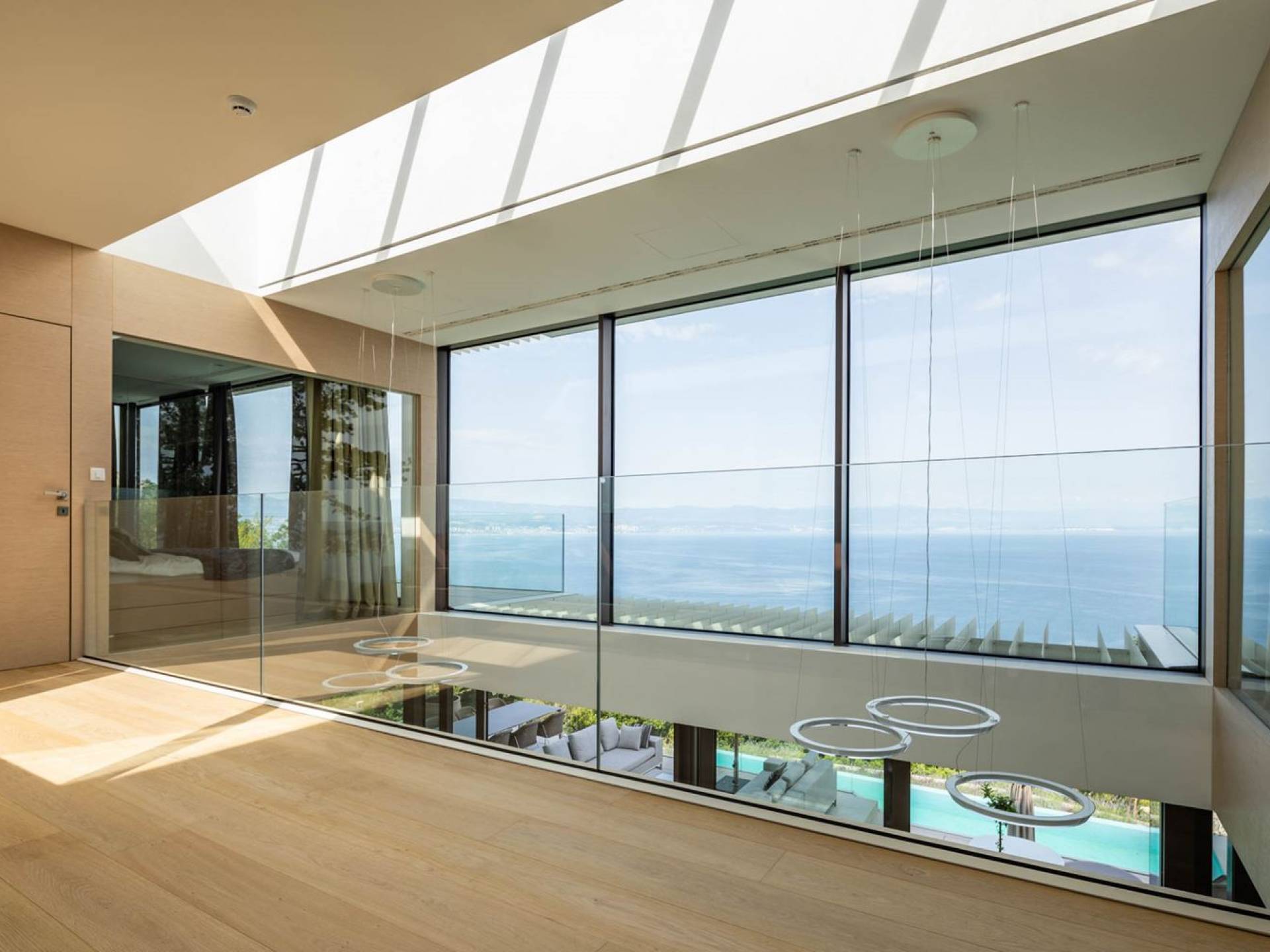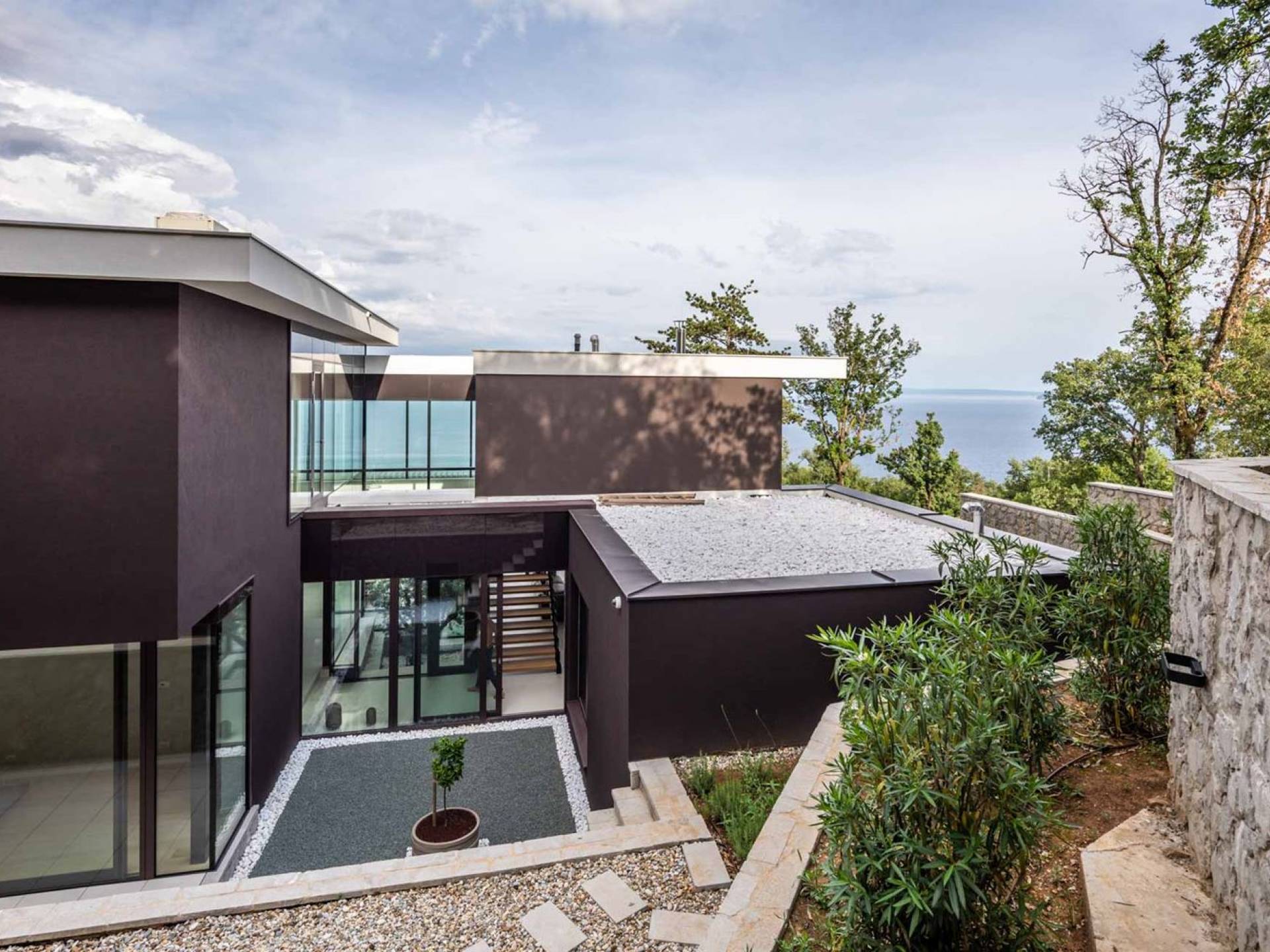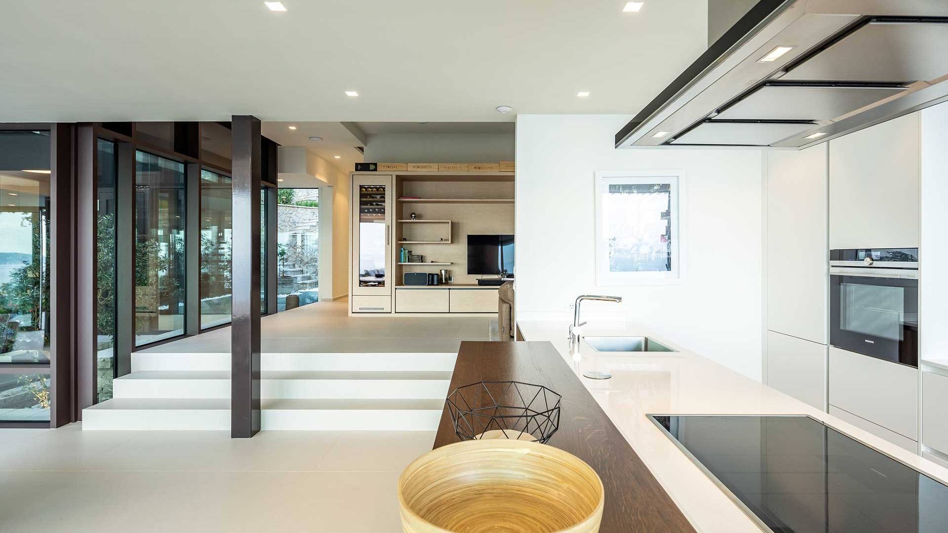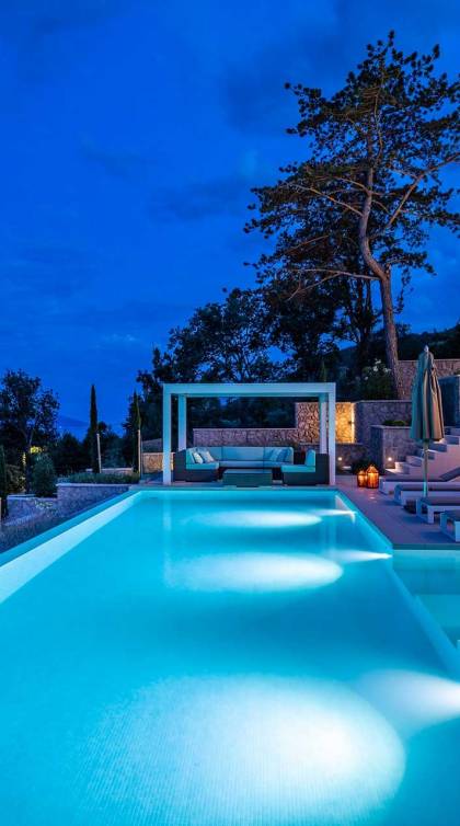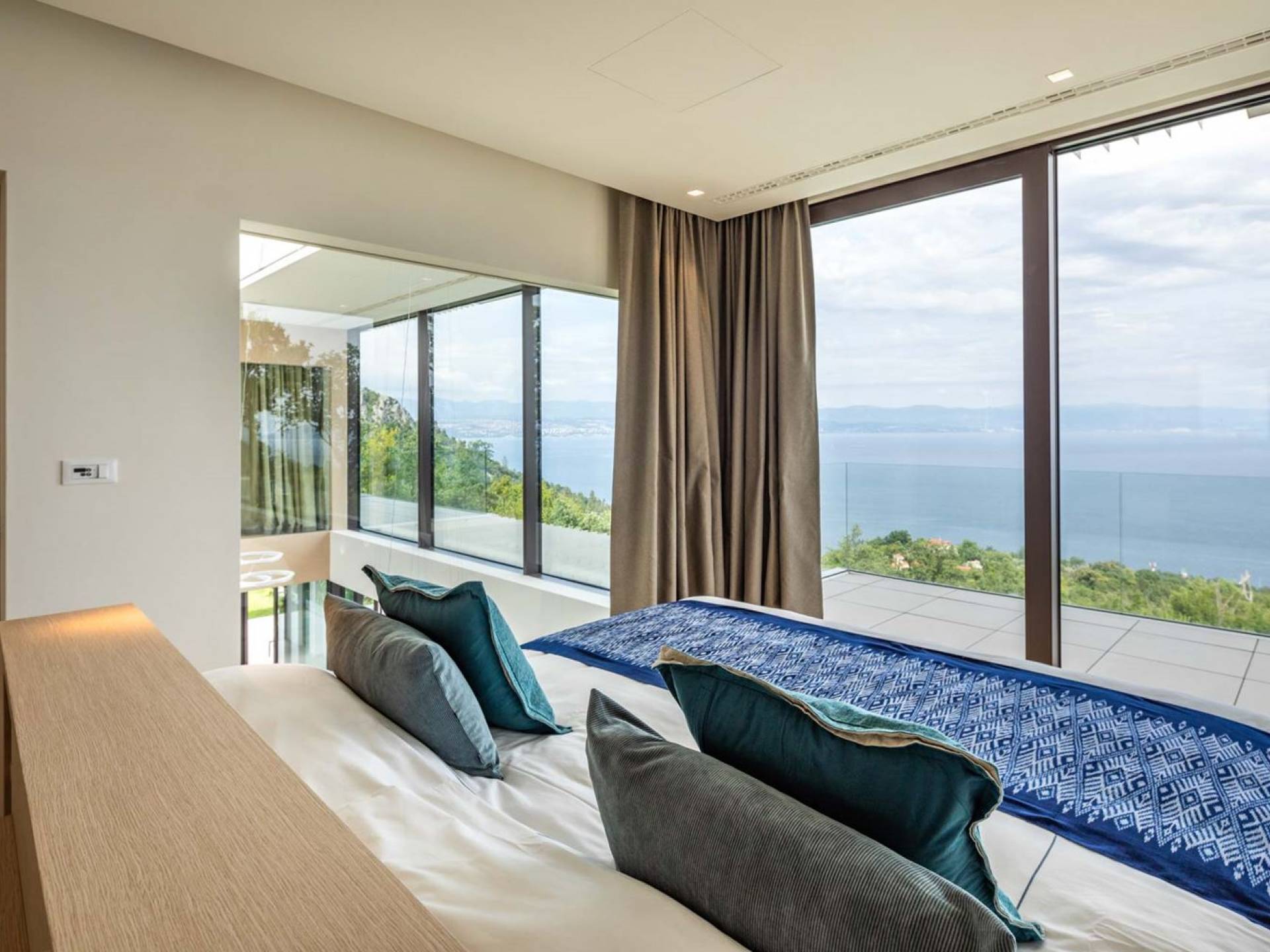 This newly built villa is a wonderful example of modern and innovative architecture; is spacious and airy, and high ceilings and glass walls give the feeling of freedom and open the view of the Kvarner islands from which you are breathtaking. Opposites, ie the islands and the Adriatic Sea on one side and the surrounding hills on the other make the Kvarner unique. And the beauty of this landscape is reflected in this villa because its unique location, architecture, and landscaping design are in complete harmony with the environment. Amidst a beautiful natural landscape, built on an elevated hillside, the villa provides a high degree of privacy and a fantastic view over the sea and the surrounding coastline. The villa with its high-quality furnishings has been integrated perfectly into the Mediterranean hillside landscape and built on multi-level terraces.