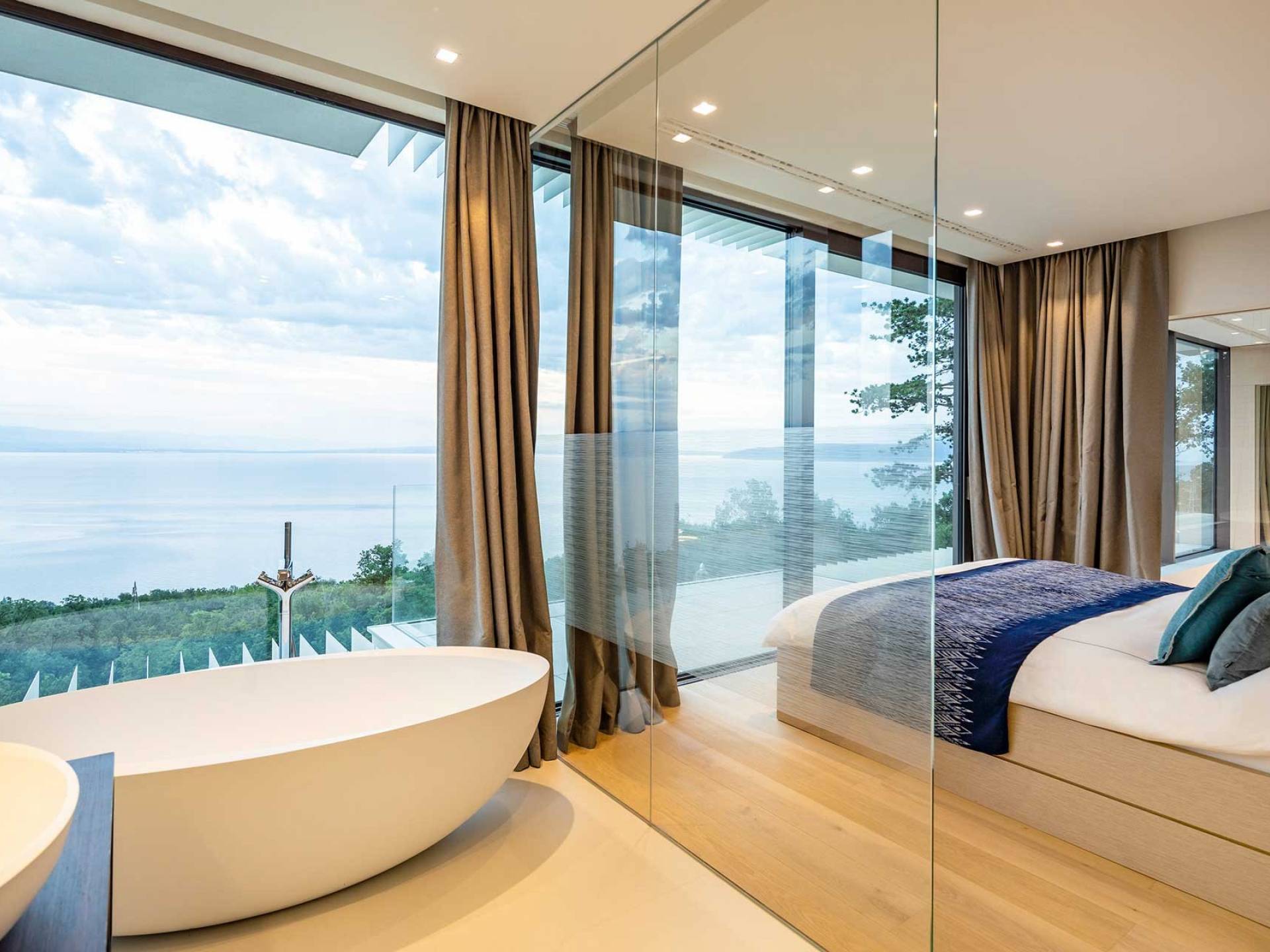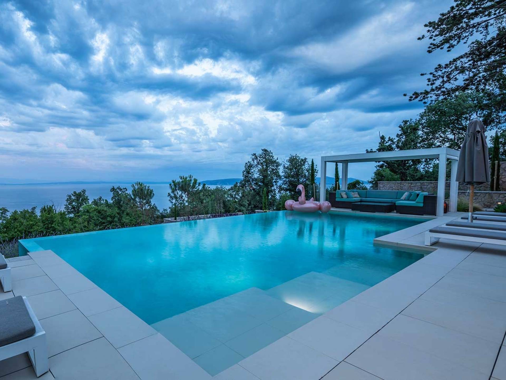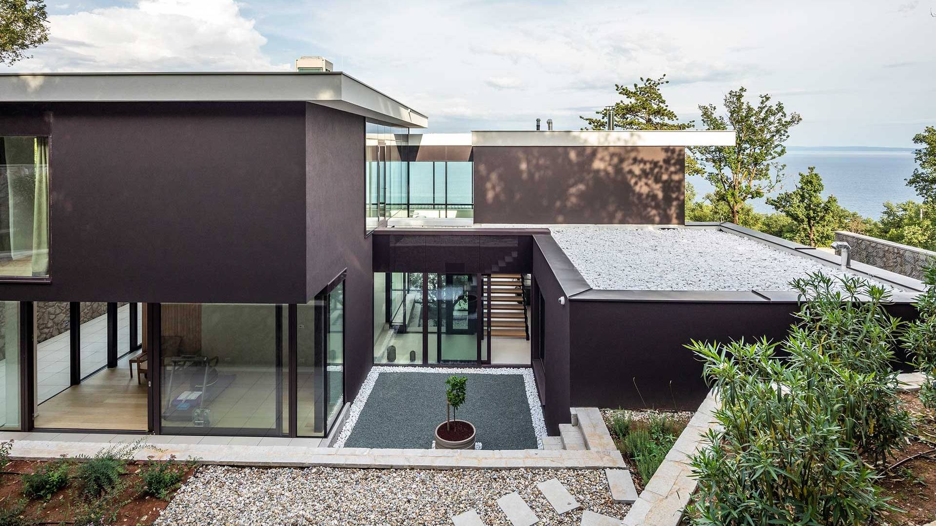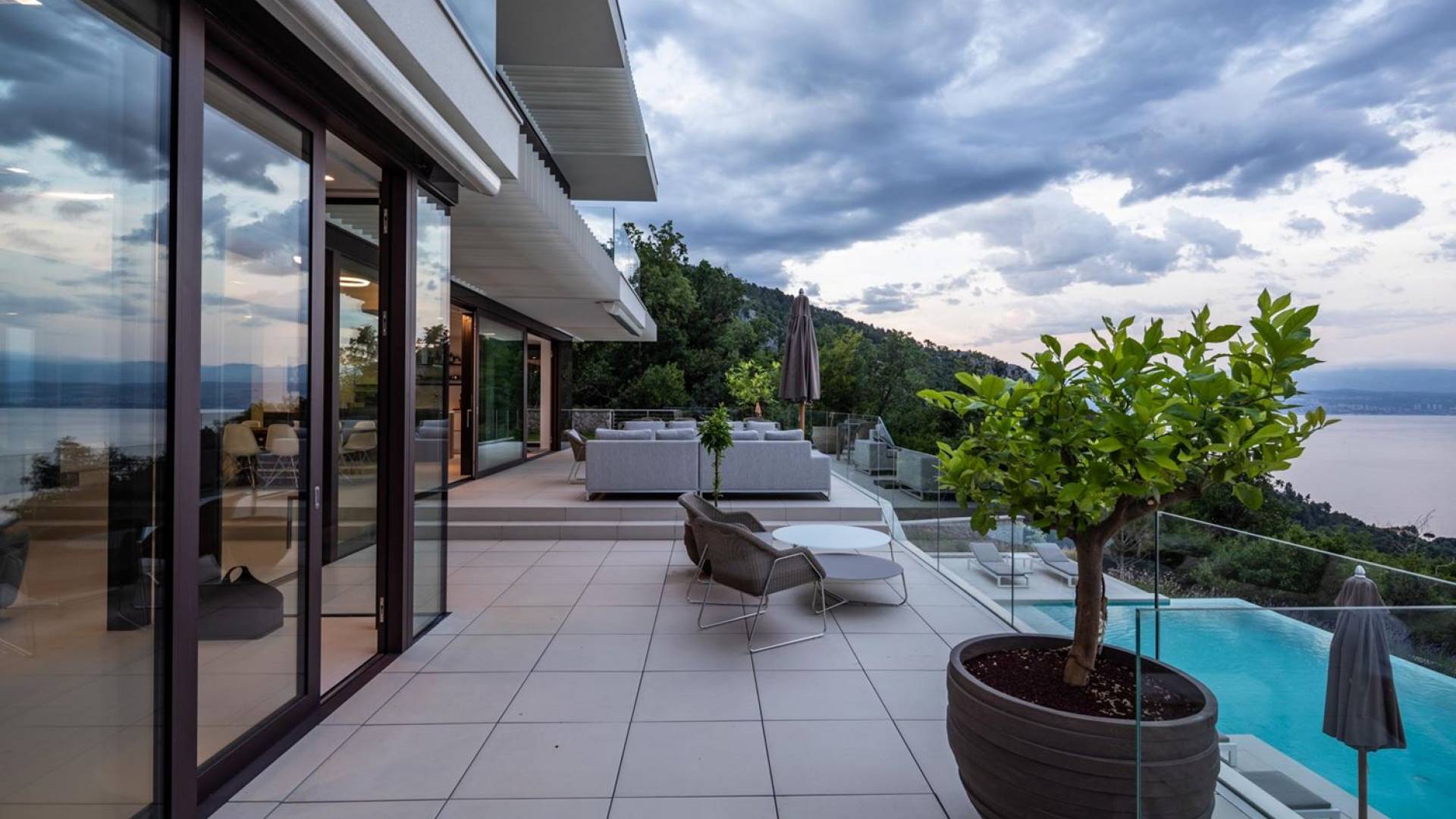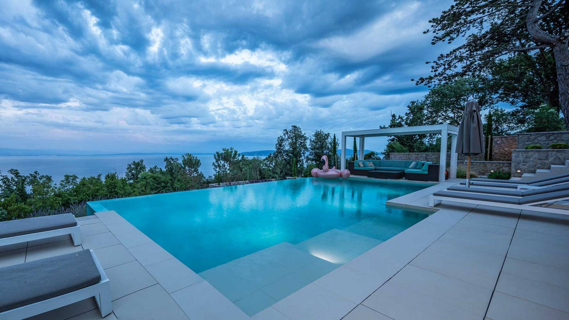 This newly built villa is a wonderful example of modern and innovative architecture; is spacious and airy, and high ceilings and glass walls give the feeling of freedom and open the view of the Kvarner islands from which you are breathtaking. Opposites, ie the islands and the Adriatic Sea on one side and the surrounding hills on the other make the Kvarner unique. And the beauty of this landscape is reflected in this villa because its unique location, architecture, and landscaping design are in complete harmony with the environment. Amidst a beautiful natural landscape, built on an elevated hillside, the villa provides a high degree of privacy and a fantastic view over the sea and the surrounding coastline. The villa with its high-quality furnishings has been integrated perfectly into the Mediterranean hillside landscape and built on multi-level terraces.
