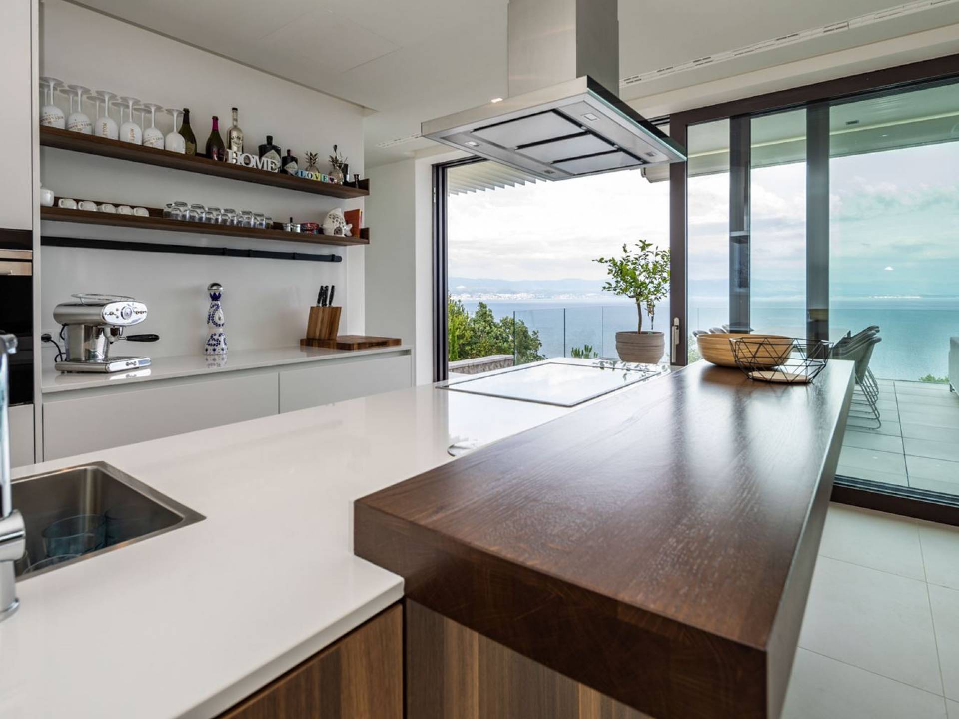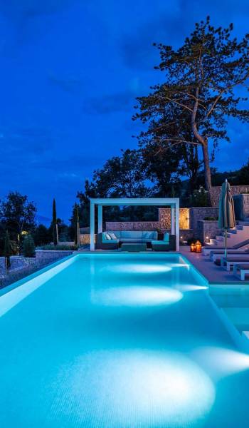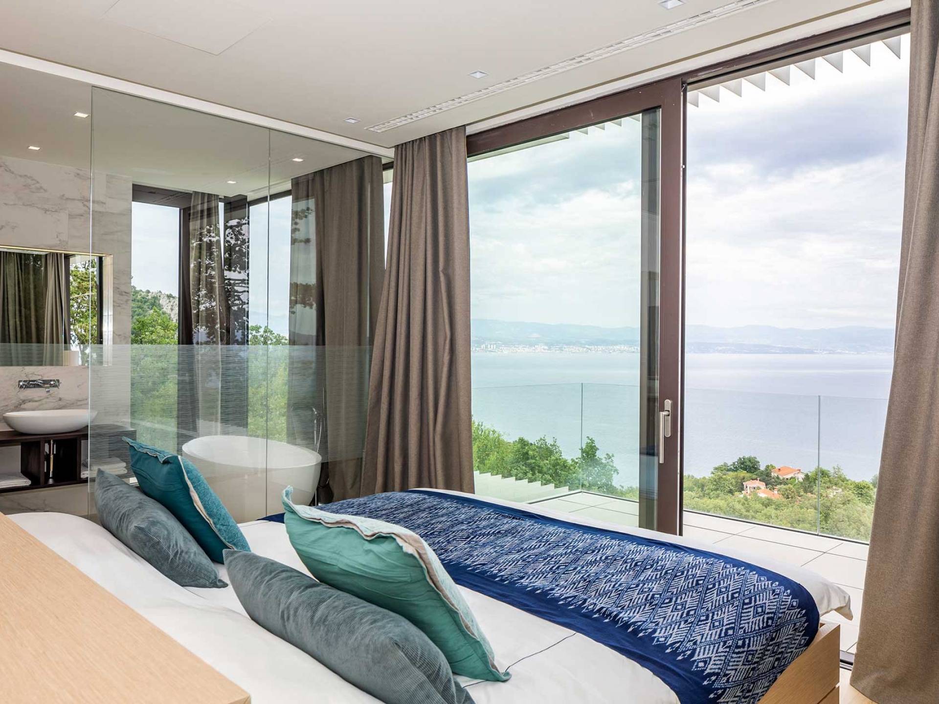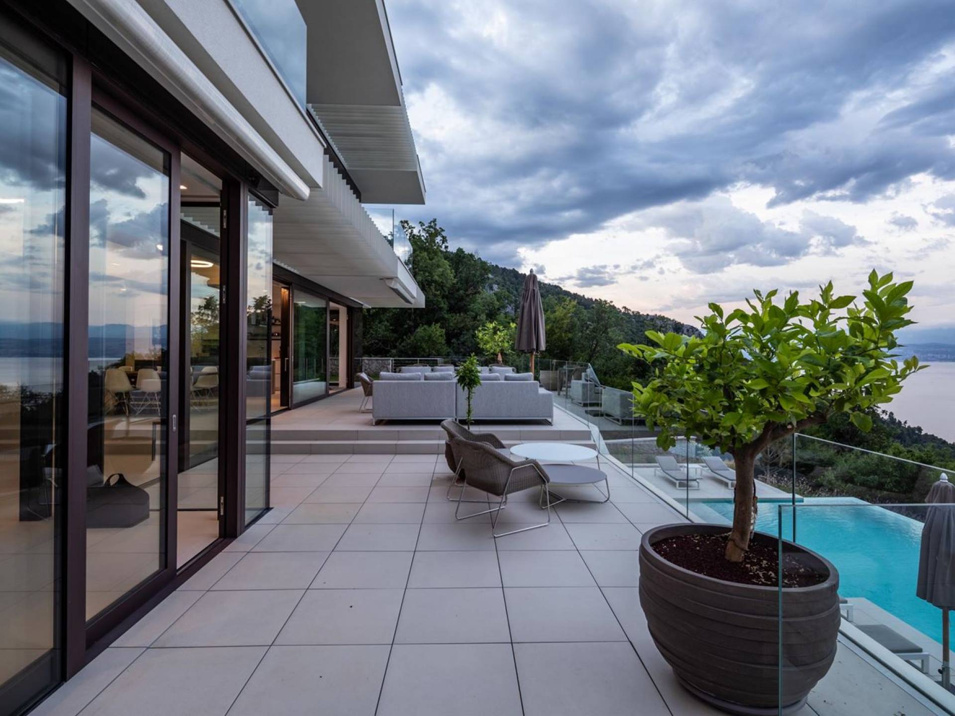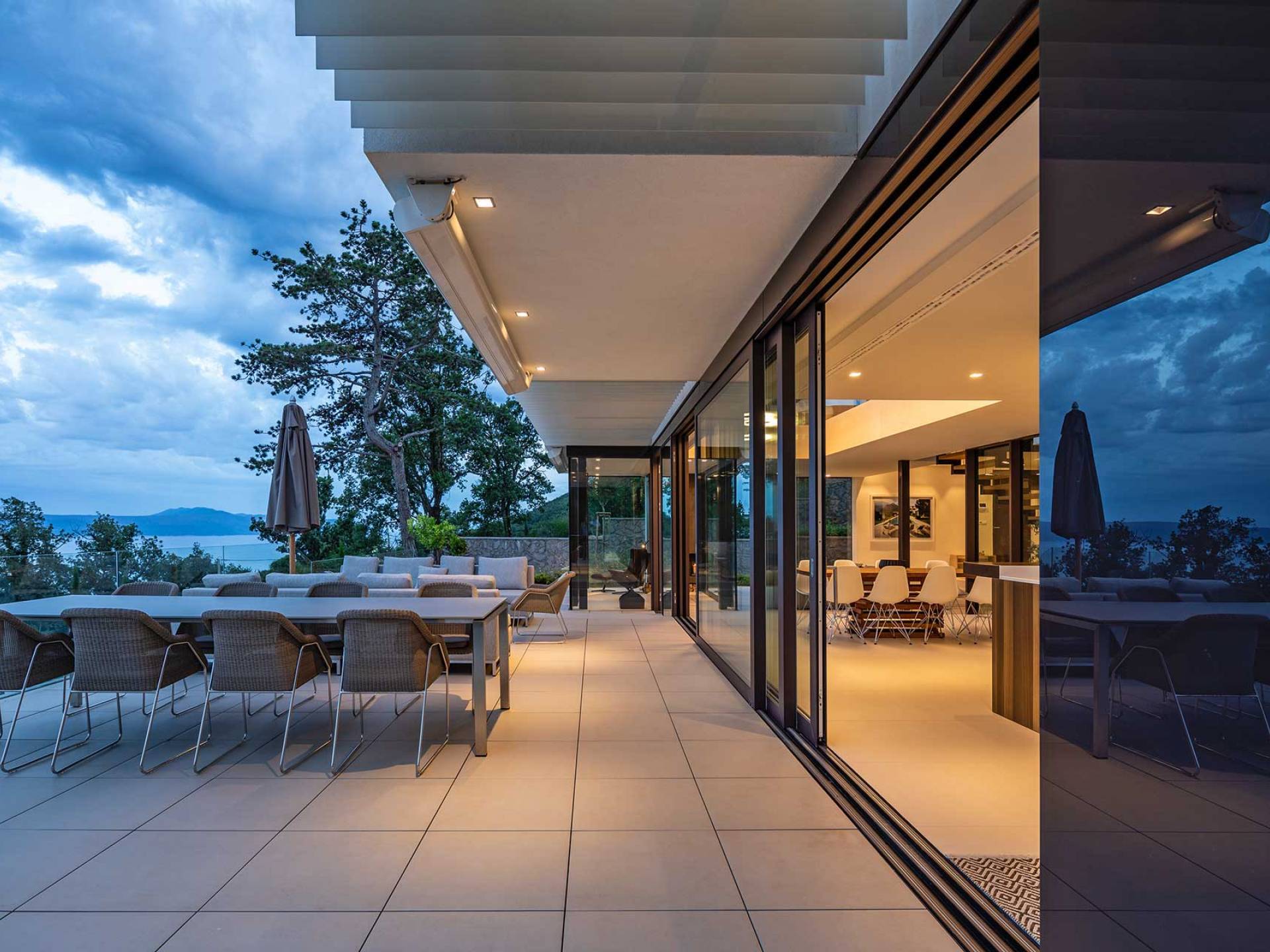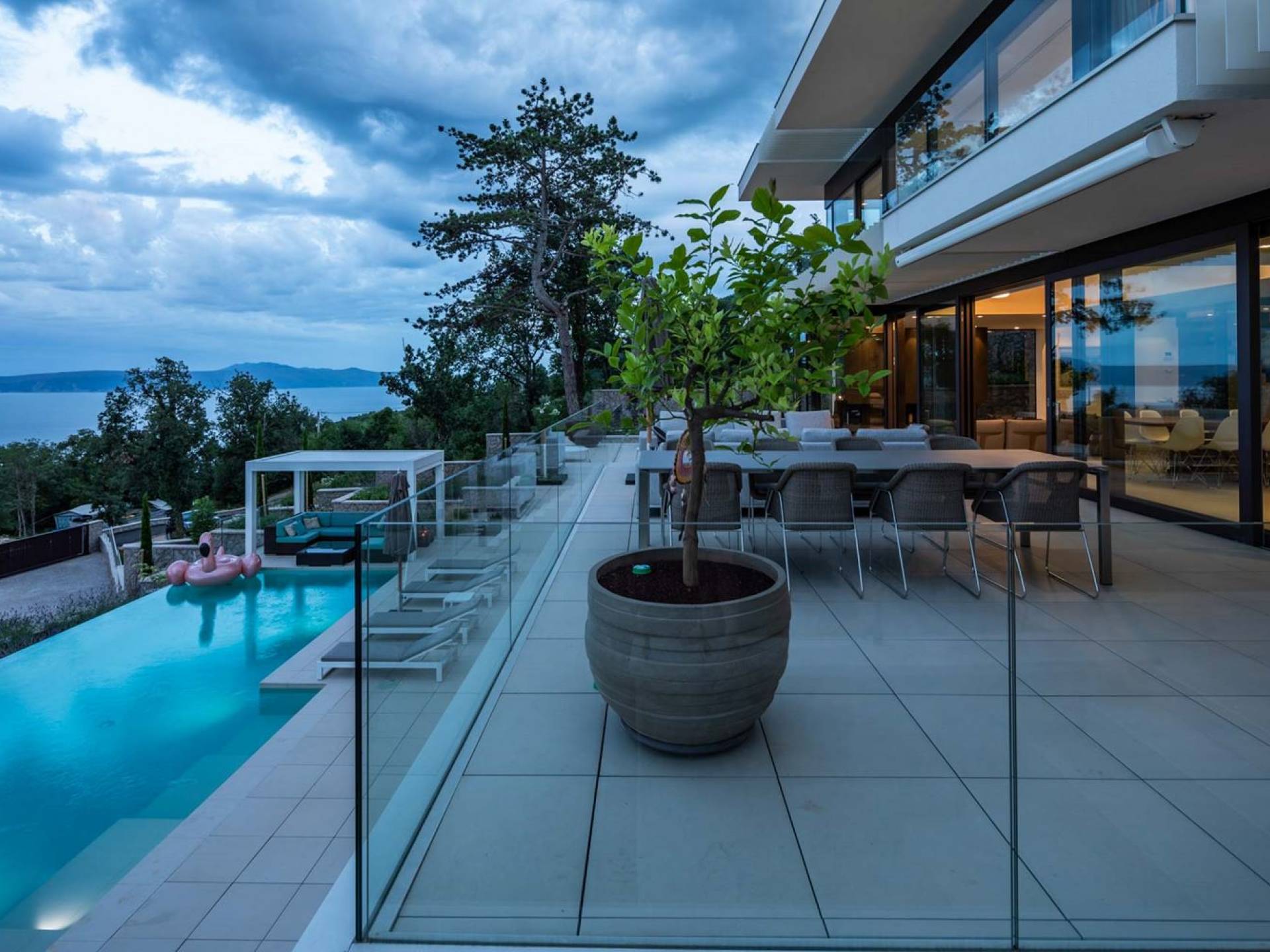 This newly built villa is a wonderful example of modern and innovative architecture; is spacious and airy, and high ceilings and glass walls give the feeling of freedom and open the view of the Kvarner islands from which you are breathtaking. Opposites, ie the islands and the Adriatic Sea on one side and the surrounding hills on the other make the Kvarner unique. And the beauty of this landscape is reflected in this villa because its unique location, architecture, and landscaping design are in complete harmony with the environment. Amidst a beautiful natural landscape, built on an elevated hillside, the villa provides a high degree of privacy and a fantastic view over the sea and the surrounding coastline. The villa with its high-quality furnishings has been integrated perfectly into the Mediterranean hillside landscape and built on multi-level terraces.