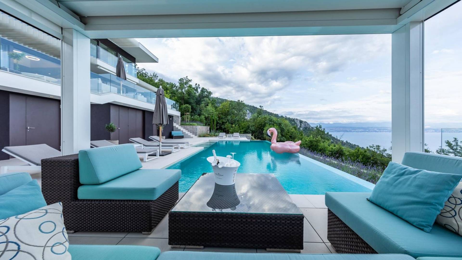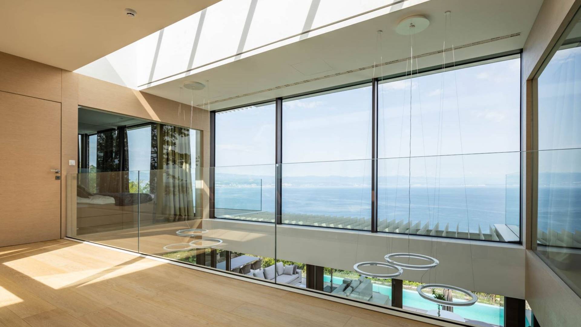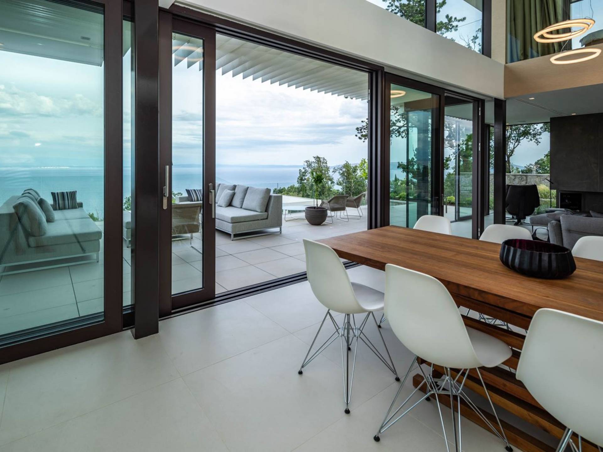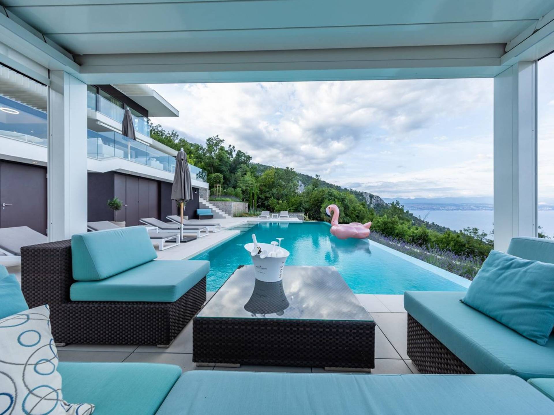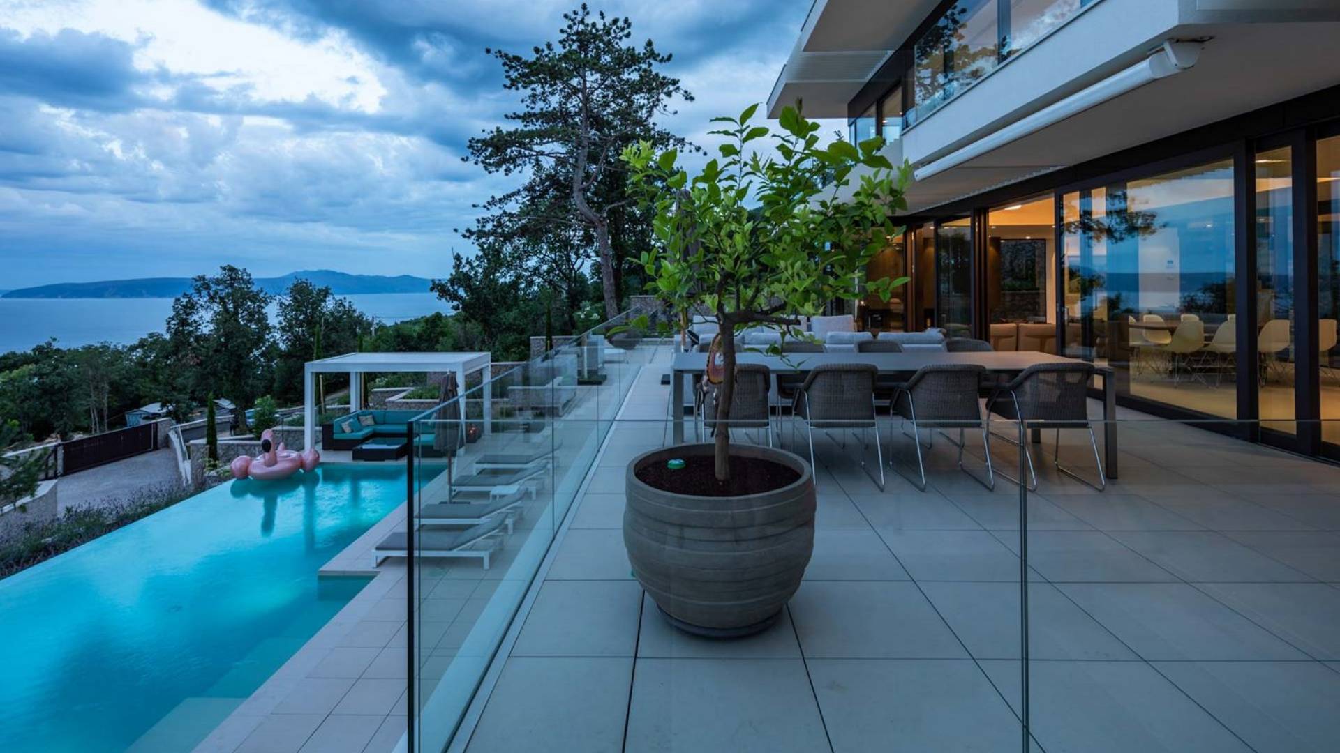 This newly built villa is a wonderful example of modern and innovative architecture; is spacious and airy, and high ceilings and glass walls give the feeling of freedom and open the view of the Kvarner islands from which you are breathtaking. Opposites, ie the islands and the Adriatic Sea on one side and the surrounding hills on the other make the Kvarner unique. And the beauty of this landscape is reflected in this villa because its unique location, architecture, and landscaping design are in complete harmony with the environment. Amidst a beautiful natural landscape, built on an elevated hillside, the villa provides a high degree of privacy and a fantastic view over the sea and the surrounding coastline. The villa with its high-quality furnishings has been integrated perfectly into the Mediterranean hillside landscape and built on multi-level terraces.