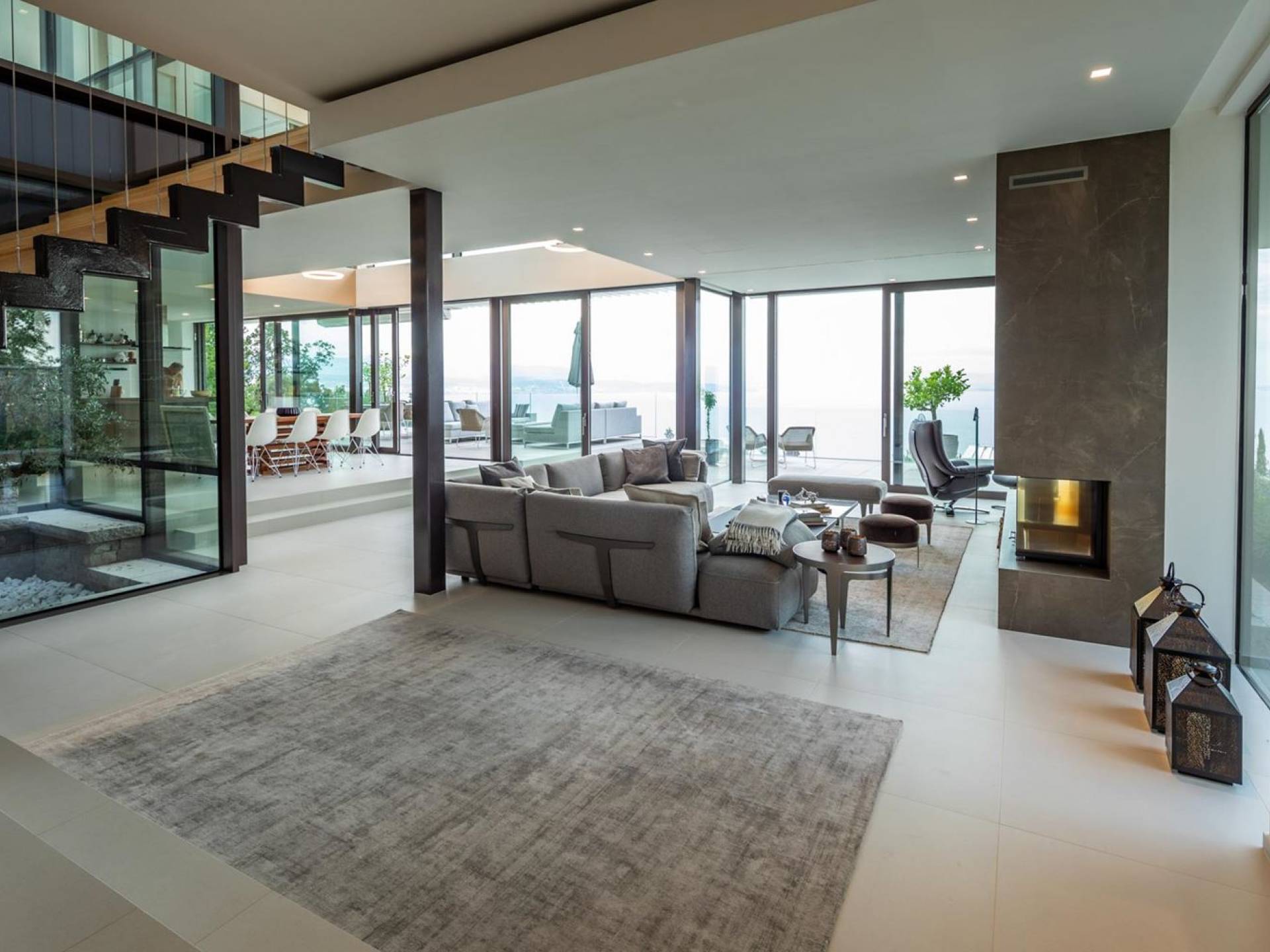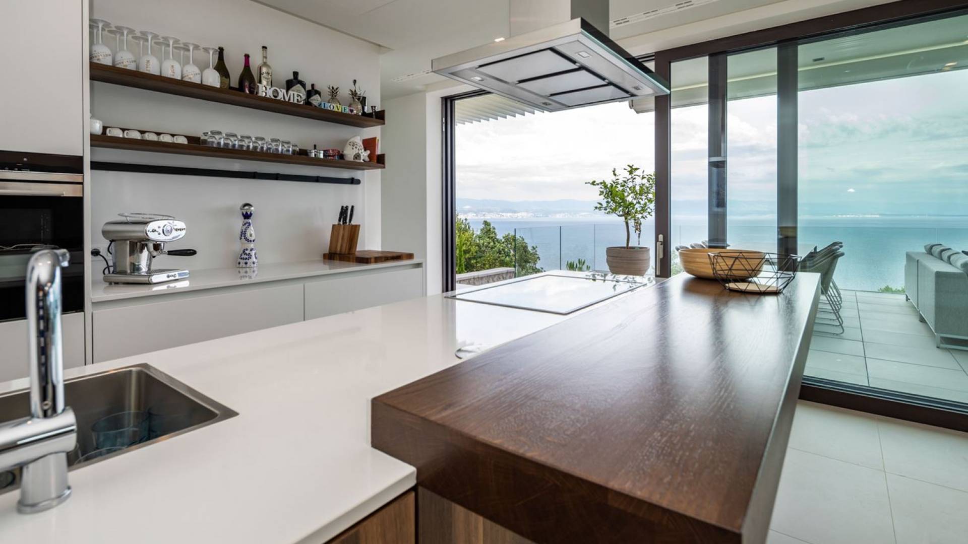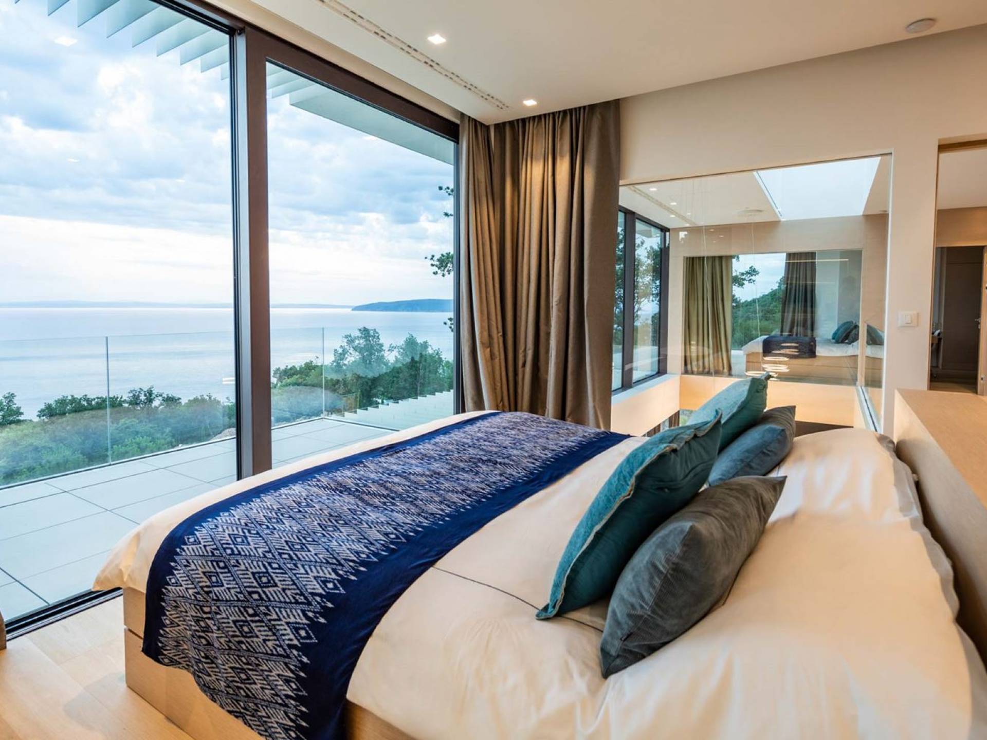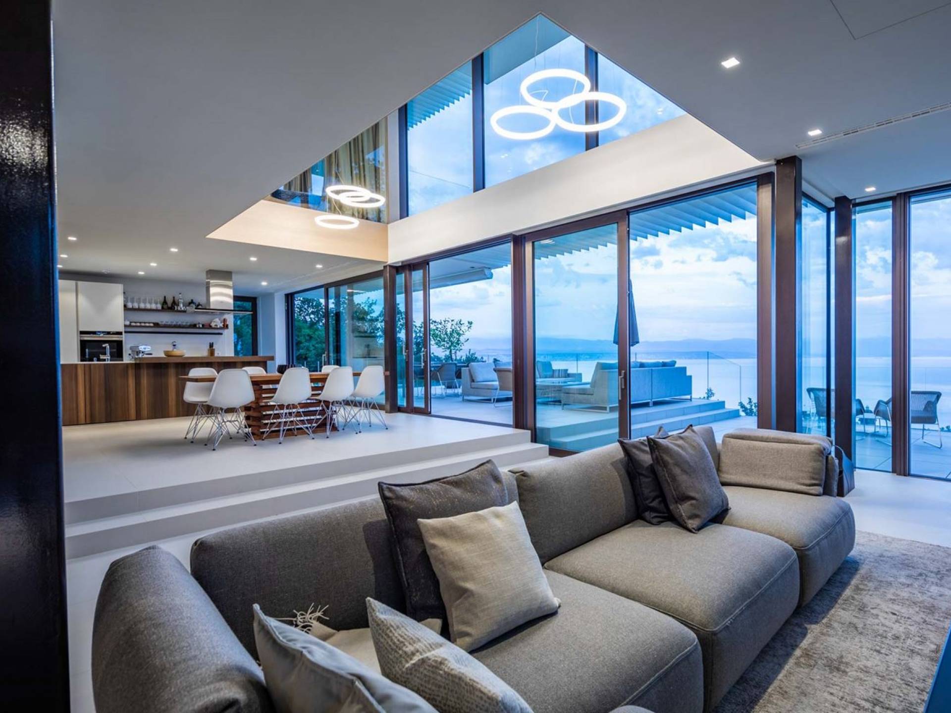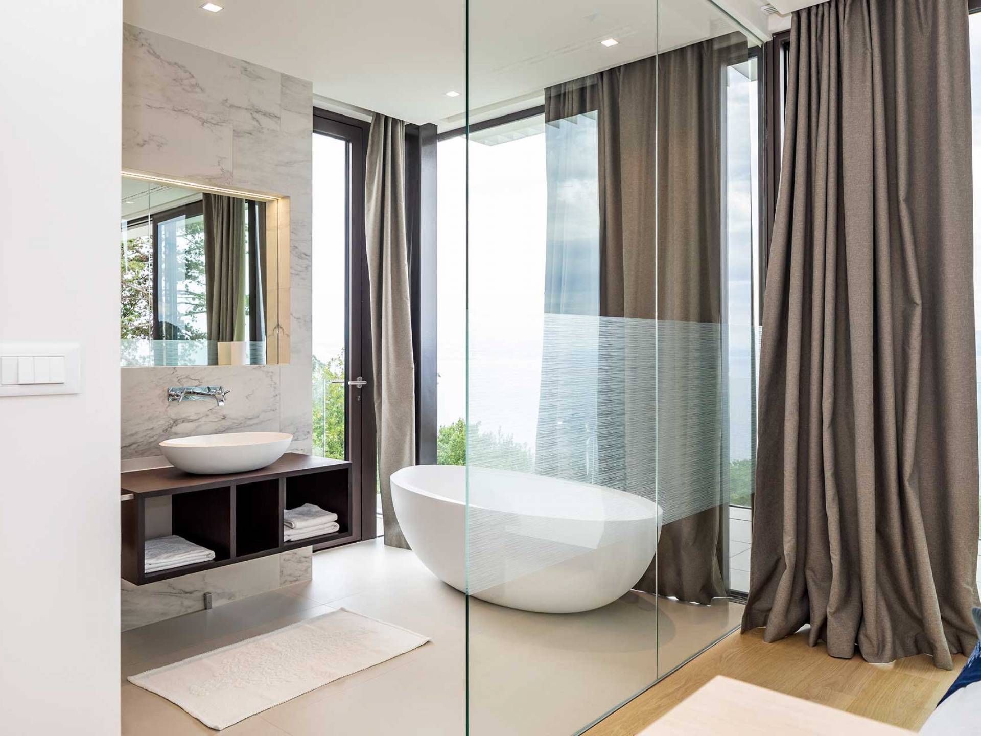 This newly built villa is a wonderful example of modern and innovative architecture; is spacious and airy, and high ceilings and glass walls give the feeling of freedom and open the view of the Kvarner islands from which you are breathtaking. Opposites, ie the islands and the Adriatic Sea on one side and the surrounding hills on the other make the Kvarner unique. And the beauty of this landscape is reflected in this villa because its unique location, architecture, and landscaping design are in complete harmony with the environment. Amidst a beautiful natural landscape, built on an elevated hillside, the villa provides a high degree of privacy and a fantastic view over the sea and the surrounding coastline. The villa with its high-quality furnishings has been integrated perfectly into the Mediterranean hillside landscape and built on multi-level terraces.