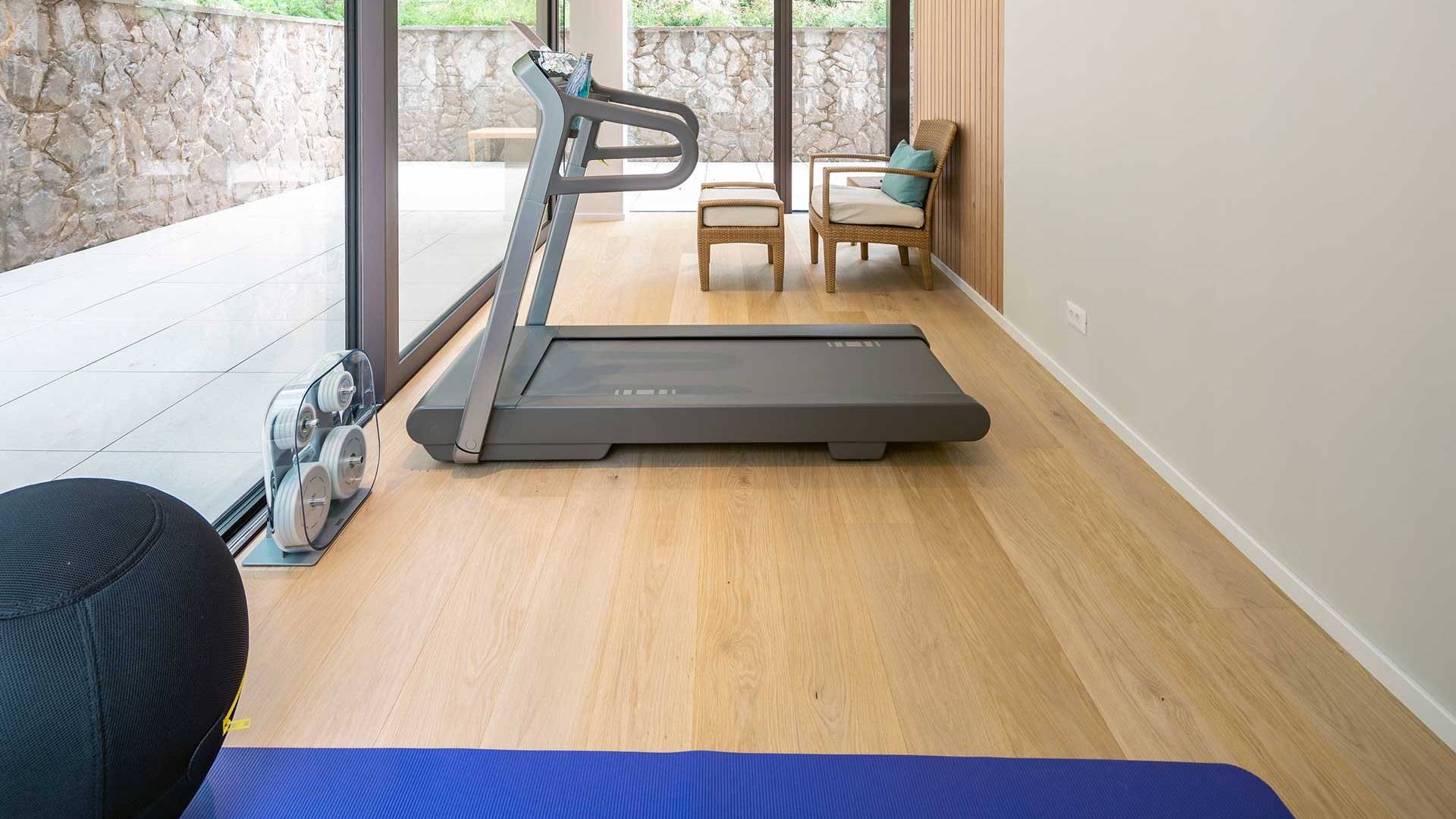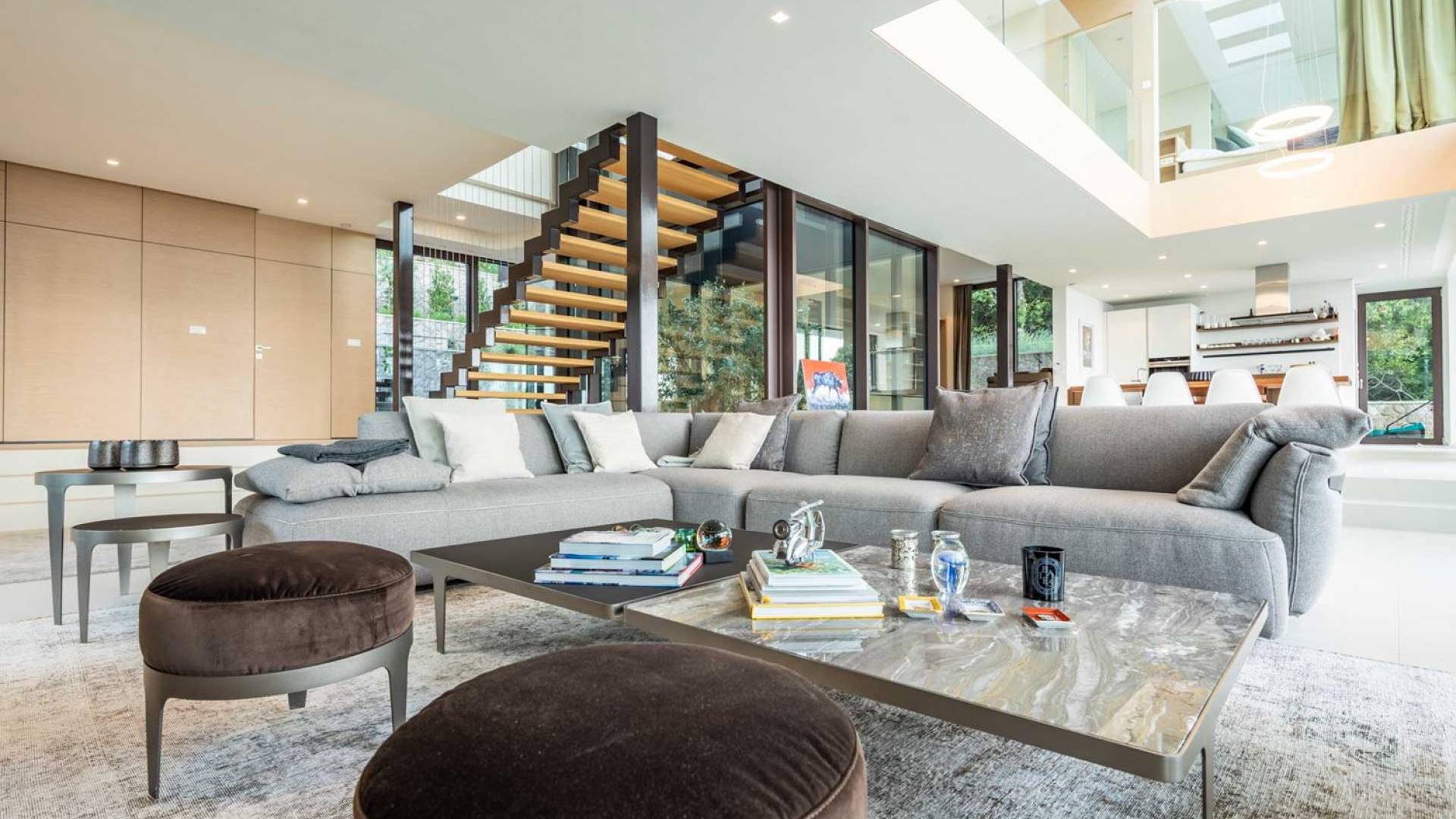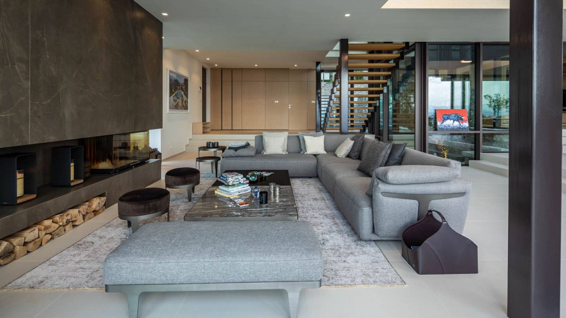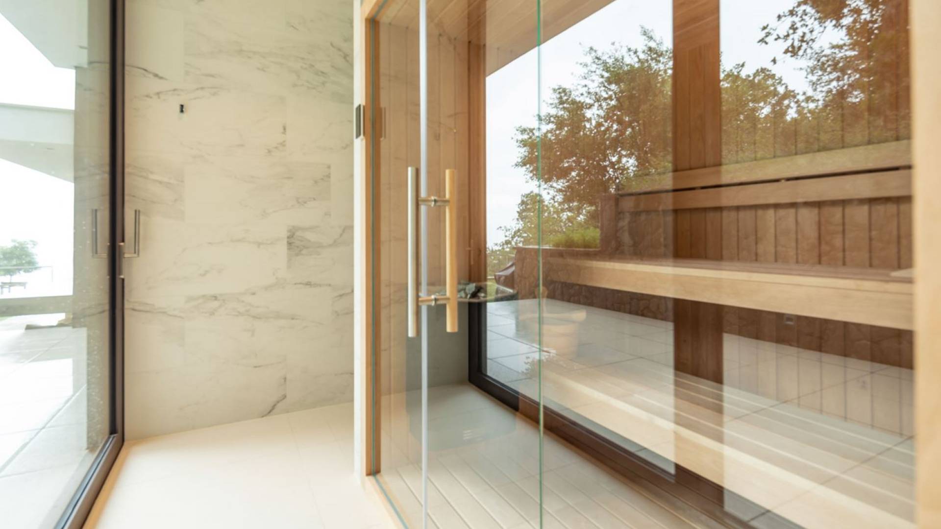 As you enter through the main doors on the ground level, you will find an entrance area with a wardrobe, a central living area with a large comfortable sofa, an open fireplace, a dining area, the library, and a TV room. The modern, fully equipped kitchen, with all appliances, has a breakfast bar for 2 for a quiet breakfast or lunch. On this level, there is also a bathroom for guests, relax and wellness zone with a gym, sauna, and shower, as well as a bedroom with an en-suite bathroom.