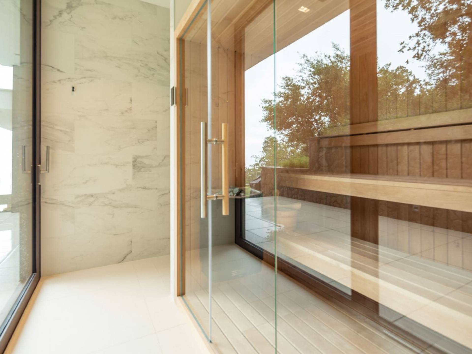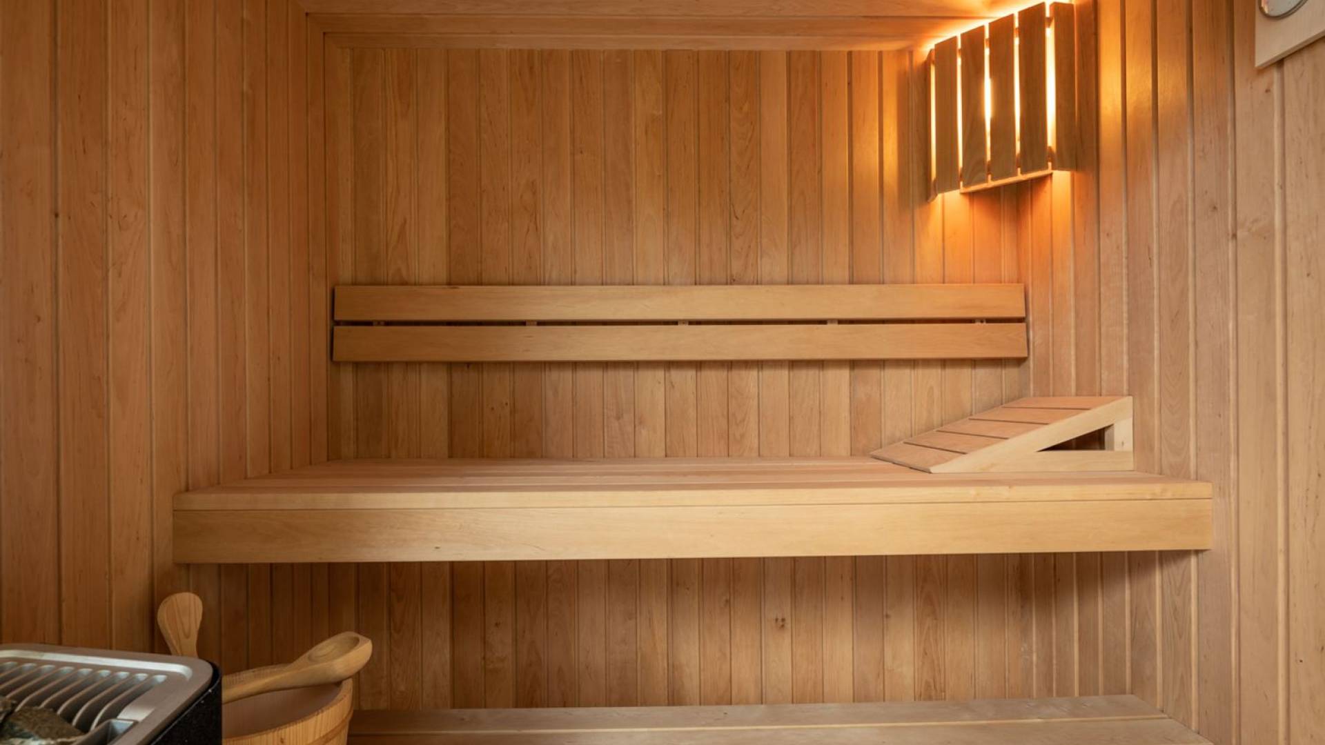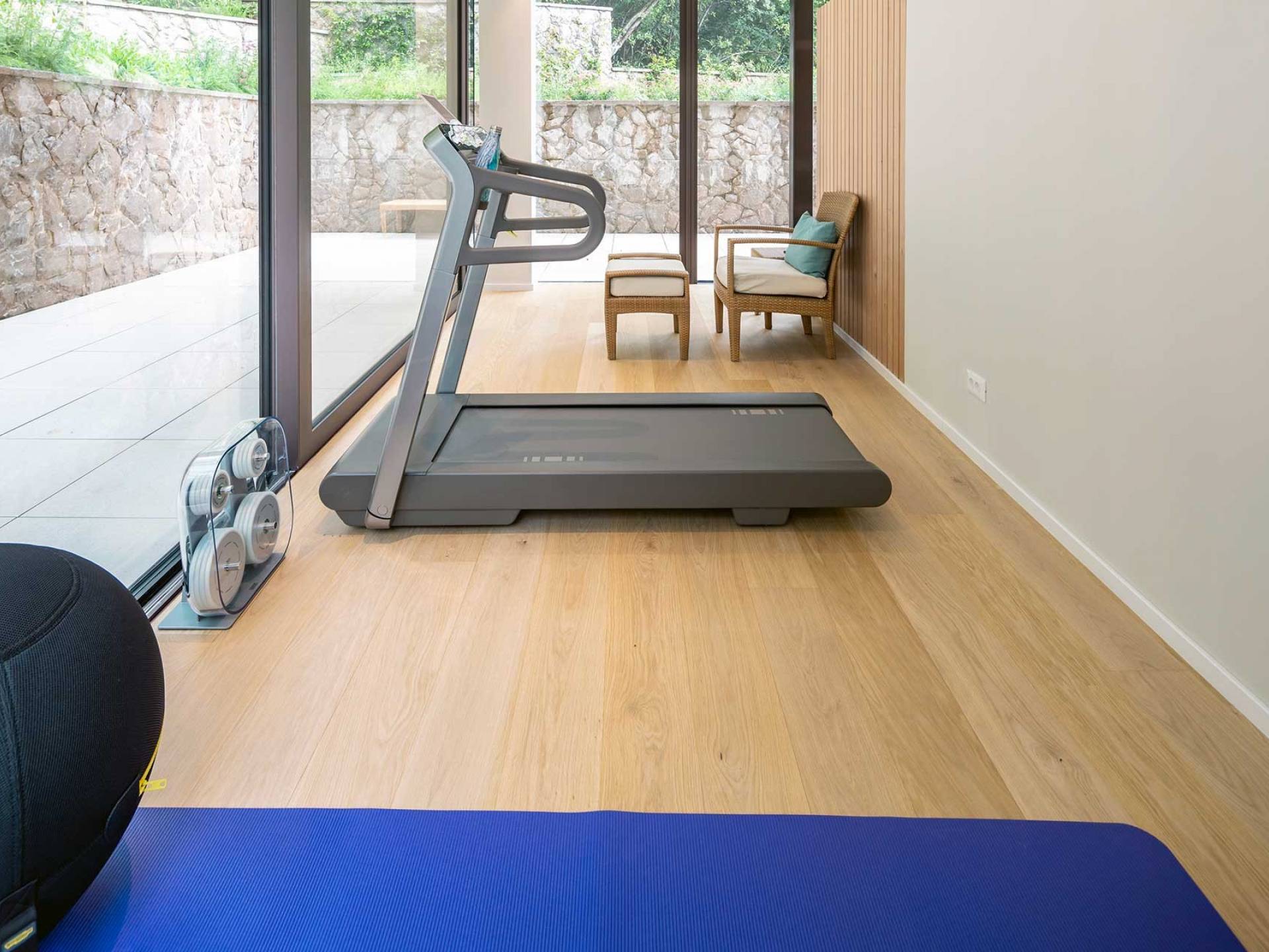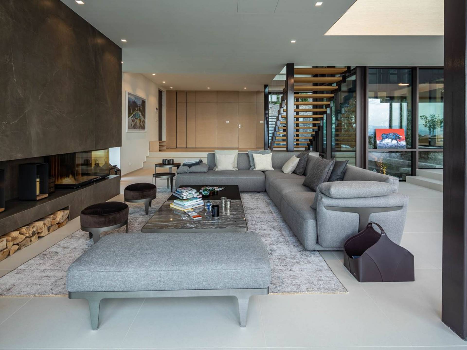 As you enter through the main doors on the ground level, you will find an entrance area with a wardrobe, a central living area with a large comfortable sofa, an open fireplace, a dining area, the library, and a TV room. The modern, fully equipped kitchen, with all appliances, has a breakfast bar for 2 for a quiet breakfast or lunch. On this level, there is also a bathroom for guests, relax and wellness zone with a gym, sauna, and shower, as well as a bedroom with an en-suite bathroom.