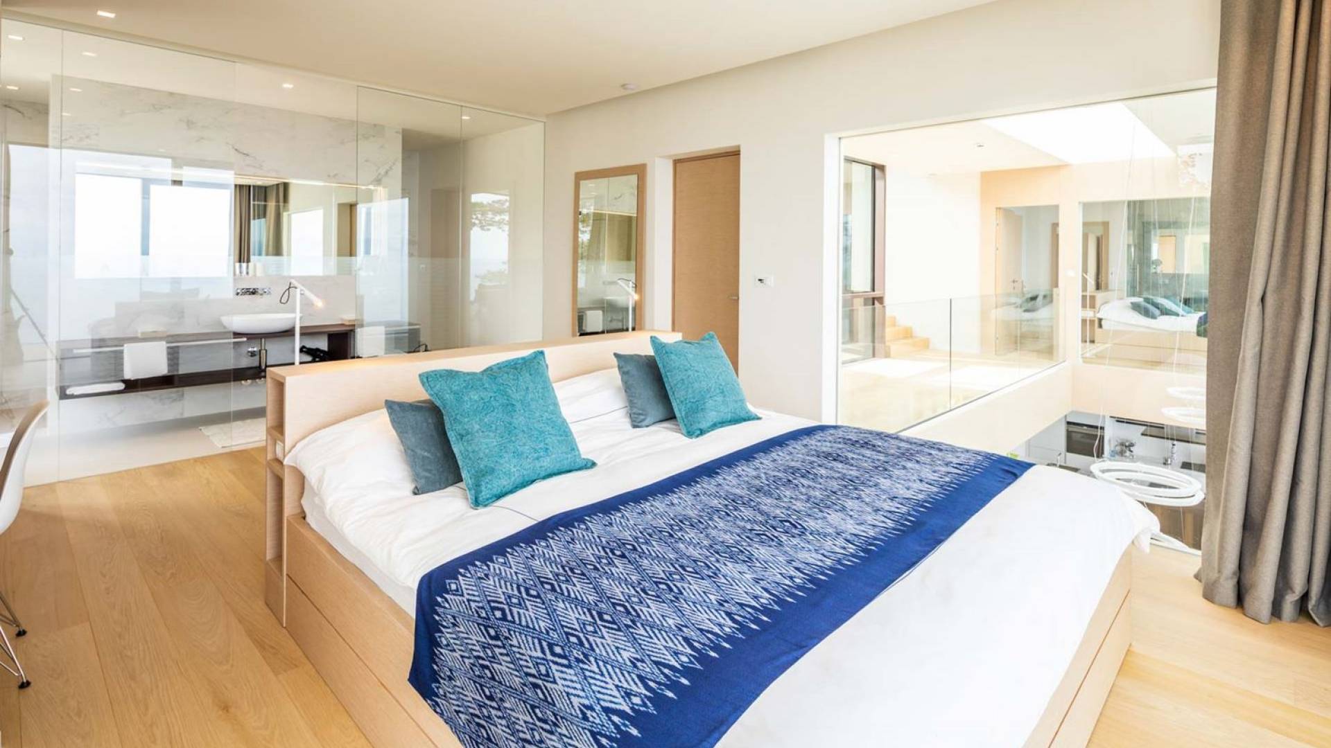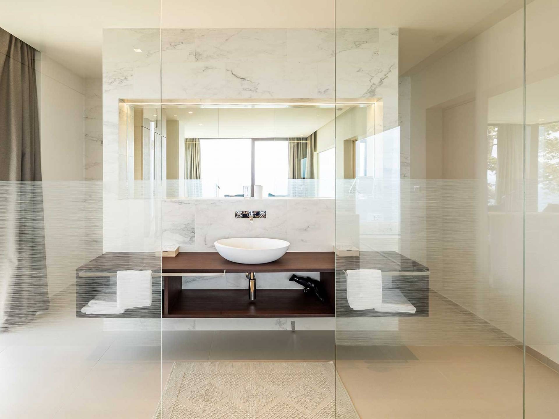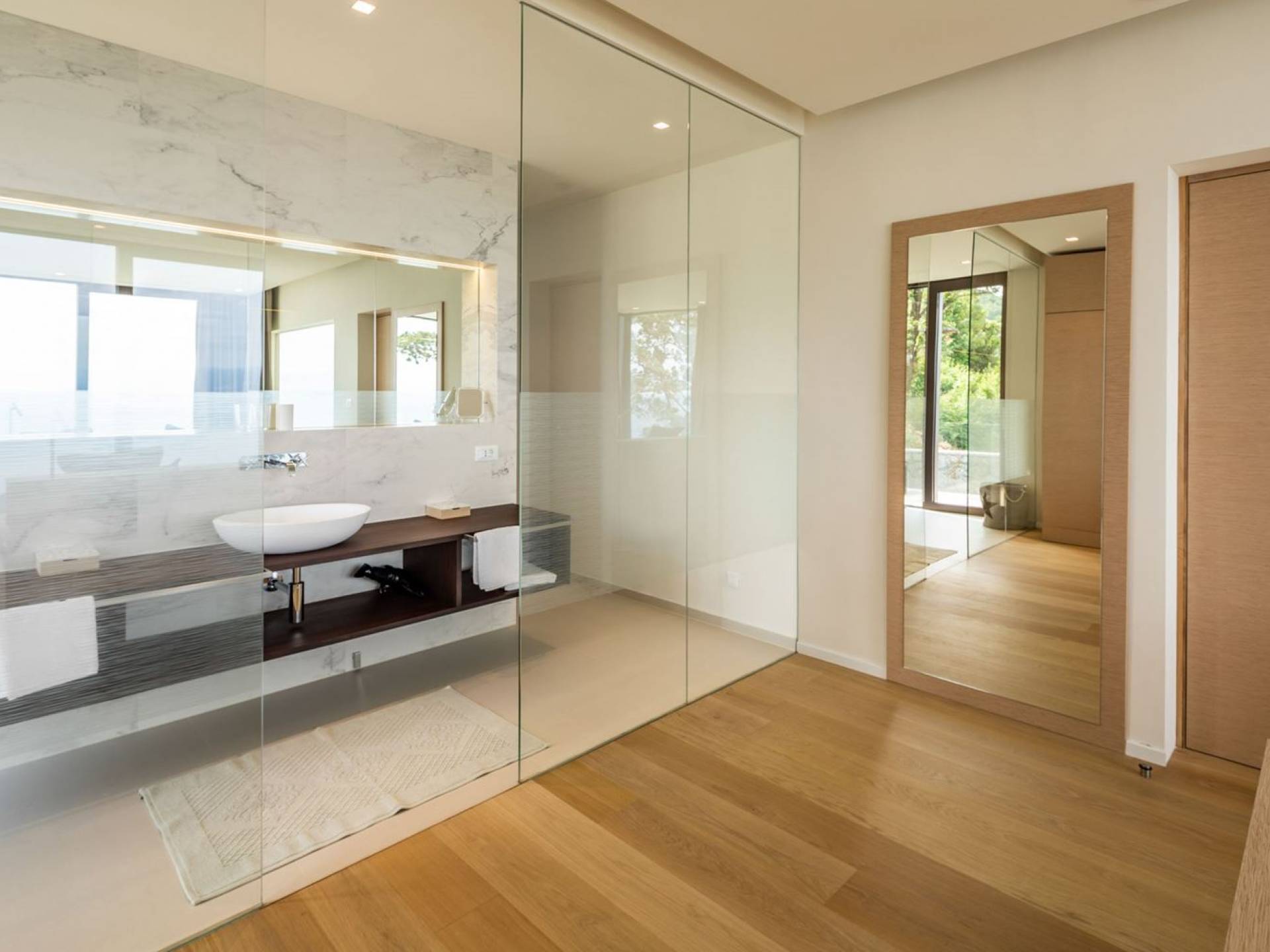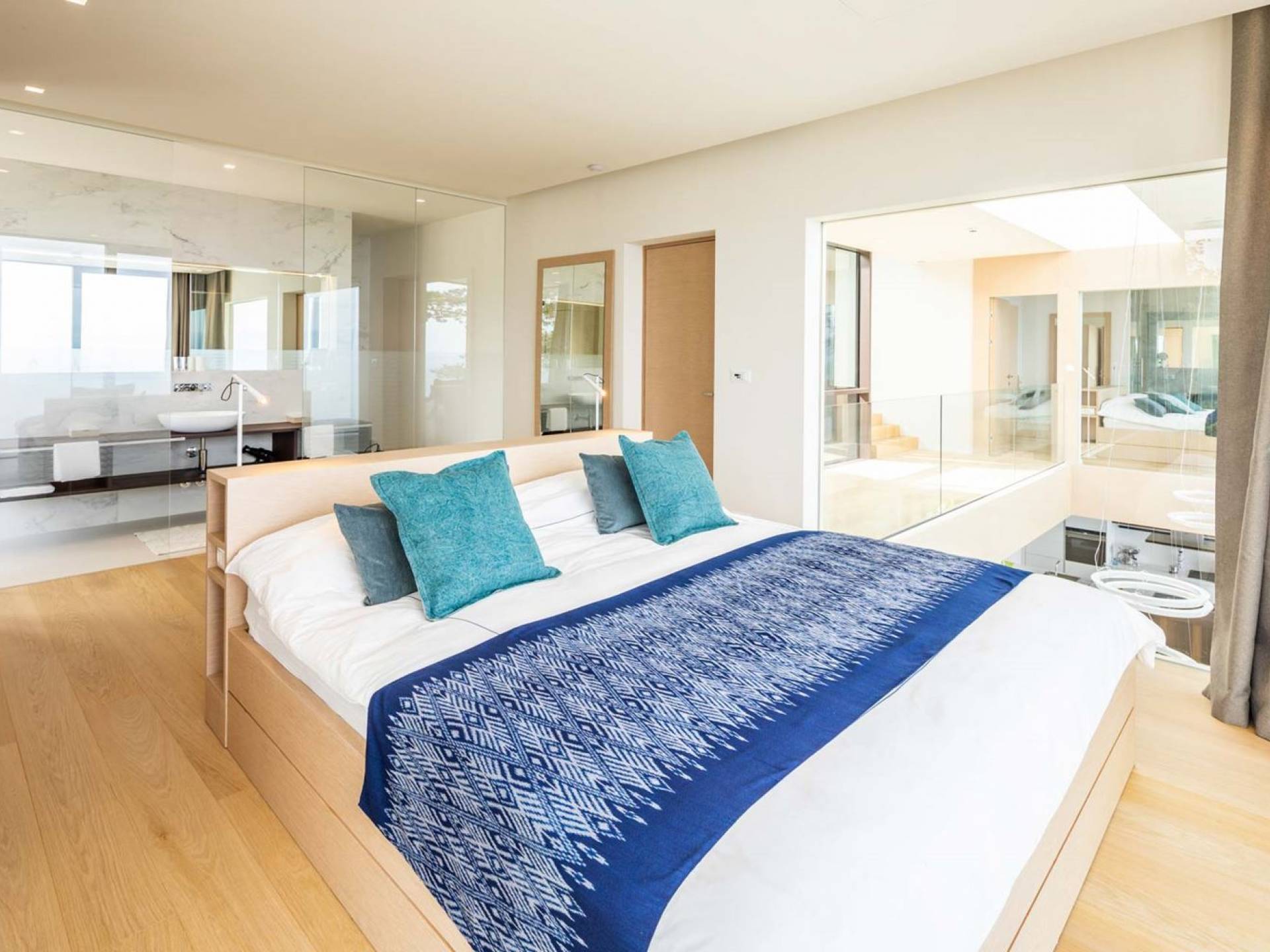 The stairs around the atrium lead up to the first floor with 4 air-conditioned bedrooms with en-suite bathrooms. The rooms offer a stunning view directly of the sea or the surrounding green landscape. All rooms have access to a balcony. If you wish to feel at ease in a fresh and natural environment and escape into a private retreat with a loved one, Villa Aura is just the right choice for you.
