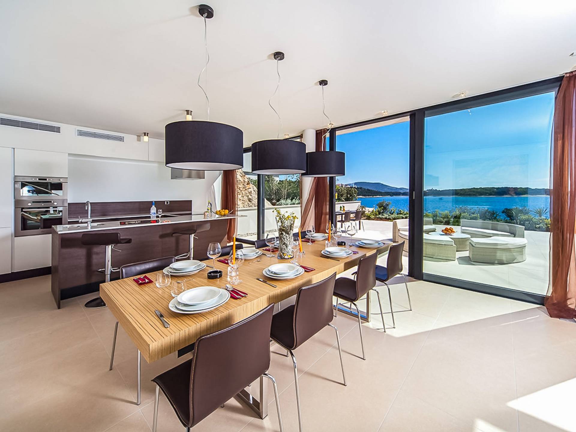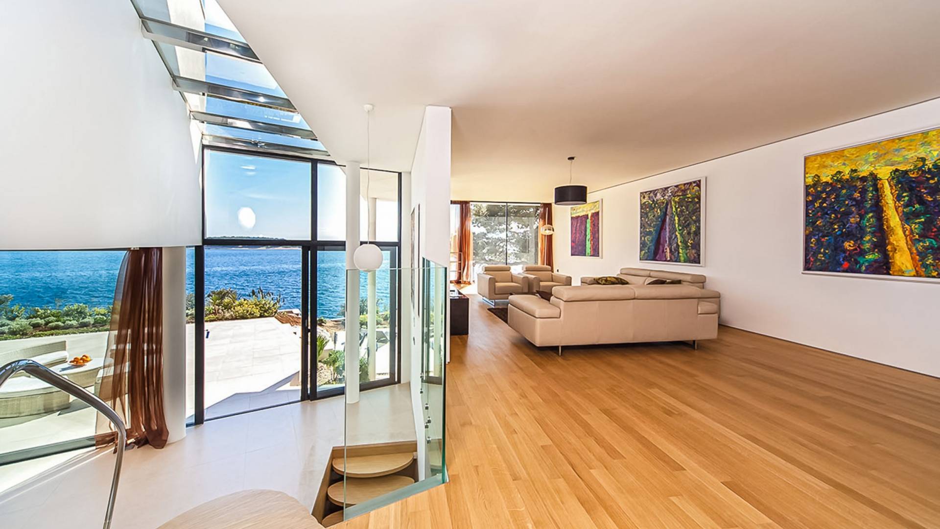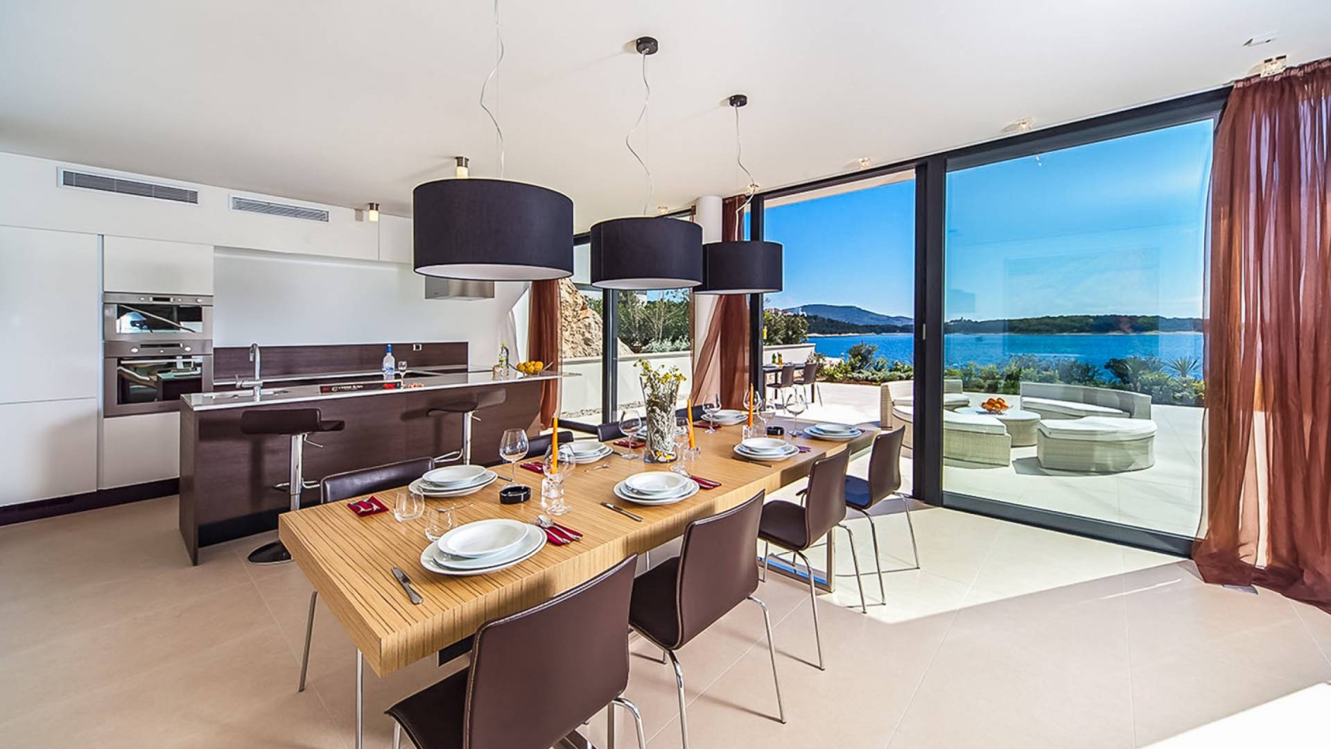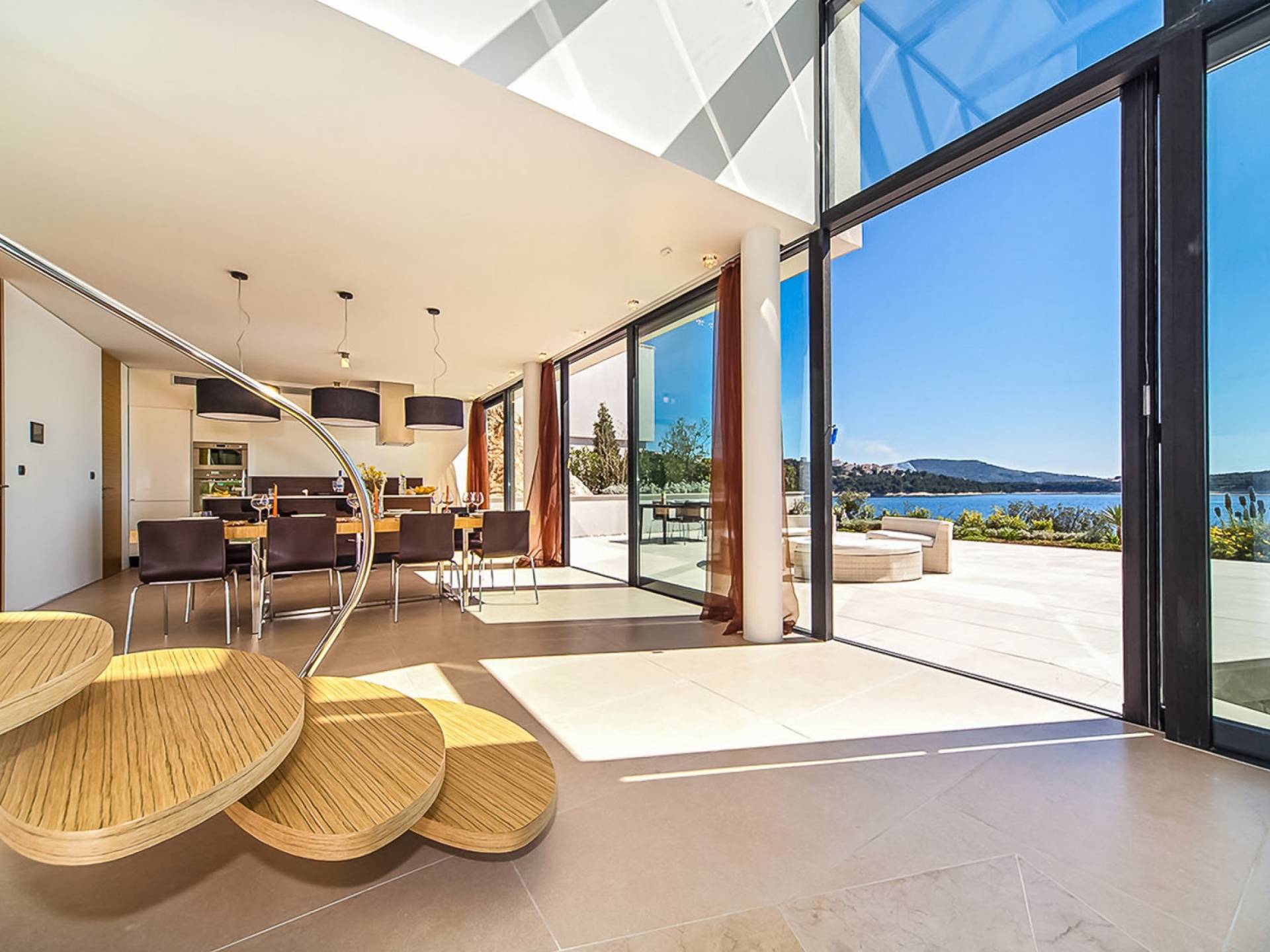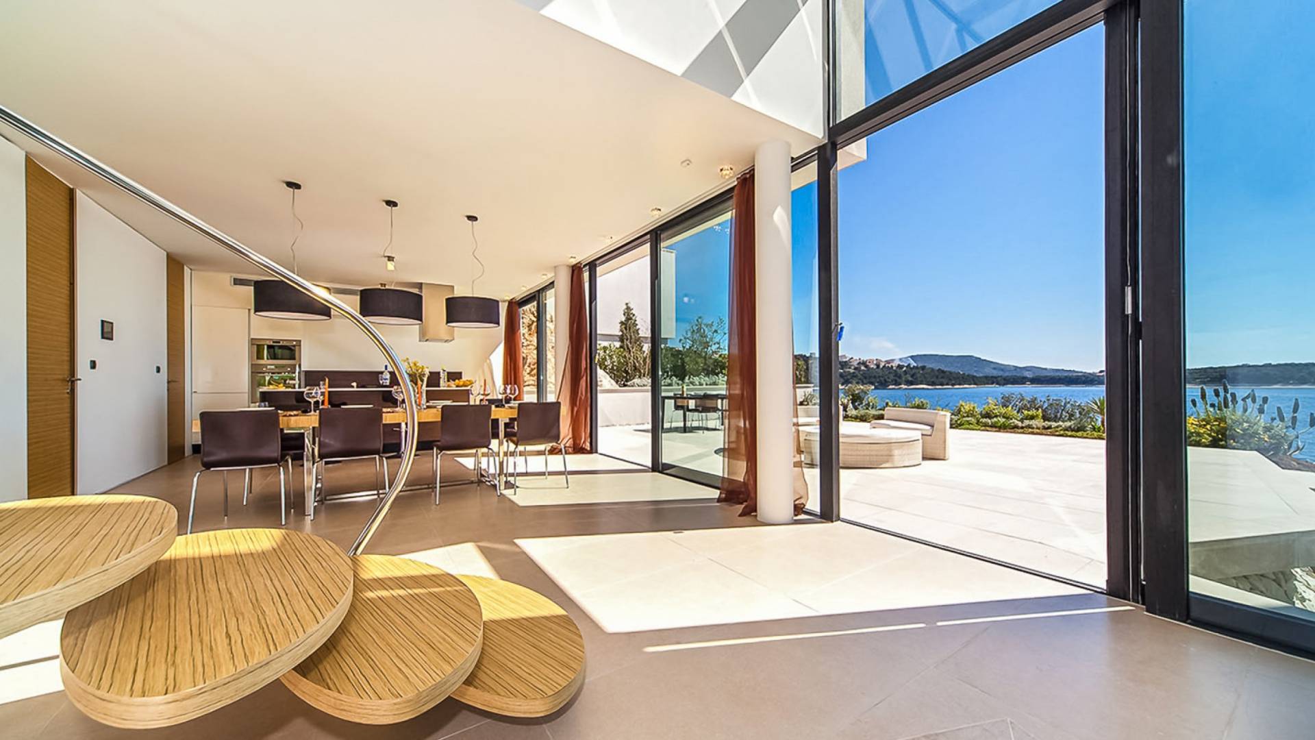 Designed over three levels, the interior is a stunning space in which to unwind. The wonderful sea views are brought indoors thanks to the floor-to-ceiling glass wall, and the space has a light, airy feel. The living areas are open-plan, with top-quality fittings and furnishings from the sofas, bright modern art, and plasma TV, to the dining area and kitchen