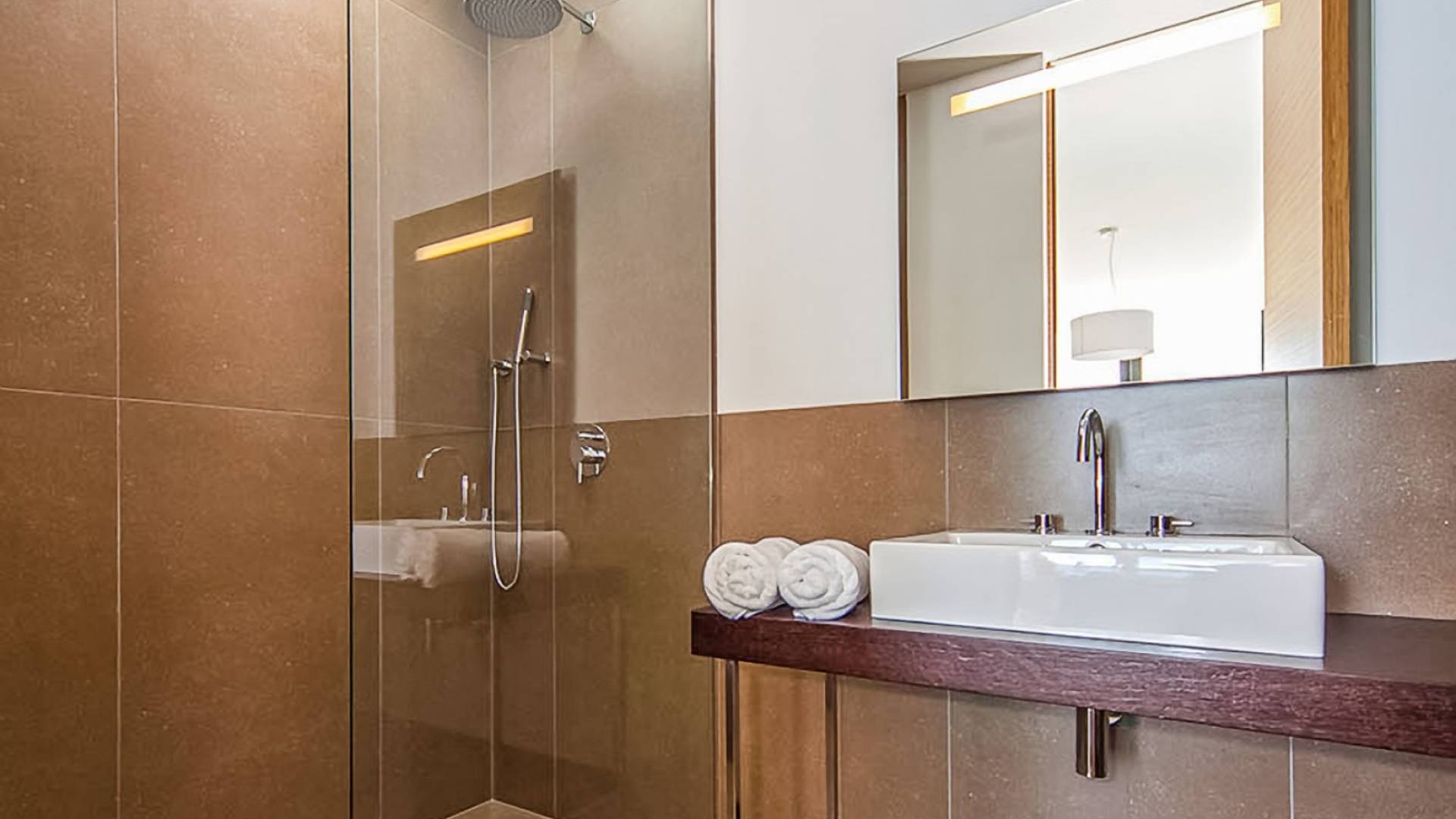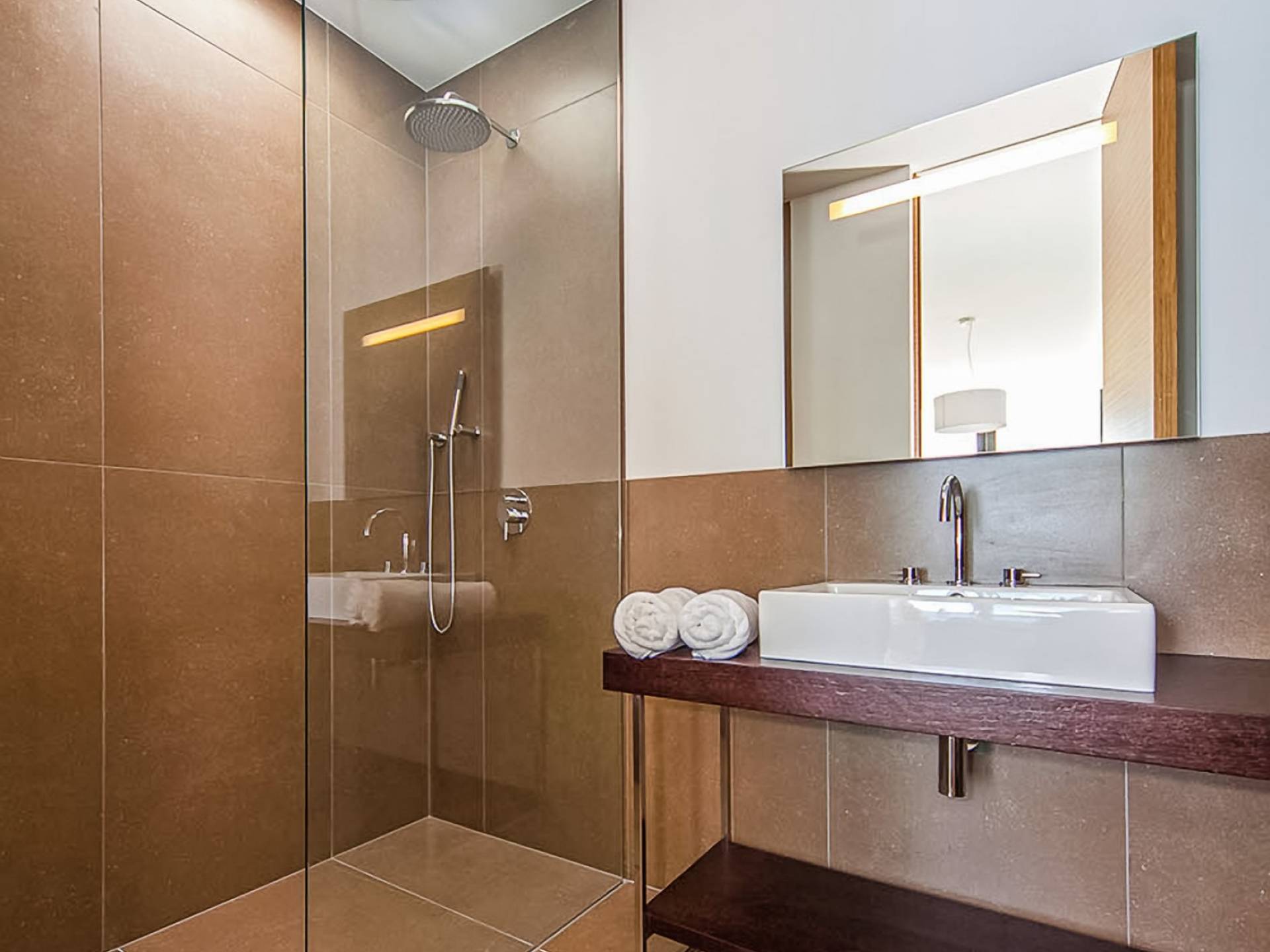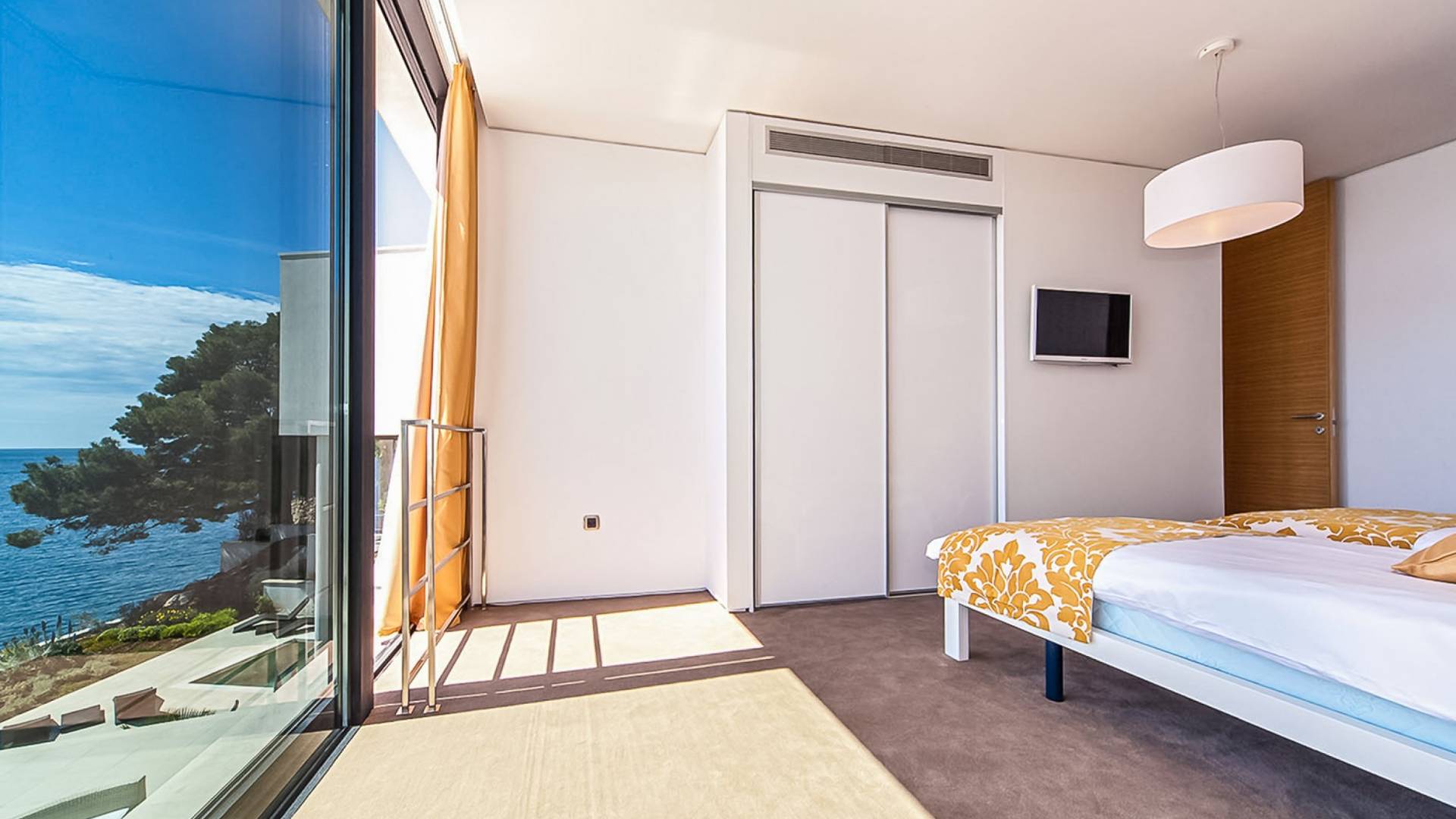 On the upper level of the property, the elegant décor and sea views extend into the three air-conditioned bedrooms, all with private ensuite bathrooms, and one with a balcony. Additional apartment accommodation is available on site for groups traveling with staff or extra overnight guests.