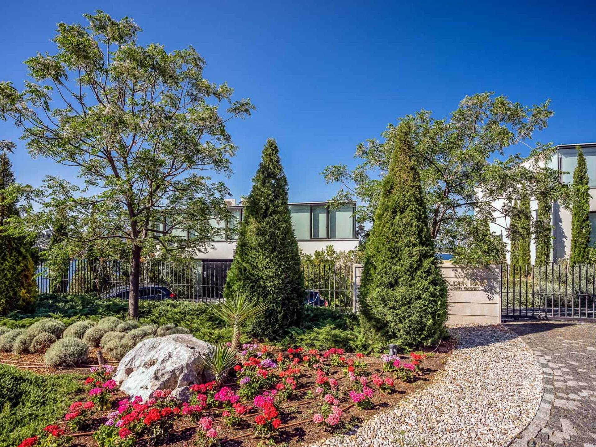 The architects have devoted particular attention to the position of the complex, which at the same time gives exclusivity to each individual unit thereof, however does not separate them from one another, thus affording a unique and unobstructed view from each of them. Green roofs on each of the villas create the impression of a garden for the villa behind it.