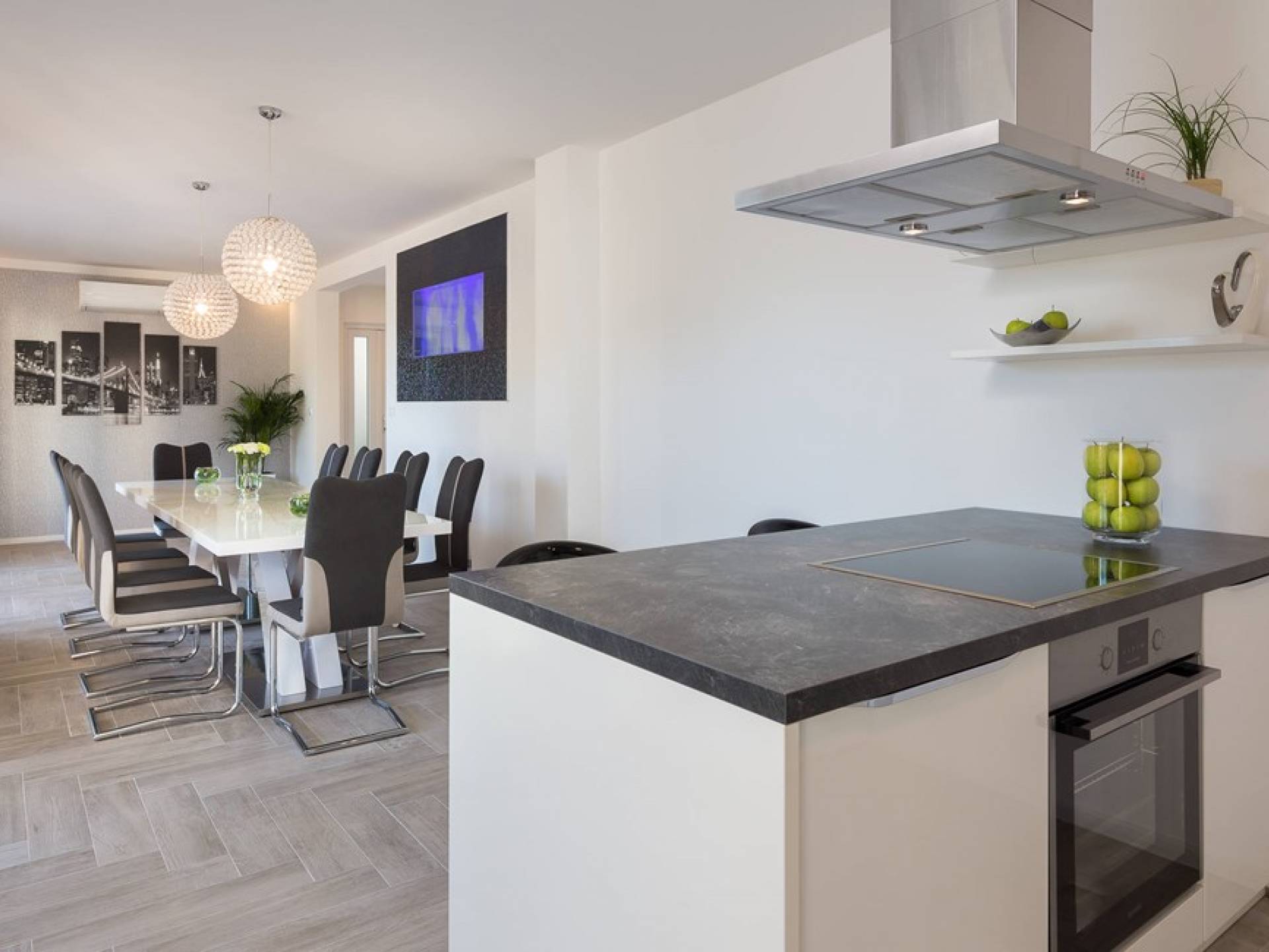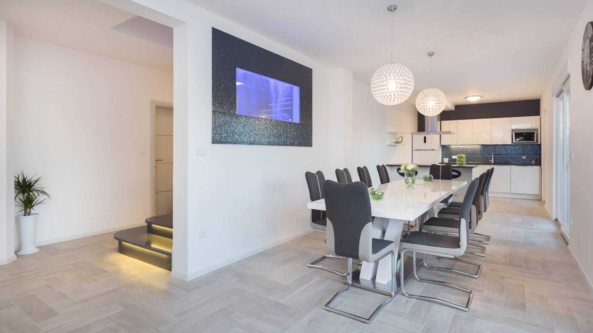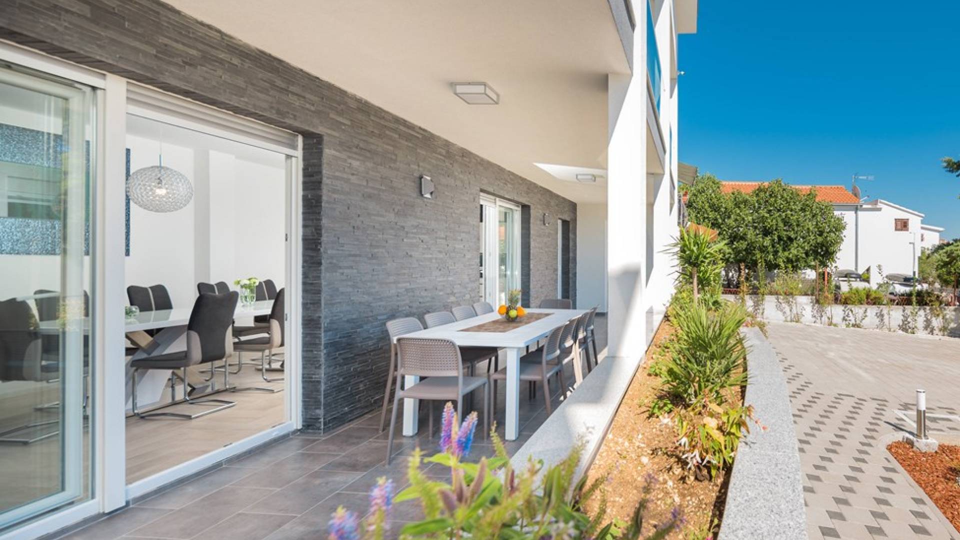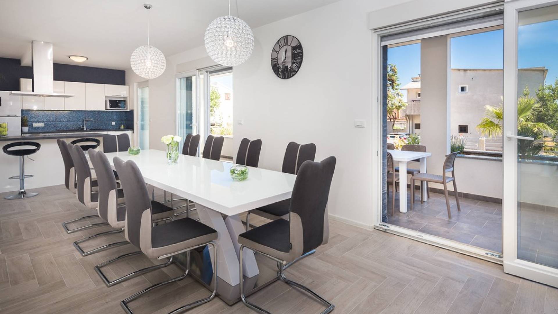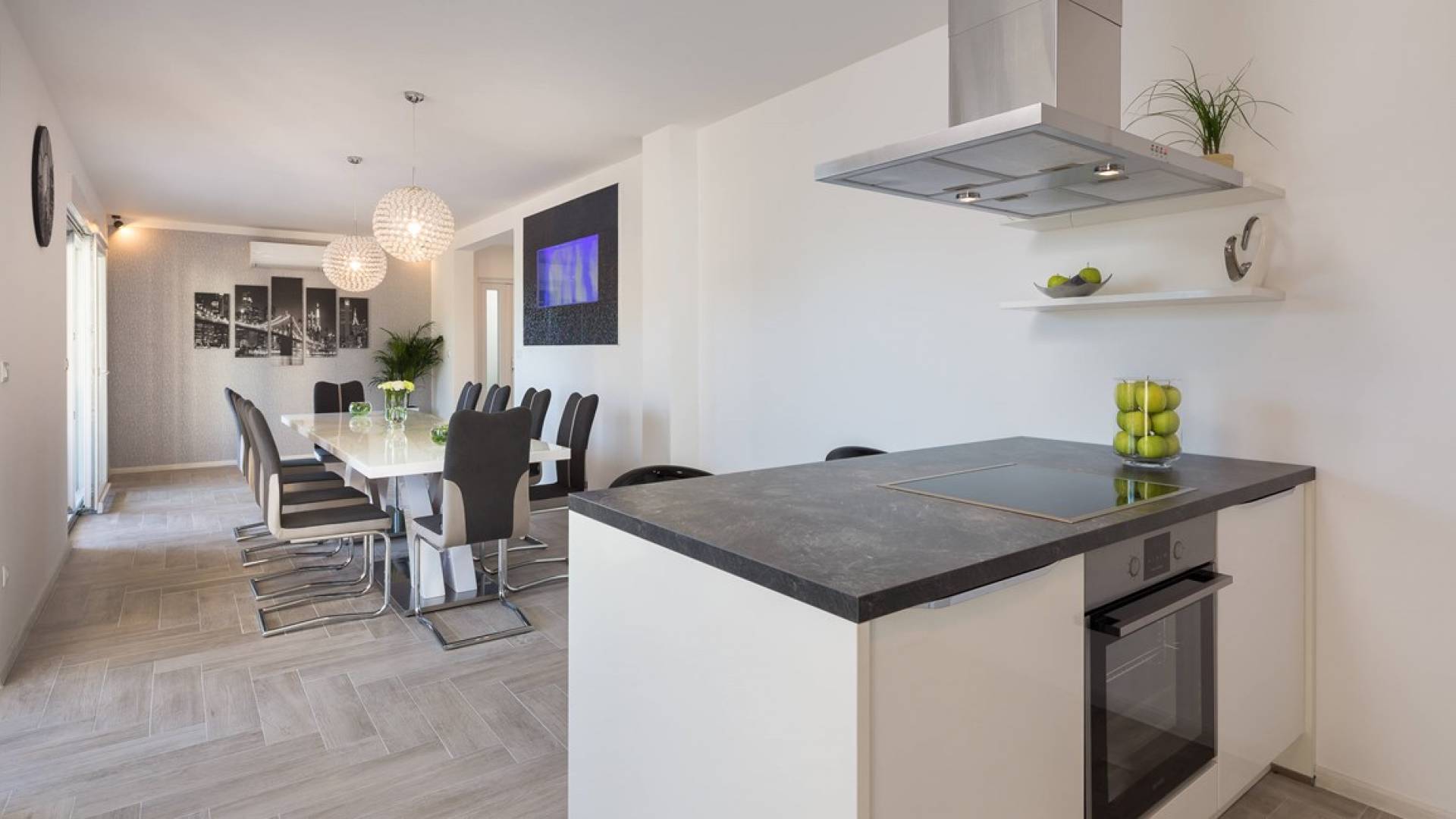 On the ground floor you can find kitchen with dining area for 10 persons, 2 double bedrooms, each with its own bathroom, additional toilet with washing machine and a terrace with dining table with 10 seats. On the first floor, there are 3 double bedrooms each with its own bathroom, living room, beautiful terrace overlooking the sea. Terrace is equipped with seating furniture.