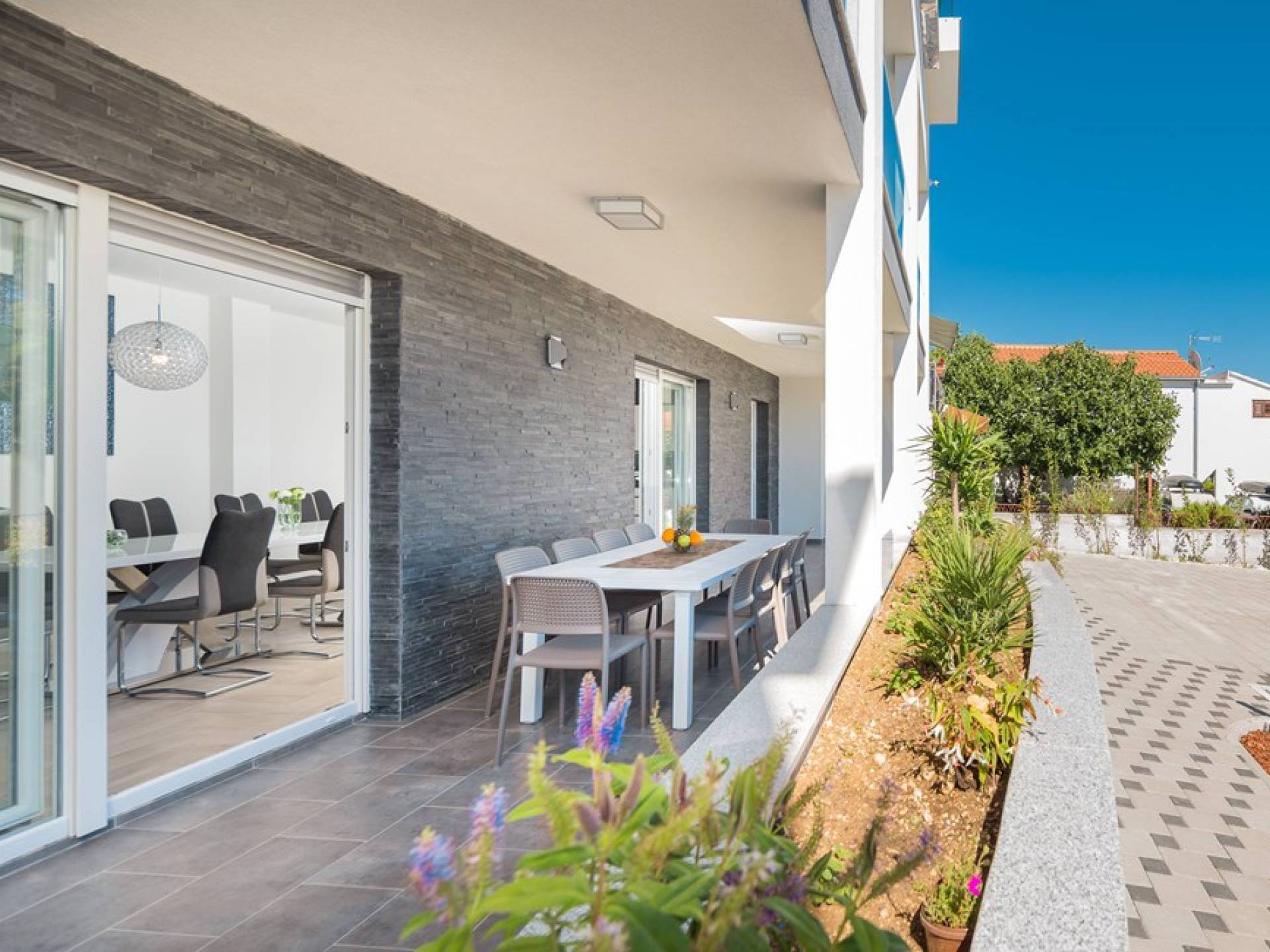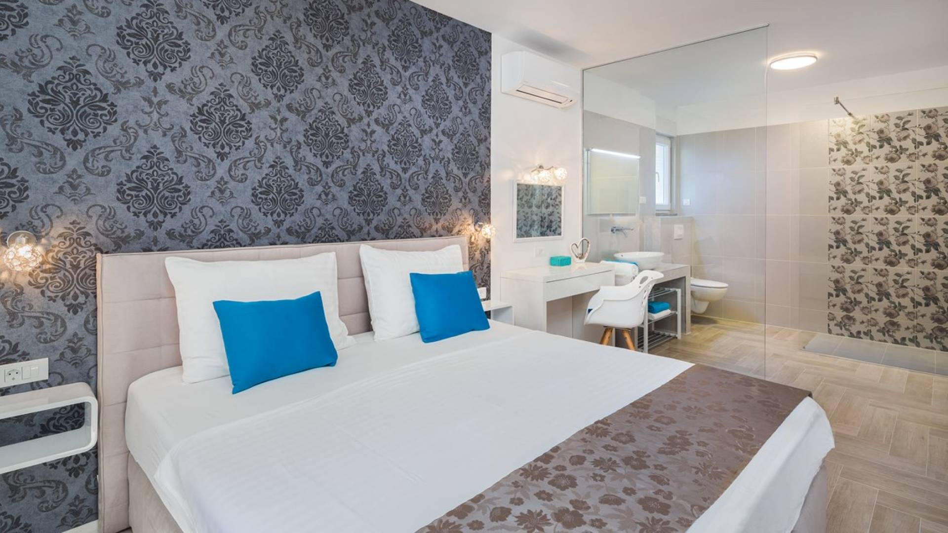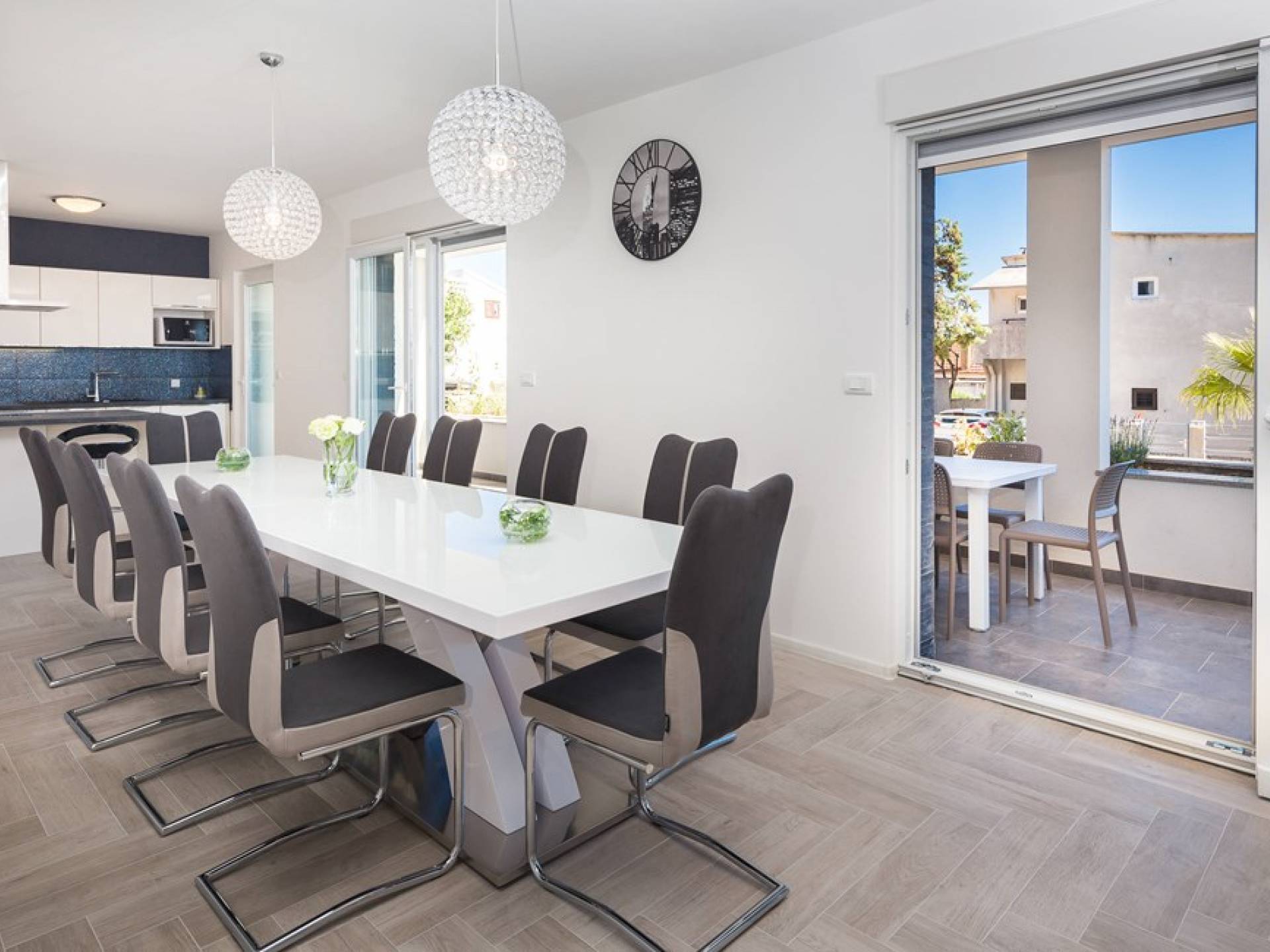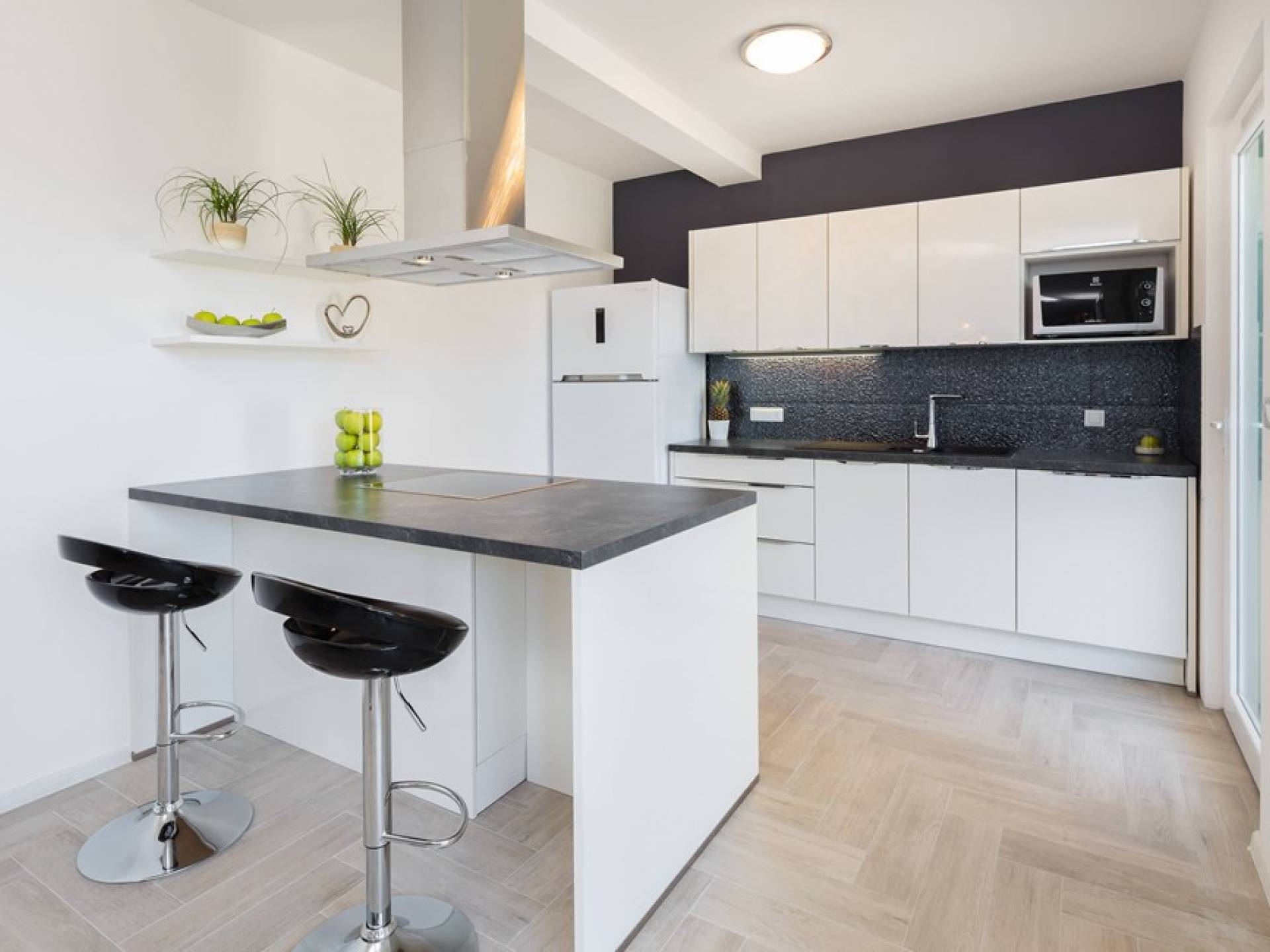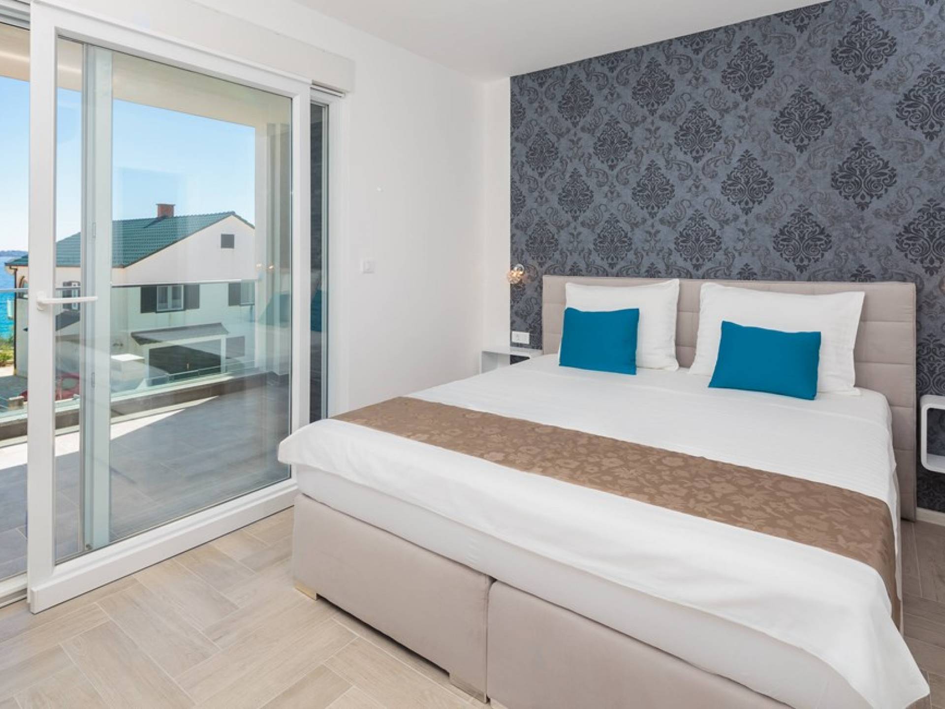 On the ground floor you can find kitchen with dining area for 10 persons, 2 double bedrooms, each with its own bathroom, additional toilet with washing machine and a terrace with dining table with 10 seats. On the first floor, there are 3 double bedrooms each with its own bathroom, living room, beautiful terrace overlooking the sea. Terrace is equipped with seating furniture.