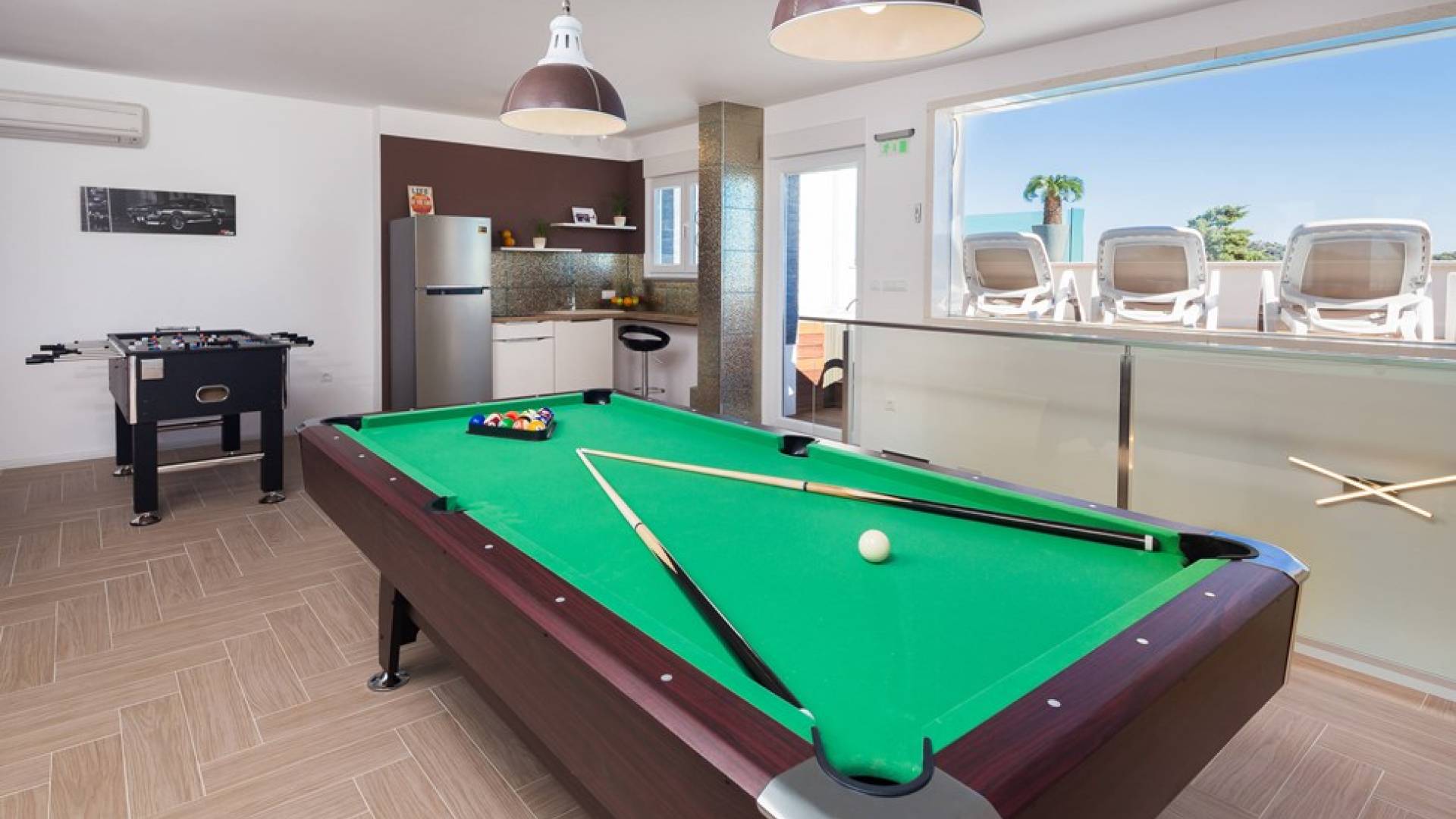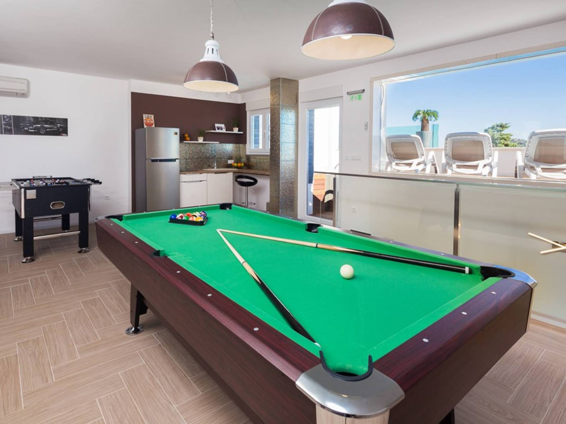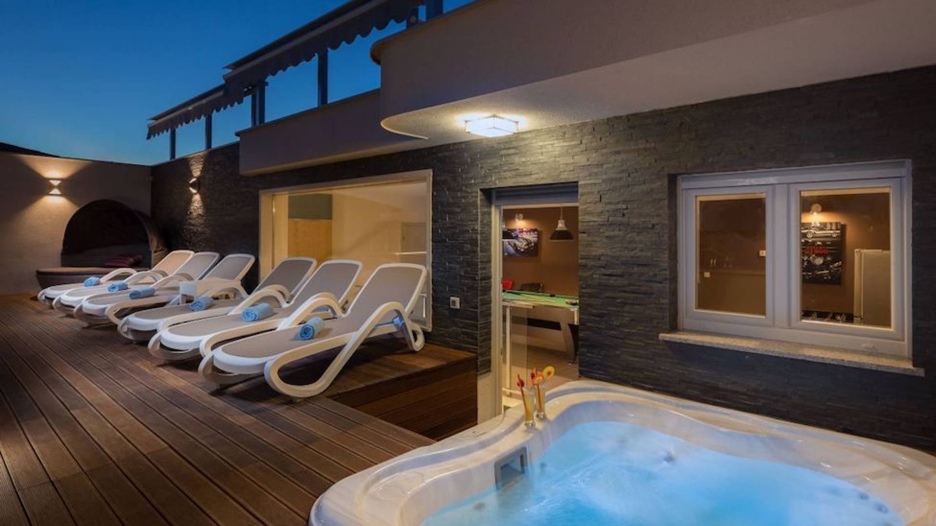 The most beautiful part of Villa El Sol is second floor where guests can enjoy in Play and Relax area, including beautiful terrace with heated infinity pool, Jacuzzi for 4 persons, and a sunbathing area with sun loungers where guests can enjoy in fantastic view of the blue Adriatic Sea. Inside there is Sauna area with shower and 2 toilets, and play zone with billiard, table football, darts and mini kitchen.