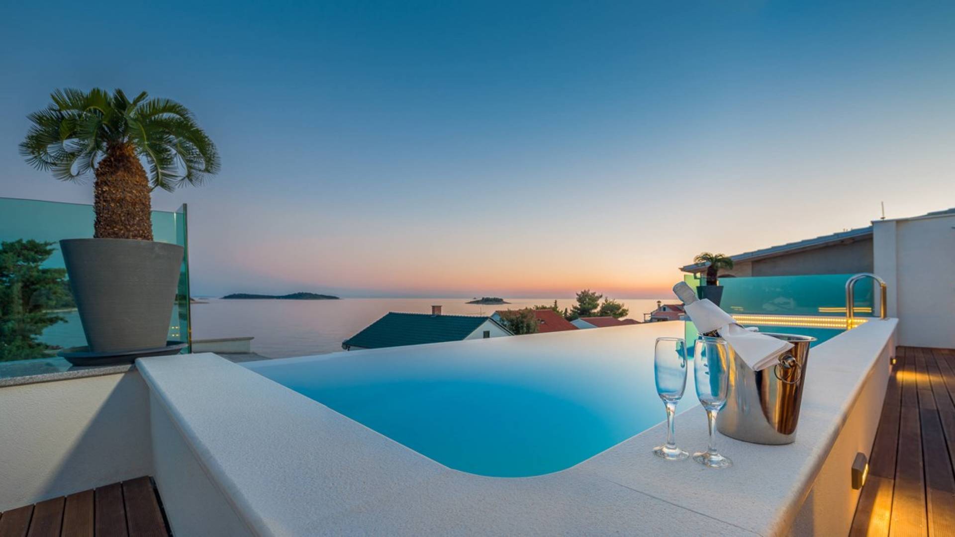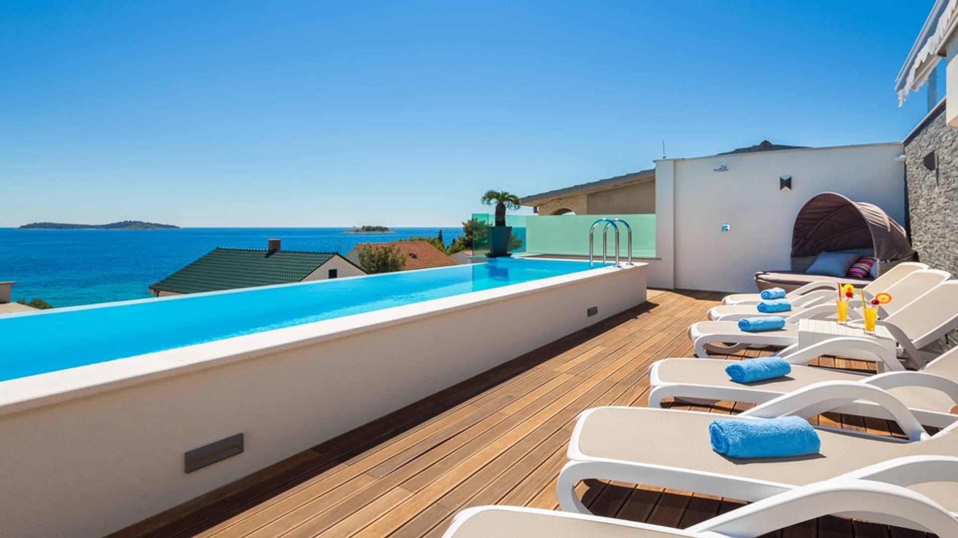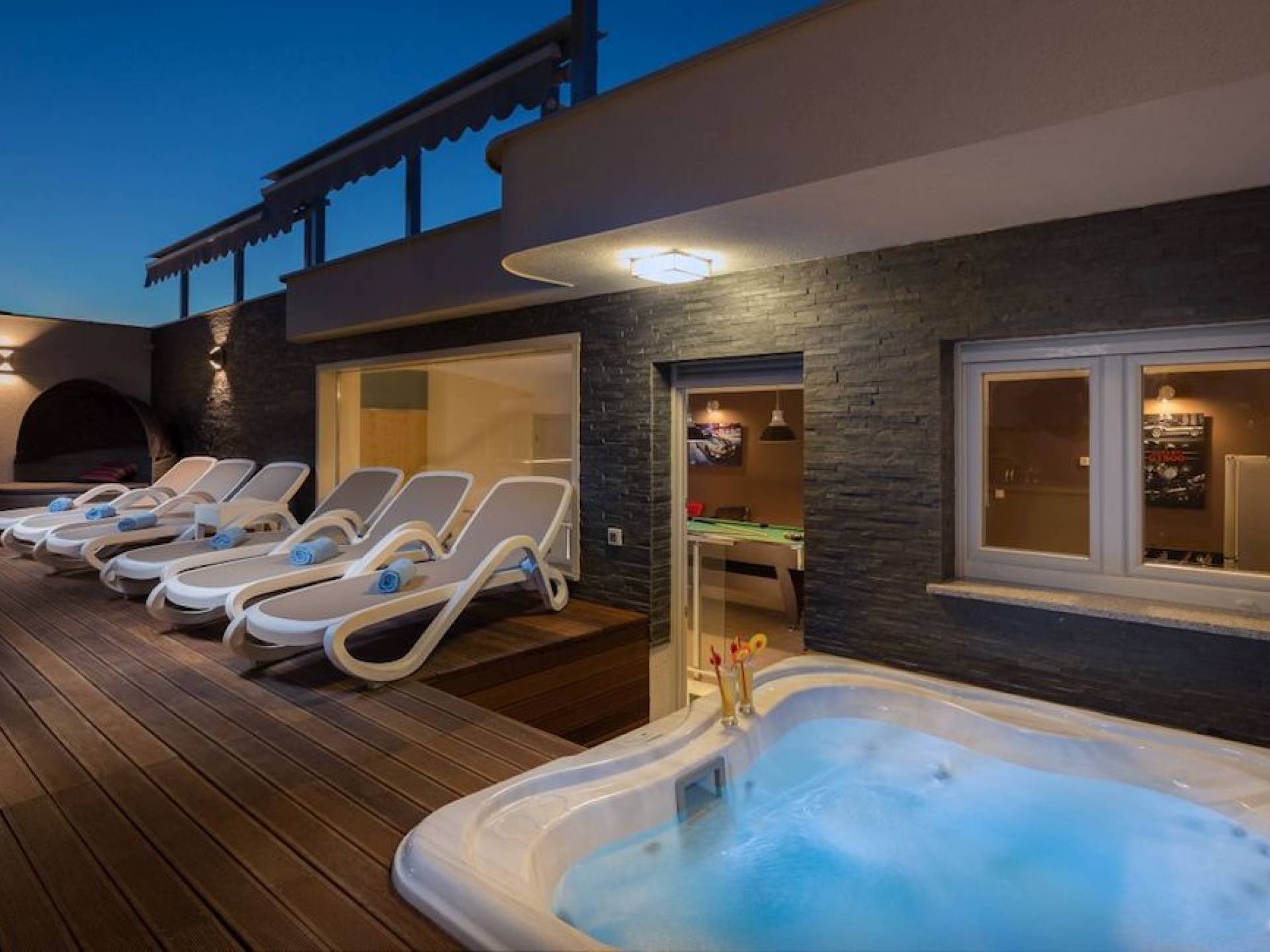 The most beautiful part of Villa El Sol is second floor where guests can enjoy in Play and Relax area, including beautiful terrace with heated infinity pool, Jacuzzi for 4 persons, and a sunbathing area with sun loungers where guests can enjoy in fantastic view of the blue Adriatic Sea. Inside there is Sauna area with shower and 2 toilets, and play zone with billiard, table football, darts and mini kitchen.