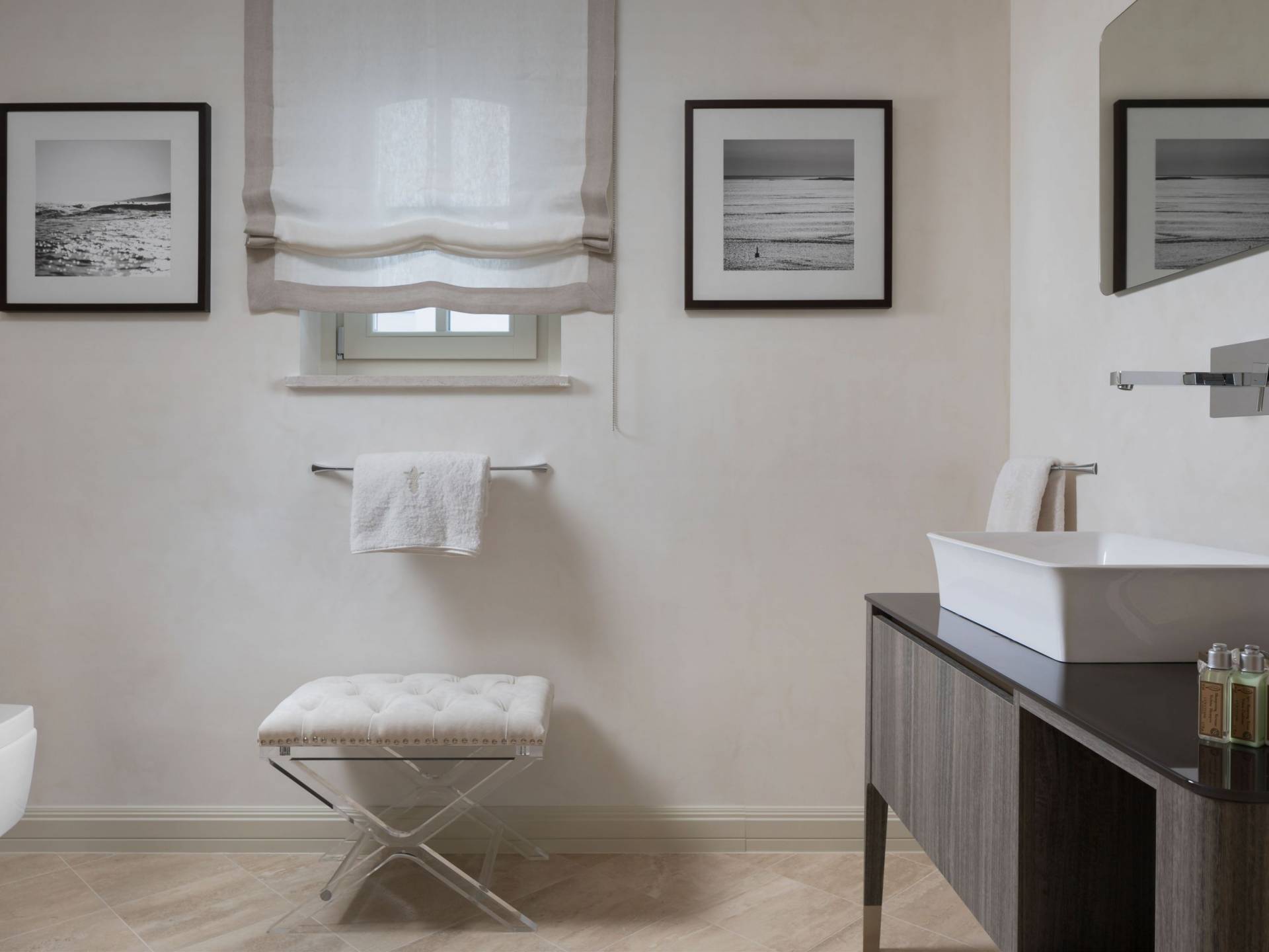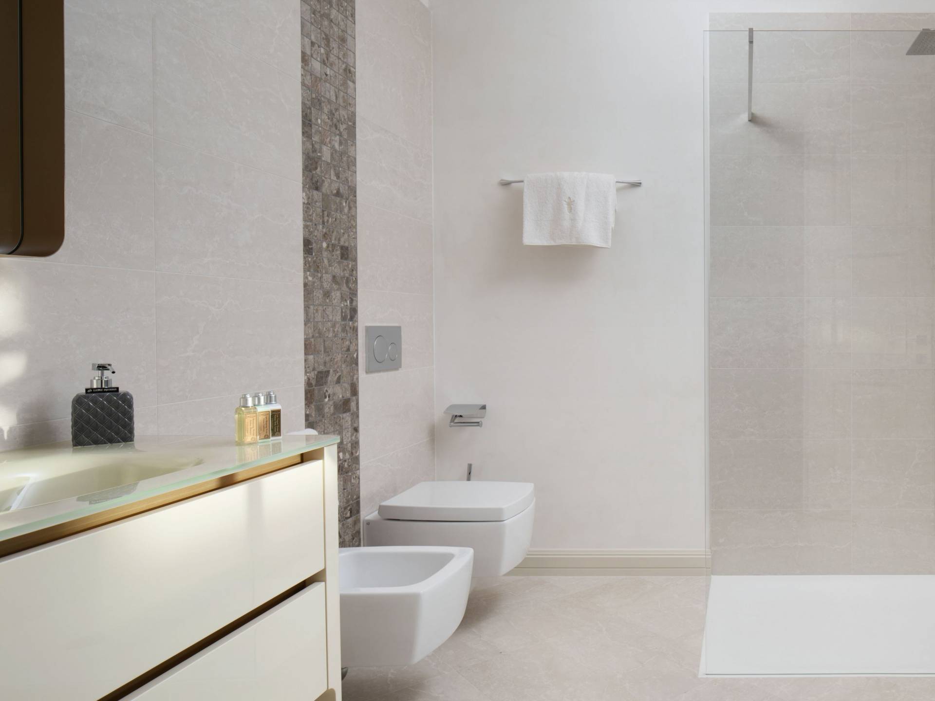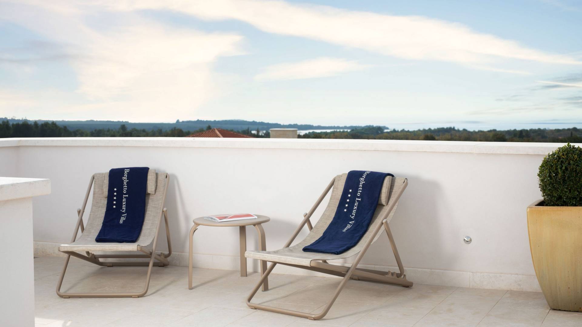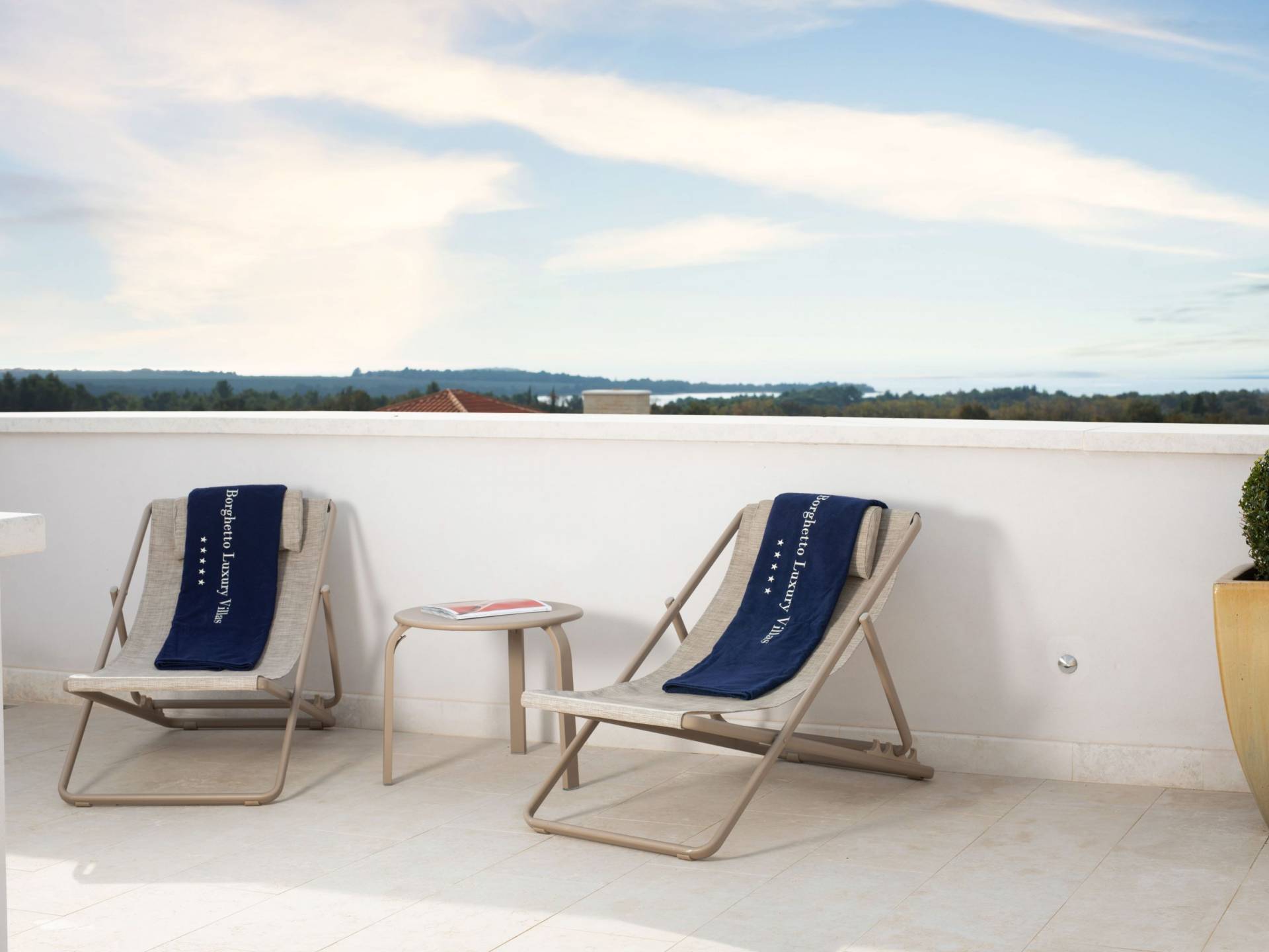 Villa Costanza Vabriga offers two floors of luxury living space. The modern kitchen, dining area and modern living room are located on the ground floor. All furniture is designed in Italy, with a designer signature. There is also a guest toilet and a room with a private bathroom with shower-toilet. On the first floor of the villa, there are three further bedrooms with en-suite shower rooms. At the top of the villa, there is a panoramic terrace, with a sitting area and a beautiful view of Vabriga.